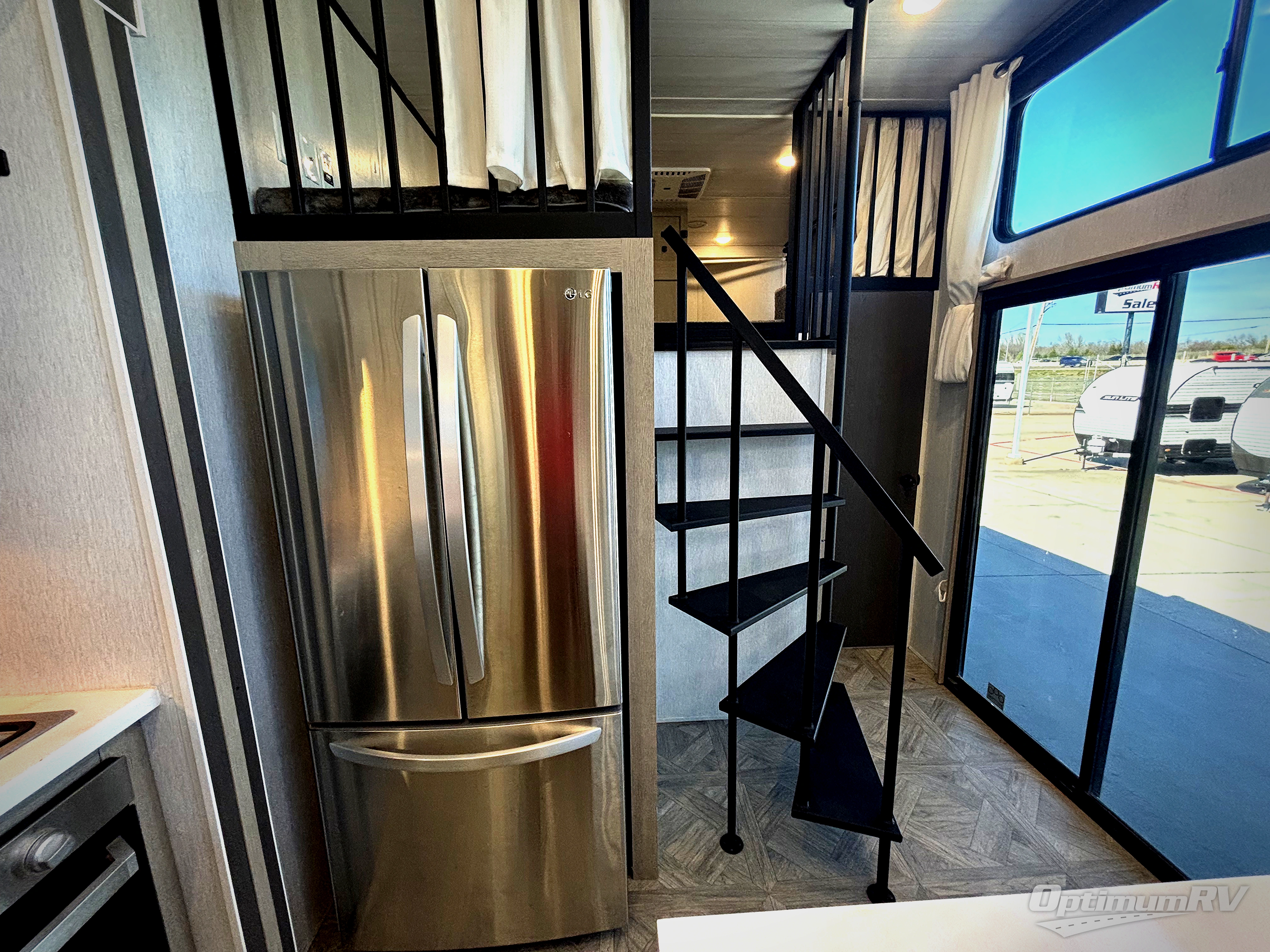 You will feel right at home in this destination trailer! It has not only has one loft in the rear with two 42" x 74" bunk mats, but also a second loft in the front with spiral steps leading up to two bunk mats. The front private bedroom has a custom king bed slide to lay your head on at night with front windows to let in lots of natural lighting and sunshine in the morning. Relax in true comfort at night on the L-shaped sectional sofa across from the entertainment center with a fireplace. The kitchen island provides extra space to prepare delicious meals and comes with four bar stools to enjoy your breakfast each morning. Everyone will stay squeaky clean with a walk-in shower in the rear private bedroom, plus there is an area prepped to add an optional washer and dryer. Head outside through either the patio door or the second entry/exit door each day!