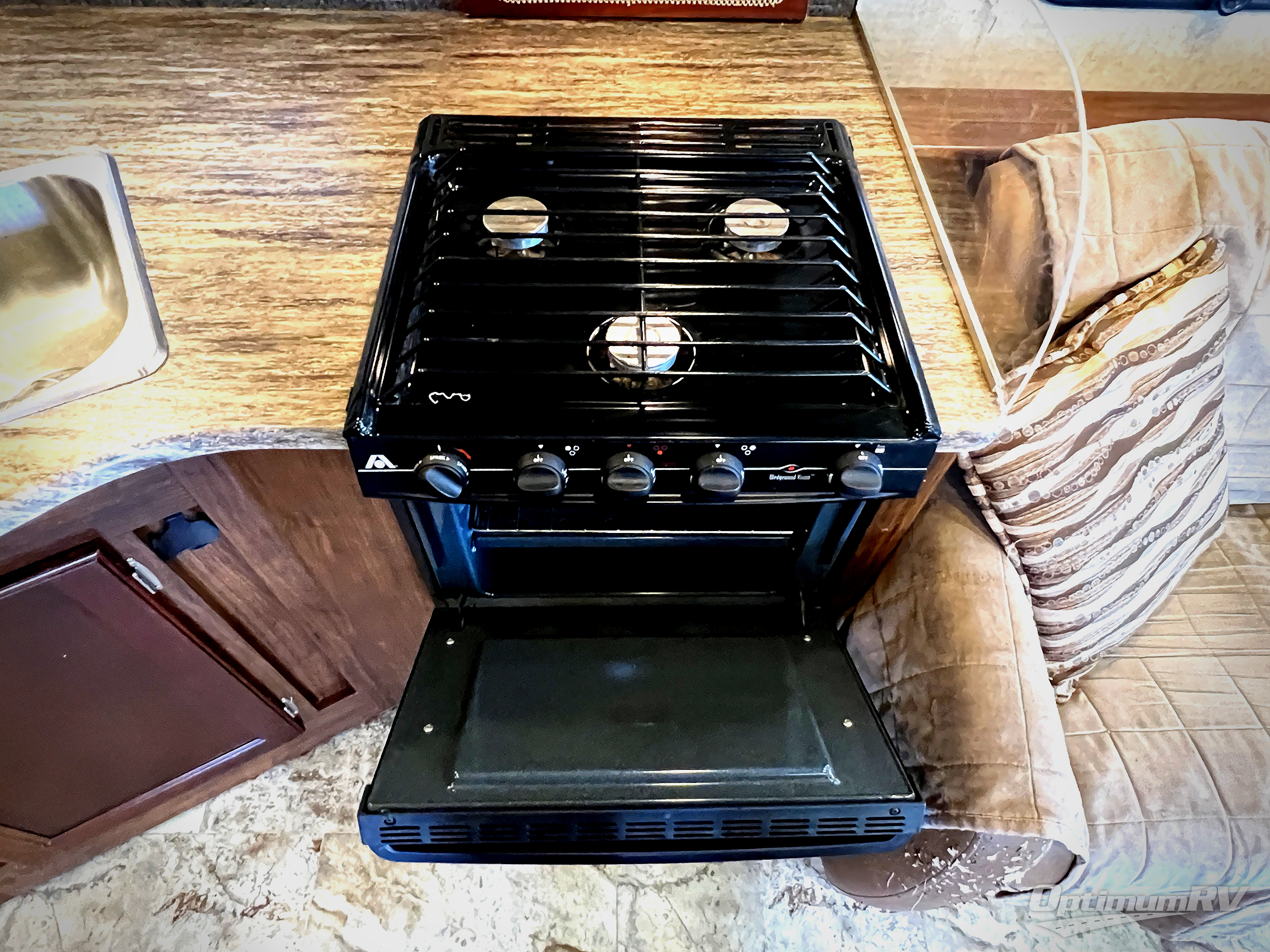 The slide opposite the door offers a sofa with 63" bed and overhead storage, plus a three burner range with microwave oven overhead, as well as a double kitchen sink. The refrigerator and pantry are on the opposite side to the left of the entry door.