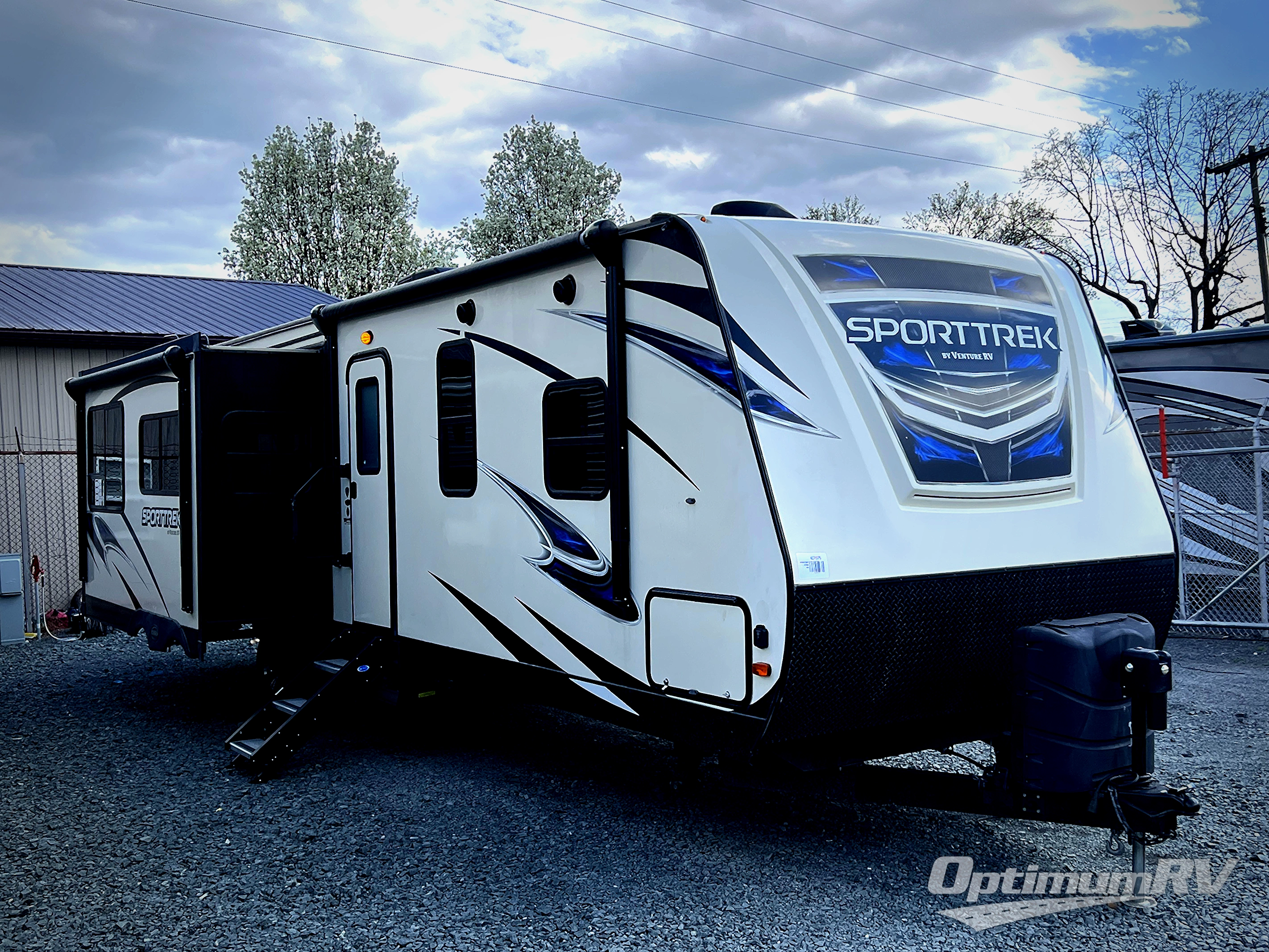 Just imagine you and your spouse relaxing at the campsite under one of the two awnings in this SportTrek travel trailer. When it gets too hot outside you can return to the air conditioned trailer with your choice of the Comfort by Design grand dinette, the theater seats or the sofa bed. You might even like to get cleaned up in the dual entry bath before you relax or make dinner. The front bedroom gives you a private space when the kids or grandkids tagged along. Come see what else you will love about this trailer!