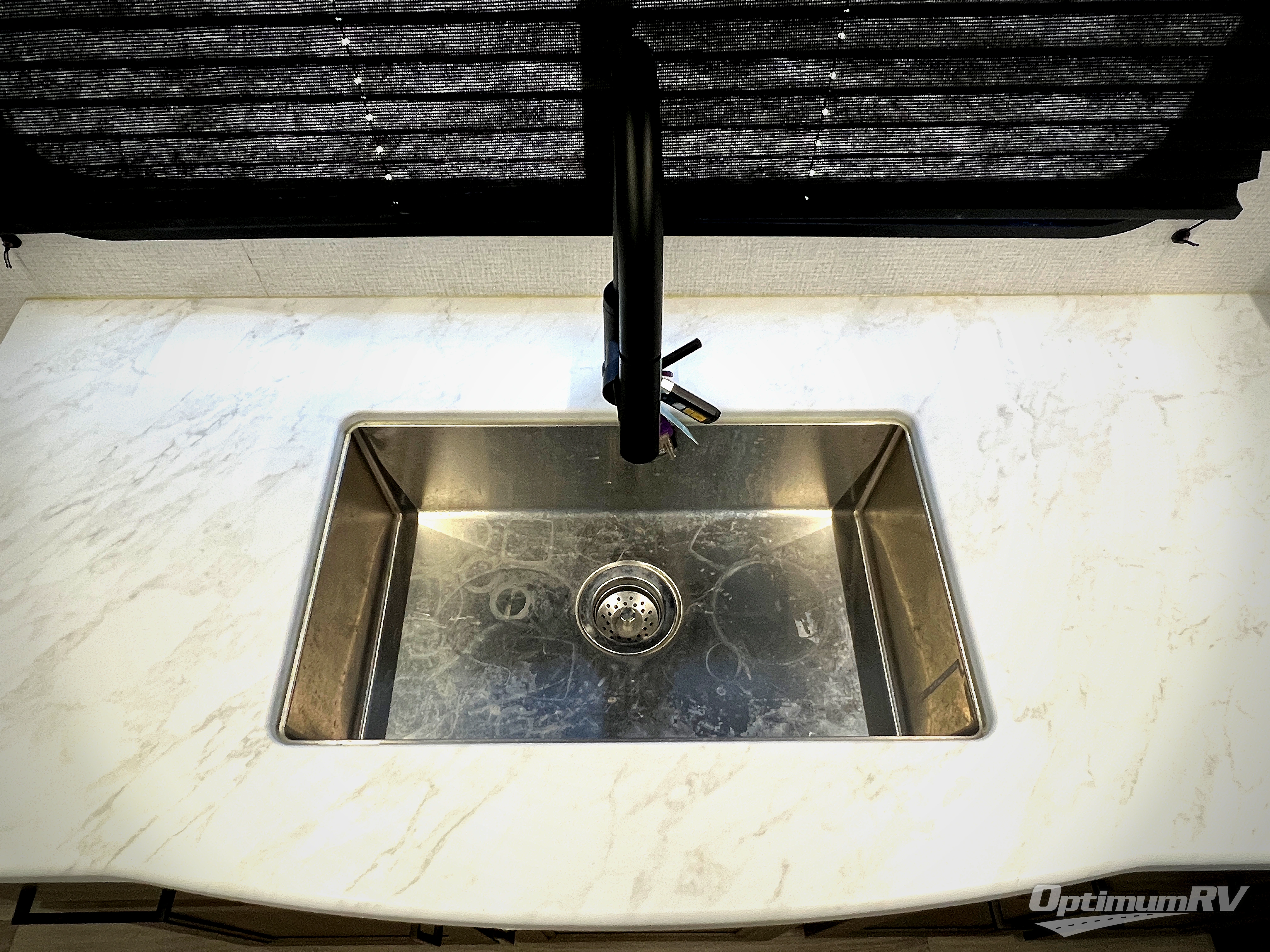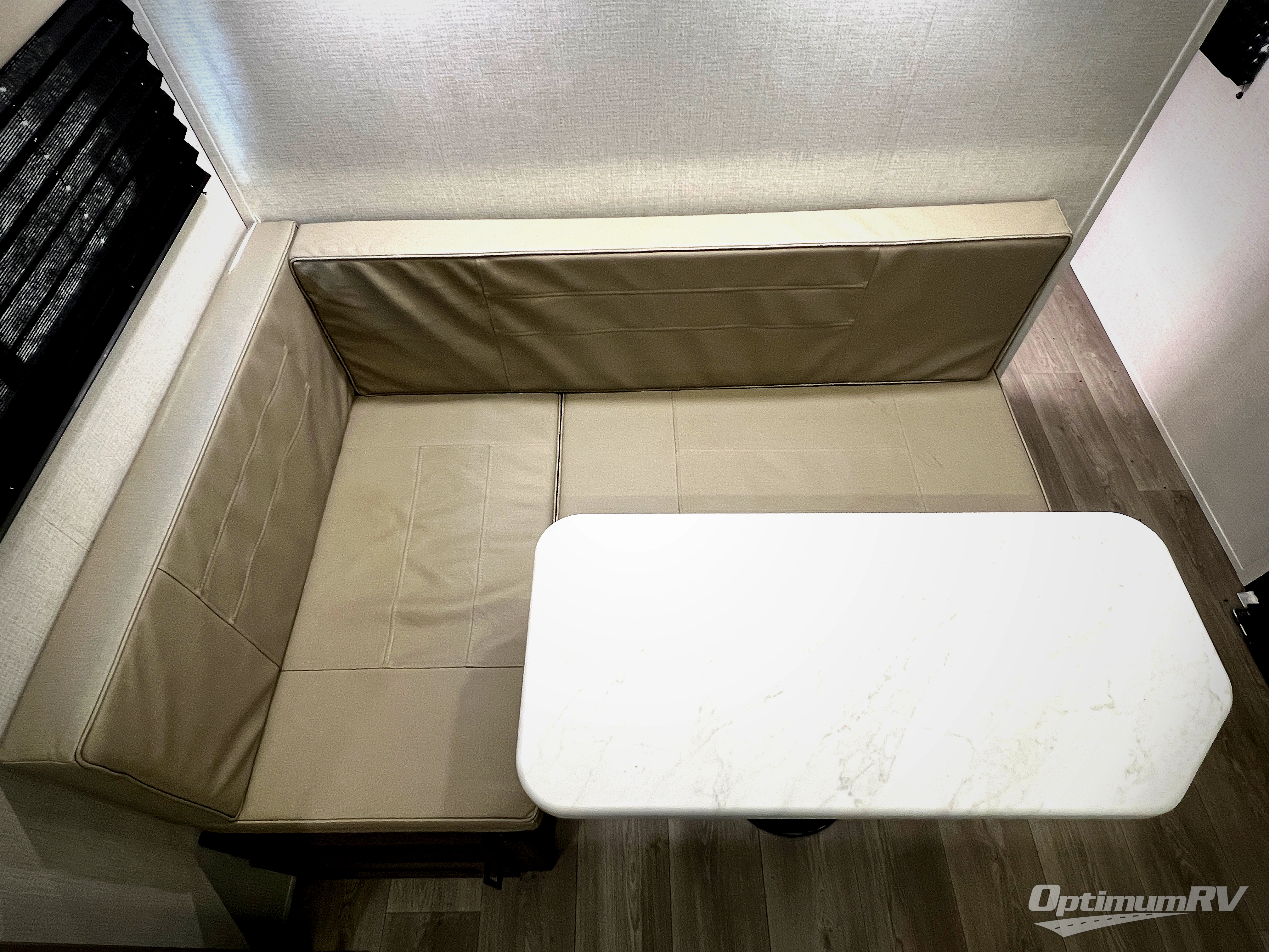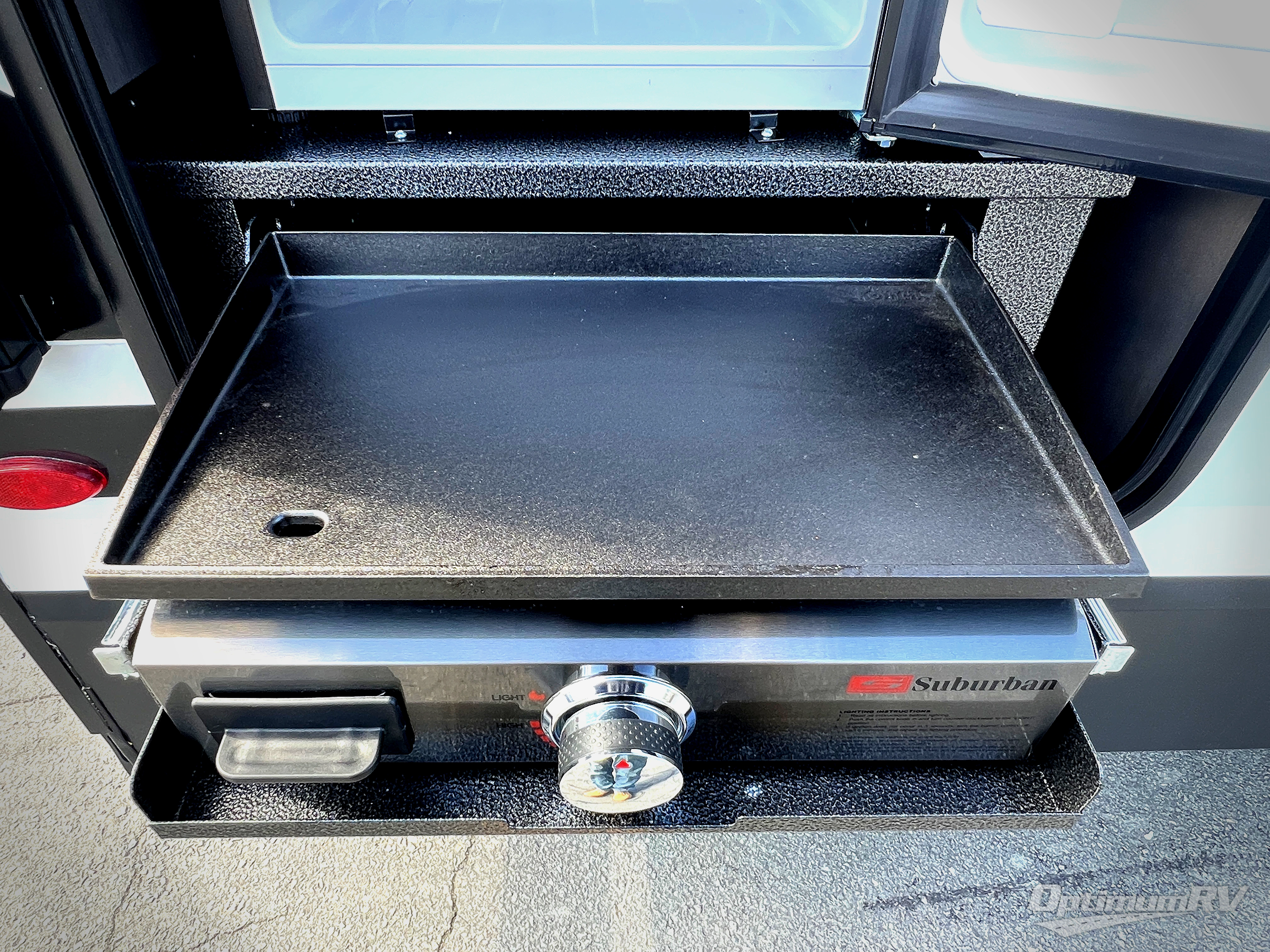 If you're looking for a cozy travel trailer for two, this is the one! You can sleep soundly each night on the king bed slide out, and you'll find plenty of storage in the front wardrobe. There is even washer and dryer prep if you choose to add those appliances. After you've freshened up in the full bath with a walk-in shower, you can head to the rear kitchen to make breakfast. There is ample counter space here, along with a three burner range and an air fryer/convection microwave, plus a pull-out trash can for easy clean up. The breakfast nook provides a fun place to dine together, and if you're needing additional sleeping space you can switch it out for the optional sleeper sofa. A theater seating slide also provides tons of comfort, especially since it's in perfect view of the 32" TV! This model also includes an exterior griddle with a 1.7 cu. ft. refrigerator, protected by the 21' power awning so you can cook in the shade!