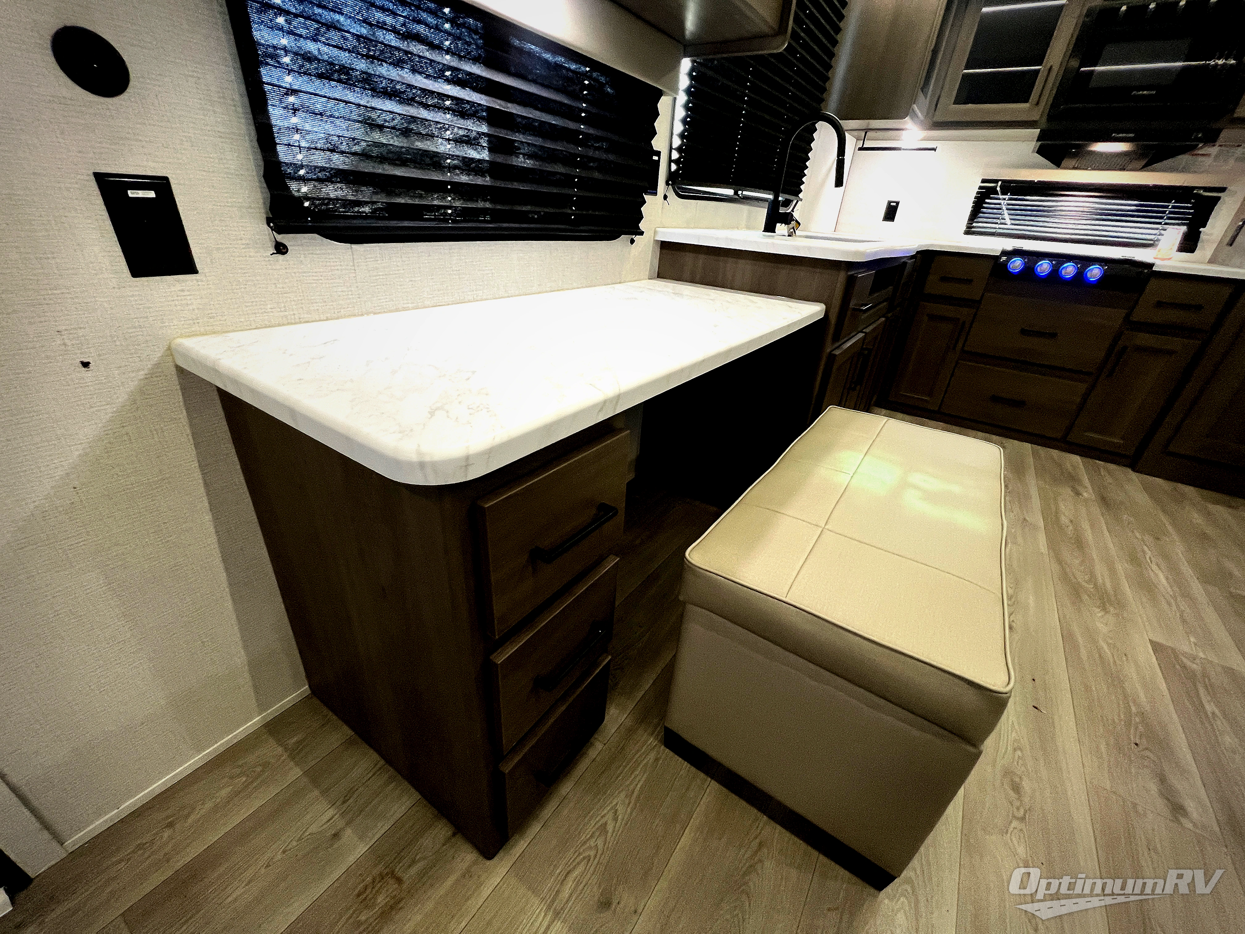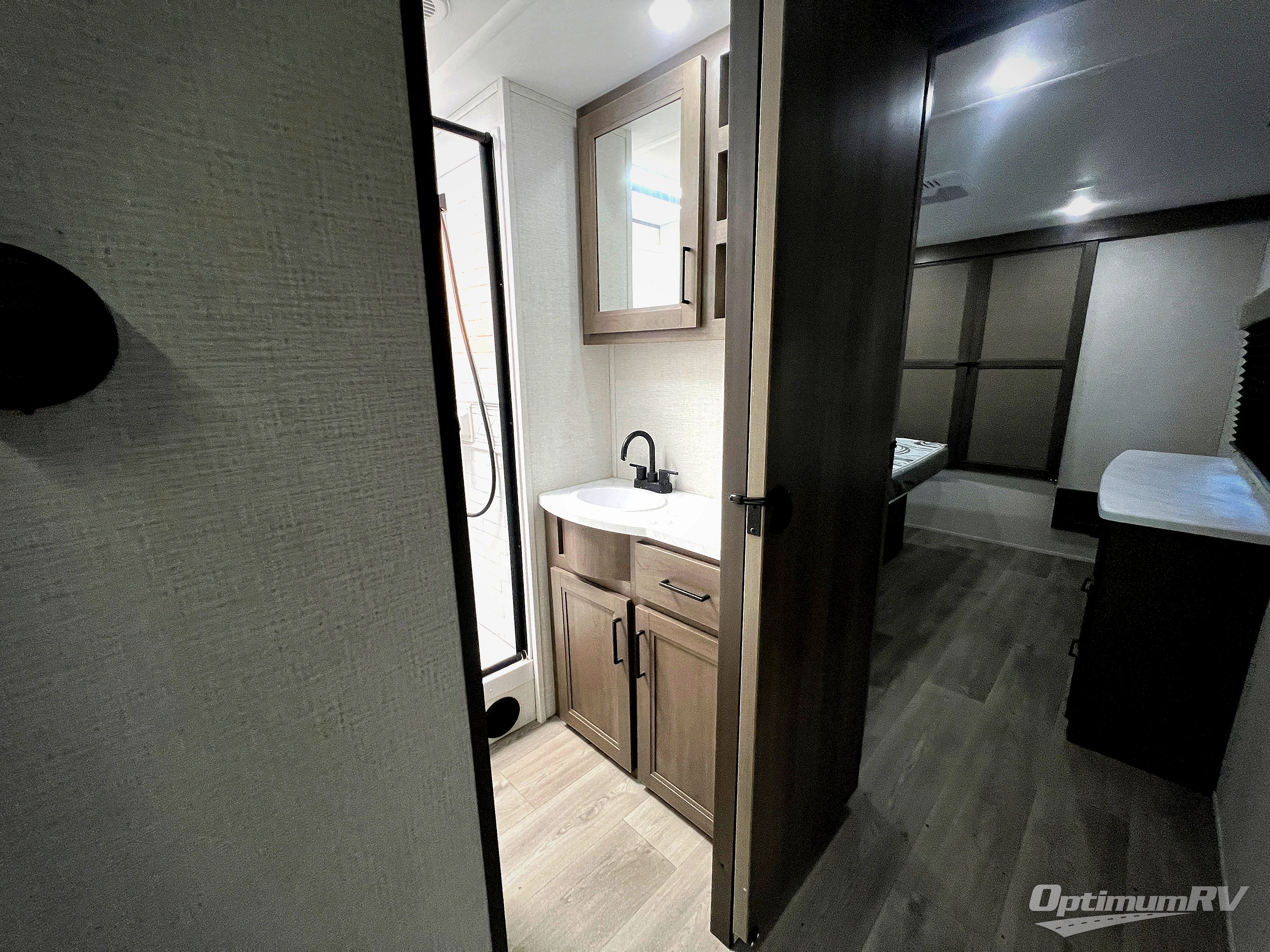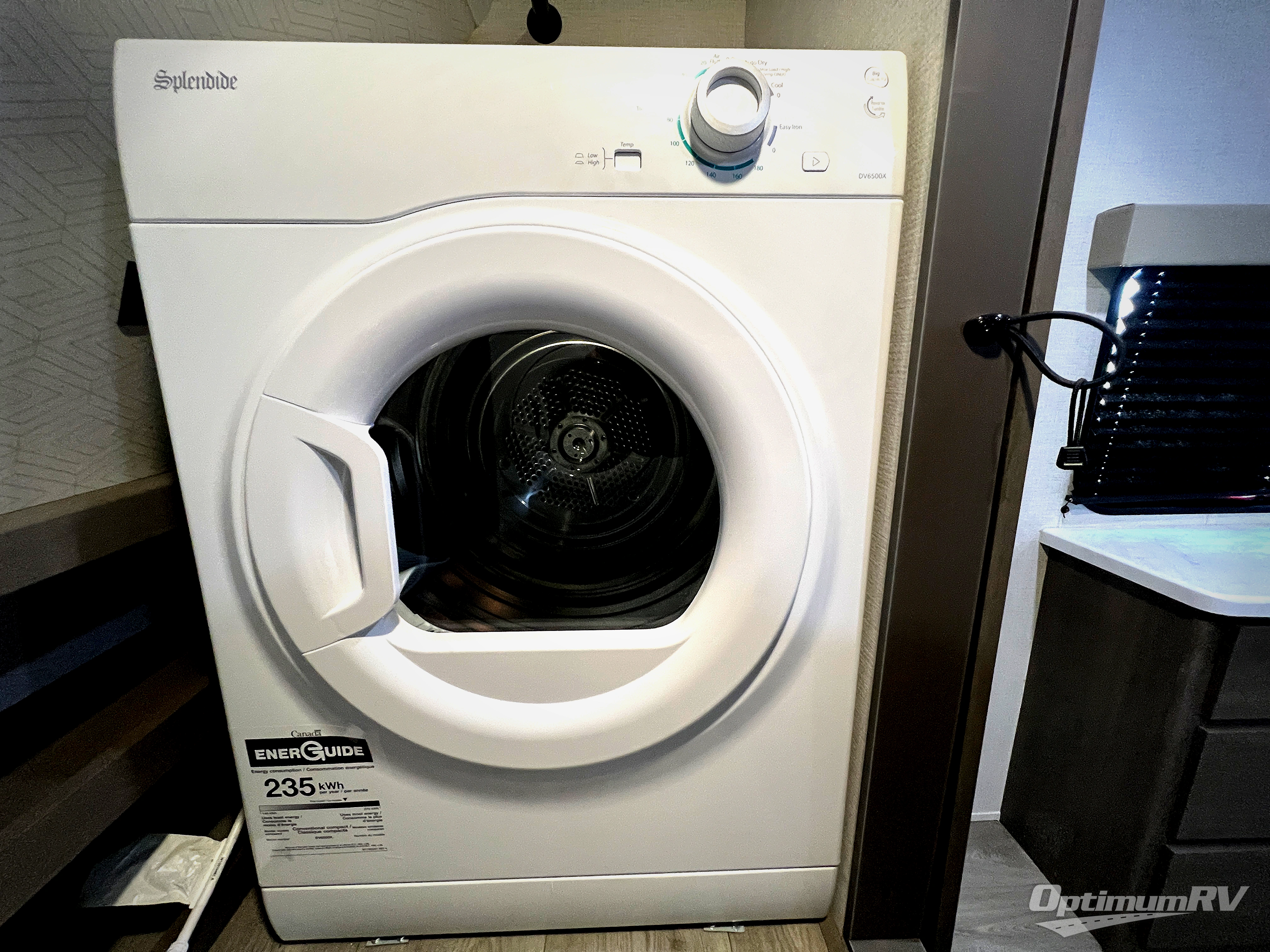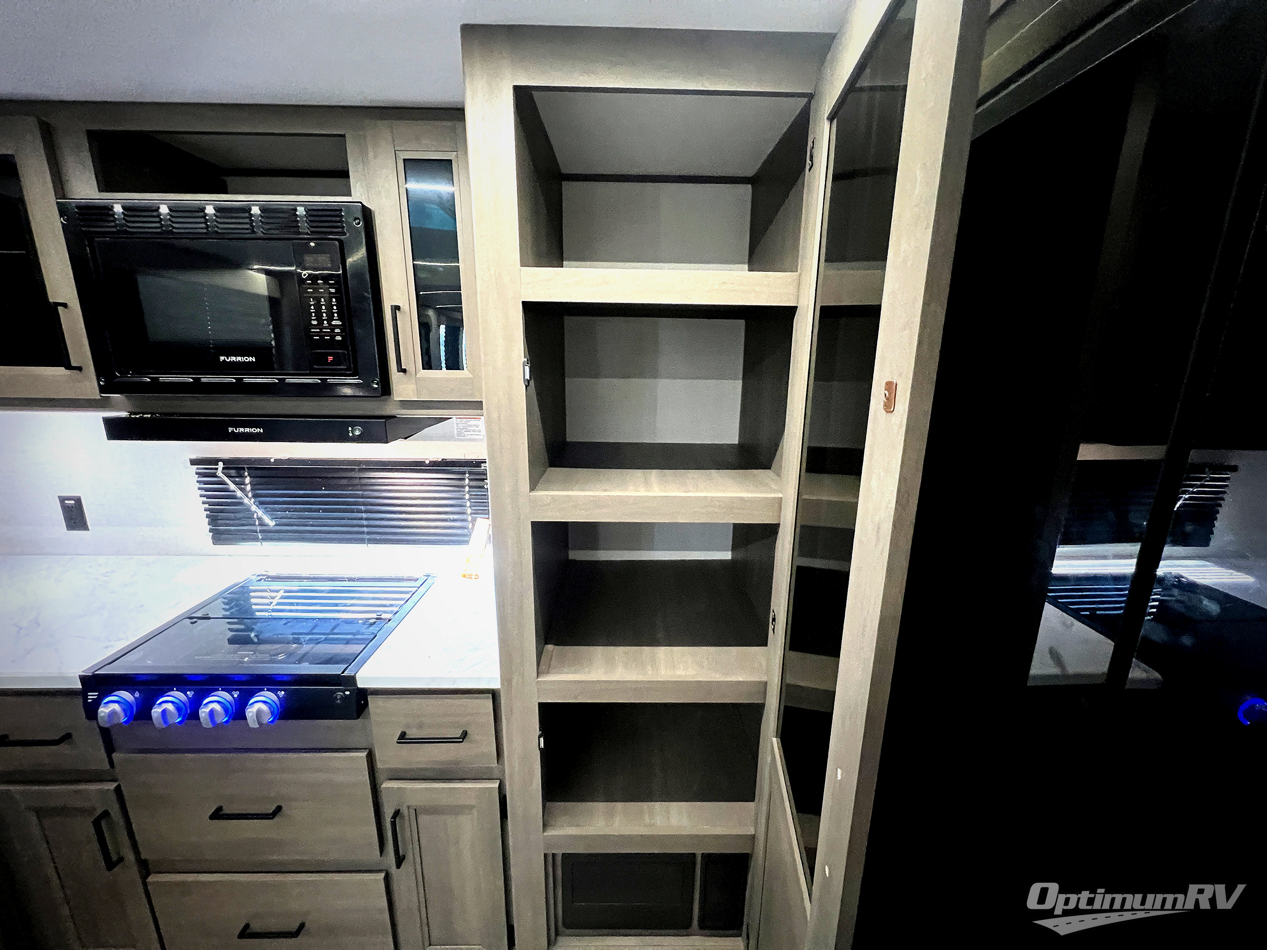 If you're looking for a cozy travel trailer for two, this is the one! You can sleep soundly each night on the king bed slide out, and you'll find plenty of storage in the front wardrobe. There is even washer and dryer prep if you choose to add those appliances. After you've freshened up in the full bath with a walk-in shower, you can head to the rear kitchen to make breakfast. There is ample counter space here, along with a three burner range and an air fryer/convection microwave, plus a pull-out trash can for easy clean up. The breakfast nook provides a fun place to dine together, and if you're needing additional sleeping space you can switch it out for the optional sleeper sofa. A theater seating slide also provides tons of comfort, especially since it's in perfect view of the 32" TV! This model also includes an exterior griddle with a 1.7 cu. ft. refrigerator, protected by the 21' power awning so you can cook in the shade!