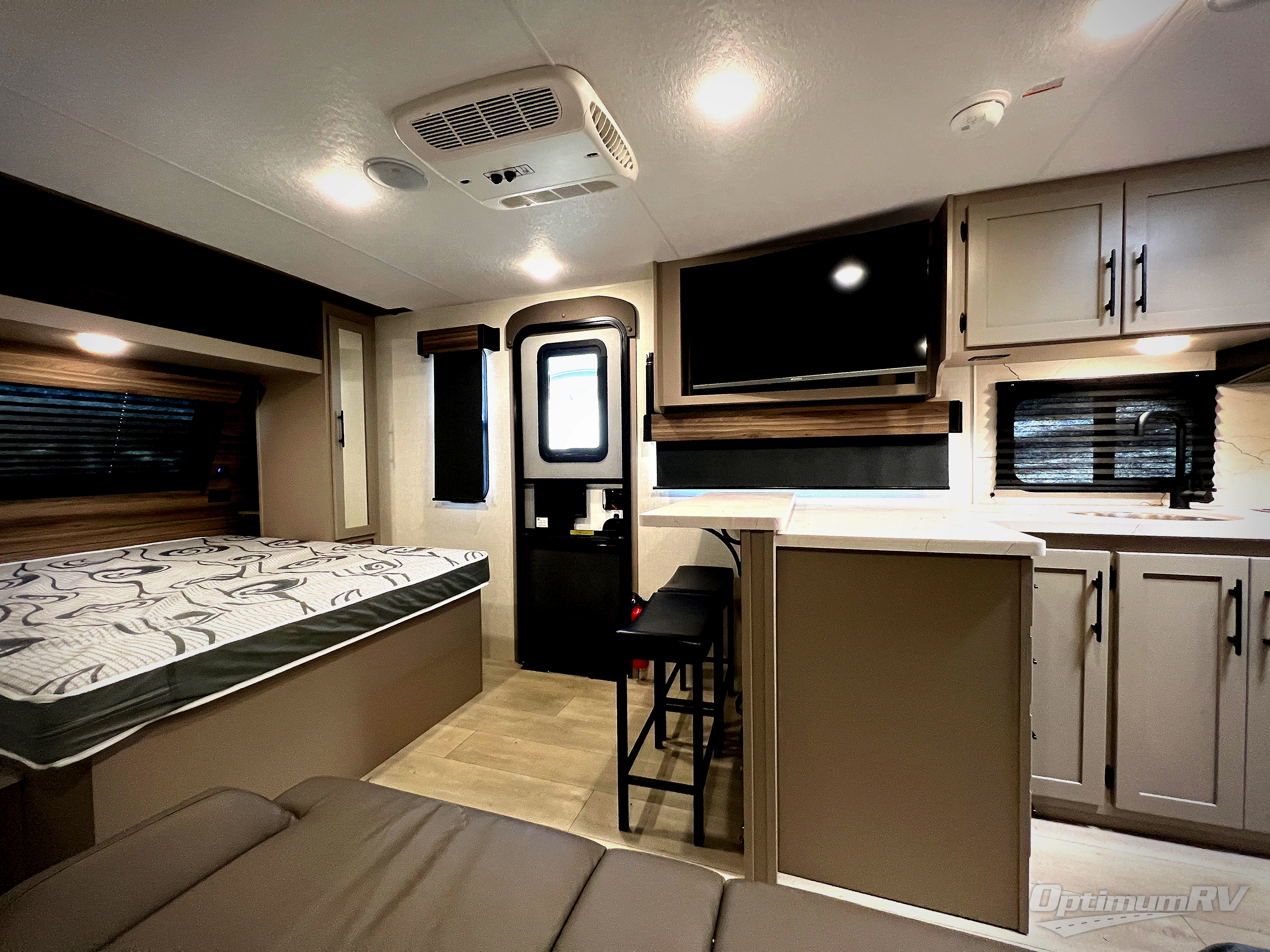 This travel trailer is the biggest in the Connect Mini lineup and you're sure to love it! There are double-size bunks for guests or little ones and a front RV queen bed for you! The slide out with a jackknife sofa and table will provide a place to relax and enjoy a meal together, and there is additional seating at the bar top with two stools. There is plenty of storage space found with this model, including dual bedroom closets, a pass-through storage, plus a pass-thru storage up front for fishing poles, hiking gear, and more! You will also love having an outside kitchen to cook meals when the weather is nice!