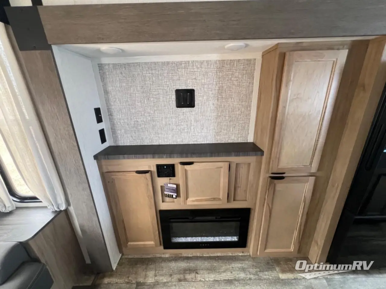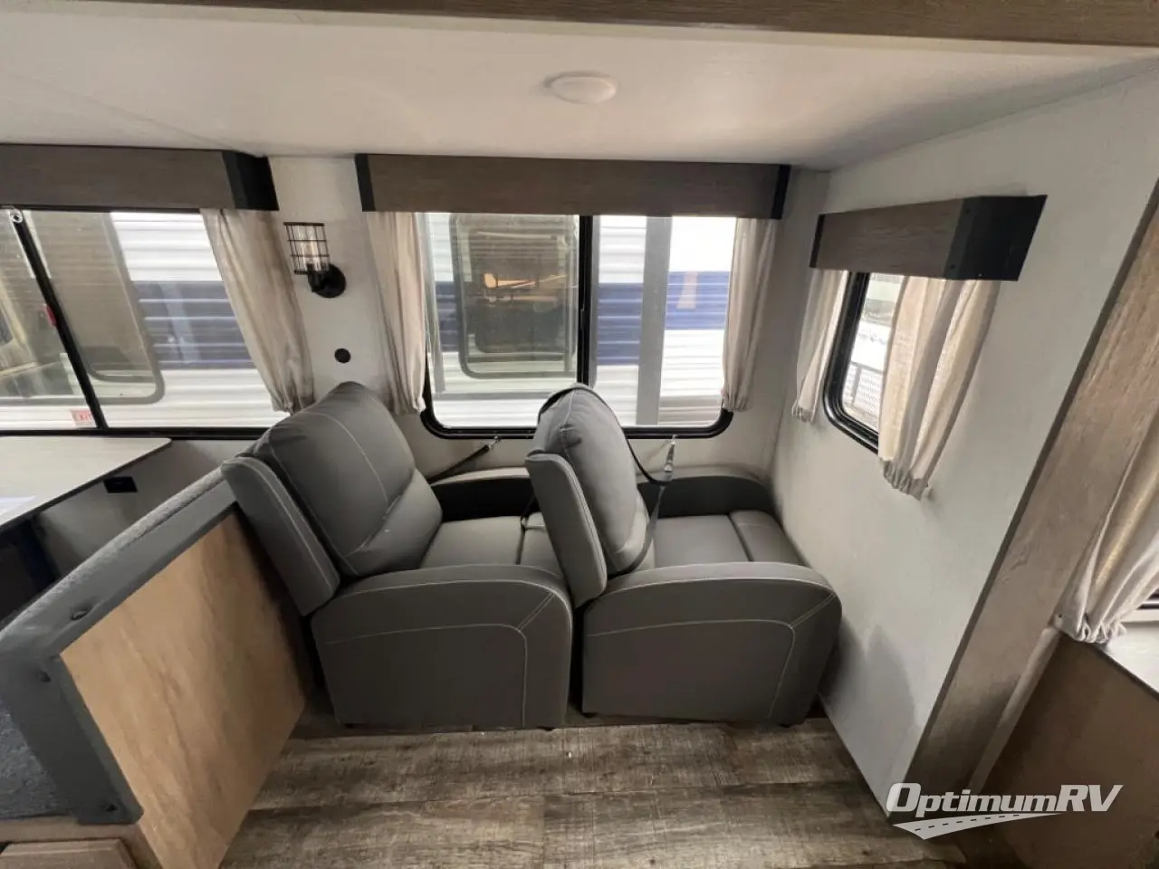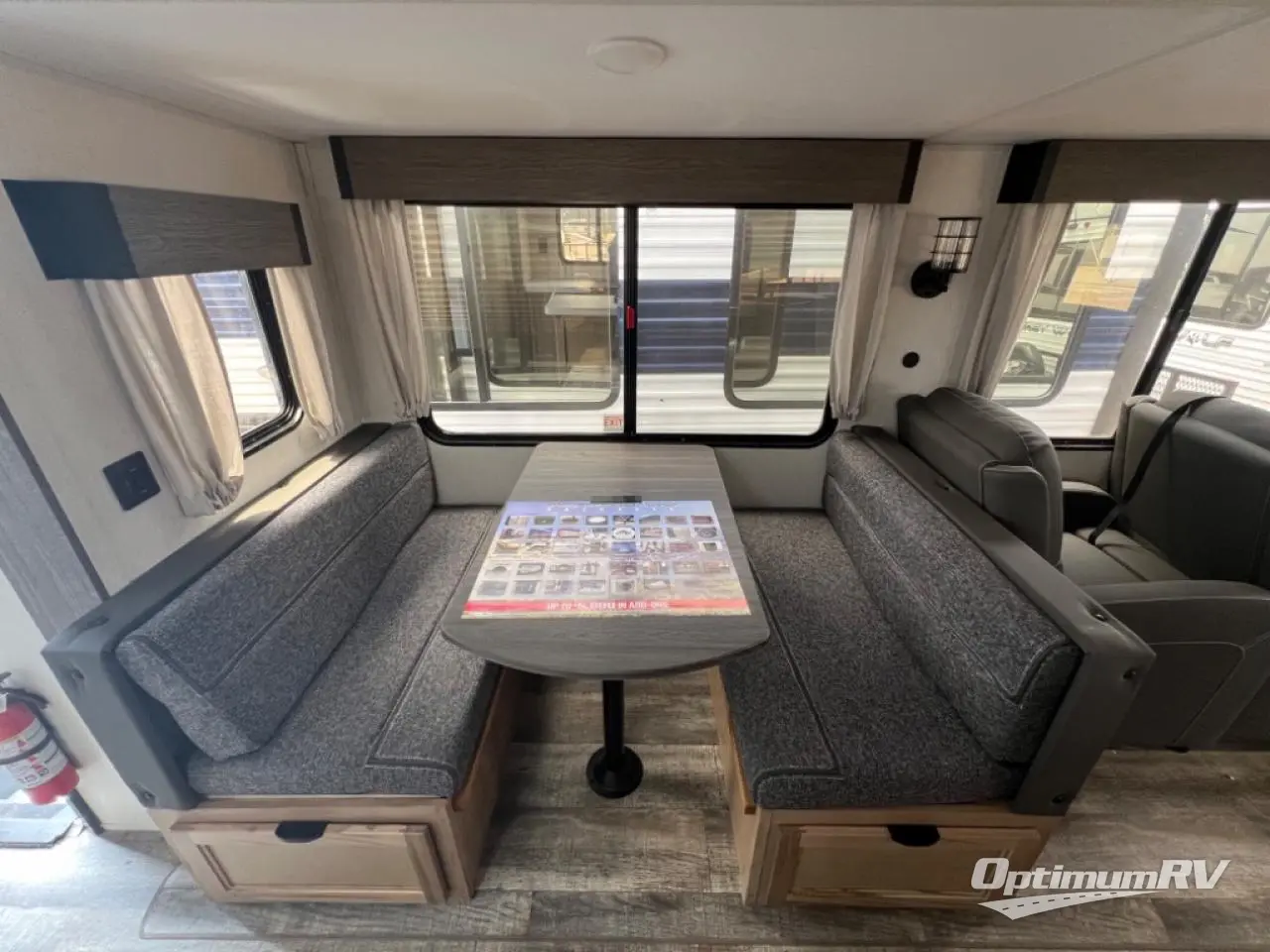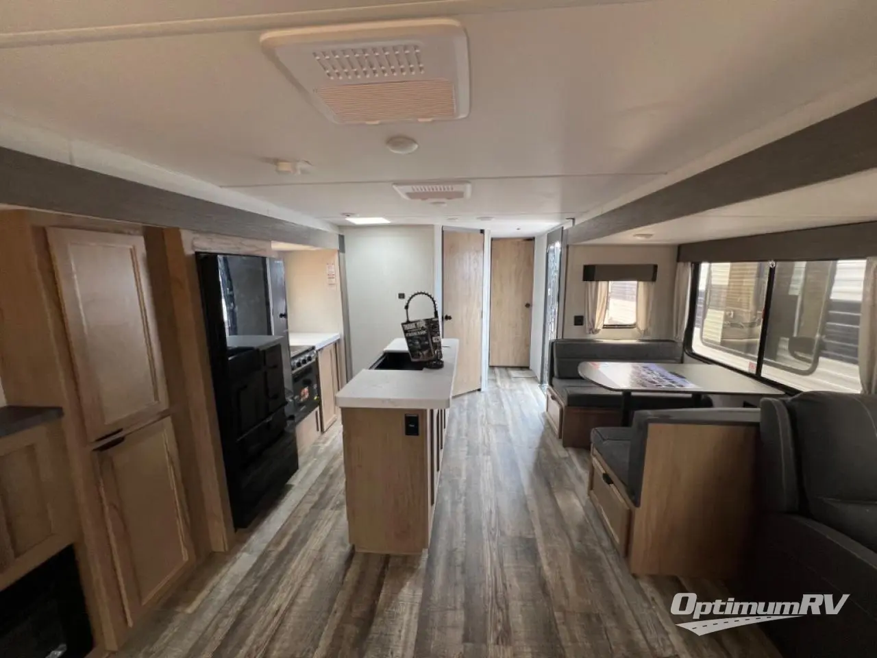 With two large slides opposing each other, you will have plenty of interior space in this travel trailer! The rear living area has a sofa with end tables to set your drink on and two recliner chairs across from the fireplace with a TV mount above it. Meal prepping will be easier with the kitchen island and you can enjoy your meals at the booth dinette then play a card game or two. The front private bedroom has a walk around queen bed to lay your head on at night with wardrobes on either side to hang your clothes and an entrance into the dual entry bathroom which has a neo-angled shower to freshen up in each morning!