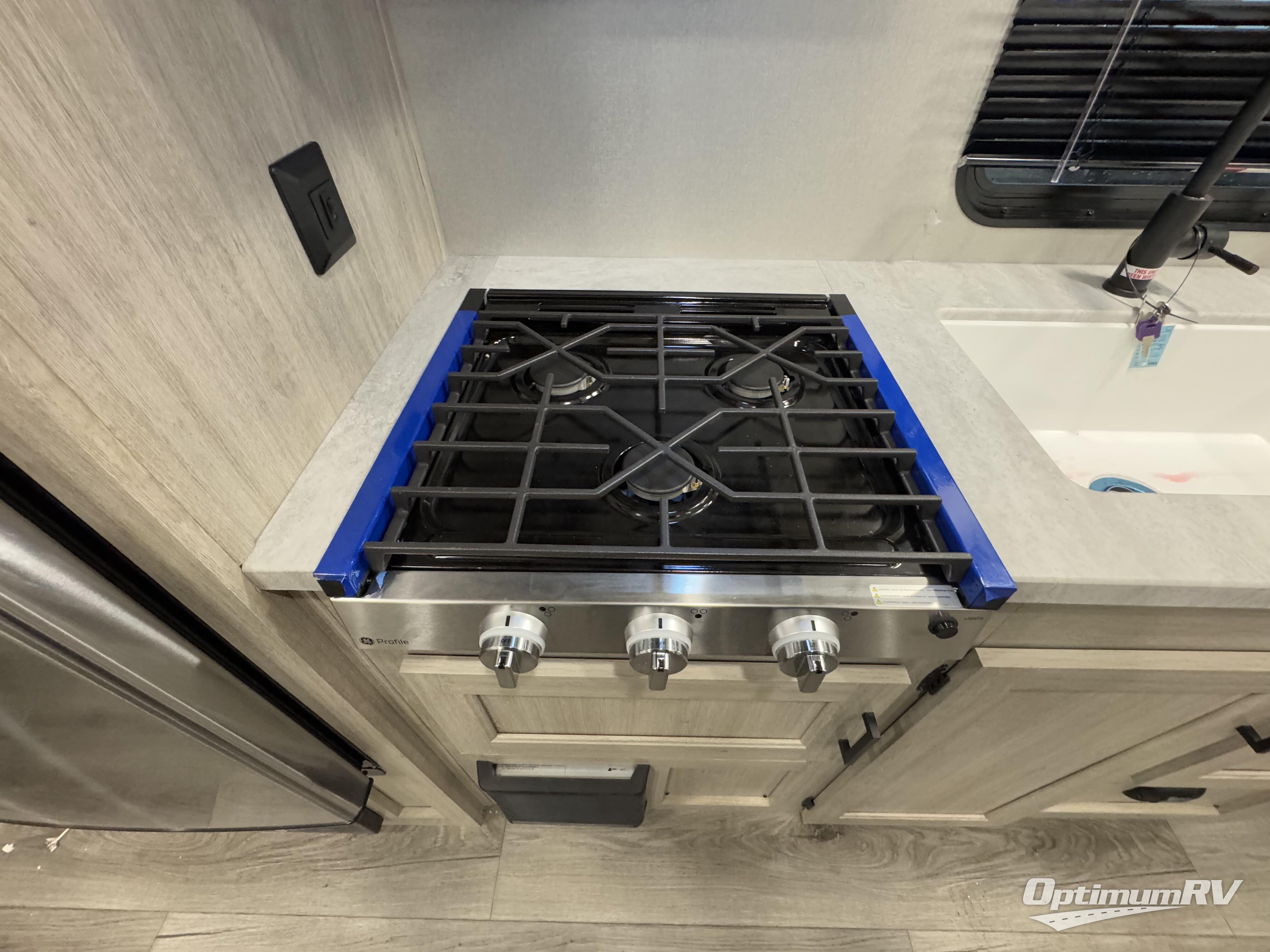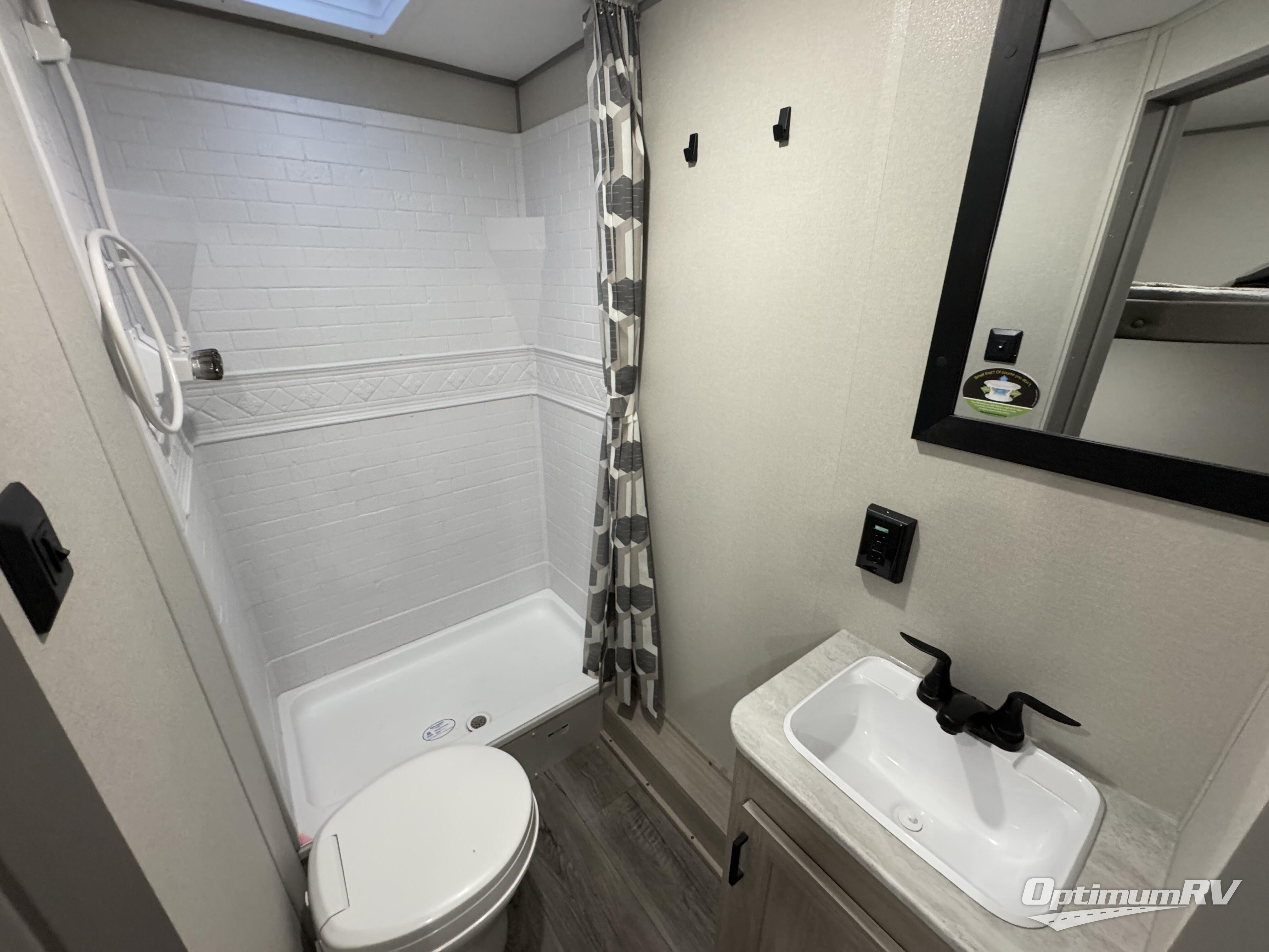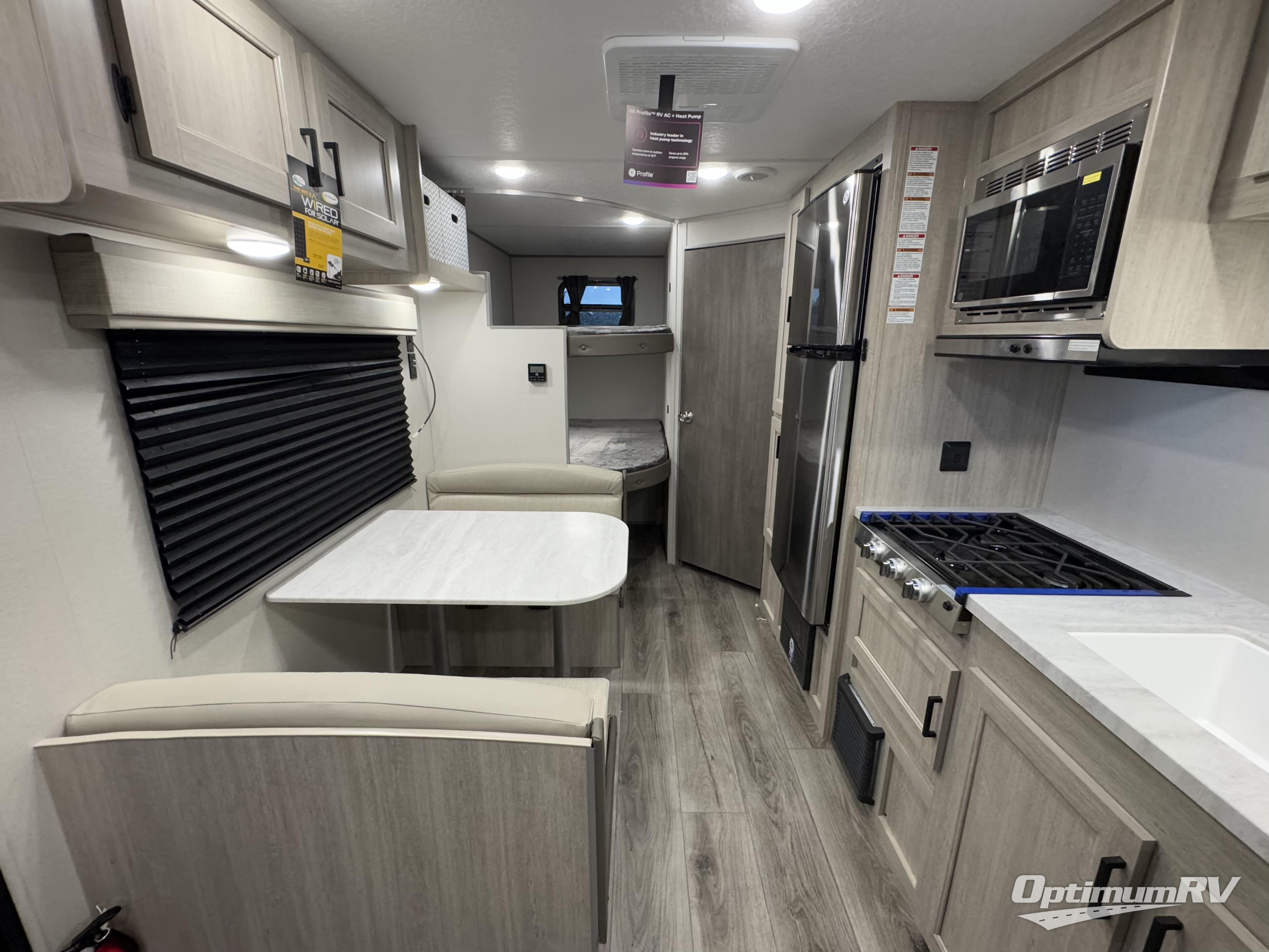 You'll love camping and spending time together in this travel trailer for seven! The bunk beds include under-bunk storage to keep bags out of the way, and the full bath is right next to the bunks for easy nighttime use. A semi-private bedroom up front includes a privacy curtain so you can get dressed each morning, and there are dual wardrobes to keep your things tidy. The chef of your group can whip up breakfast each morning on the three burner cooktop or in the GE stainless microwave, and there is a GE 10.7 cu. ft. 12V refrigerator to keep perishables fresh! A booth dinette provides a place to dine, or you can take your plate outdoors to sit under the 15' power awning with multicolored lights!