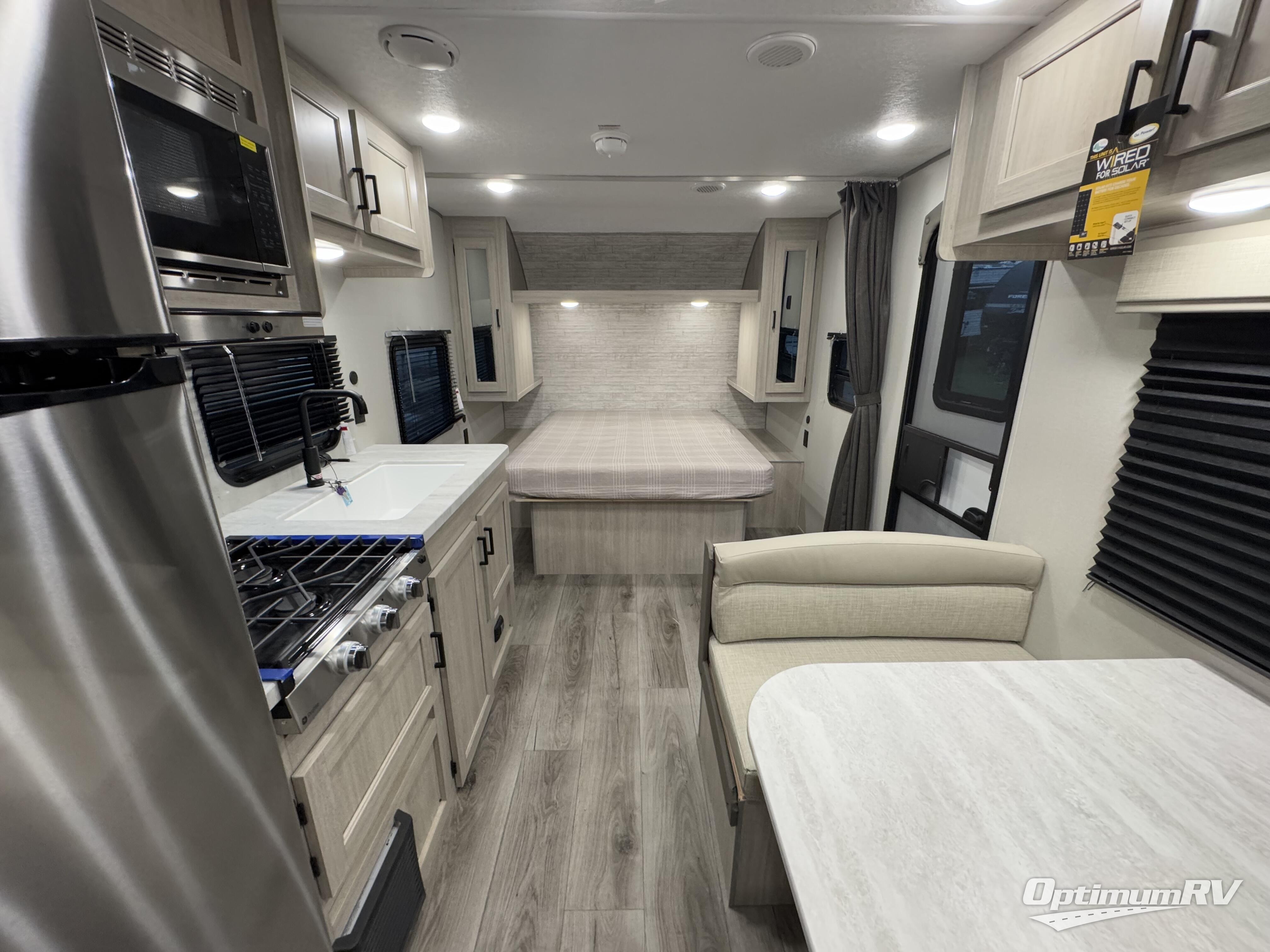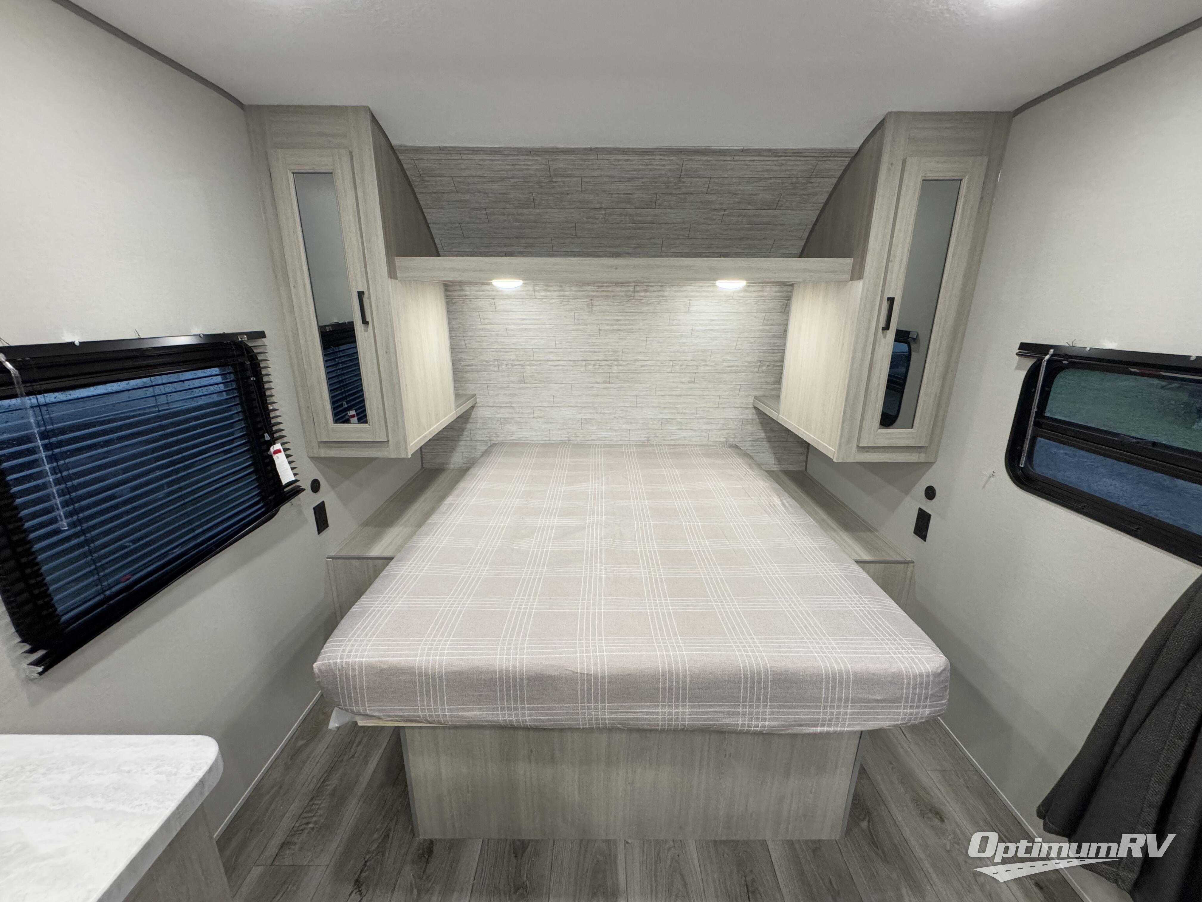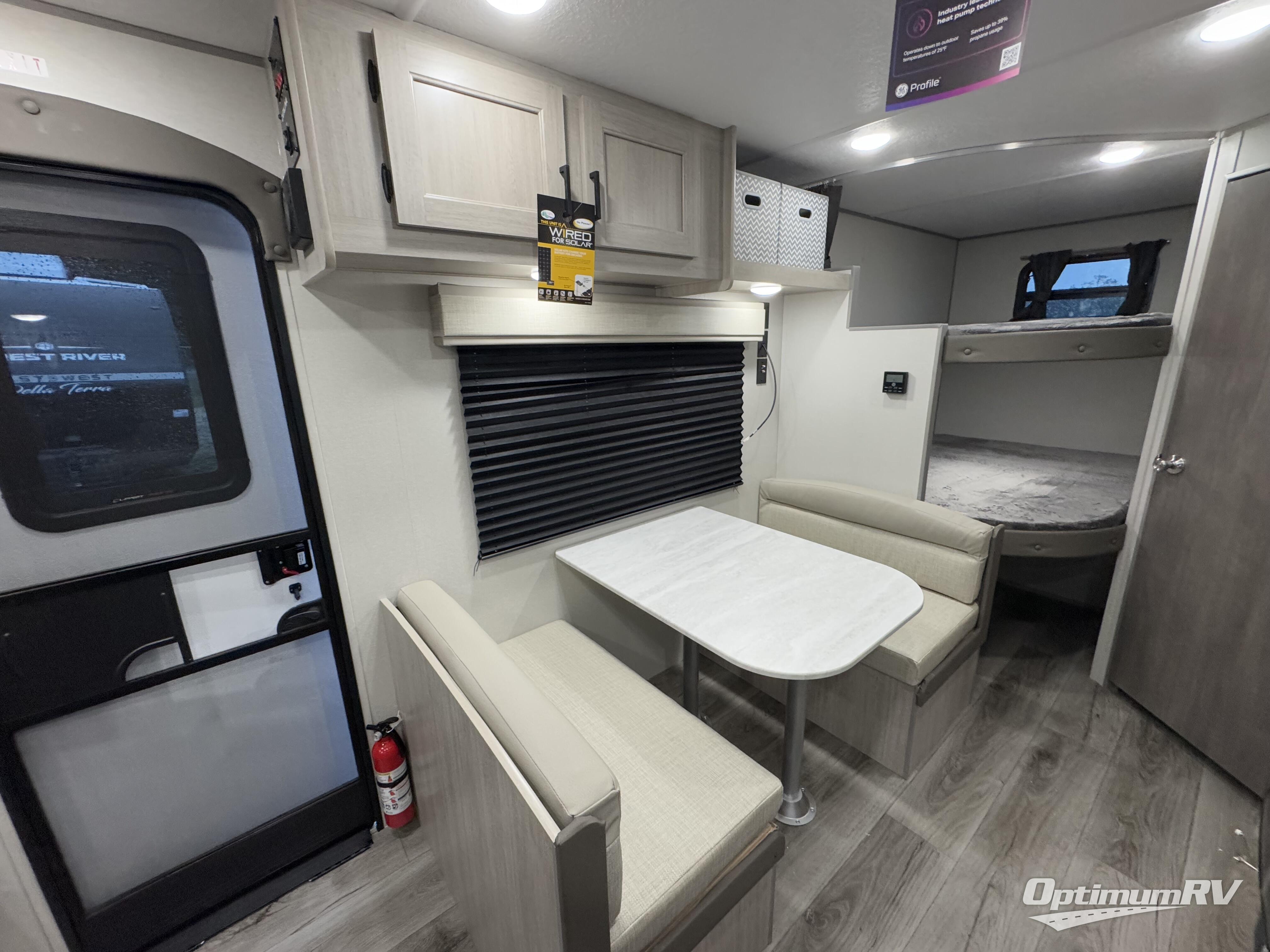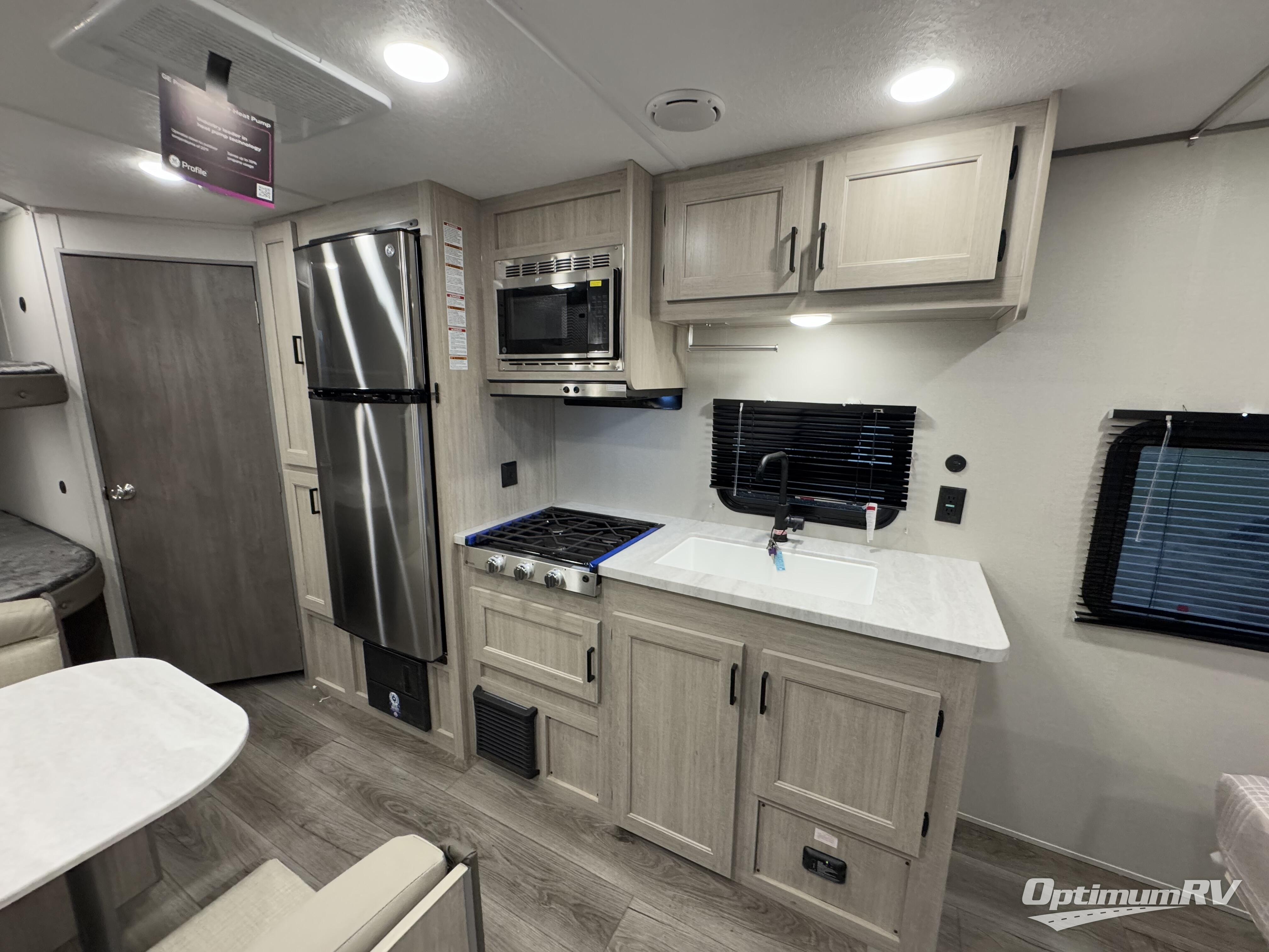 You'll love camping and spending time together in this travel trailer for seven! The bunk beds include under-bunk storage to keep bags out of the way, and the full bath is right next to the bunks for easy nighttime use. A semi-private bedroom up front includes a privacy curtain so you can get dressed each morning, and there are dual wardrobes to keep your things tidy. The chef of your group can whip up breakfast each morning on the three burner cooktop or in the GE stainless microwave, and there is a GE 10.7 cu. ft. 12V refrigerator to keep perishables fresh! A booth dinette provides a place to dine, or you can take your plate outdoors to sit under the 15' power awning with multicolored lights!