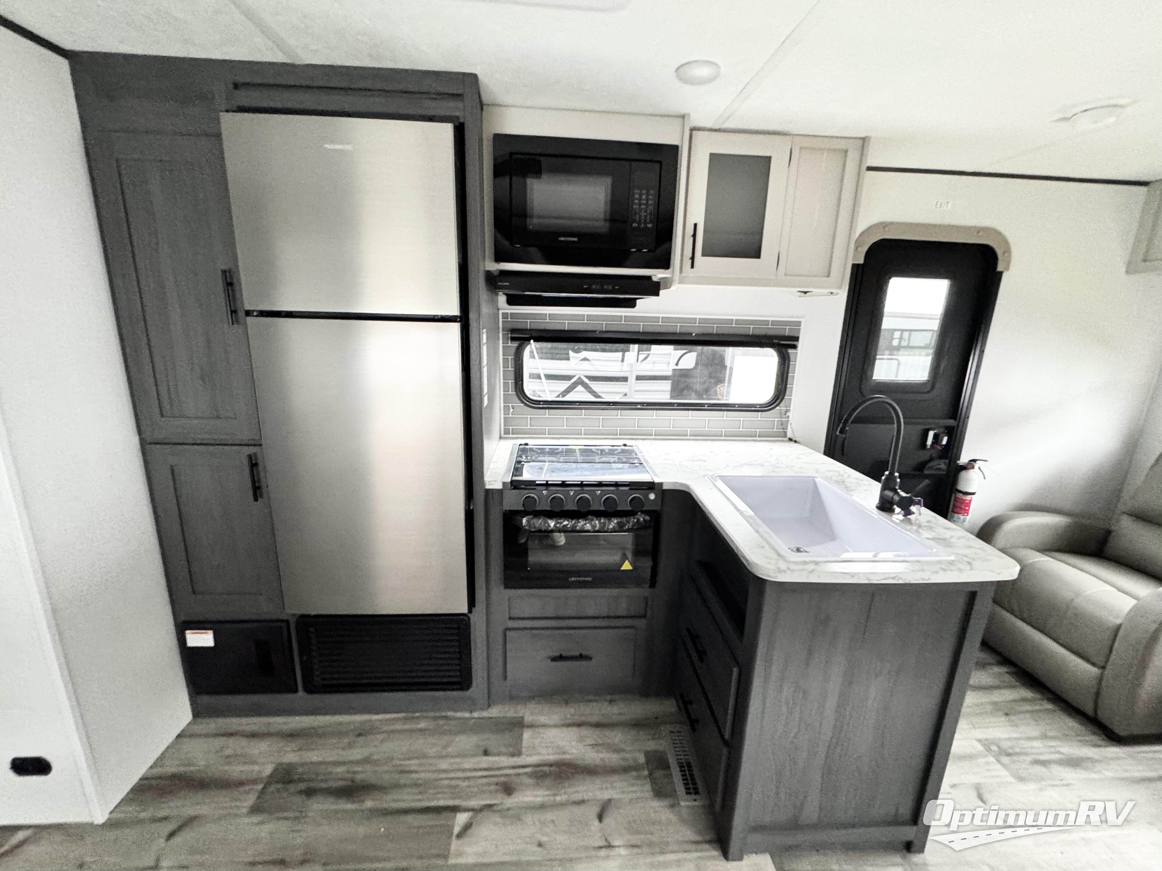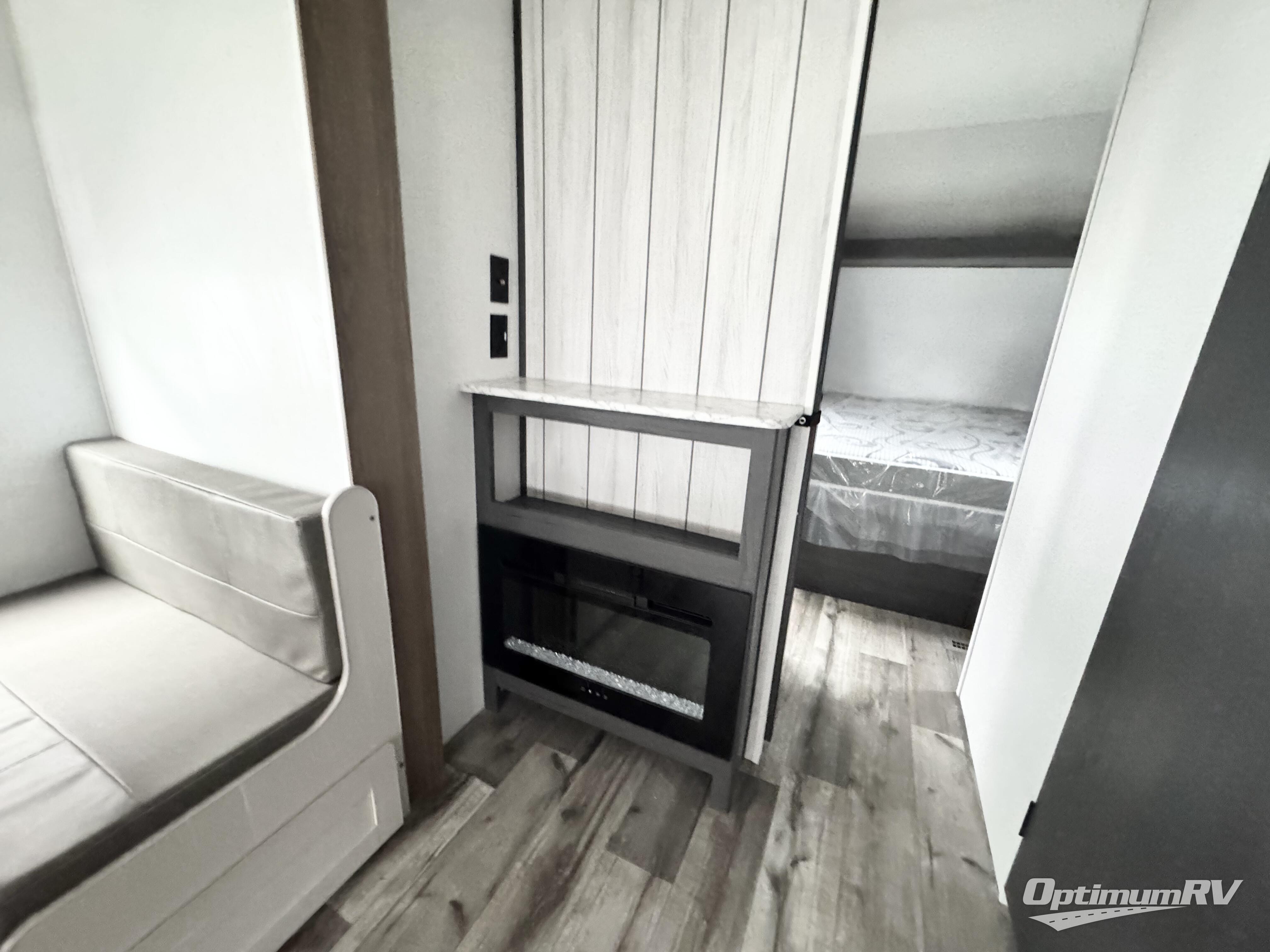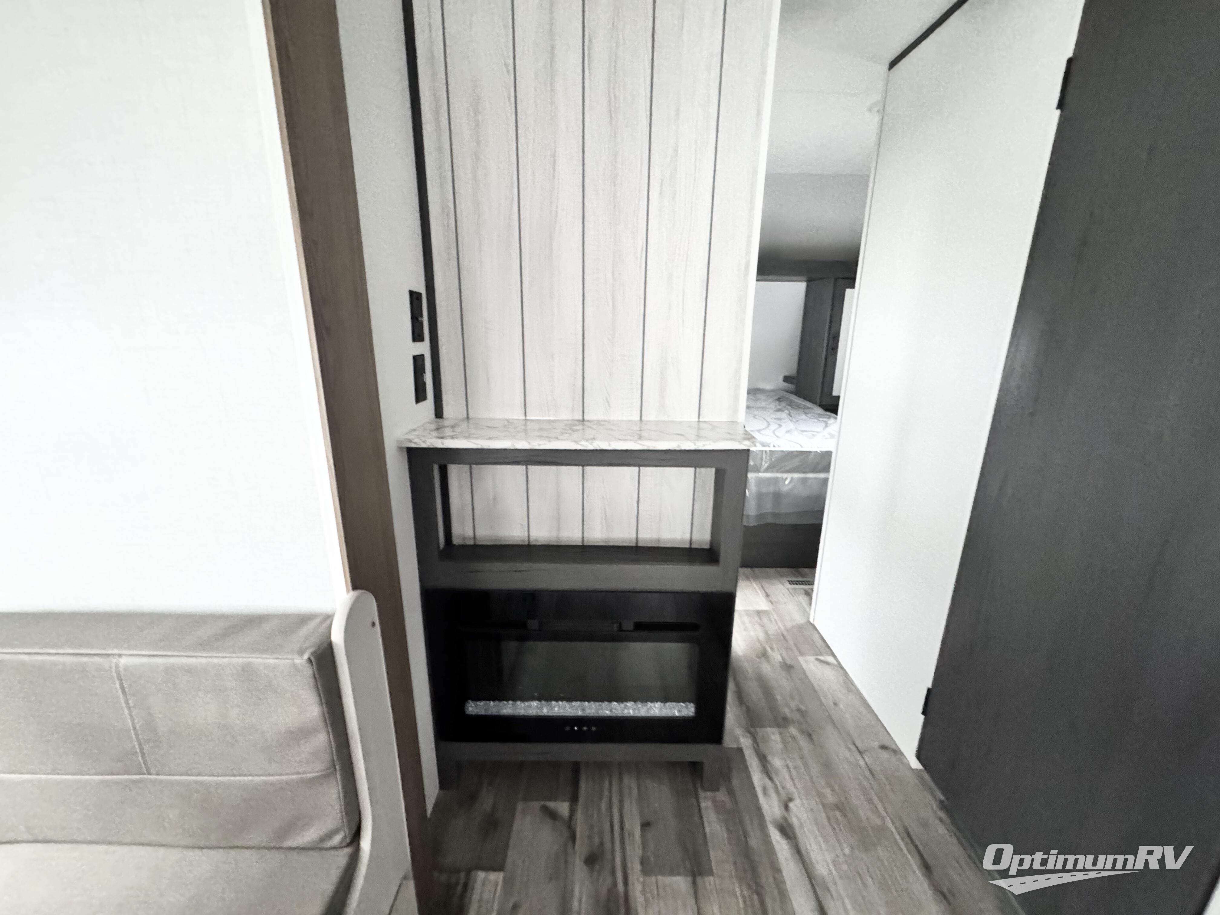 With dual entry doors, you can easily enter and exit this travel trailer! The jackknife sofa with footrest and booth dinette are next to each other near the fireplace, as well as two rear recliners allowing you to visit with other RVers or your family. The cook will have an oven and a microwave to make meals, and a 10 cu. ft. 12V refrigerator for cold items, plus a galley sink with high rise faucet to keep the dishes clean. Speaking of being clean, the full bathroom offers a shower with exhaust fan to eliminate unwanted steam as you clean yourself up after a fun day at the beach. The front private bedroom has a residential queen bed and one of the entrance/exit doors so you can slip out for an early morning fishing trip!