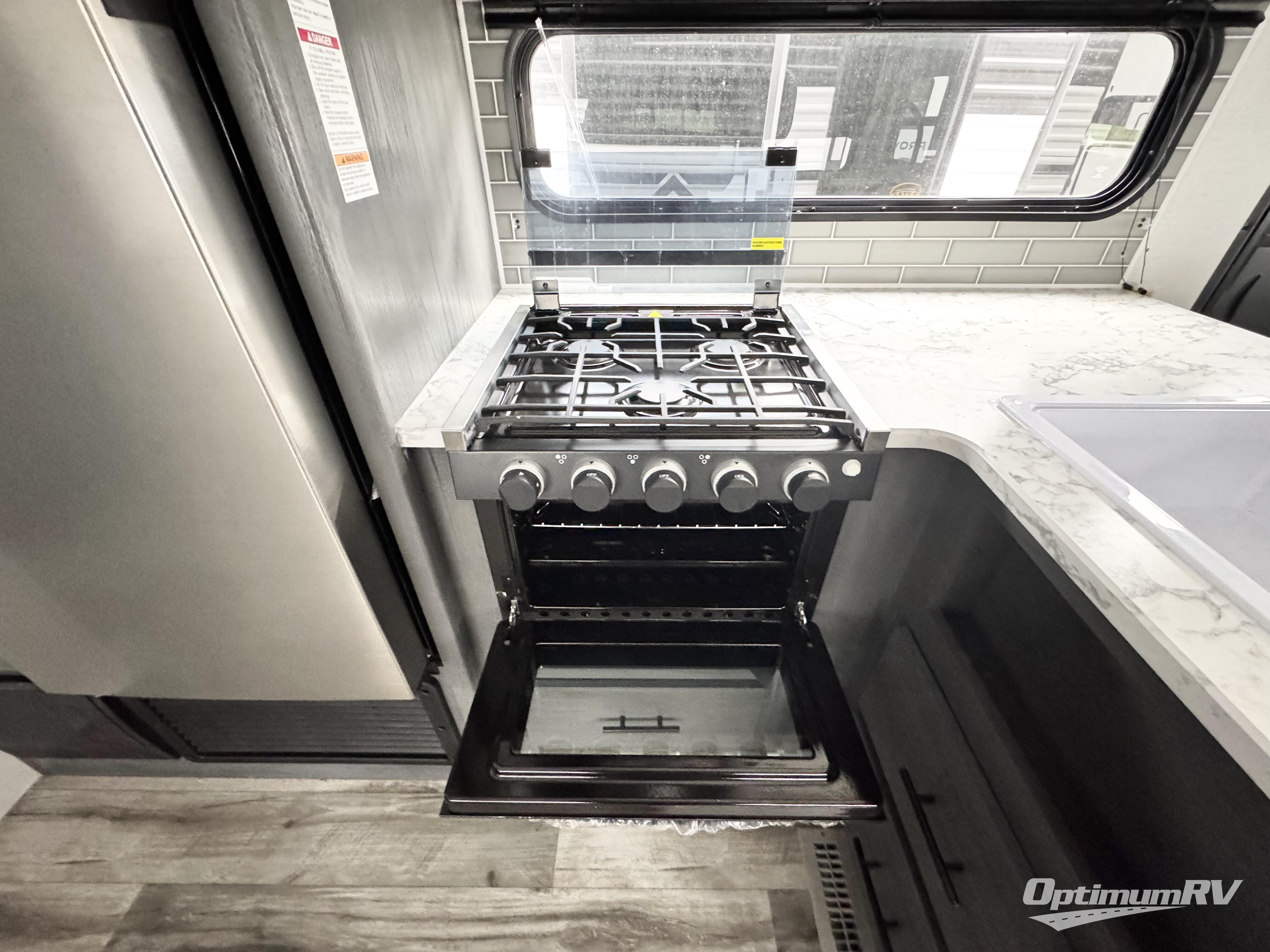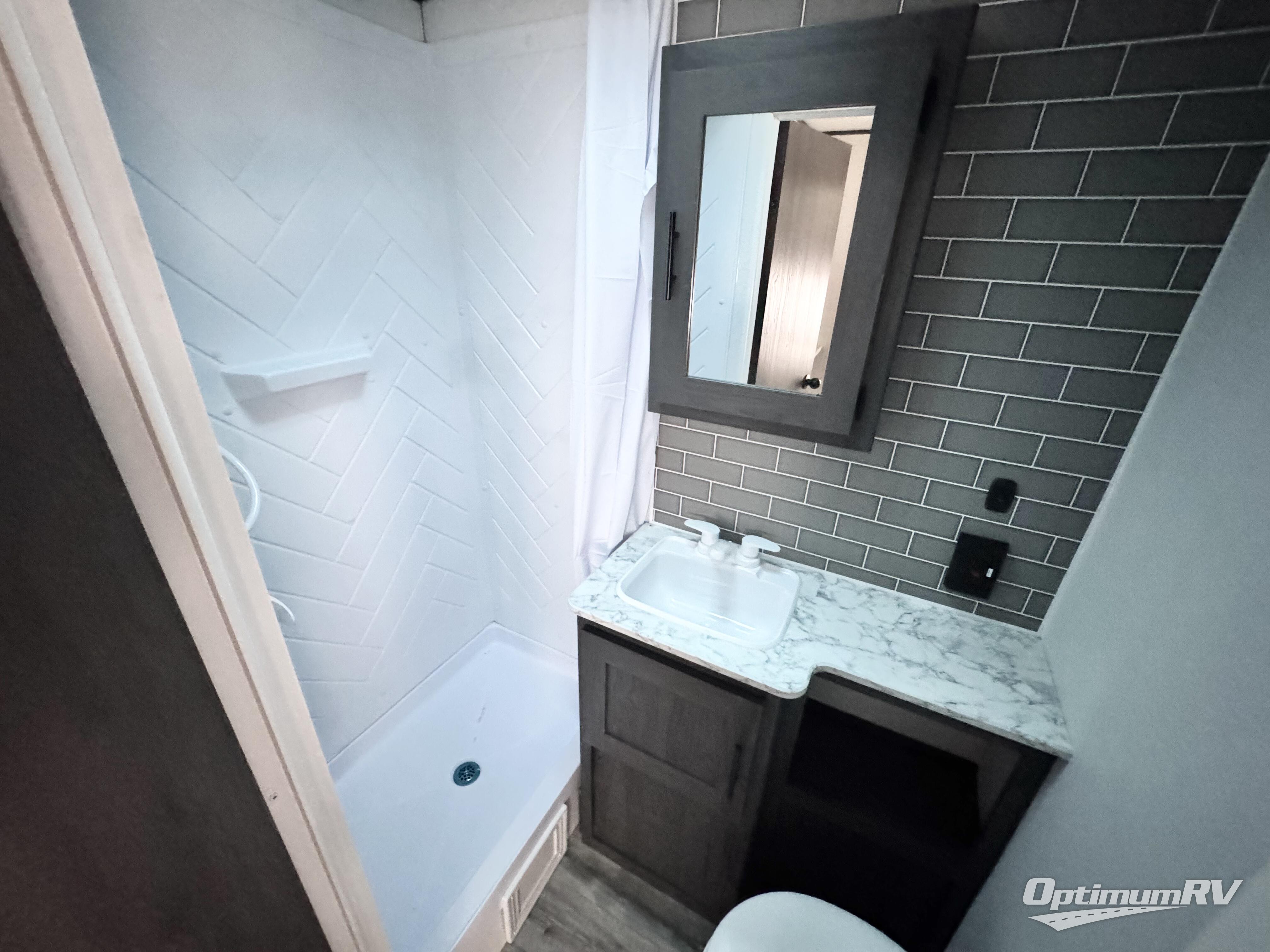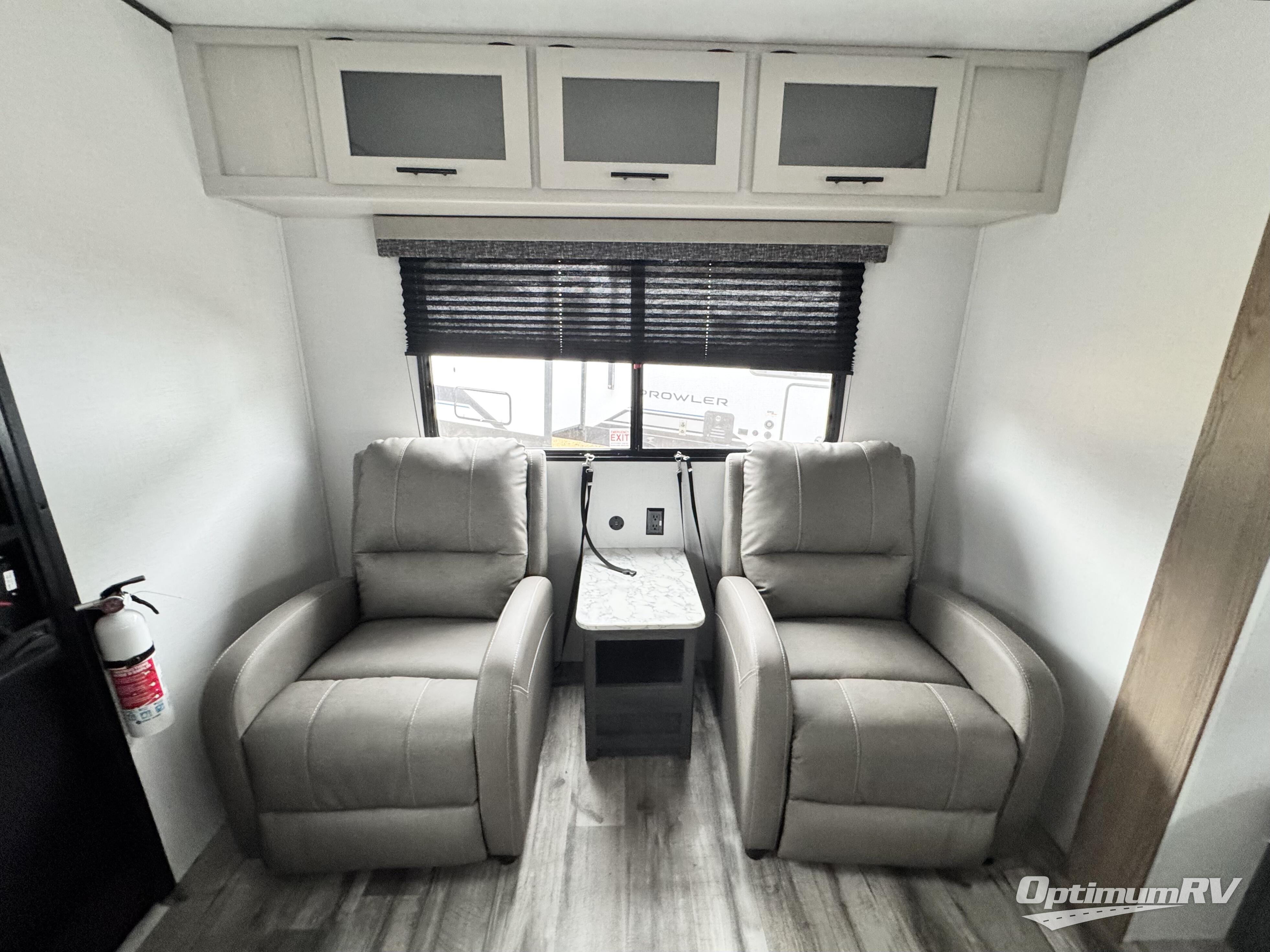 With dual entry doors, you can easily enter and exit this travel trailer! The jackknife sofa with footrest and booth dinette are next to each other near the fireplace, as well as two rear recliners allowing you to visit with other RVers or your family. The cook will have an oven and a microwave to make meals, and a 10 cu. ft. 12V refrigerator for cold items, plus a galley sink with high rise faucet to keep the dishes clean. Speaking of being clean, the full bathroom offers a shower with exhaust fan to eliminate unwanted steam as you clean yourself up after a fun day at the beach. The front private bedroom has a residential queen bed and one of the entrance/exit doors so you can slip out for an early morning fishing trip!