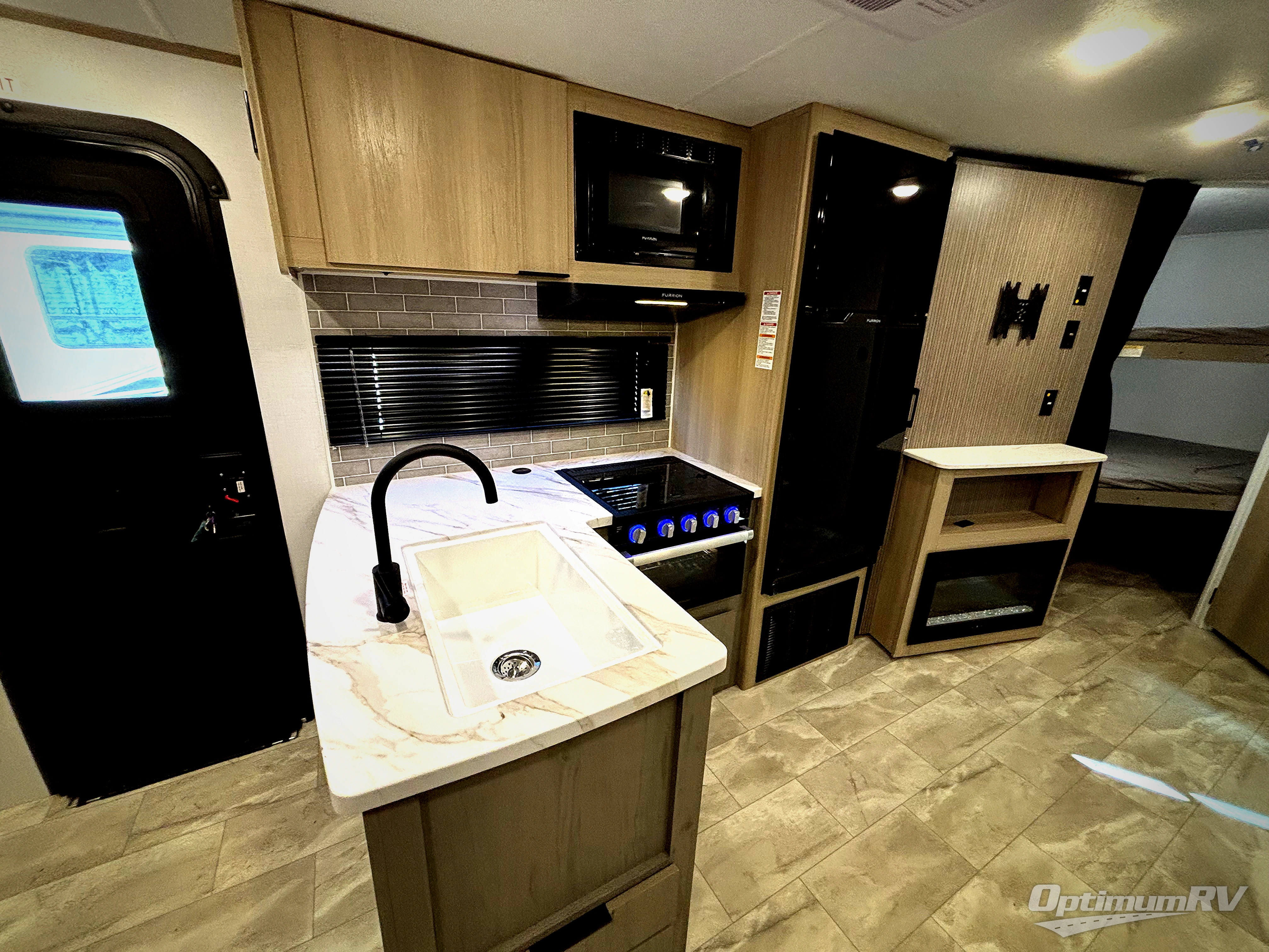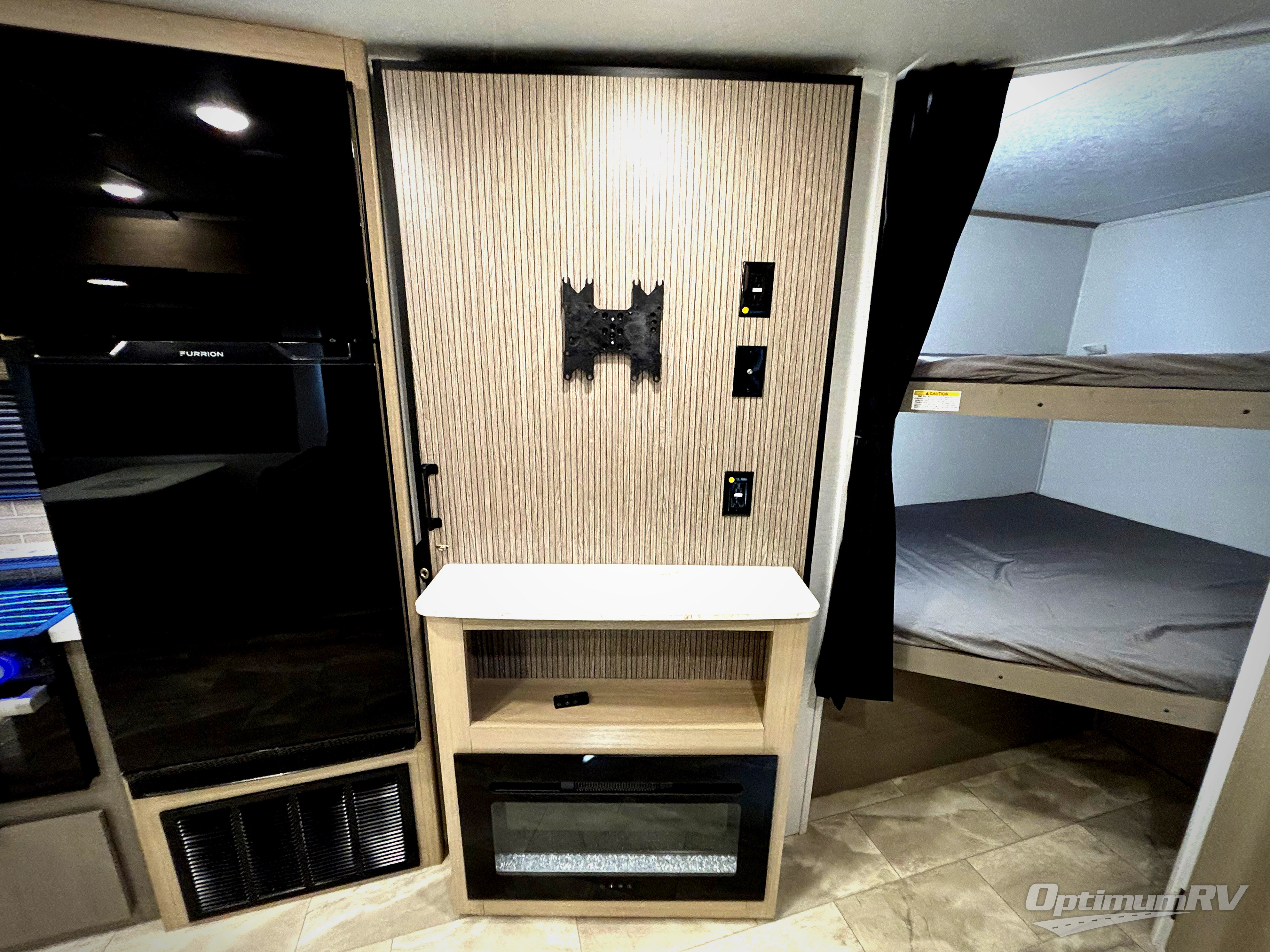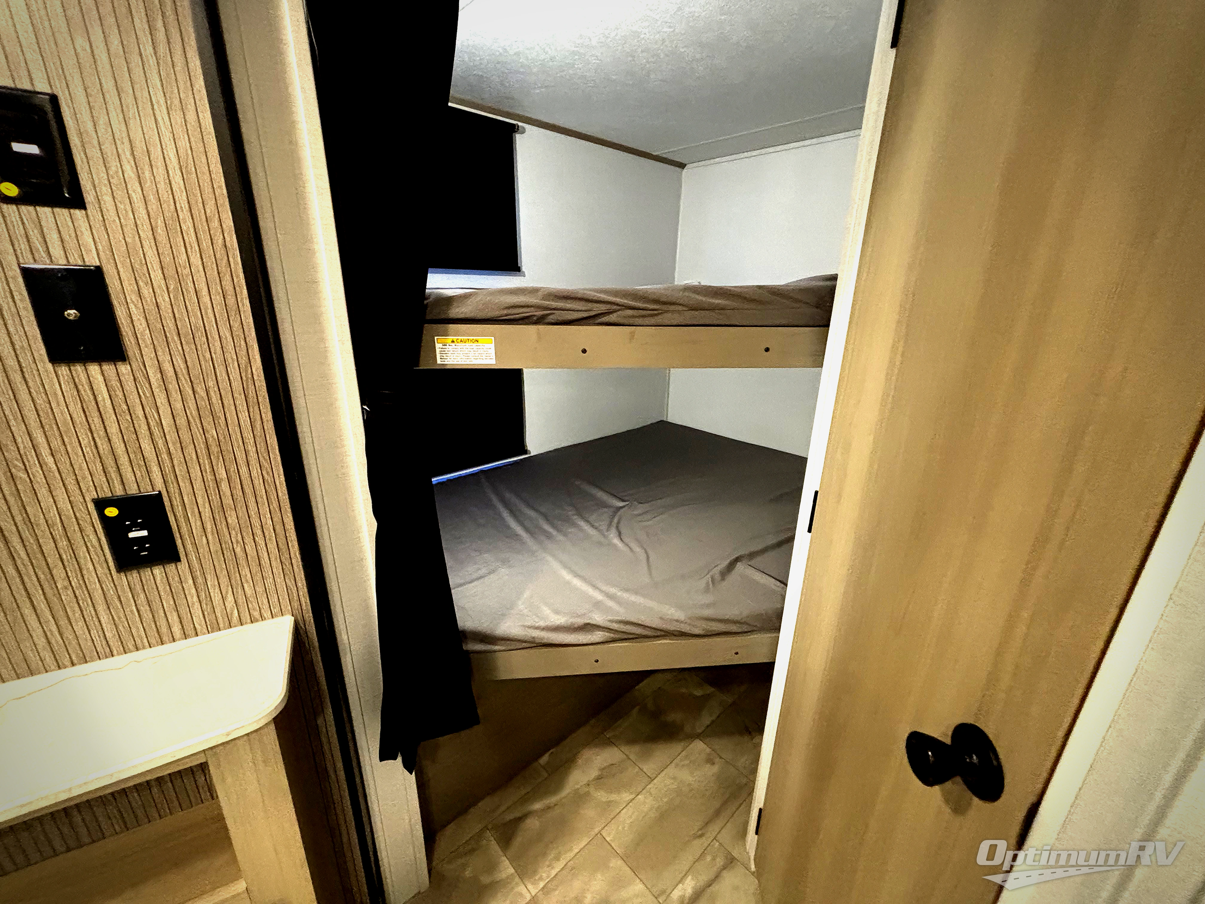 This bunkhouse model is perfect for weekend excursions or extended getaways at your favorite state park. You will have your own queen bed up front with storage space for your things, and the double-size bunks in the back will be perfect for guests. Prepare your meals on the cooktop or in the microwave oven, and you can dine together at the booth dinette. The dinette can also be used as additional sleeping space for one guest or two kids. Outside, a 14' power awning will provide some shade, and an outdoor refrigerator will keep cold drinks close by!