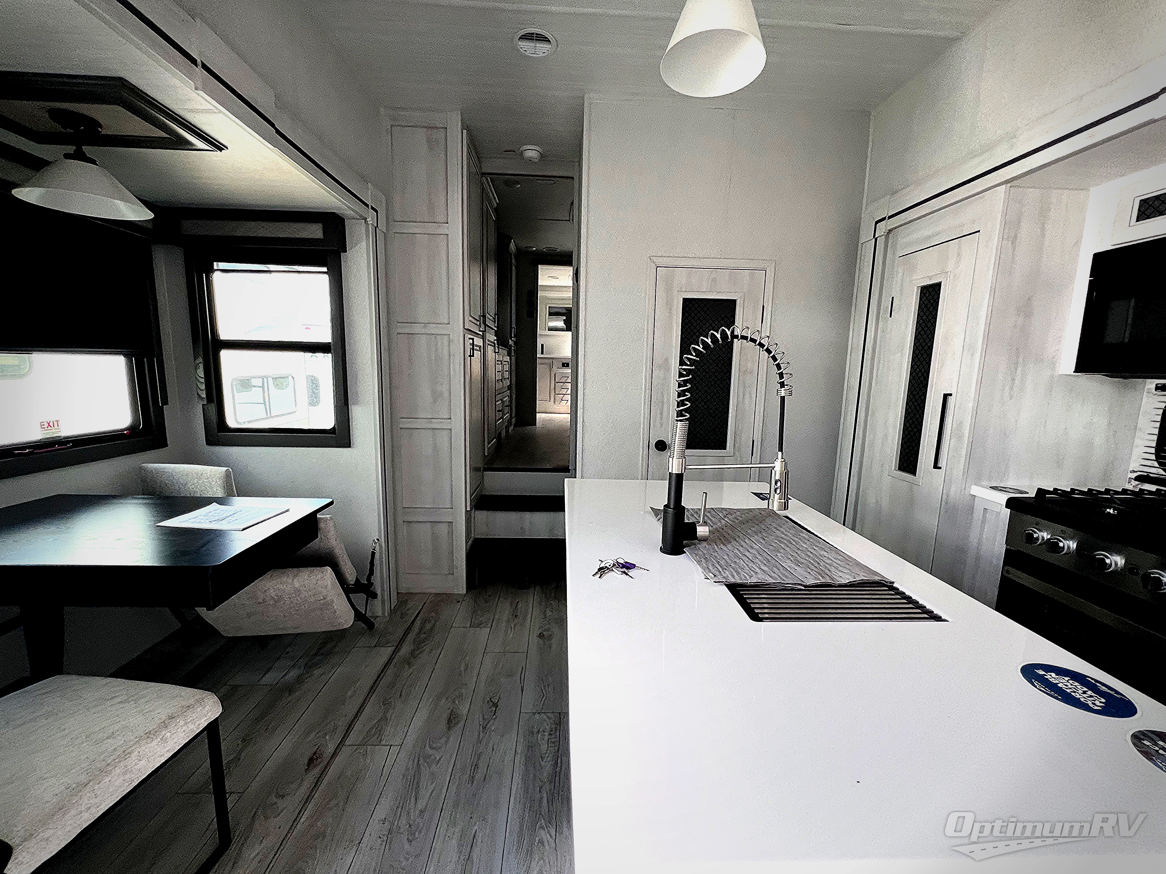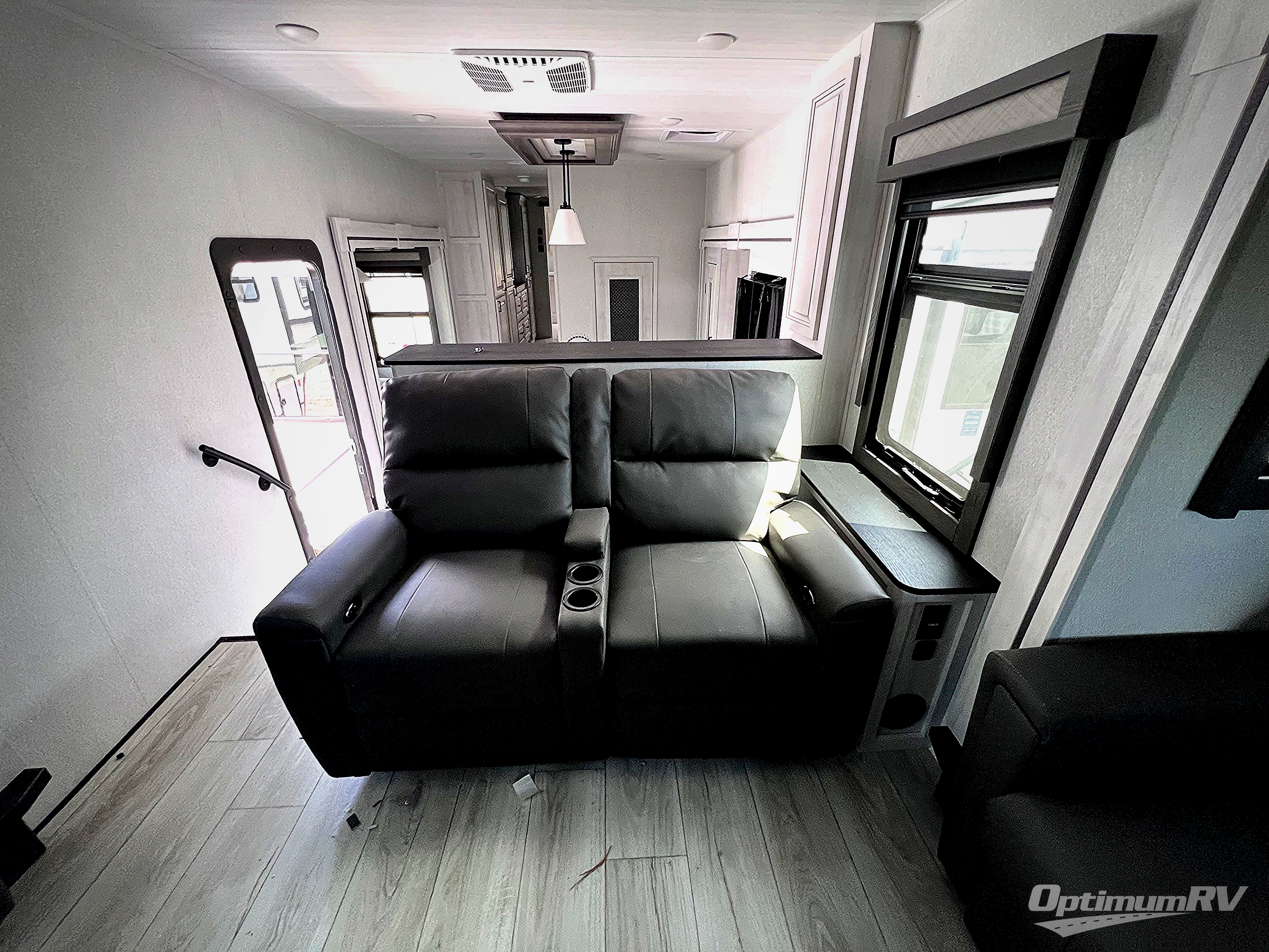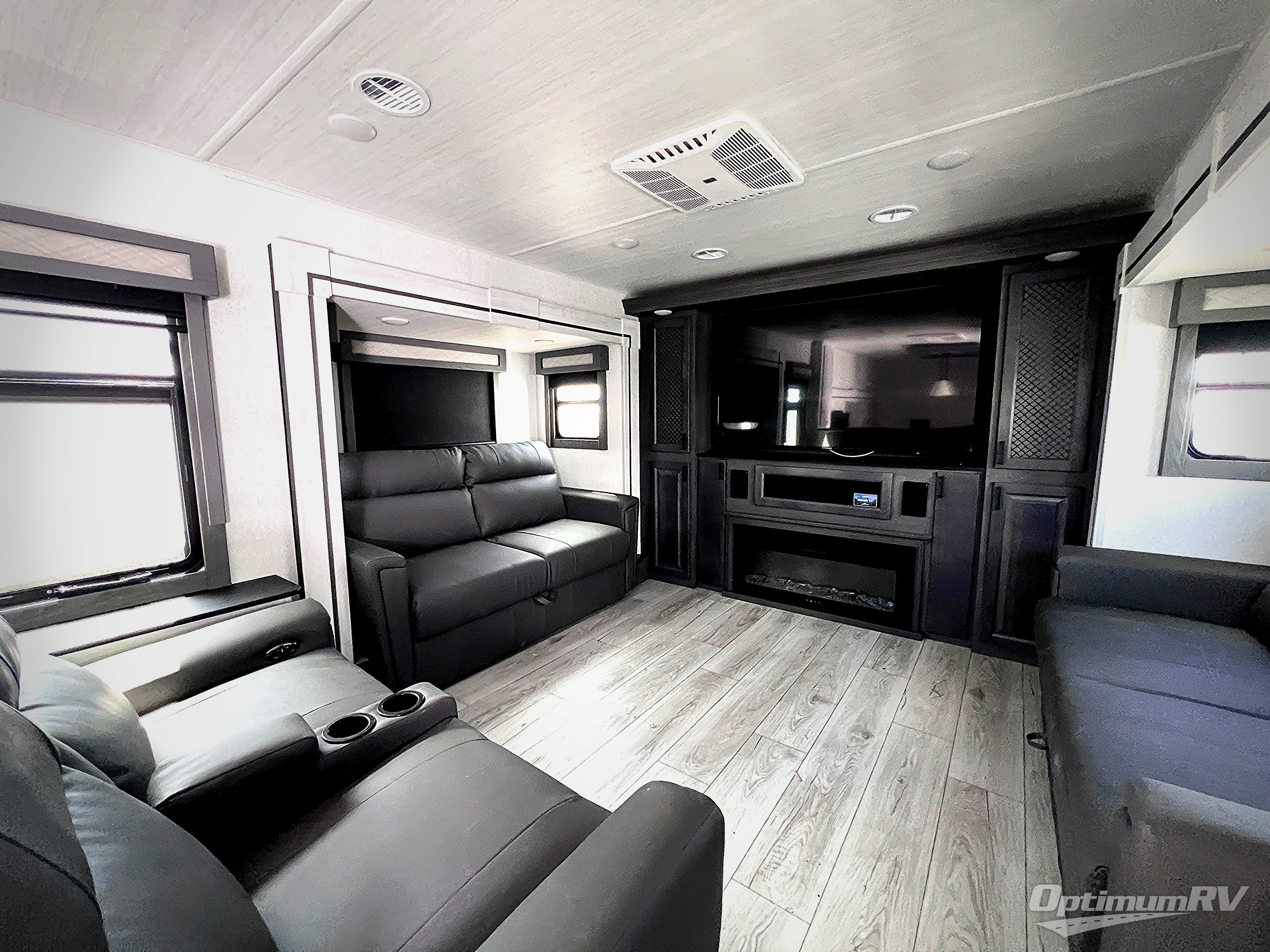 If you've been looking for a luxury fifth wheel to call your new home away from home, take a look at this Ahara! The front living area will be a favorite hangout spot with its dual hide-a-bed sofa, theater seating, and 65" TV with a fireplace. And since there are dual opposing slides here, your guests will have plenty of space to fold down the sofas at night for a great night's rest. If you're looking for your bedroom, head to the back and you'll enjoy a king bed slide out, a dresser with TV, two closets, plus your own full rear bath. The dual bath sinks are sure to come in handy when you're both getting ready for bed, and the spacious shower with a skylight will provide natural light as you clean up in the morning. There is even a closet with washer and dryer prep if you plan to go full-time. In the morning you can prepare breakfast on the four burner cooktop or in the 30" over-the-range residential microwave, and the 16 cu. ft. 12V French door refrigerator includes a double drawer freezer to hold more food. There is a free-standing dinette, a hutch to store nice dishes, and the half bath is located off of this room for convenience!