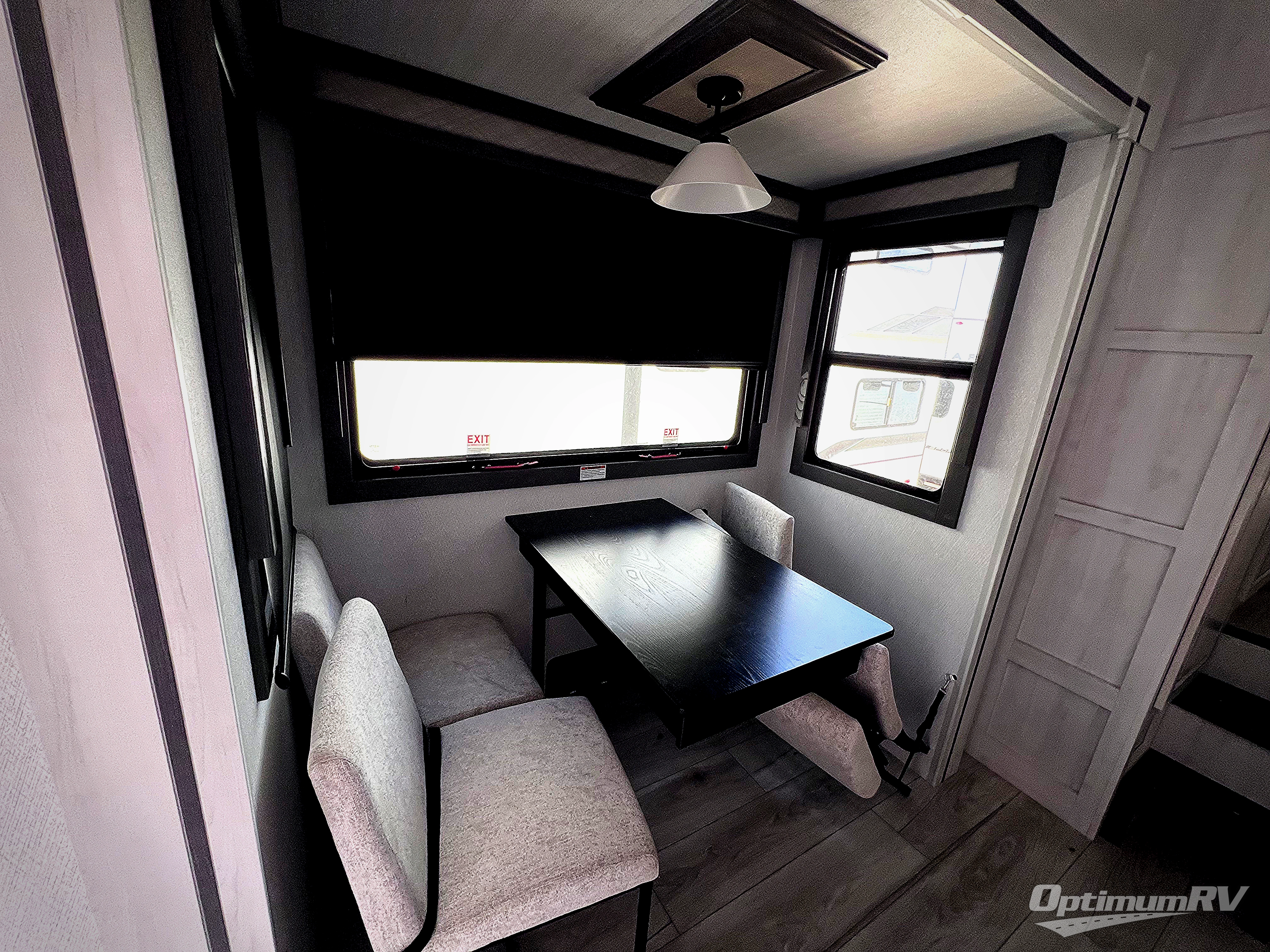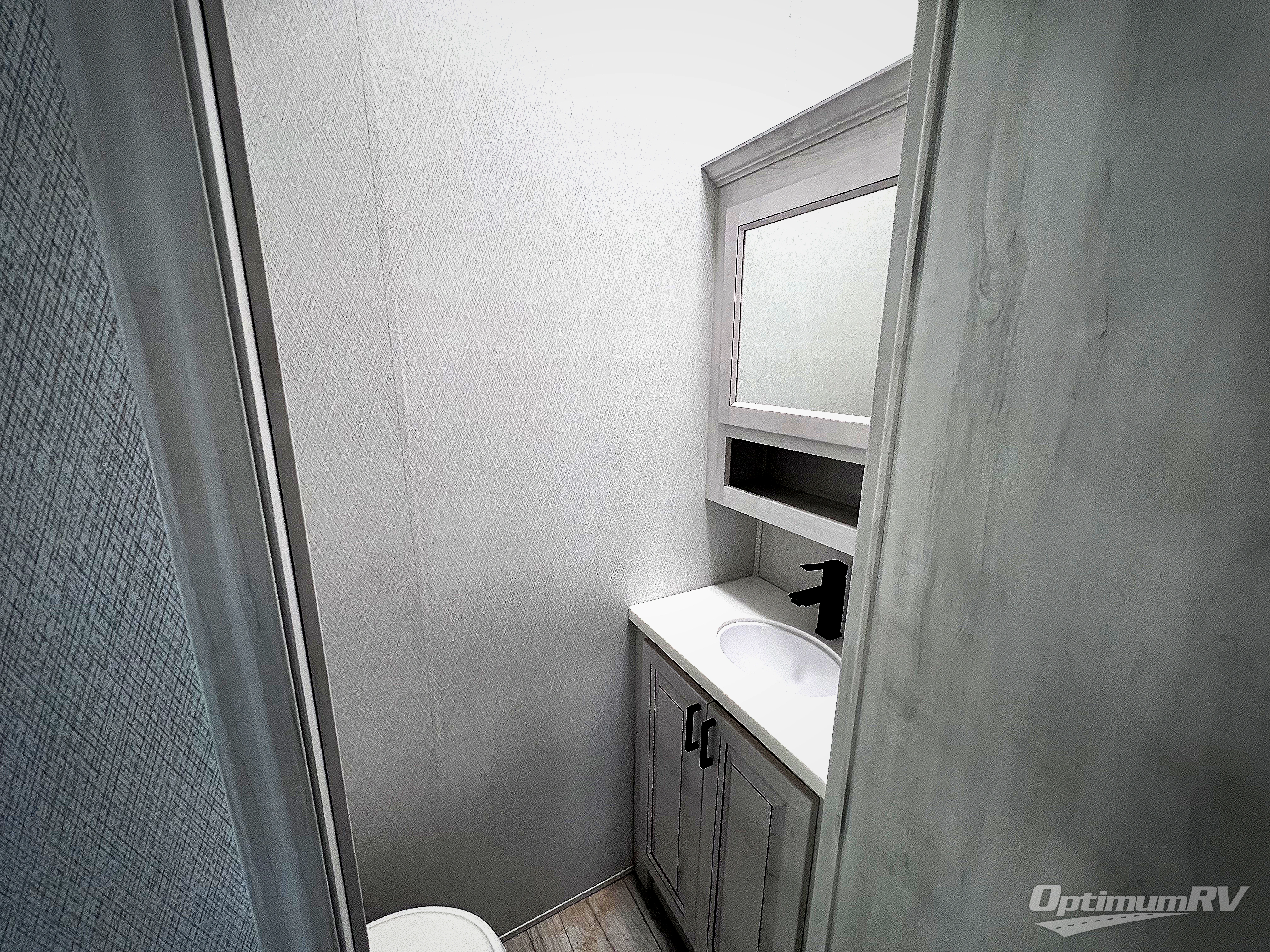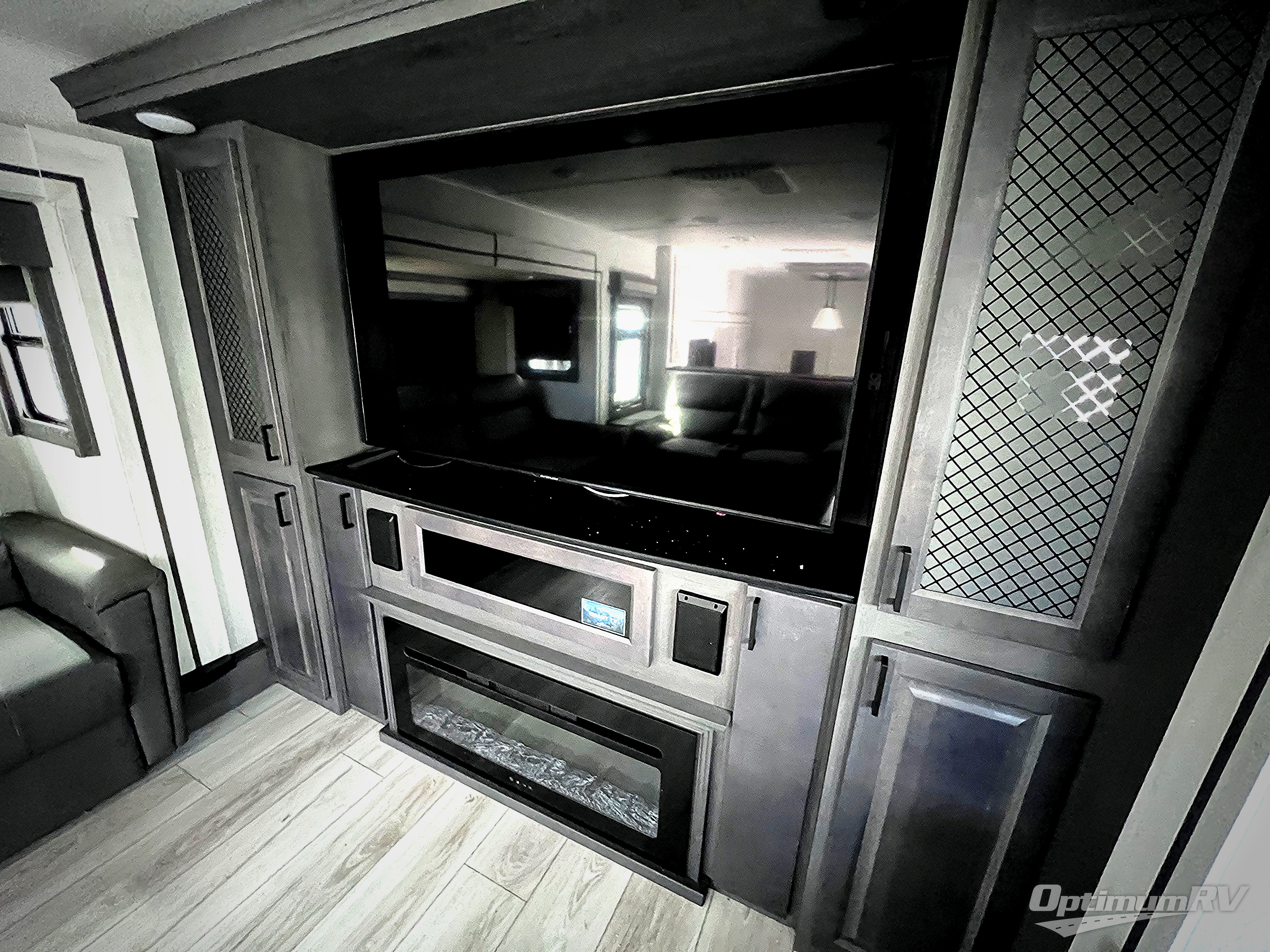 If you've been looking for a luxury fifth wheel to call your new home away from home, take a look at this Ahara! The front living area will be a favorite hangout spot with its dual hide-a-bed sofa, theater seating, and 65" TV with a fireplace. And since there are dual opposing slides here, your guests will have plenty of space to fold down the sofas at night for a great night's rest. If you're looking for your bedroom, head to the back and you'll enjoy a king bed slide out, a dresser with TV, two closets, plus your own full rear bath. The dual bath sinks are sure to come in handy when you're both getting ready for bed, and the spacious shower with a skylight will provide natural light as you clean up in the morning. There is even a closet with washer and dryer prep if you plan to go full-time. In the morning you can prepare breakfast on the four burner cooktop or in the 30" over-the-range residential microwave, and the 16 cu. ft. 12V French door refrigerator includes a double drawer freezer to hold more food. There is a free-standing dinette, a hutch to store nice dishes, and the half bath is located off of this room for convenience!