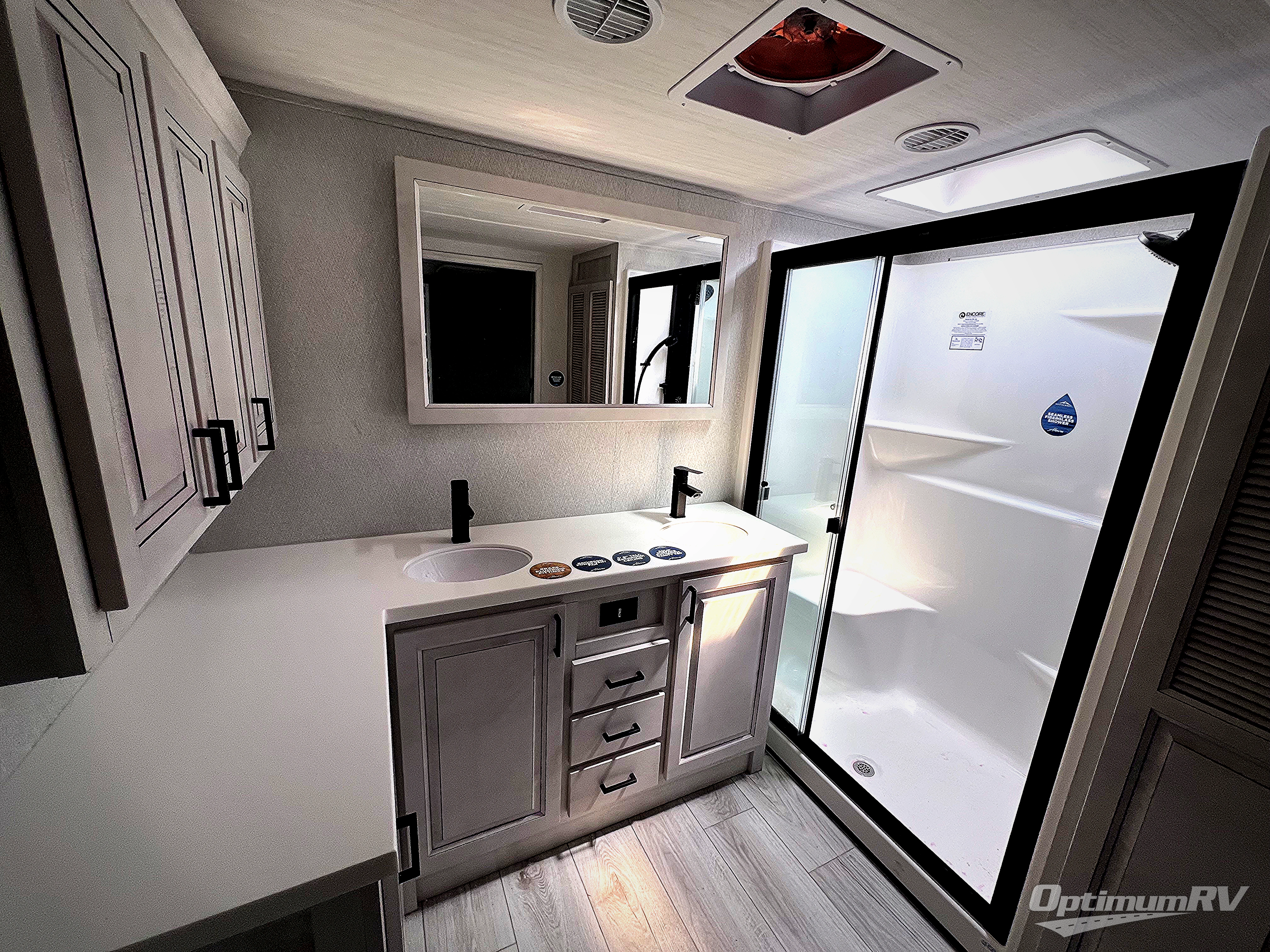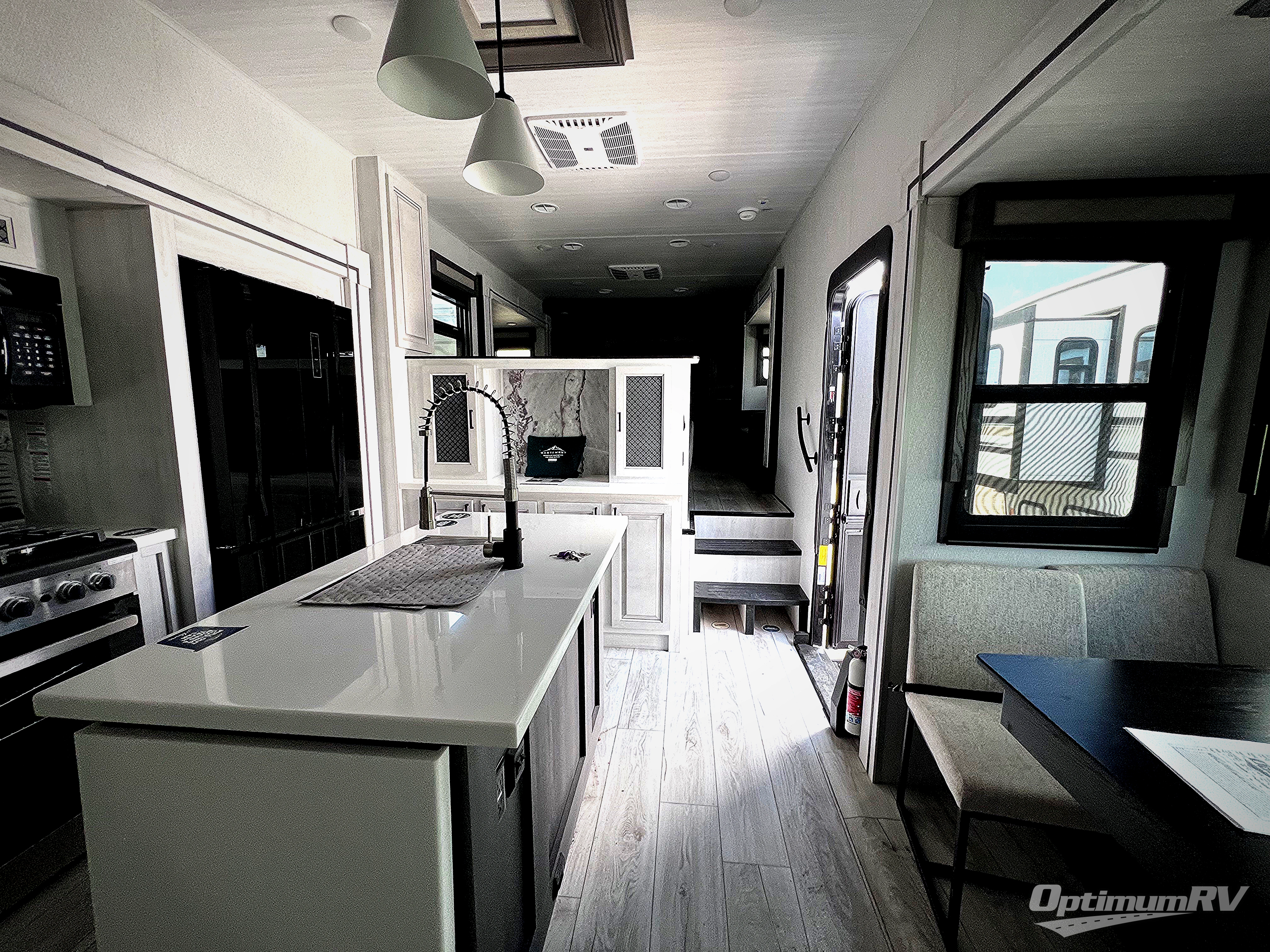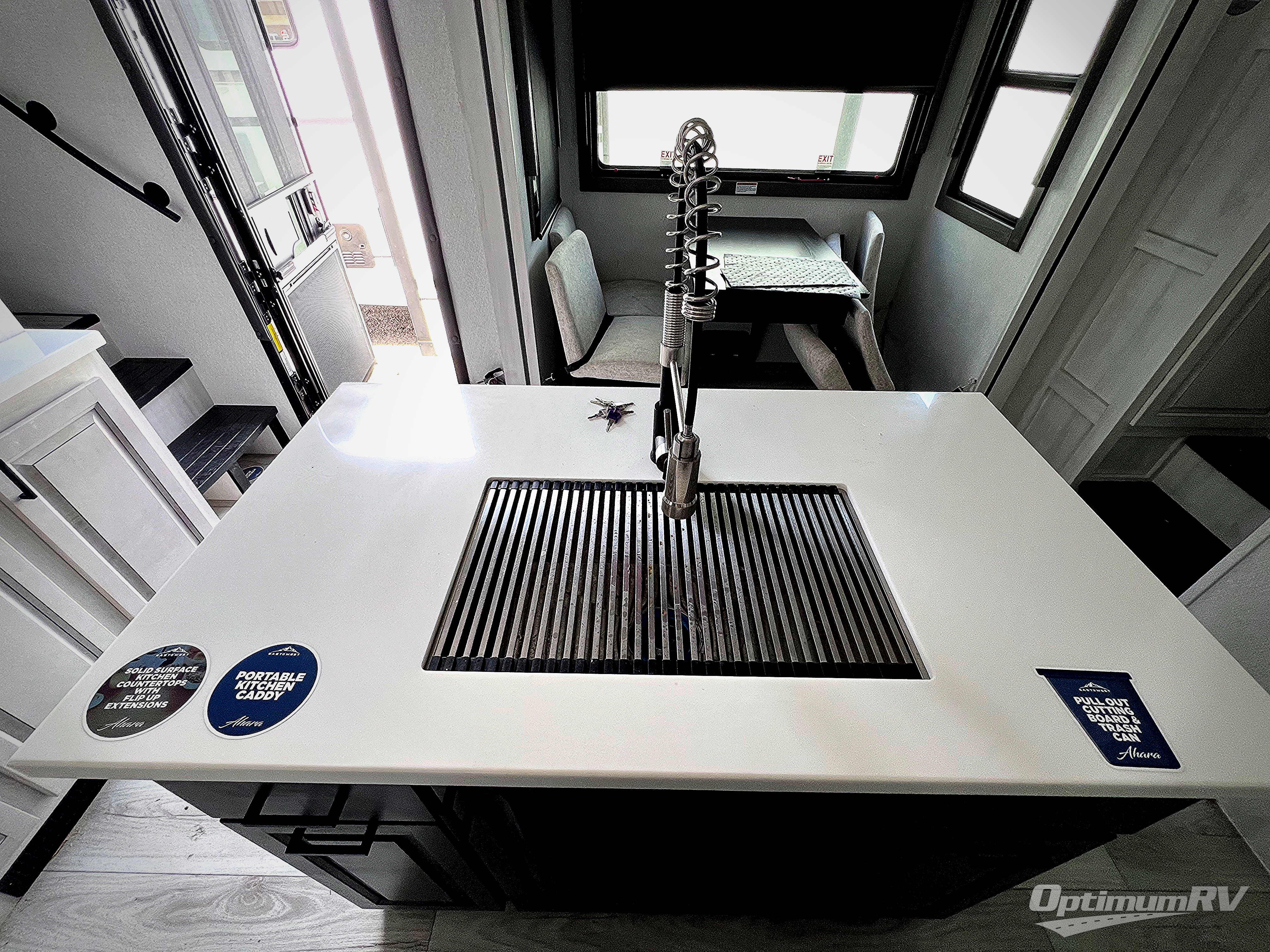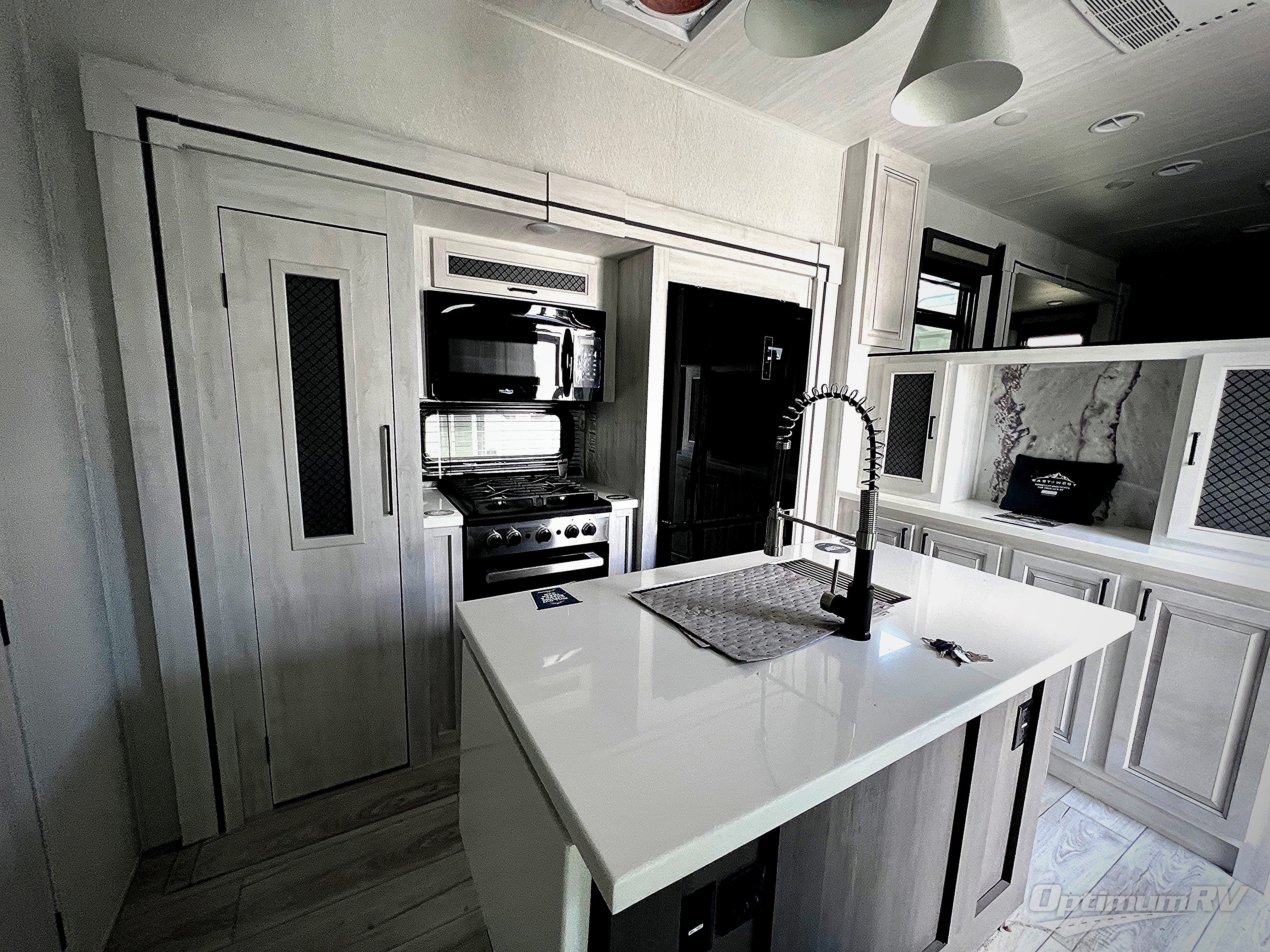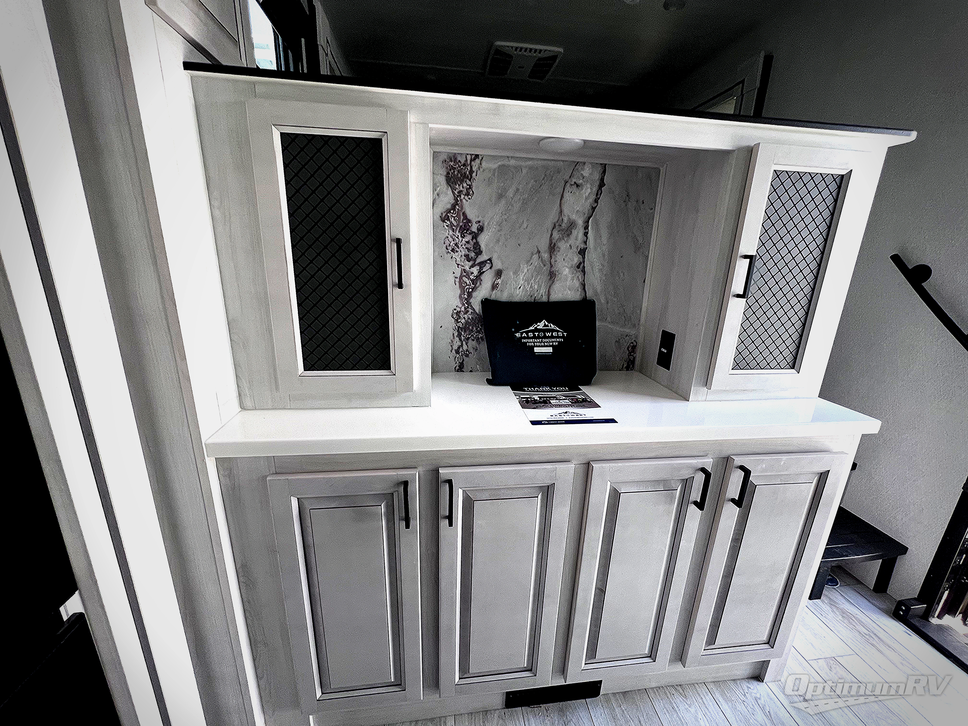 There is just too much luxury to name on the EAST TO WEST Ahara fifth wheel! These units are quite impressive, and once you see them, you'll know what we mean. The Ahara first grabs your attention with its hi-gloss gel-coated fiberglass exterior which showcases two power awnings with LED lights, an LP quick connect, an exterior cable/satellite hookup, and a universal all-in-one docking station. For towing, you'll find a MORryde CRE 3000 suspension, Dexter Gladiator thick-wall 7,000-LB axles with Nev-R-Adjust brakes, and preparations for a rearview camera. Traveling during all seasons is also made easy with the high-efficiency triple A/C system, a 40,000 BTU high-capacity furnace, a heated, insulated, and enclosed underbelly and dump valves with circulating heat, and Radiant Technology Composites insulation in the roof, front cap, and underbelly.