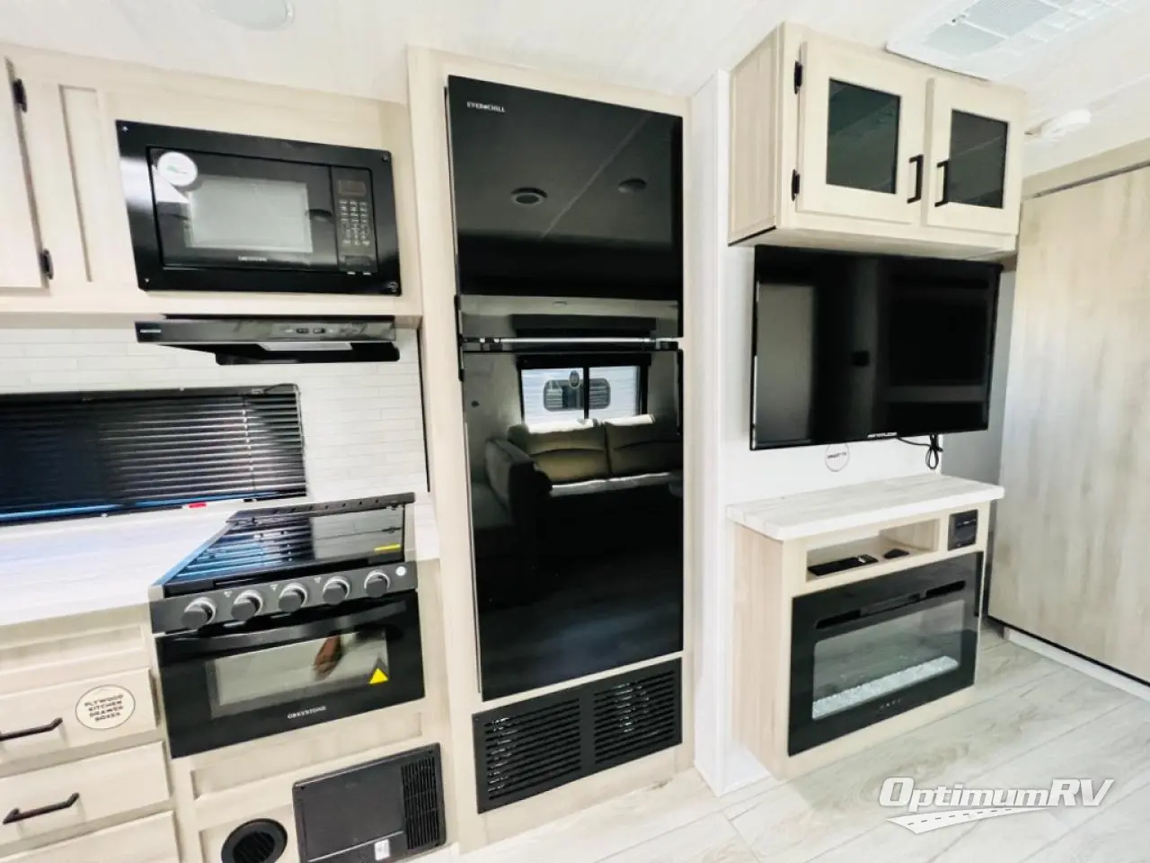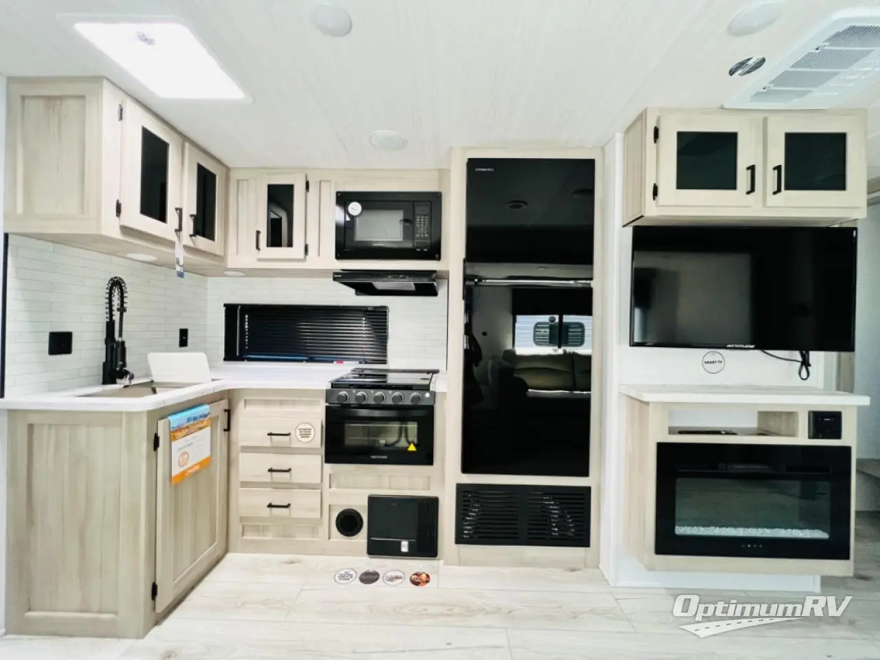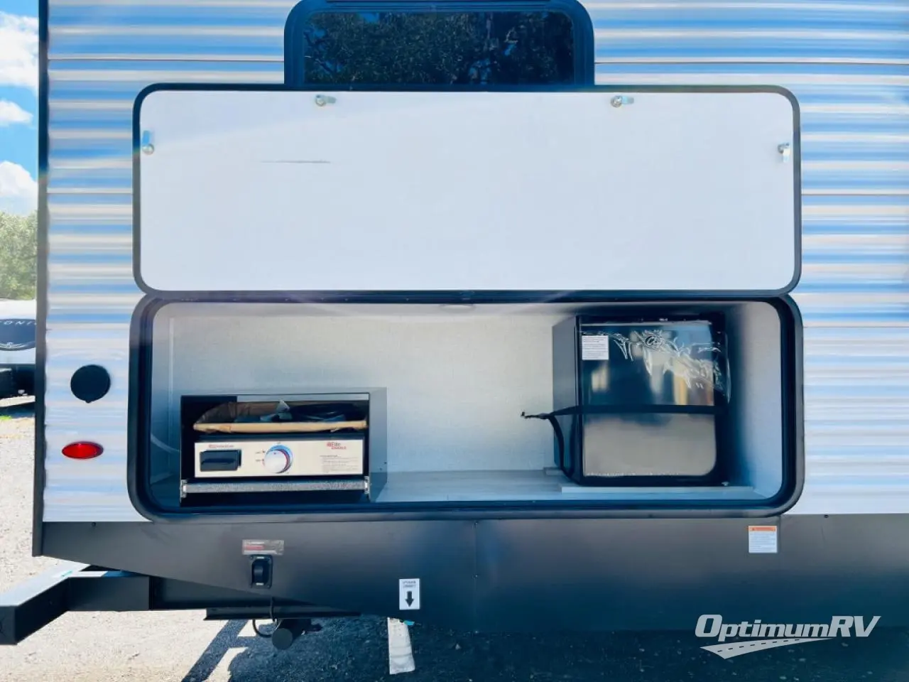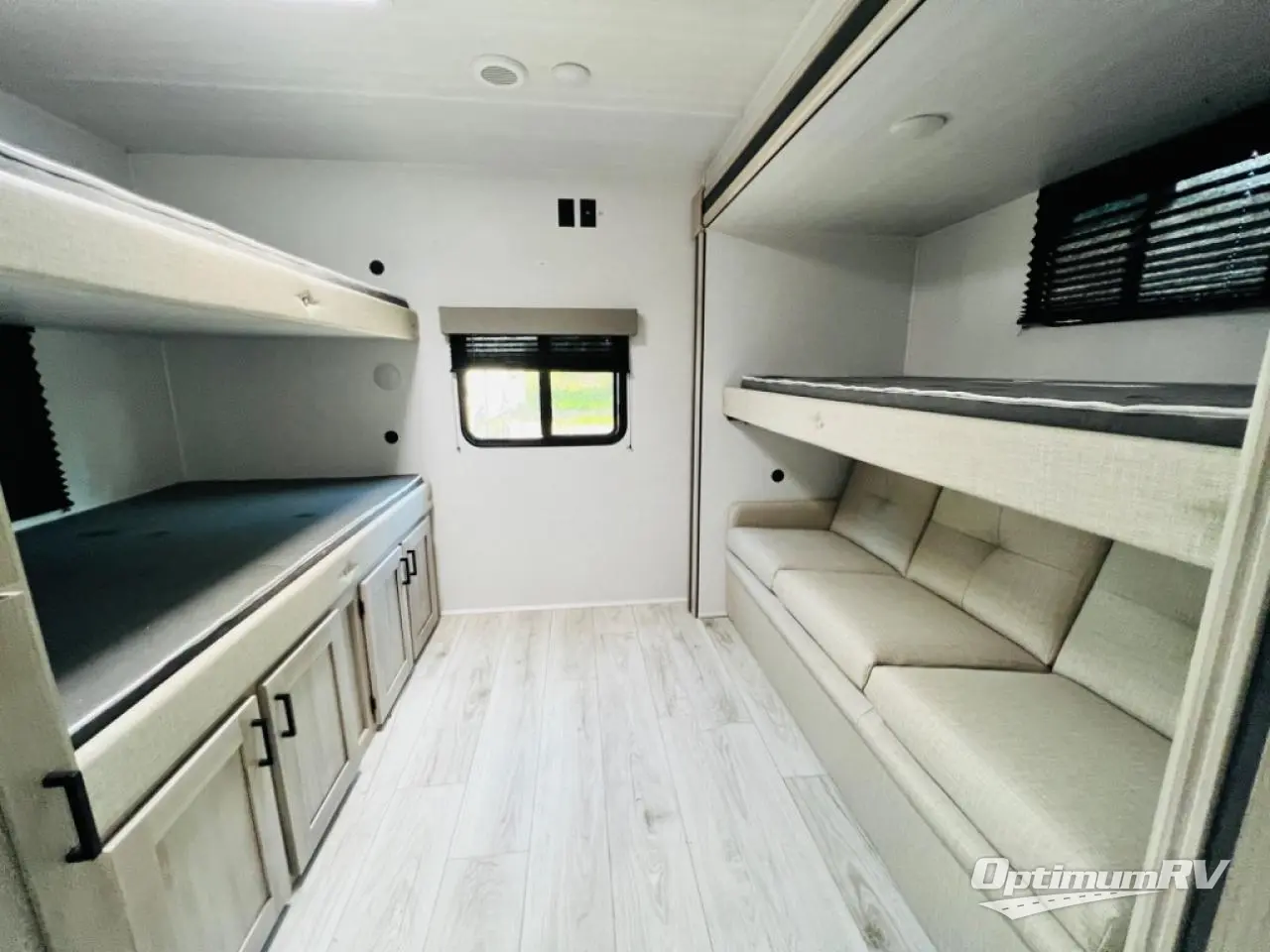 Head to the RV park for a long-weekend or week-long break from your everyday routine with this trailer at your favorite campsite. After setting up the two slide outs and the 15' power awning, you can relax inside on the jack knife sofa, dine at the oversized booth dinette or whip up a meal in the L-shaped kitchen. Everyone will enjoy the fireplace no matter what you are doing. The walk-through bathroom is super convenient, and the front bedroom allows you to live like a king in privacy. The rear bunkhouse also offers privacy and includes three bunk beds and a sofa, plus storage. Your kids or guests will love having their own room. And the exterior offers an optional outdoor kitchen, an oversized pass-through storage for your larger gear like fishing poles, outdoor tables and bags of charcoal, plus there are two spray ports to easily rinse off dirty bikes, shoes and such.