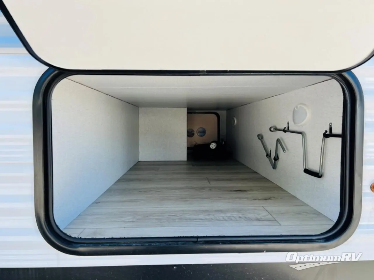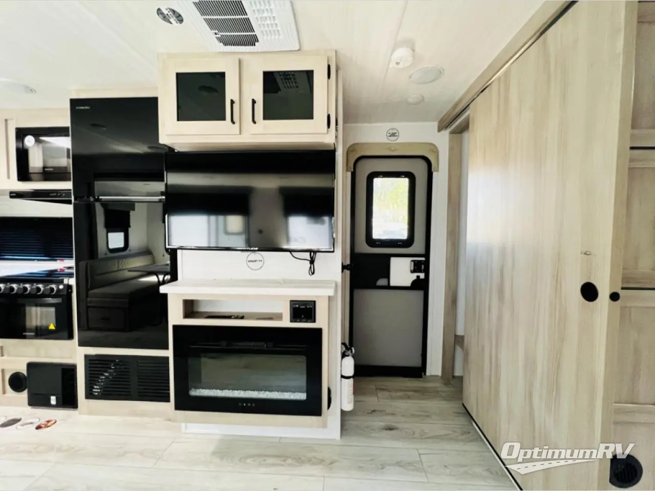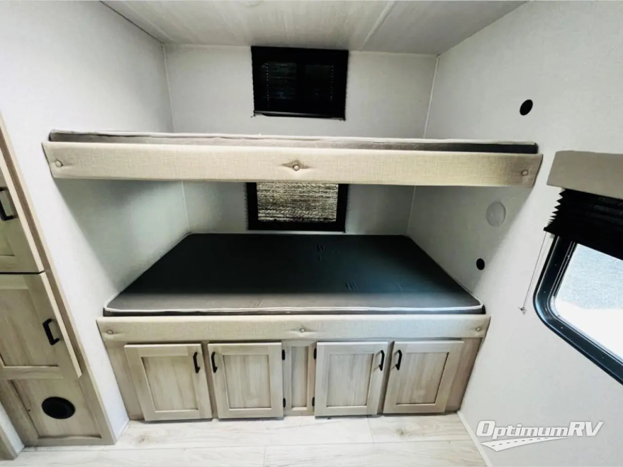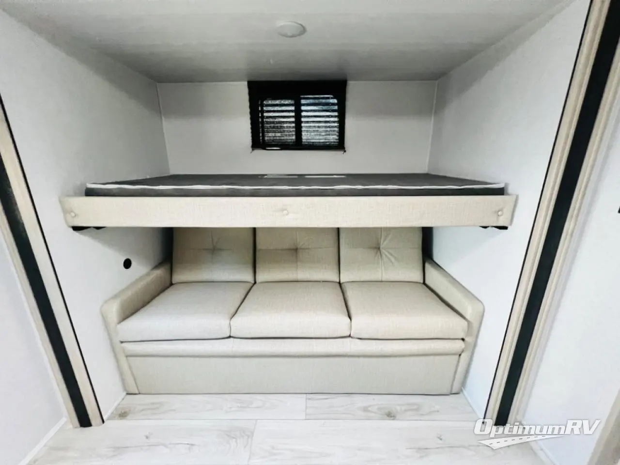Head to the RV park for a long-weekend or week-long break from your everyday routine with this trailer at your favorite campsite. After setting up the two slide outs and the 15' power awning, you can relax inside on the jack knife sofa, dine at the oversized booth dinette or whip up a meal in the L-shaped kitchen. Everyone will enjoy the fireplace no matter what you are doing. The walk-through bathroom is super convenient, and the front bedroom allows you to live like a king in privacy. The rear bunkhouse also offers privacy and includes three bunk beds and a sofa, plus storage. Your kids or guests will love having their own room. And the exterior offers an optional outdoor kitchen, an oversized pass-through storage for your larger gear like fishing poles, outdoor tables and bags of charcoal, plus there are two spray ports to easily rinse off dirty bikes, shoes and such.