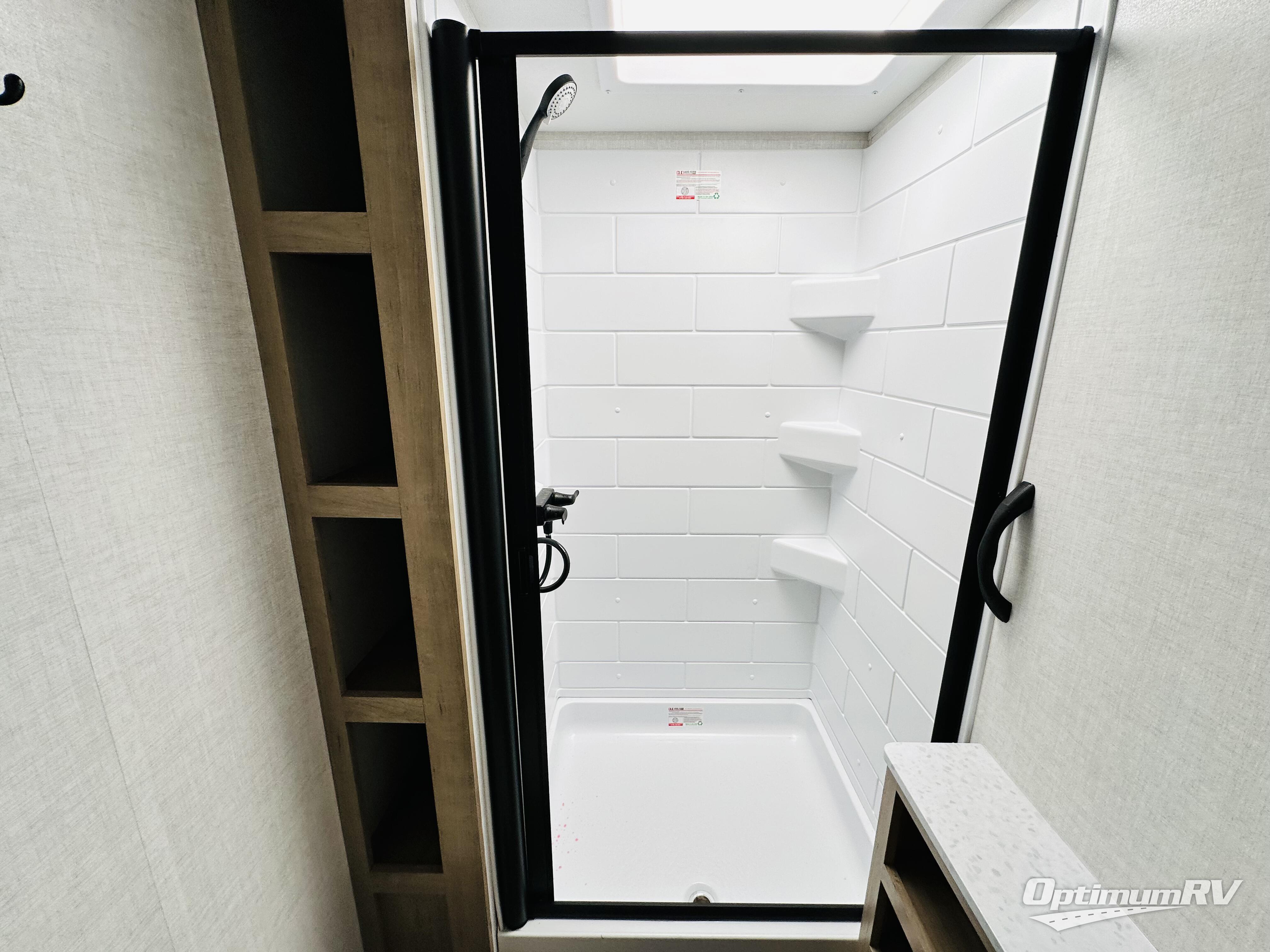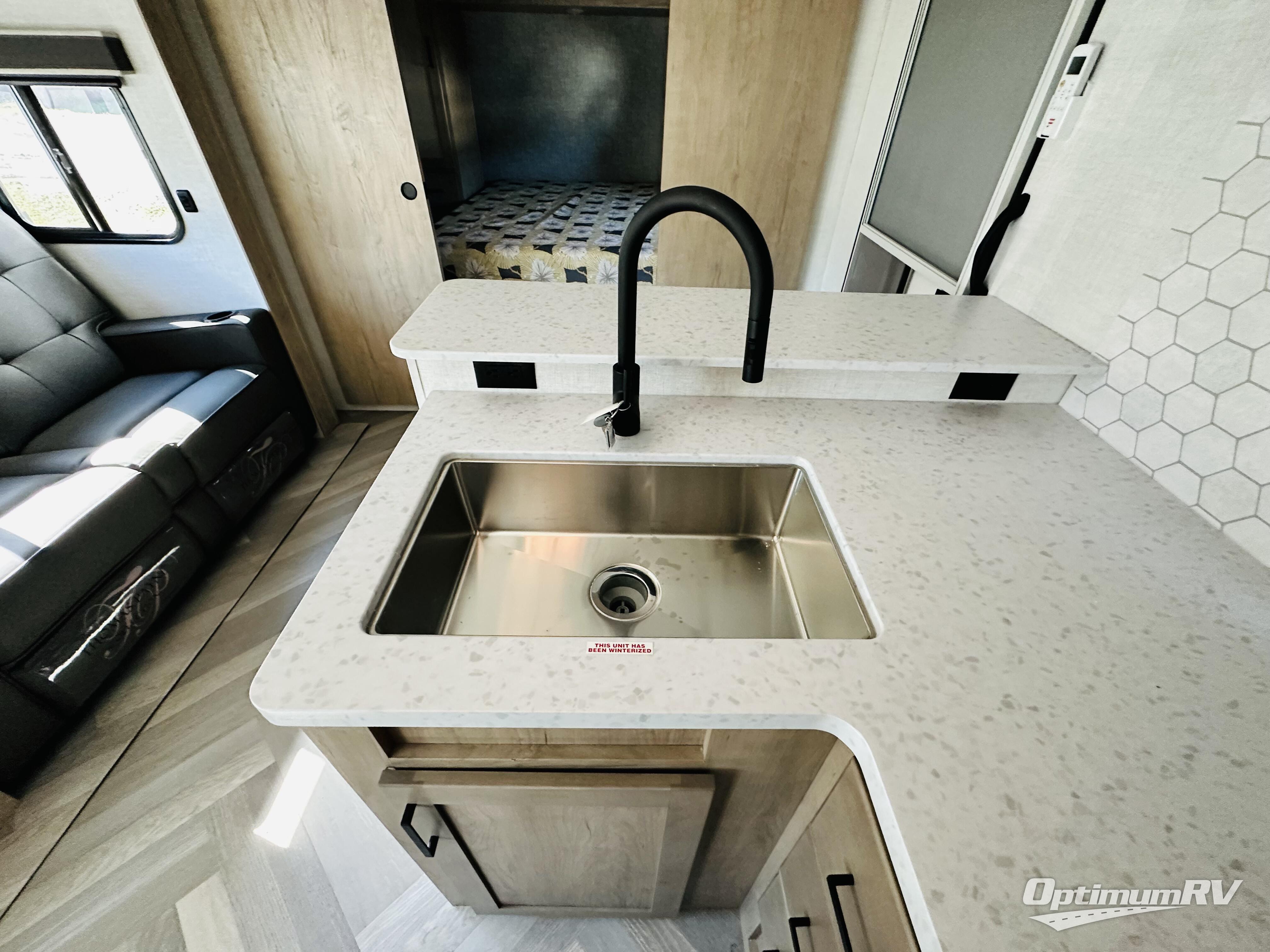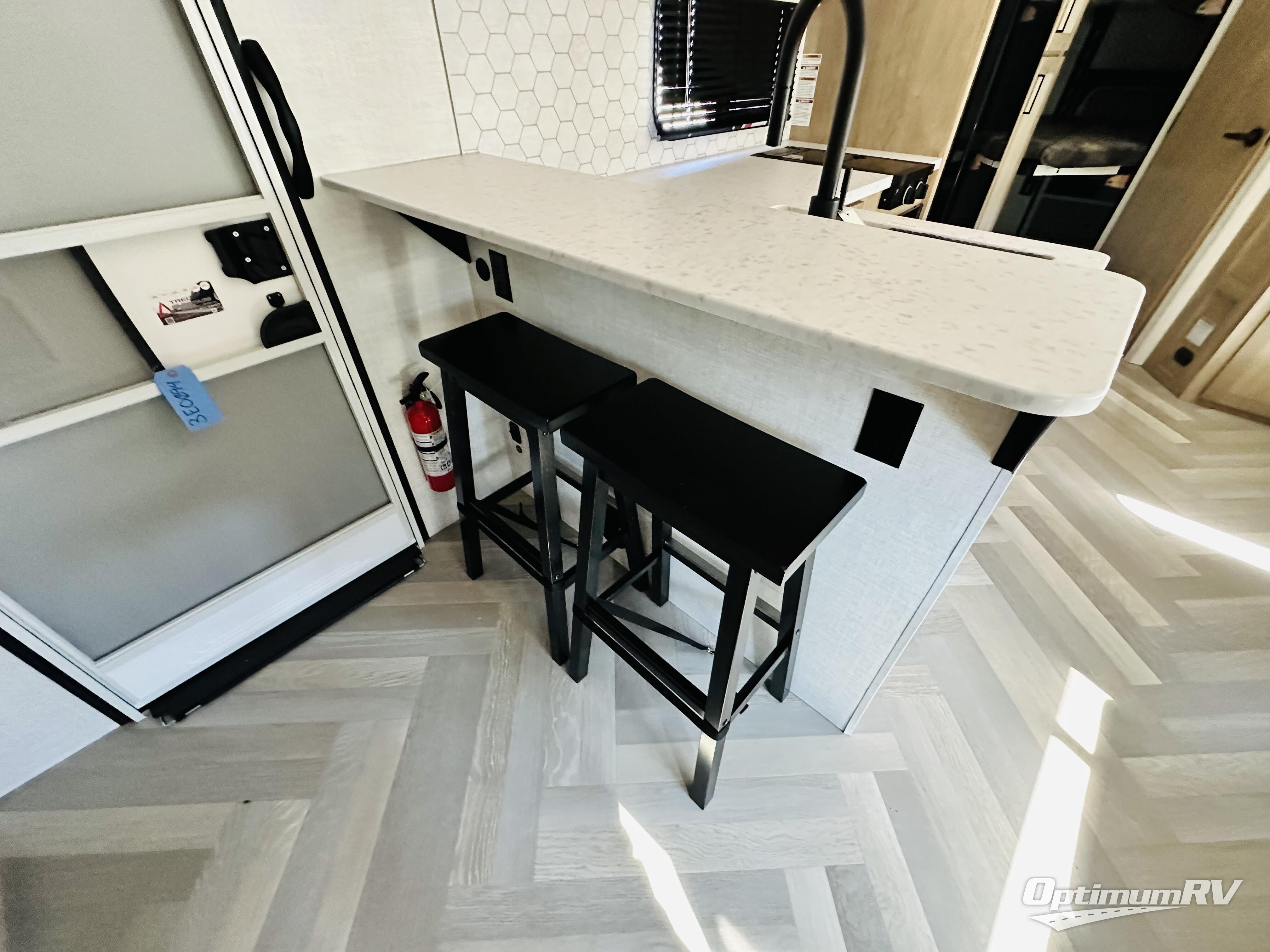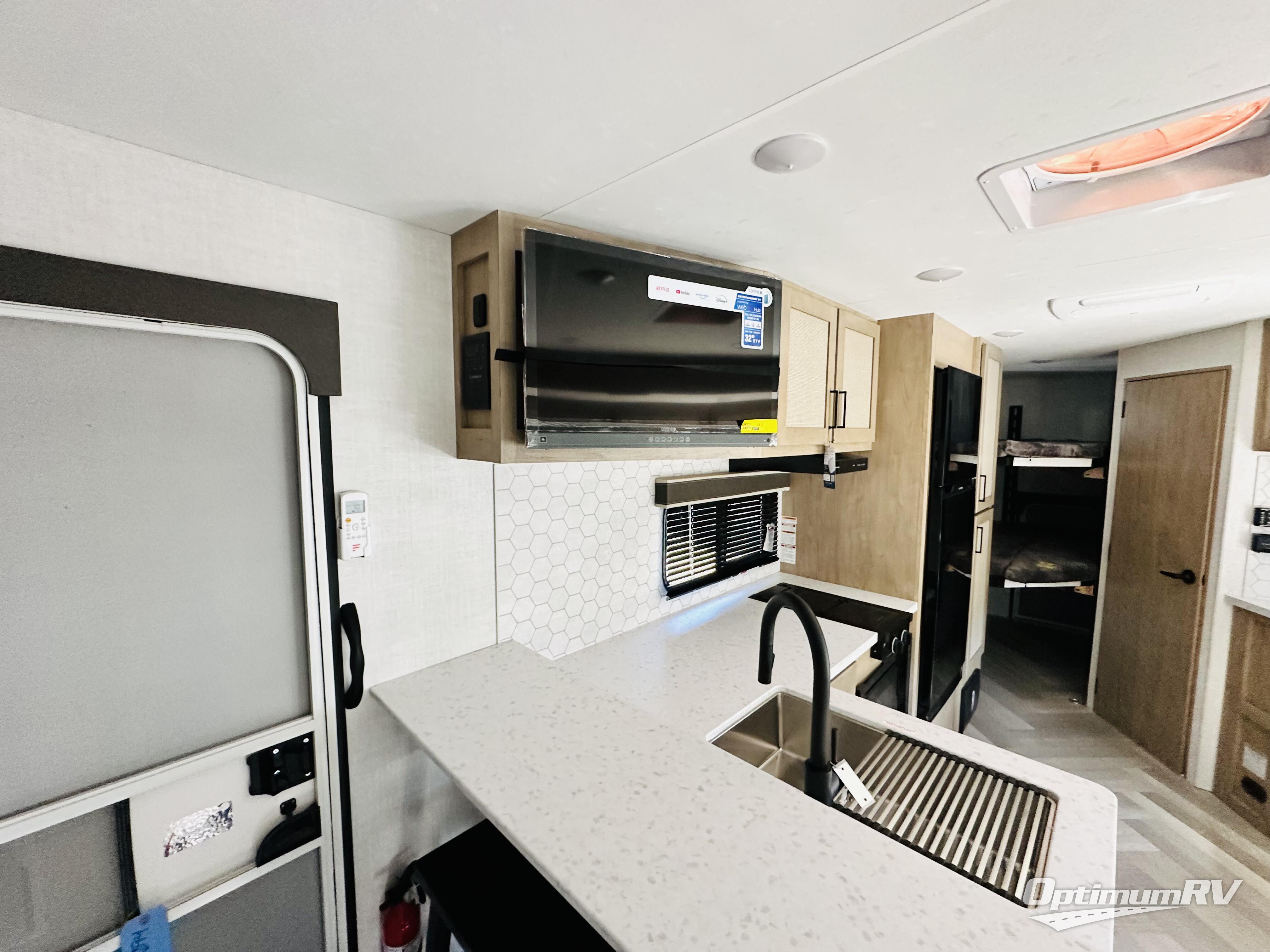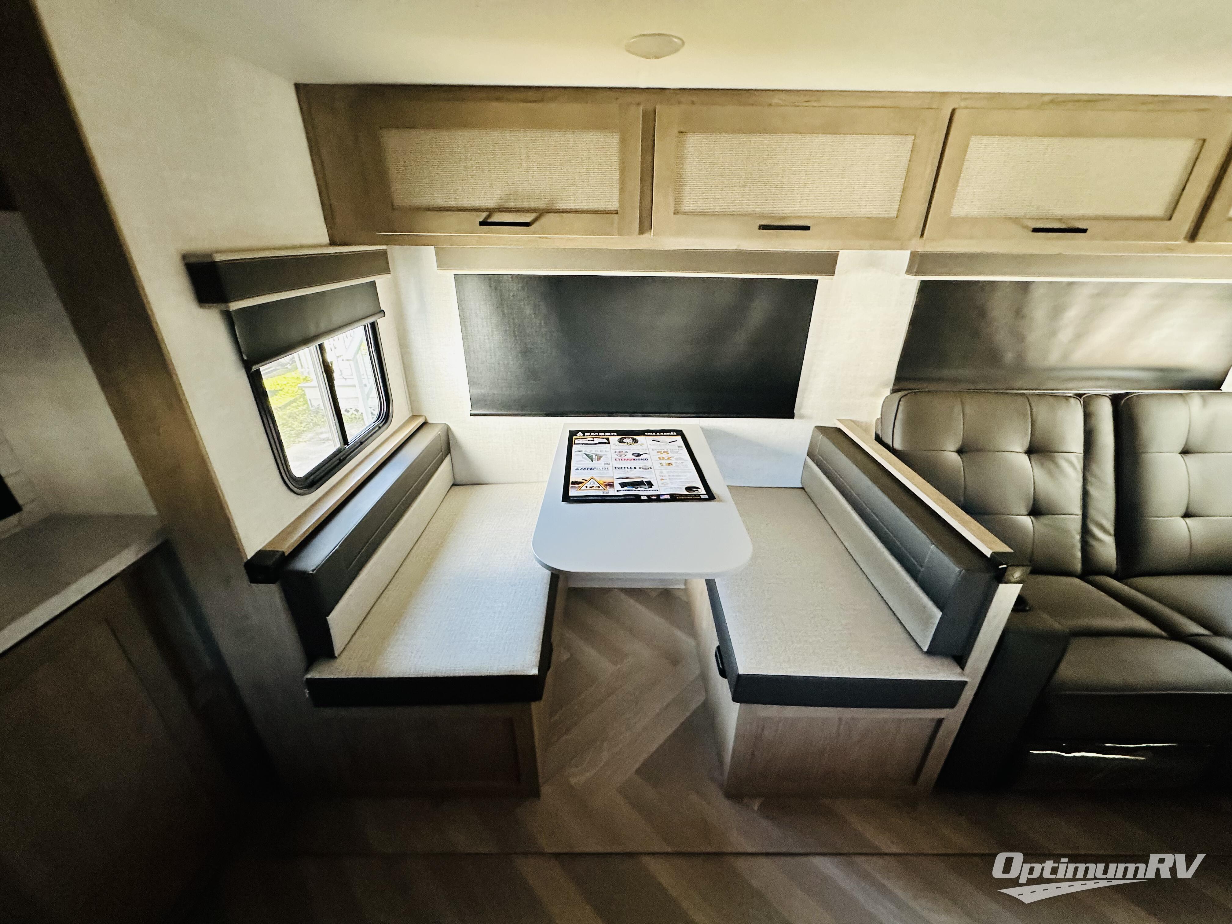 This model resembles 22ETS, but you'll enjoy added theater seating and a larger exterior length for more interior space! The patent-pending repositionable EmberTrack E-Track bunk/storage system includes 74" x 45" cargo space, and there are multiple single/double bunk configurations to fit your needs. The front walk-around true residential queen bed includes dual nightstands and dual wardrobes, and you'll appreciate sliding doors that makes a private bedroom. This E-Series kitchen includes an air fryer convection microwave, a two burner cooktop, plus a breakfast bar with bar stools so you can visit with the chef as they cook meals. A legless dinette will provide a place to dine, or you can take your plate outdoors to sit under the 18' power awning with a dimmable LED light. You'll also find a pass-through storage outside, along with a docking station and a kayak/bike storage door!