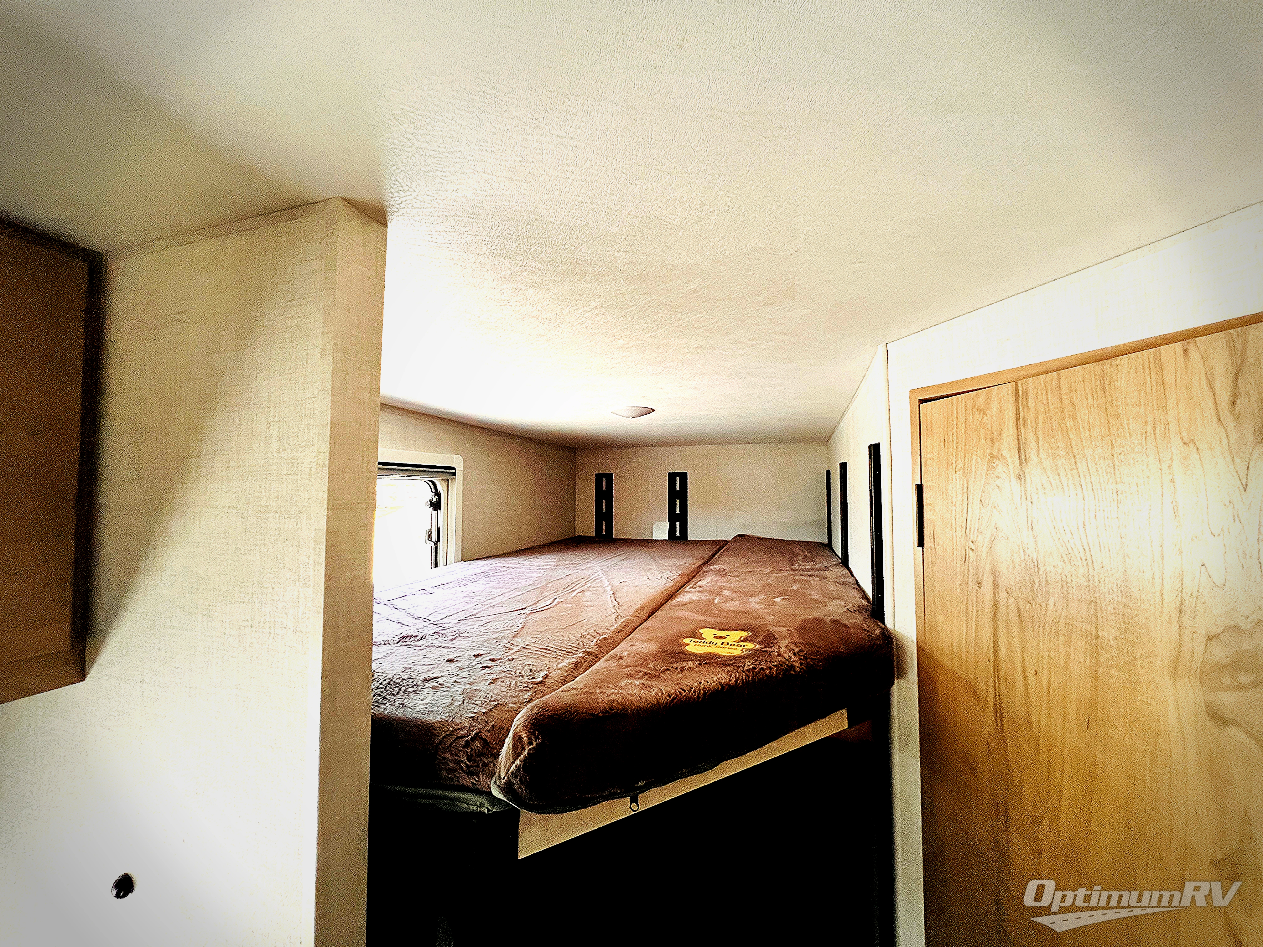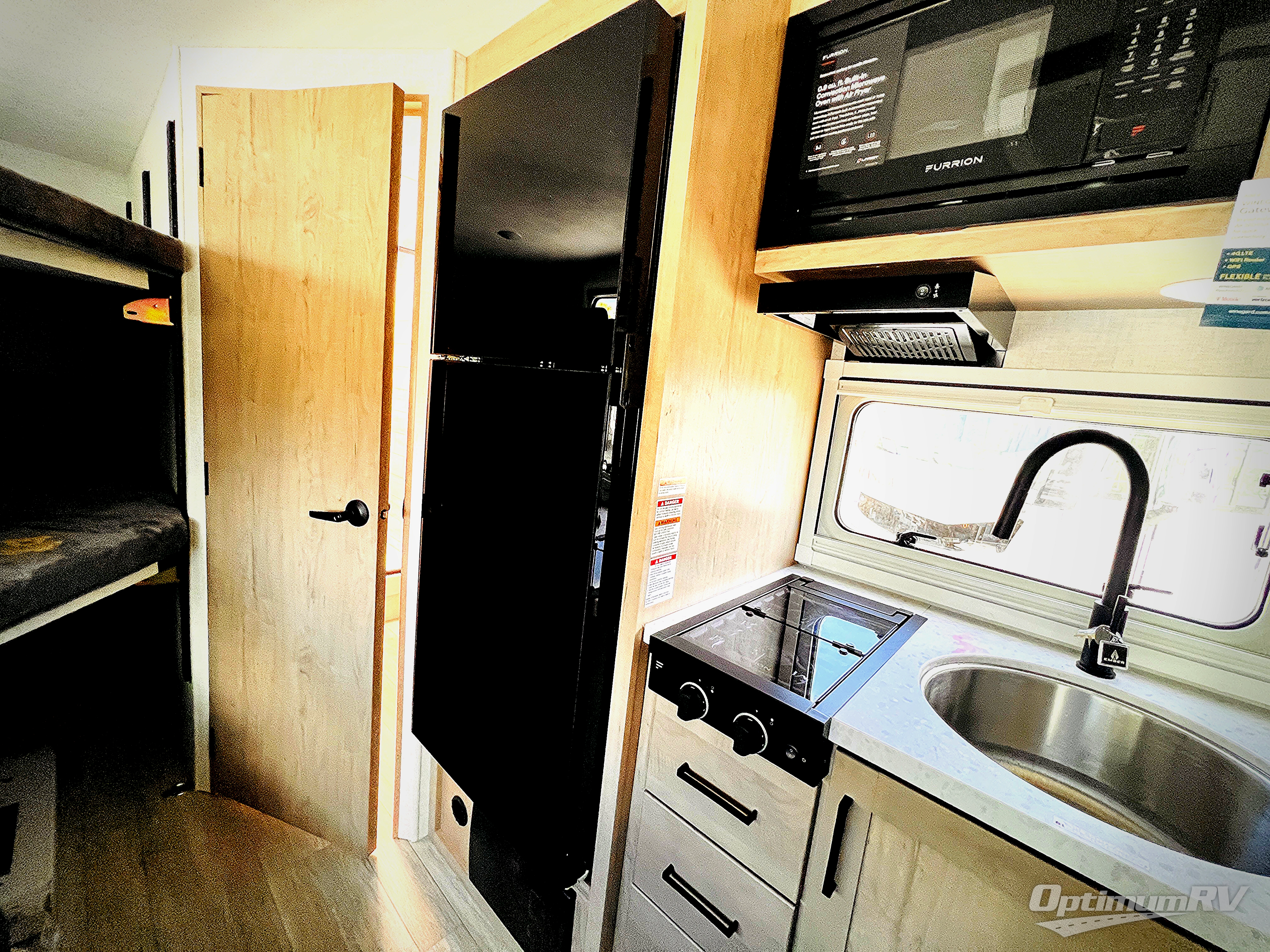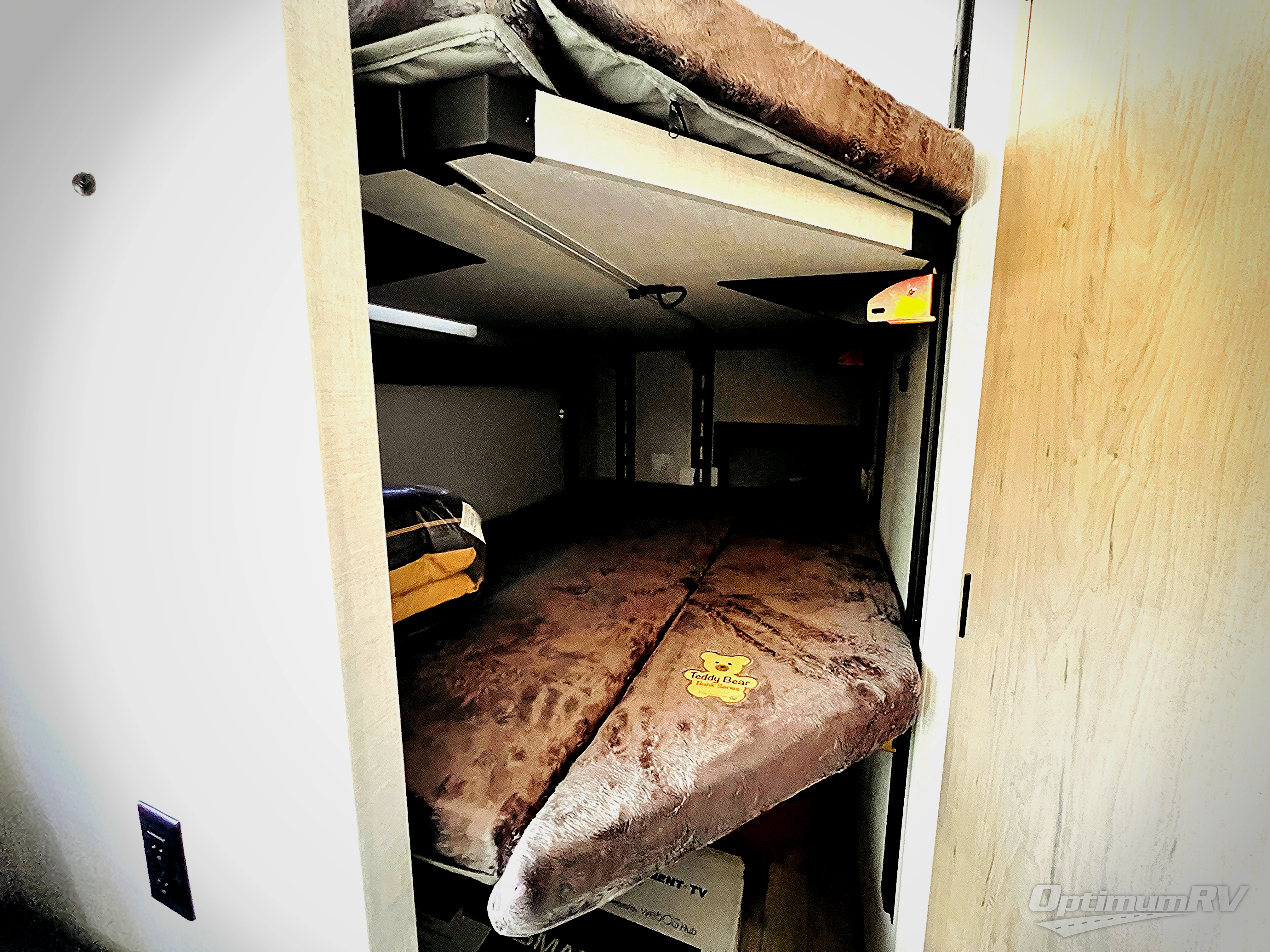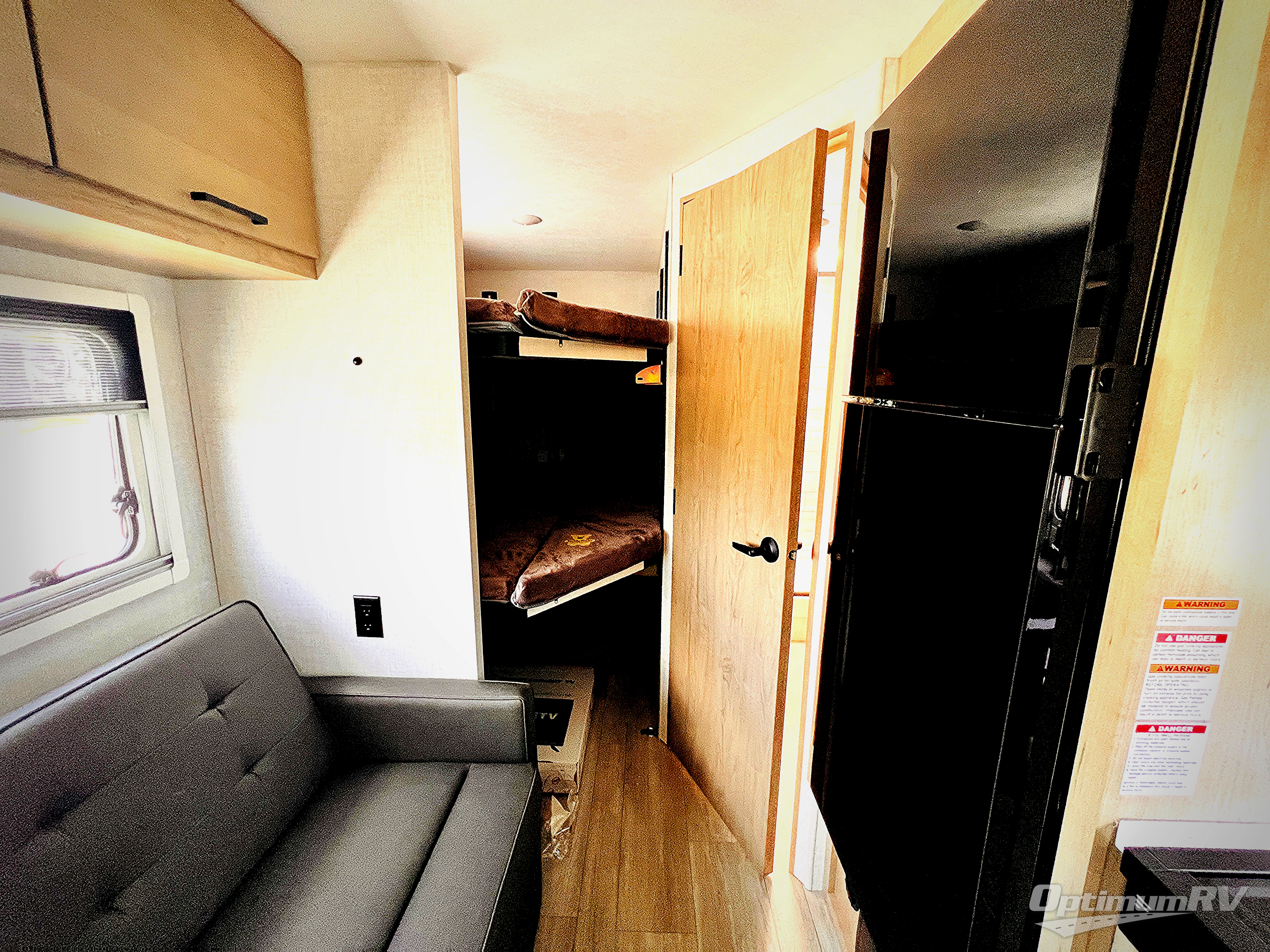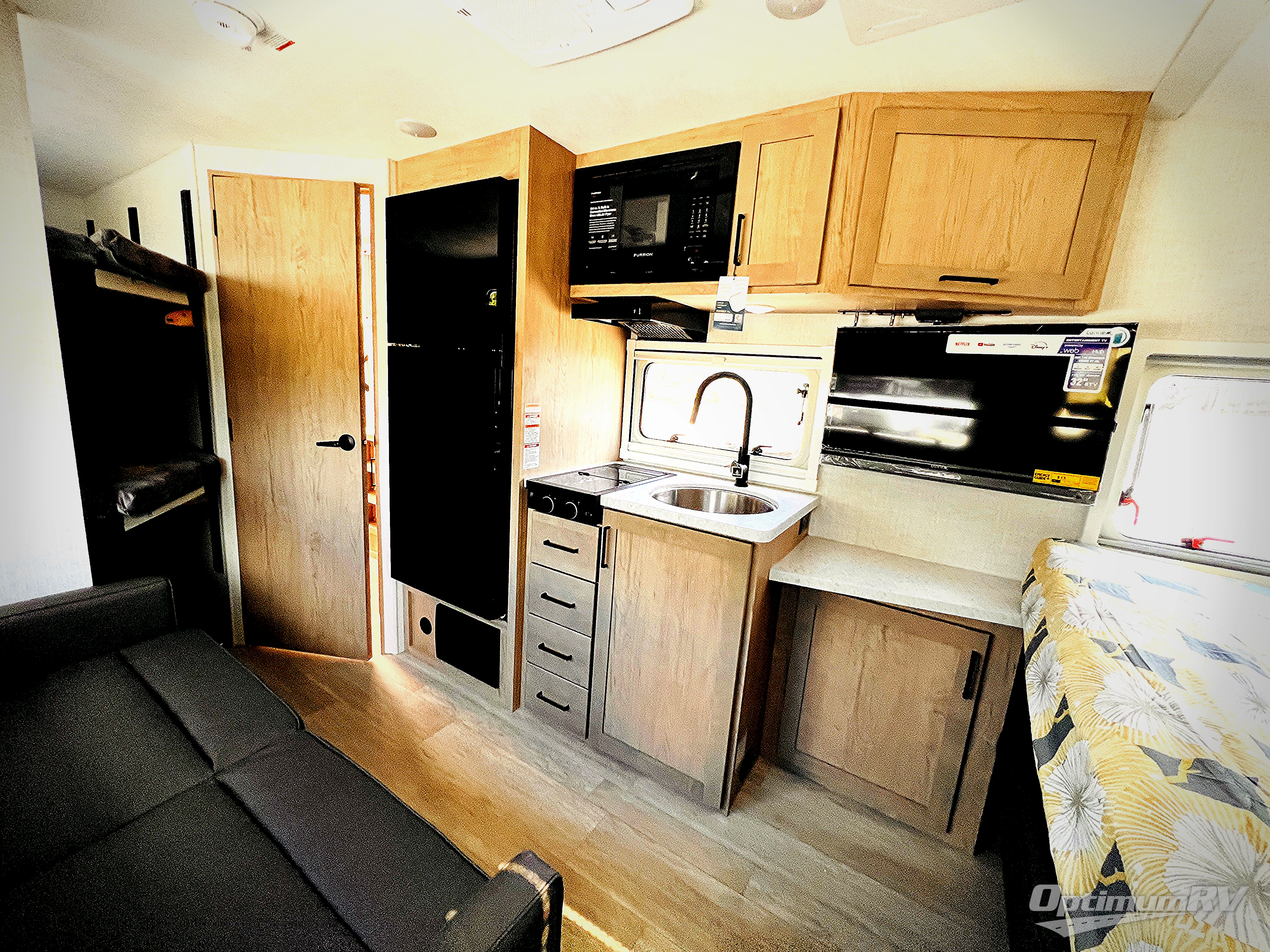 This unique travel trailer offers versatile living! Starting with the front Murphy bed that has a 60" x 80" queen bed to lay your head on at night and can convert into a sofa for seating during the day with a nightstand and a 12V HDTV/AV system to watch your favorite movies in bed. Create your best home cooked meals with the dual burner cooktop and 12V refrigerator then enjoy them at the jackknife sofa with a removable table. There is a second removable table that can be used by the Murphy bed/sofa. The repositionable Embertack E-track bunk/storage system has a 74" x 46" cargo space for your items and a storage locker door to access them from the exterior. You can enjoy twin bunks or convert them to double-size bunks to sleep two to four. The exterior also features a kayak/bike storage door, front pass-through storage area, and a 2" accessory receiver!