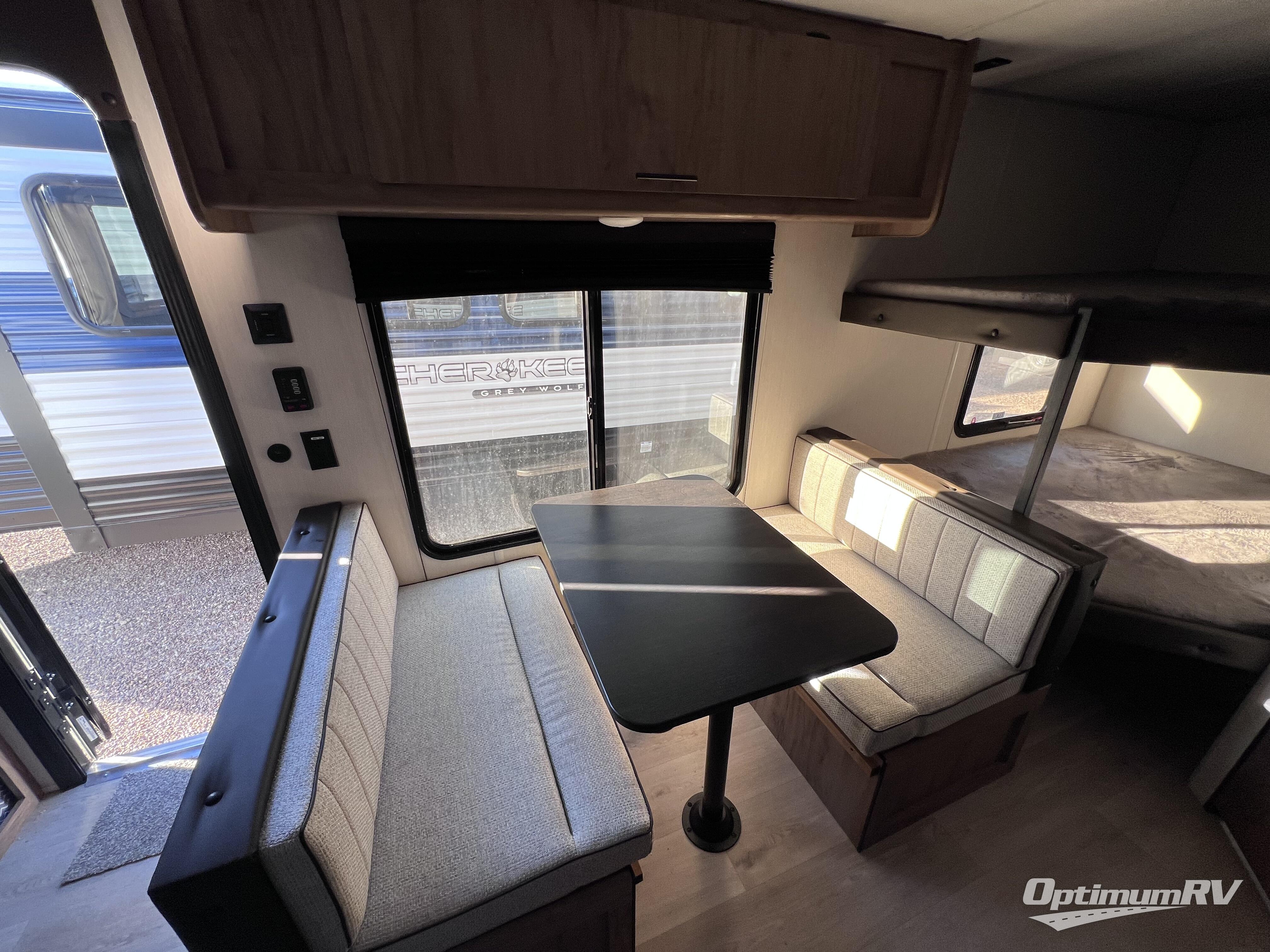 The Cherokee Wolf Den travel trailers by Forest River are lightweight for easy towing, while still including the camping essentials you're looking for! There are a variety of floorplans to choose from, including bunkhouse models, couple's units, and even all-electric floorplans! You'll find a tub/shower in each travel trailer, a comfortable queen bed, seating spaces to relax on, and kitchen amenities that will make your space feel more like home. There are storage spaces inside for your belongings plus outdoor storage for fishing gear, camp chairs, tools, and more! Start a new adventure today in a Cherokee Wolf Den travel trailer today!