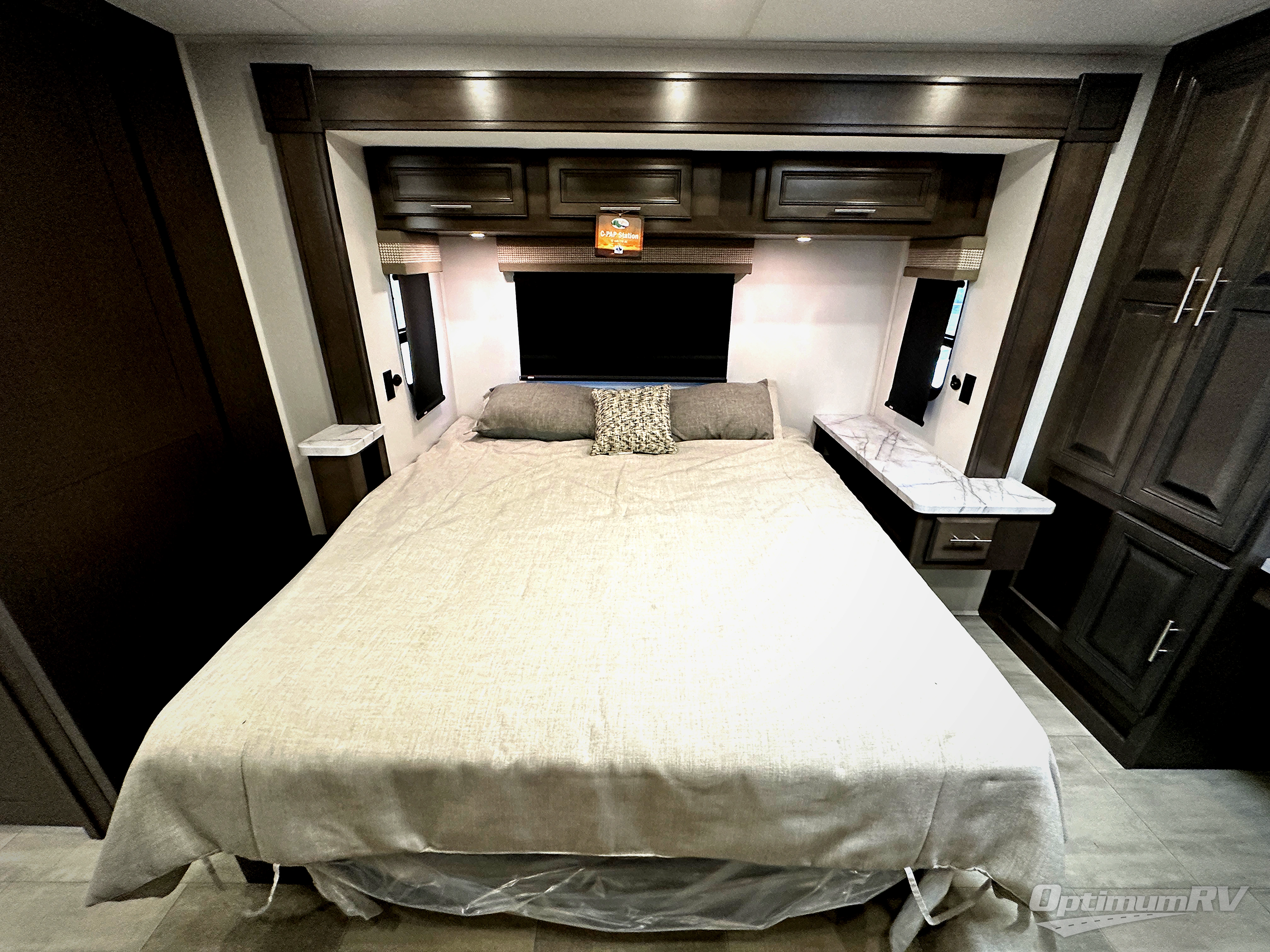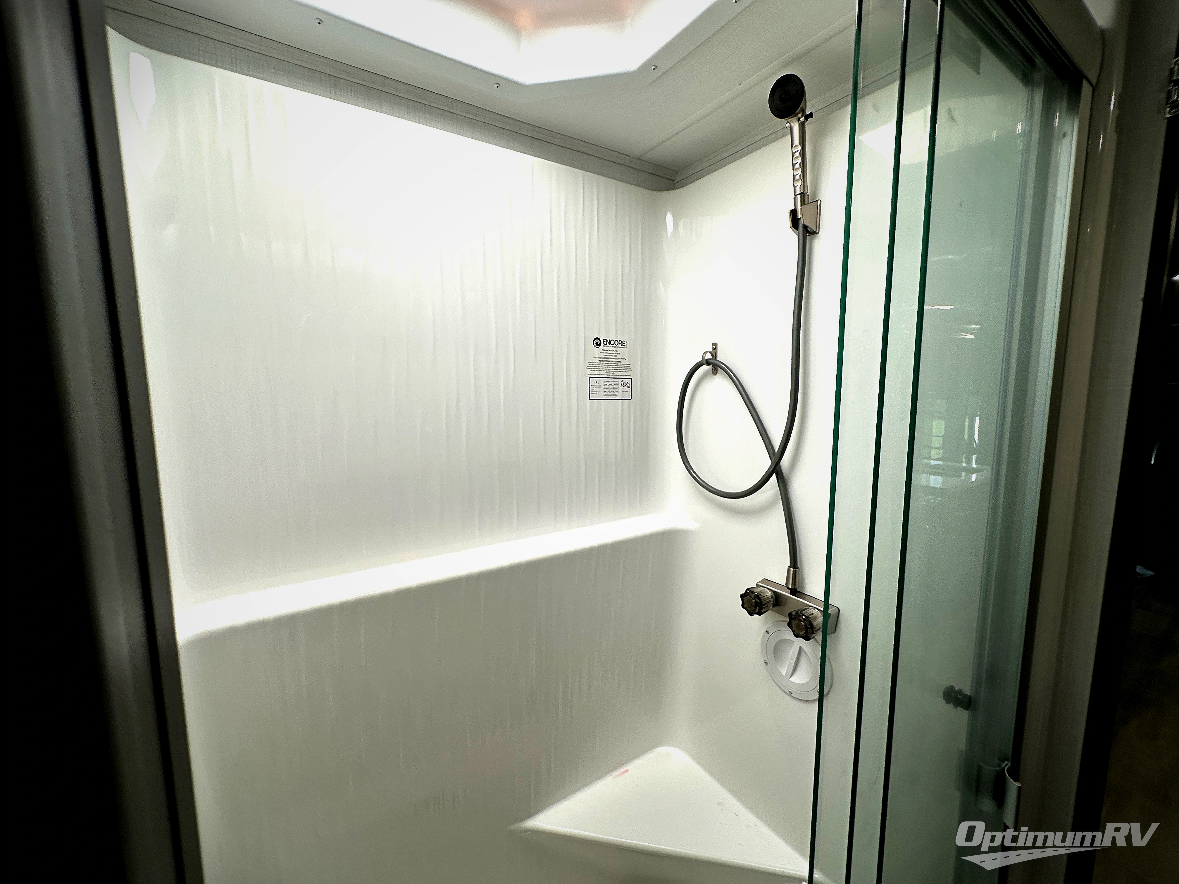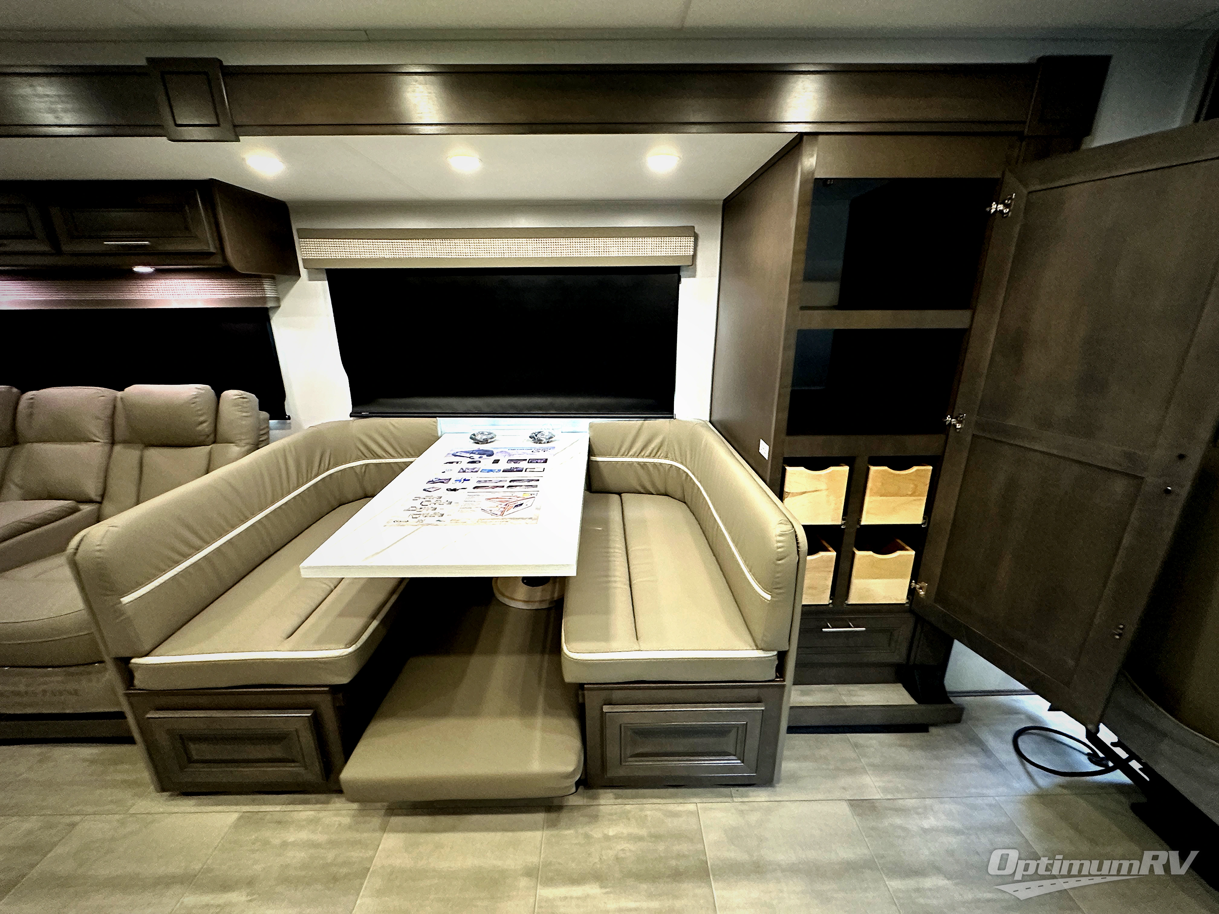 You won't believe all that the rear private bedroom has to offer in this motorhome! It features a 72" x 80" king bed slide with overhead cabinets, a dresser with a 32" TV and overhead cabinets, wardrobes on either side of the dresser, and a desk with wardrobes on either. And one of the wardrobes features an optional stacked washer and dryer for convenience! The split-style bathroom makes it easy for one person to freshen up in the shower with a seat while another uses the private toilet and sink. After a long day of traveling, you can relax on either the Thomas Payne theater seating with heat and massage across from the 5,000 BTU fireplace with a 40" LED TV above it or play a game and eat a meal at the Dream Dinette. There is also a power front overhead bunk for more sleeping space!