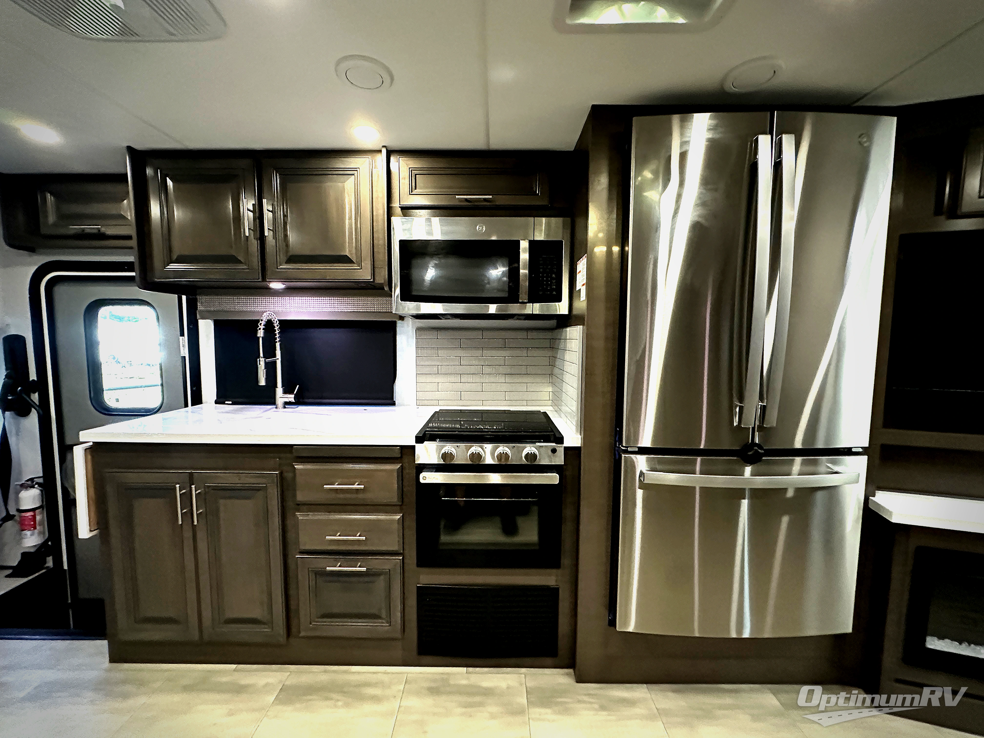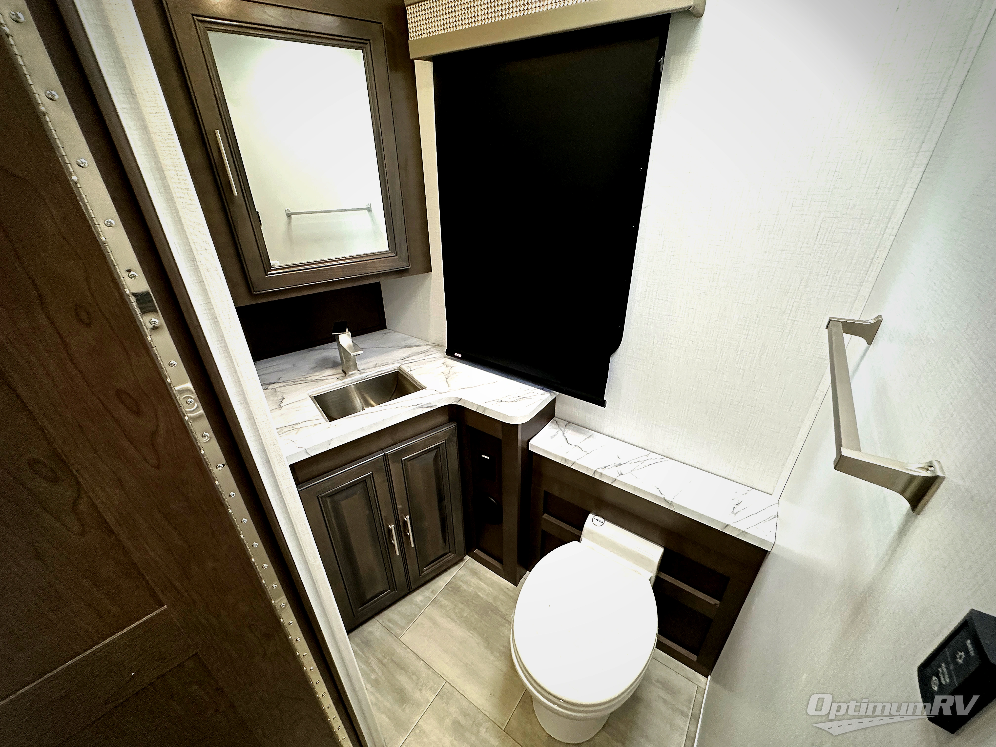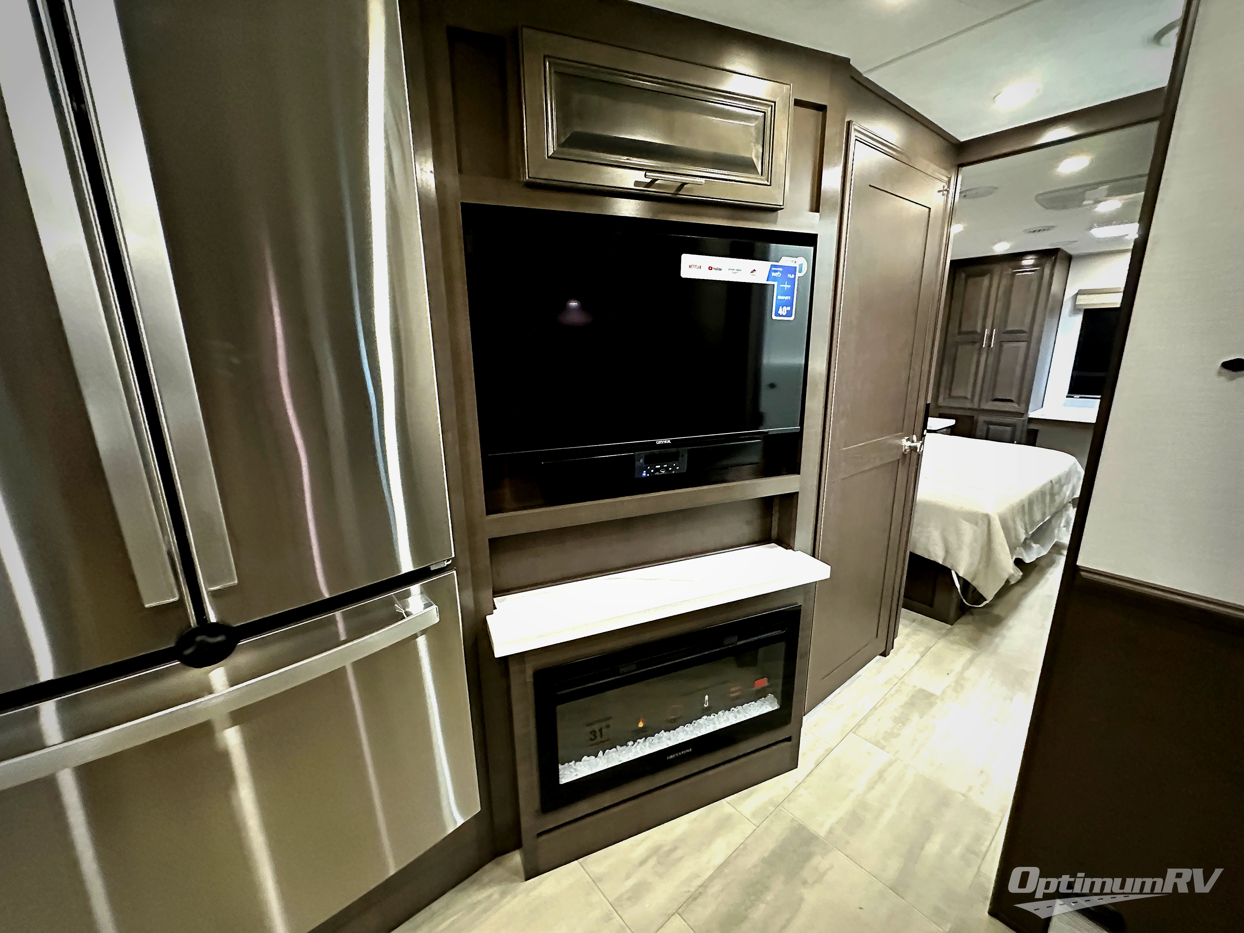 You won't believe all that the rear private bedroom has to offer in this motorhome! It features a 72" x 80" king bed slide with overhead cabinets, a dresser with a 32" TV and overhead cabinets, wardrobes on either side of the dresser, and a desk with wardrobes on either. And one of the wardrobes features an optional stacked washer and dryer for convenience! The split-style bathroom makes it easy for one person to freshen up in the shower with a seat while another uses the private toilet and sink. After a long day of traveling, you can relax on either the Thomas Payne theater seating with heat and massage across from the 5,000 BTU fireplace with a 40" LED TV above it or play a game and eat a meal at the Dream Dinette. There is also a power front overhead bunk for more sleeping space!