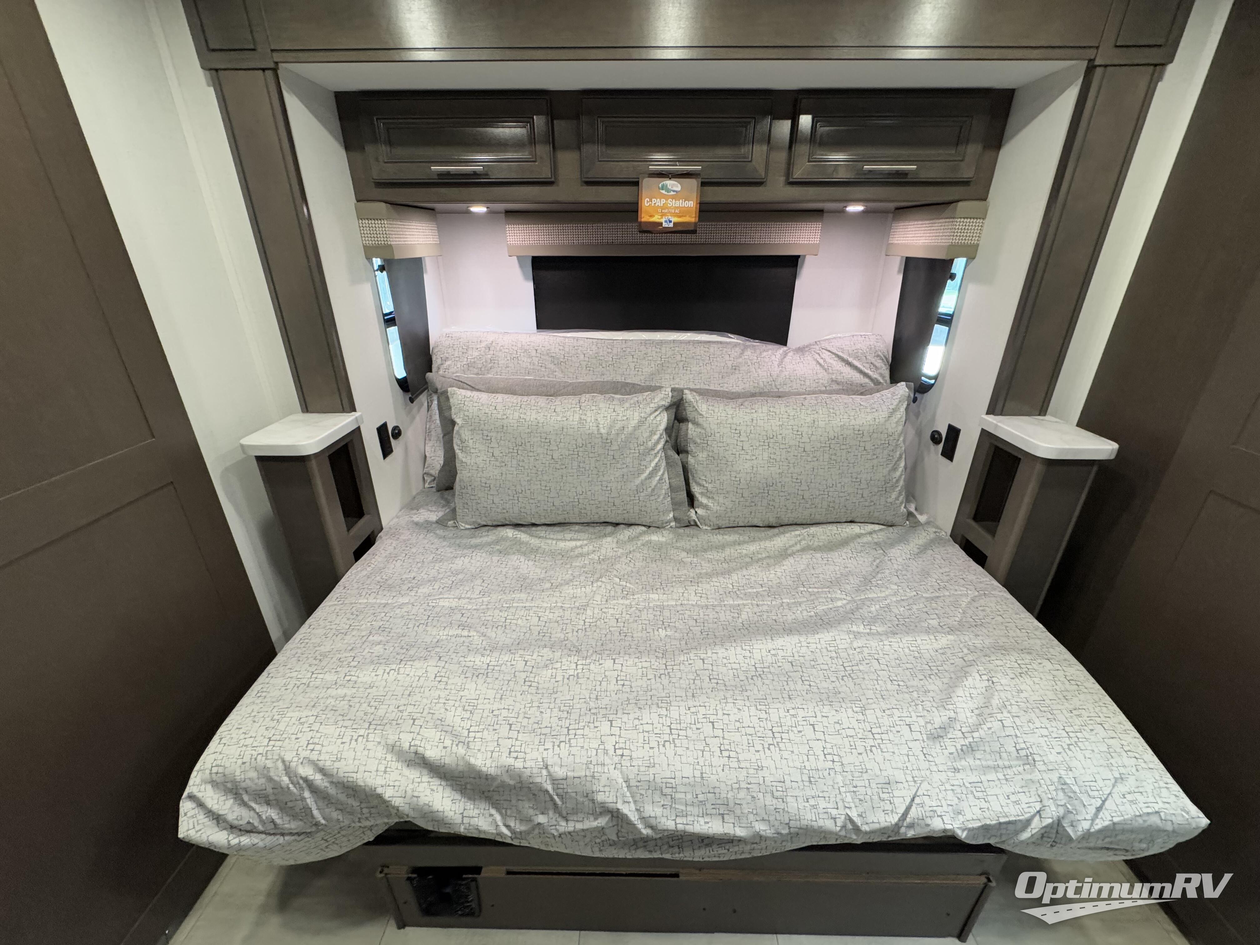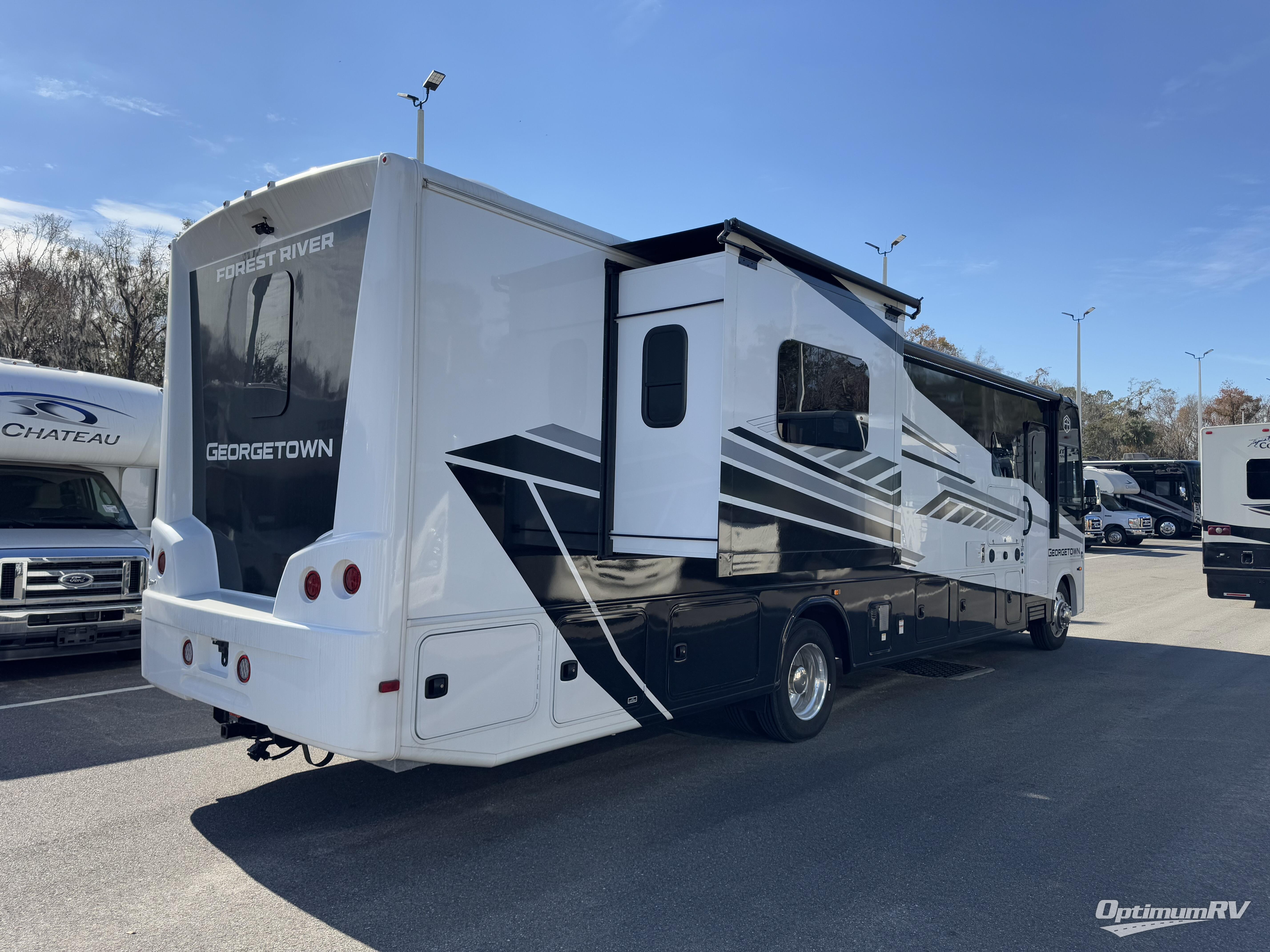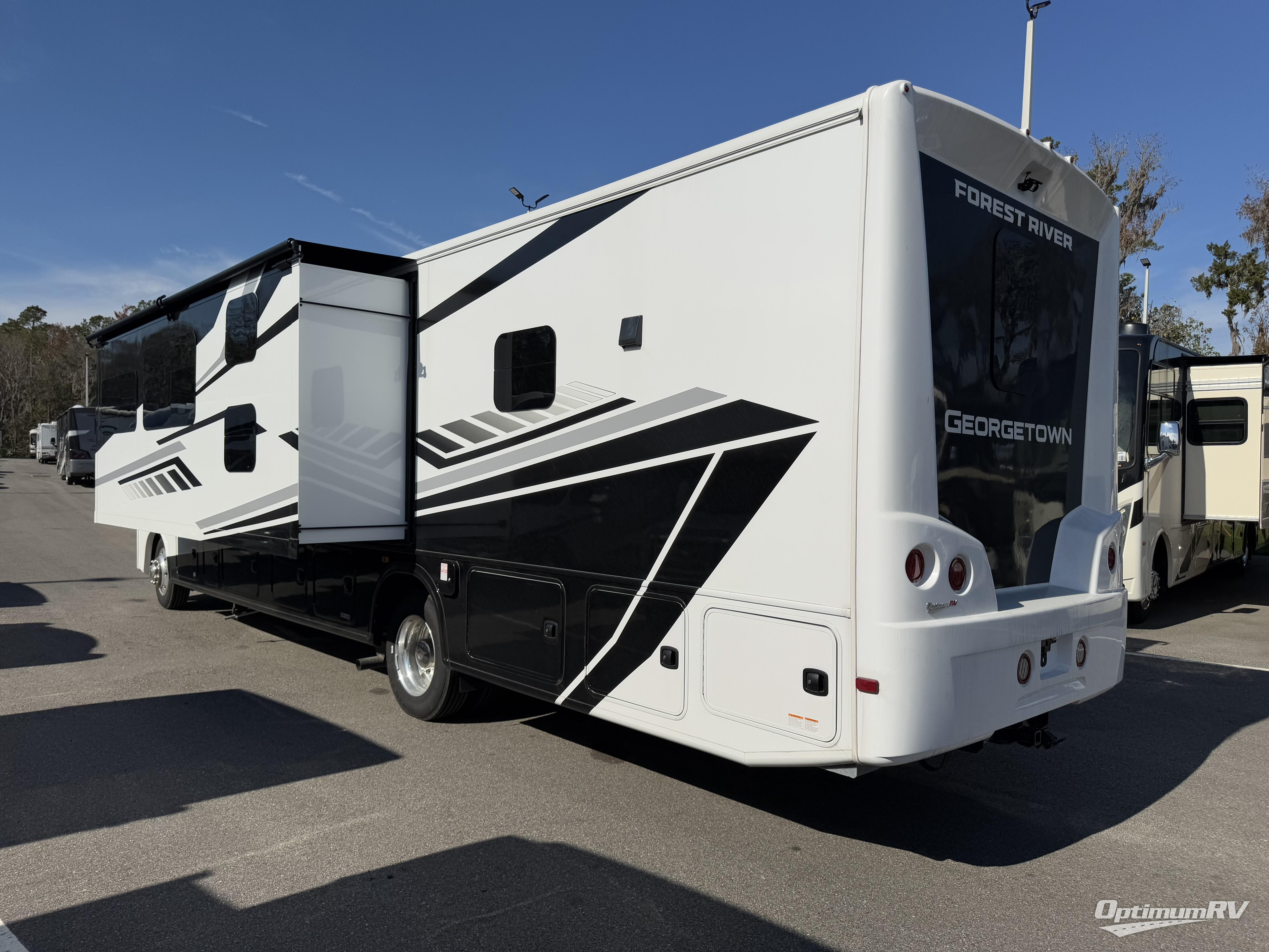 A spacious design and true luxury come together to create these Forest River Georgetown 5 Series Class A gas motorhomes! Their solid surface kitchen countertops, day and night shades throughout, and designer bedspread will have you feeling right at home. The color side and rear cameras help to prevent any dings or bumps while you travel, and the automatic hydraulic leveling jacks will keep your unit leveled where ever you set up. Durable construction consists of a crowned roof, 2" aluminum framed vacuum bonded gel coated sidewalls, plus high density block foam insulation that will allow you to travel in all seasons. You will appreciate the 50 Amp service, two house batteries, and 6,000 watt Yamaha generator to keep you powered up. An outside shower is also included on all models, along with rotocast storage compartments with drains, a power awning, and so much more!