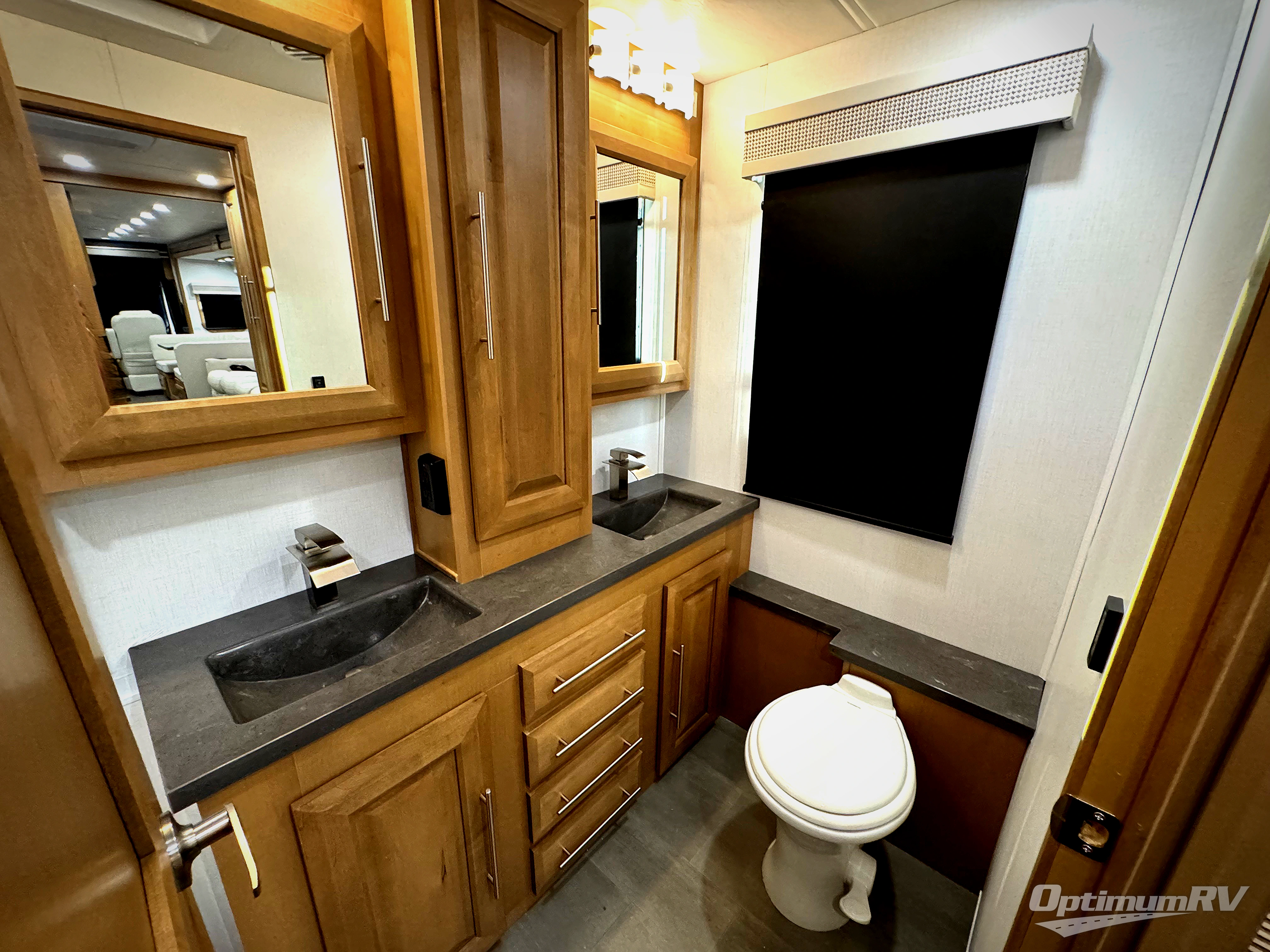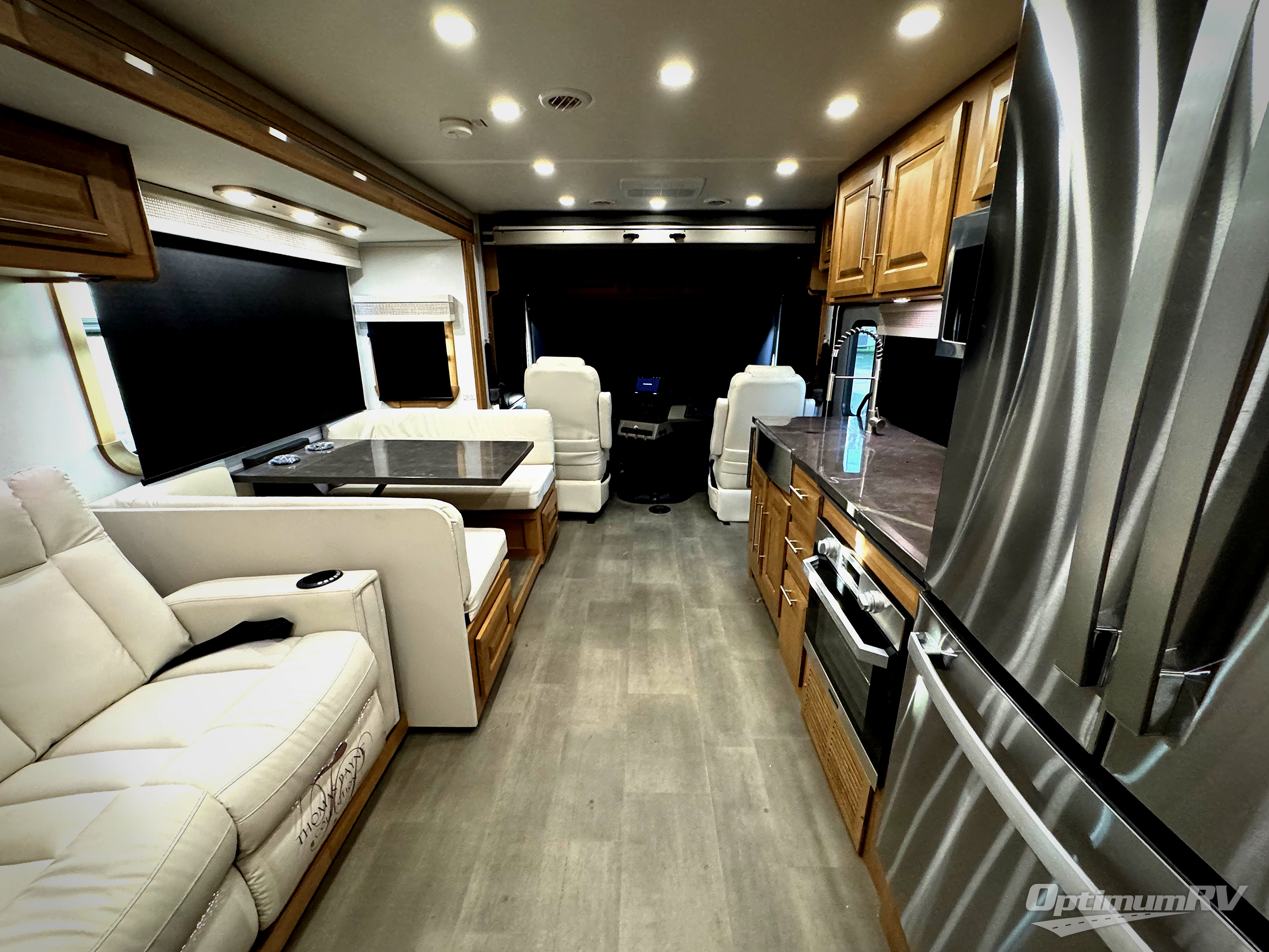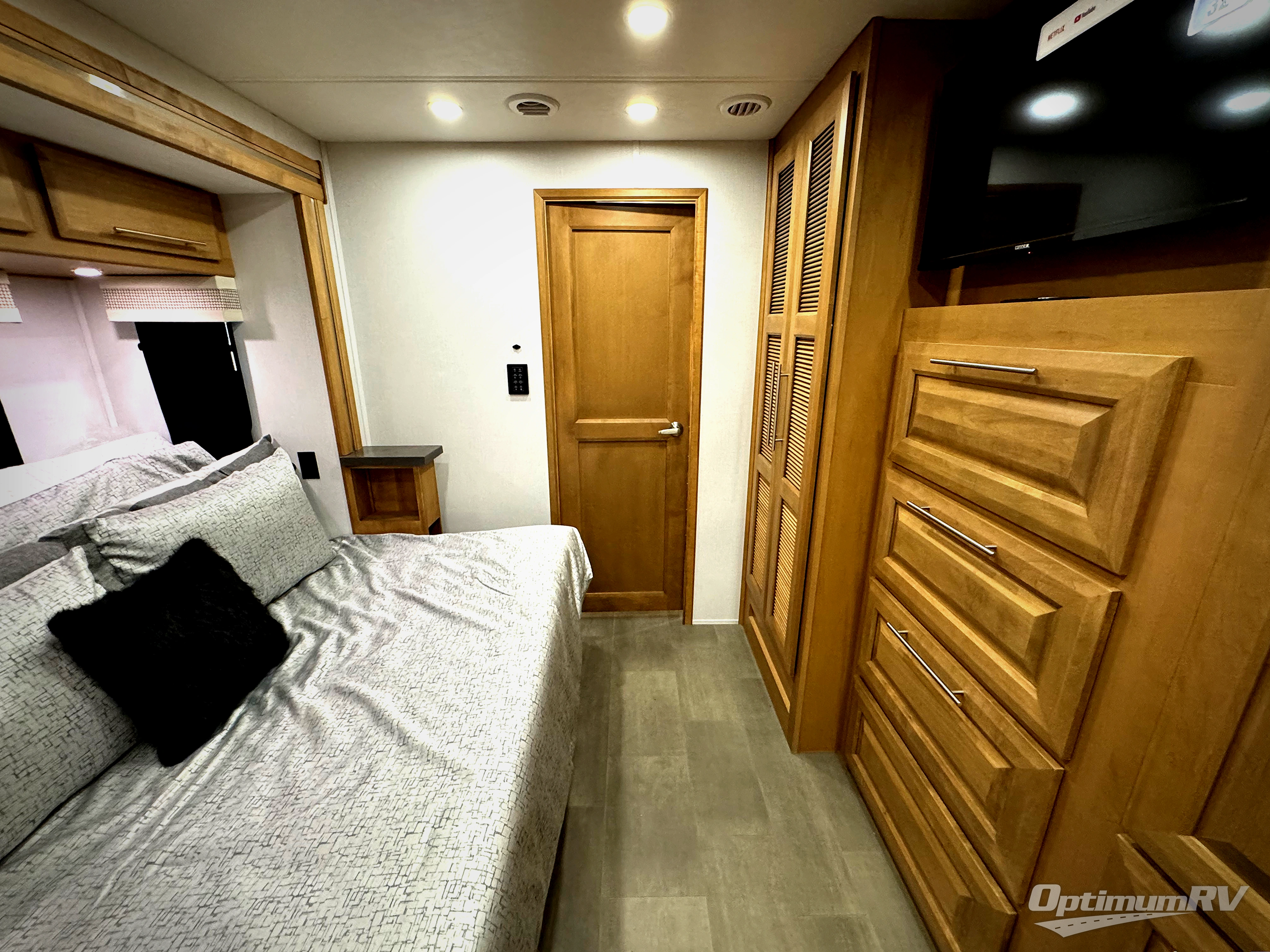 Comfort and convenience is found all throughout this motorhome! Starting with the full rear master bath that has a shower with a seat and a dual sink vanity, plus it leads into the private bedroom. Inside the bedroom is a 72" x 80" Power Tilt king bed slide with overhead cabinets across from a dresser with overhead cabinets and a 32" LED TV, a wardrobe, and another wardrobe that is prepped to add an optional stackable washer and dryer. The half bathroom is conveniently near the fully equipped kitchen so you can get back to creating your best home cooked meals fast. Relax in true comfort each night by either playing games at the booth dinette or on the theater seating that comes with power recline, heat, and massage!