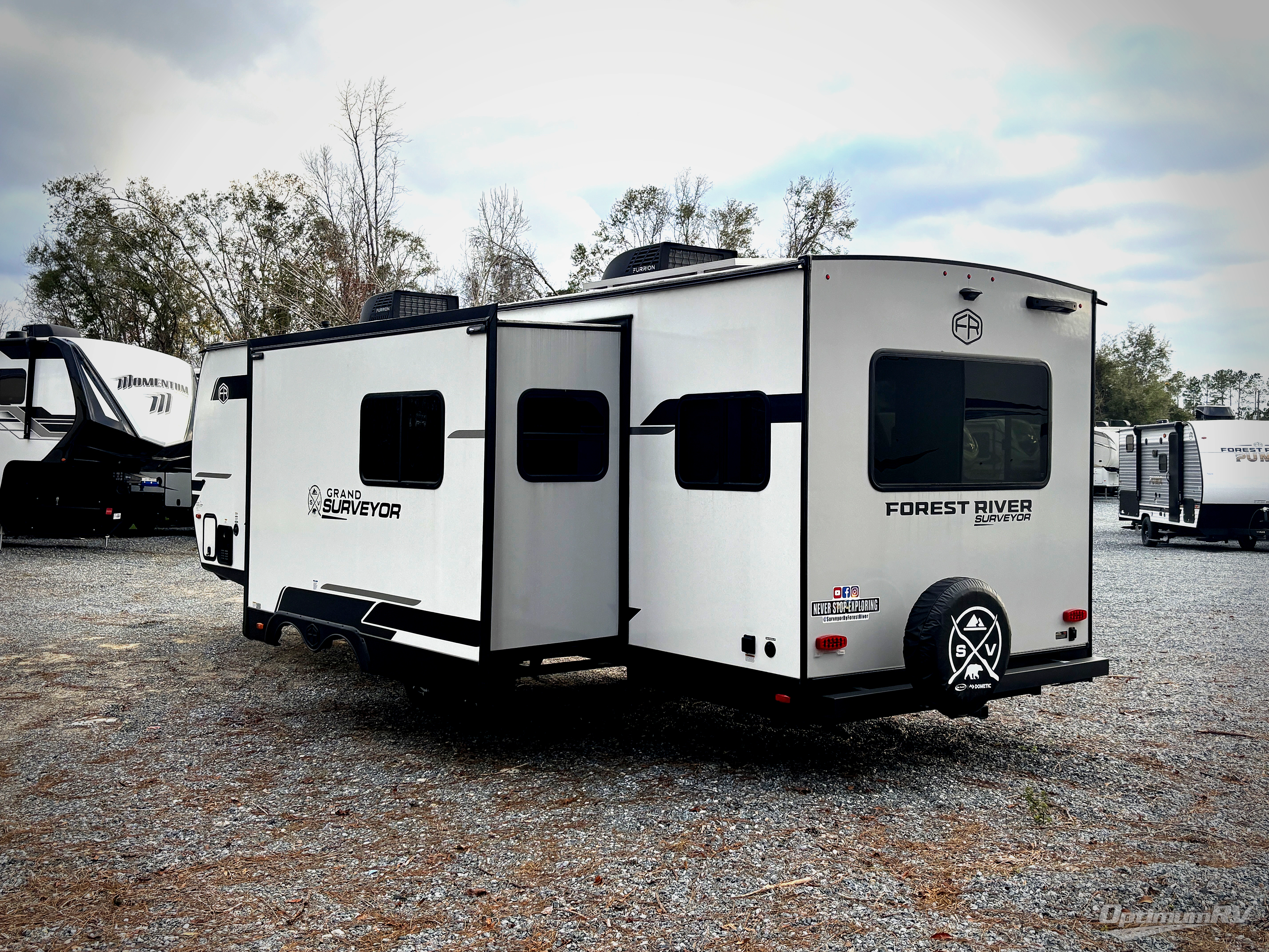 With any Grand Surveyor travel trailer by Forest River you will enjoy turn-key ready-to-go features and quality construction! Each model includes Azdel composite walls and a gel coated fiberglass front cap with an automotive style tinted windshield for a sleek look. There are friction hinge black glass entry door(s), an adjustable platform step with a night light, plus Goodyear tires and a power tongue jack for easy towing. The interior will have you feeling right at home with roller shades, residential faucets, sinks, and bathroom vanity, plus Surf(x) seamless countertops throughout. You can also plan for adventure with a 2" rear accessory and exterior spray port, and there are slam latch exterior baggage doors throughout to keep all your gear secure. Other stand-out features include a central vacuum system, a 200 watt solar panel with a 30 amp controller, a tankless water heater, carpet-free interiors, and the list goes on!