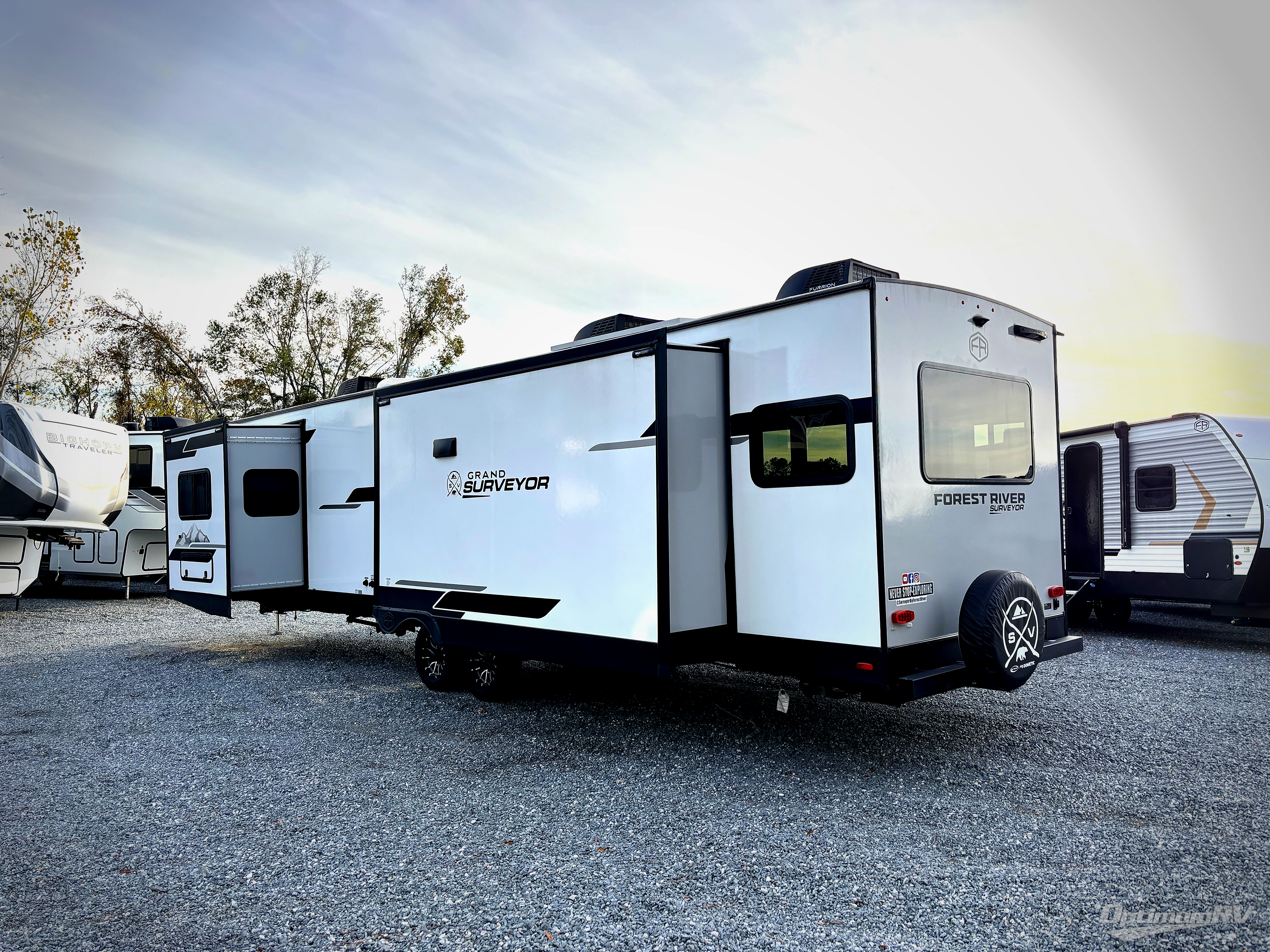 With any Grand Surveyor travel trailer by Forest River you will enjoy turn-key ready-to-go features and quality construction! Each model includes Azdel composite walls and a gel coated fiberglass front cap with an automotive style tinted windshield for a sleek look. There are friction hinge black glass entry door(s), an adjustable platform step with a night light, plus Goodyear tires and a power tongue jack for easy towing. The interior will have you feeling right at home with roller shades, residential faucets, sinks, and bathroom vanity, plus Surf(x) seamless countertops throughout. You can also plan for adventure with a 2" rear accessory and exterior spray port, and there are slam latch exterior baggage doors throughout to keep all your gear secure. Other stand-out features include a central vacuum system, a 200 watt solar panel with a 30 amp controller, a tankless water heater, carpet-free interiors, and the list goes on!
