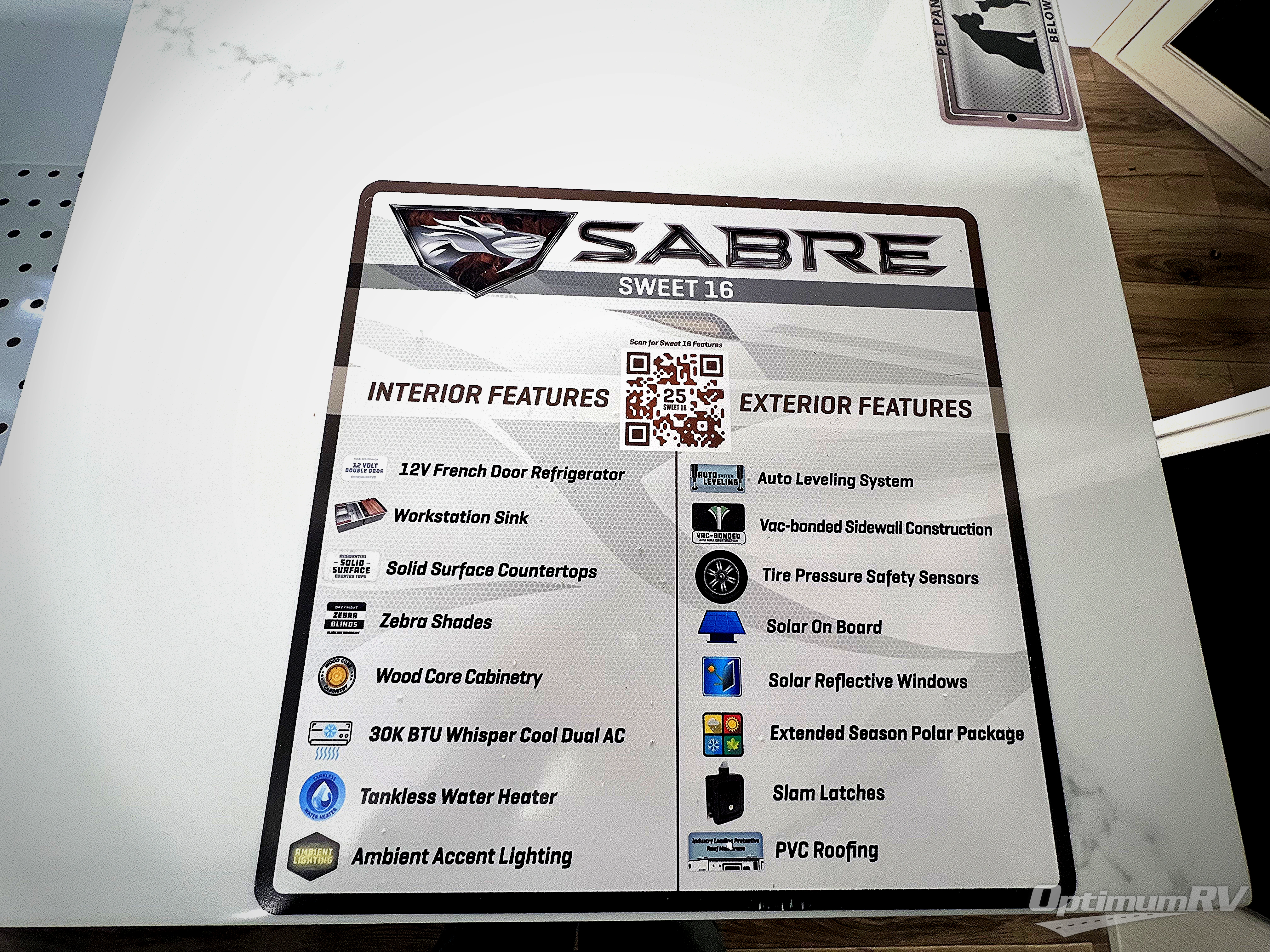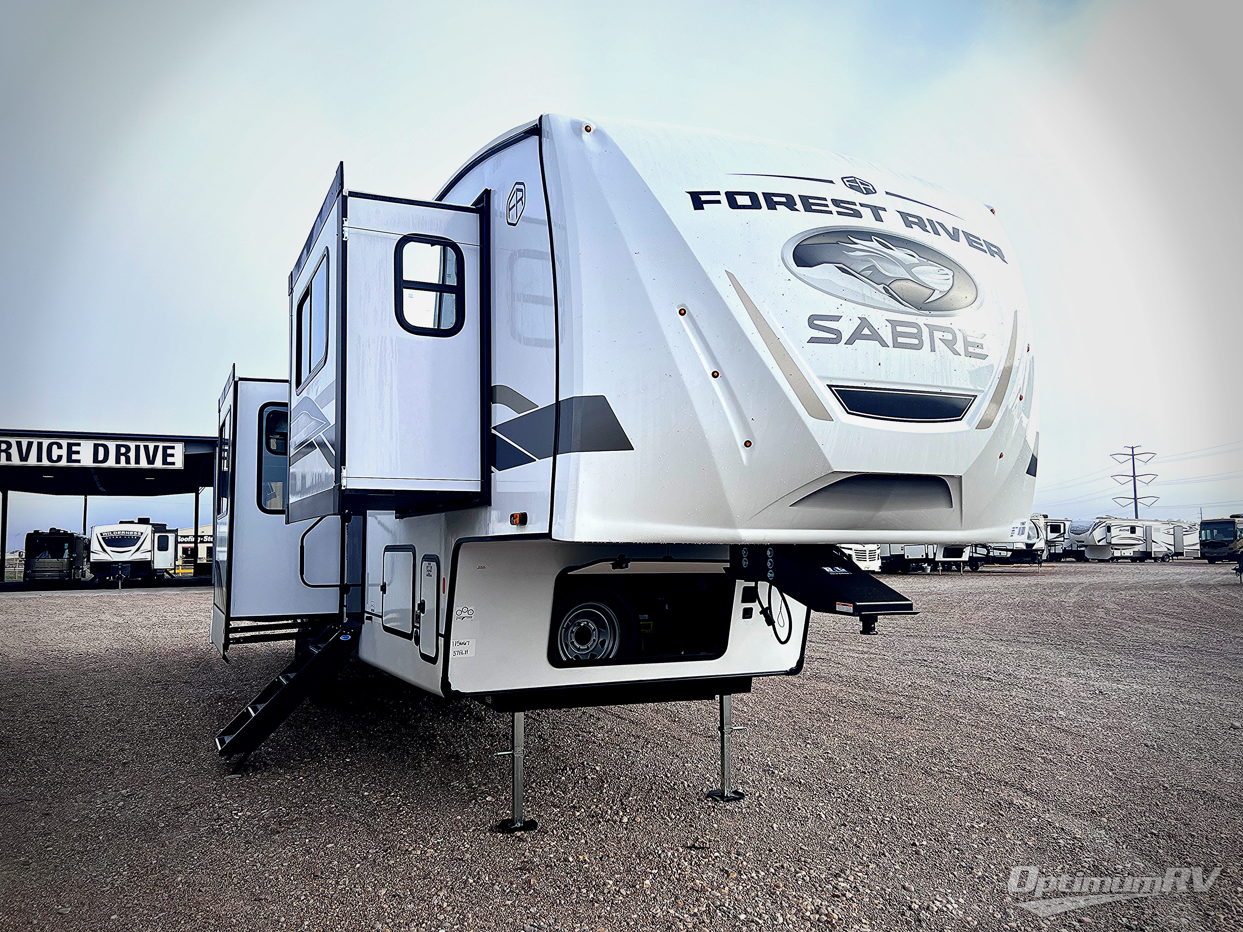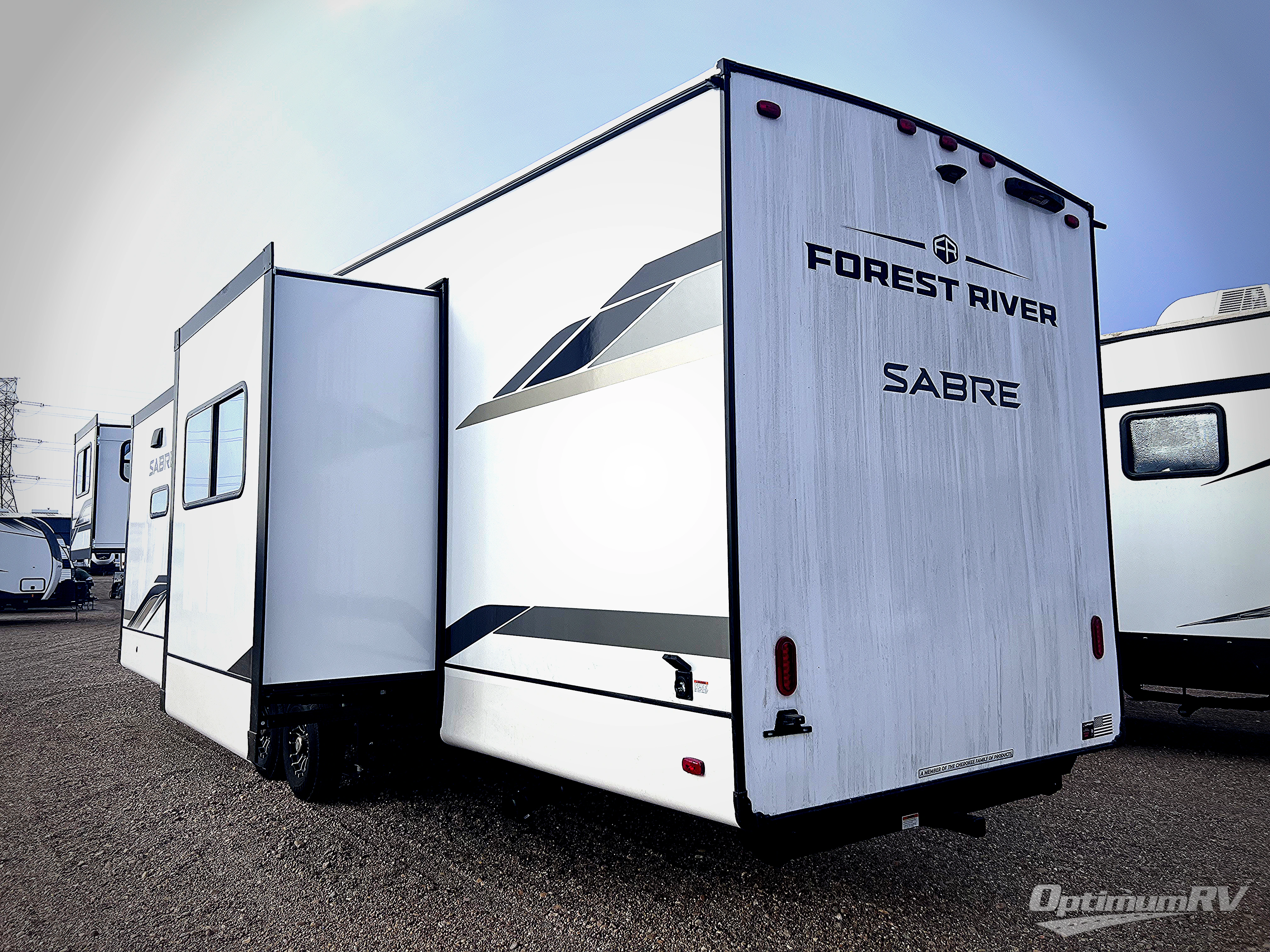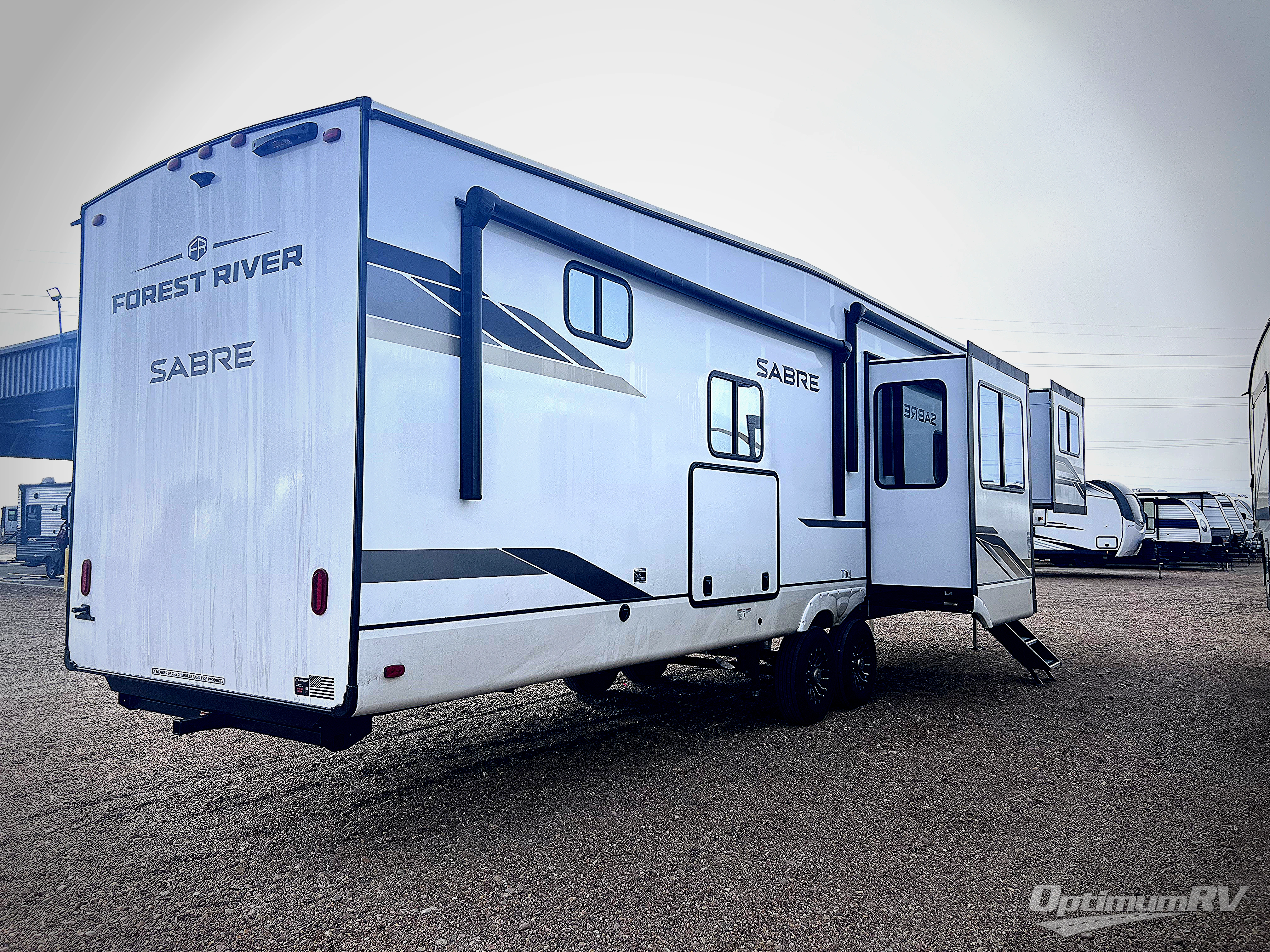 You will experience luxurious camping trips at an affordable price with any one of these Forest River Sabre fifth wheels! These models are durable and ready to travel anytime of the year thanks to features like the high-gloss gel-coat front cap with LED lighting, the PVC roof membrane, and the forced air underbelly with enclosed gate valves. The electric auto-leveling system makes setting up easy and safe, and the adjustable power awning with LED lighting will create an inviting outdoor living space. Each model includes a universal docking station which includes a black tank flush and an outside shower, and detachable and adjustable stable steps for you to enter and exit the unit safely. Inside, you will love the design of the ambient accent lighting in the living area, the real wood lumbercore cabinetry, and the linoleum flooring!