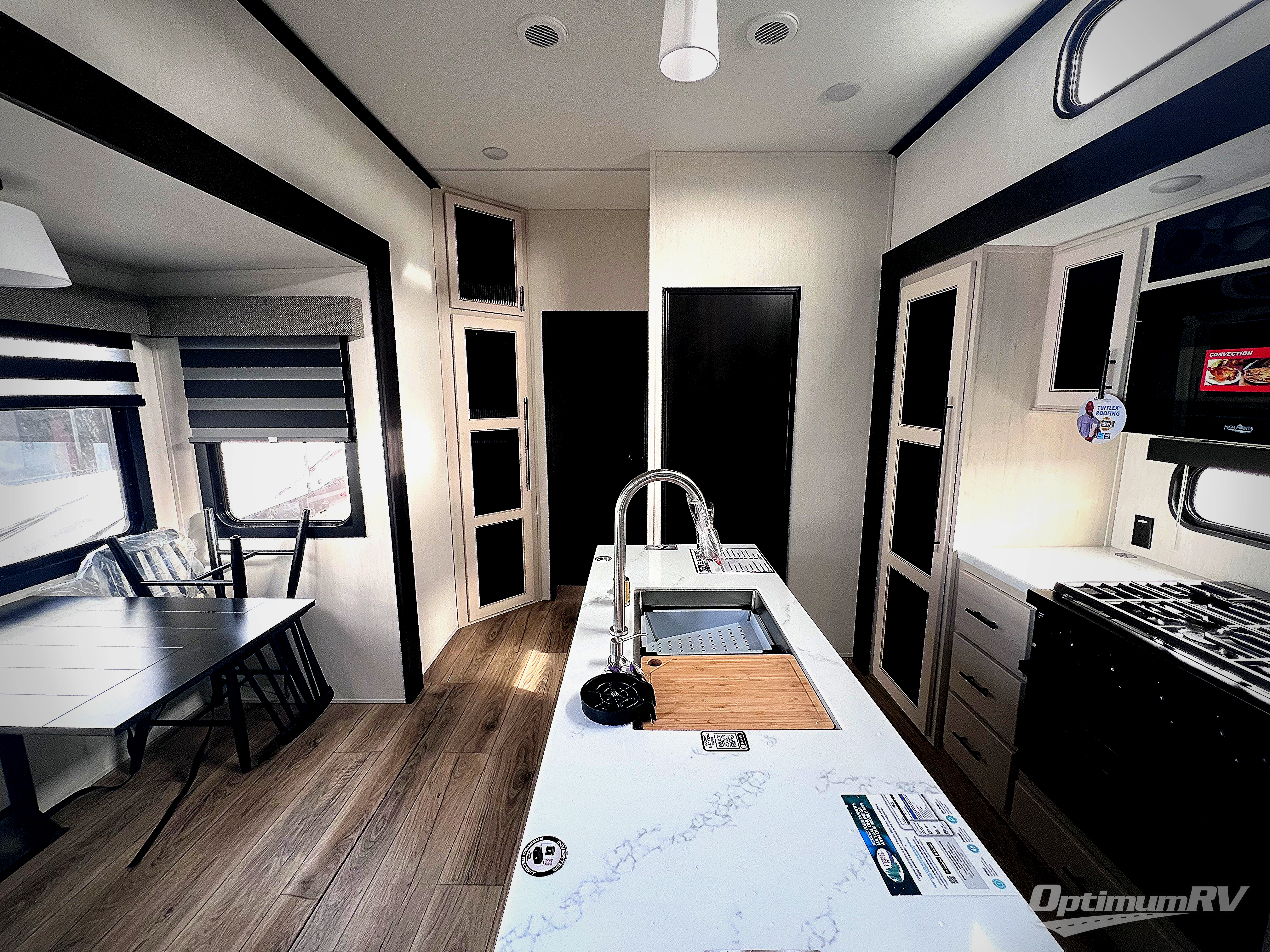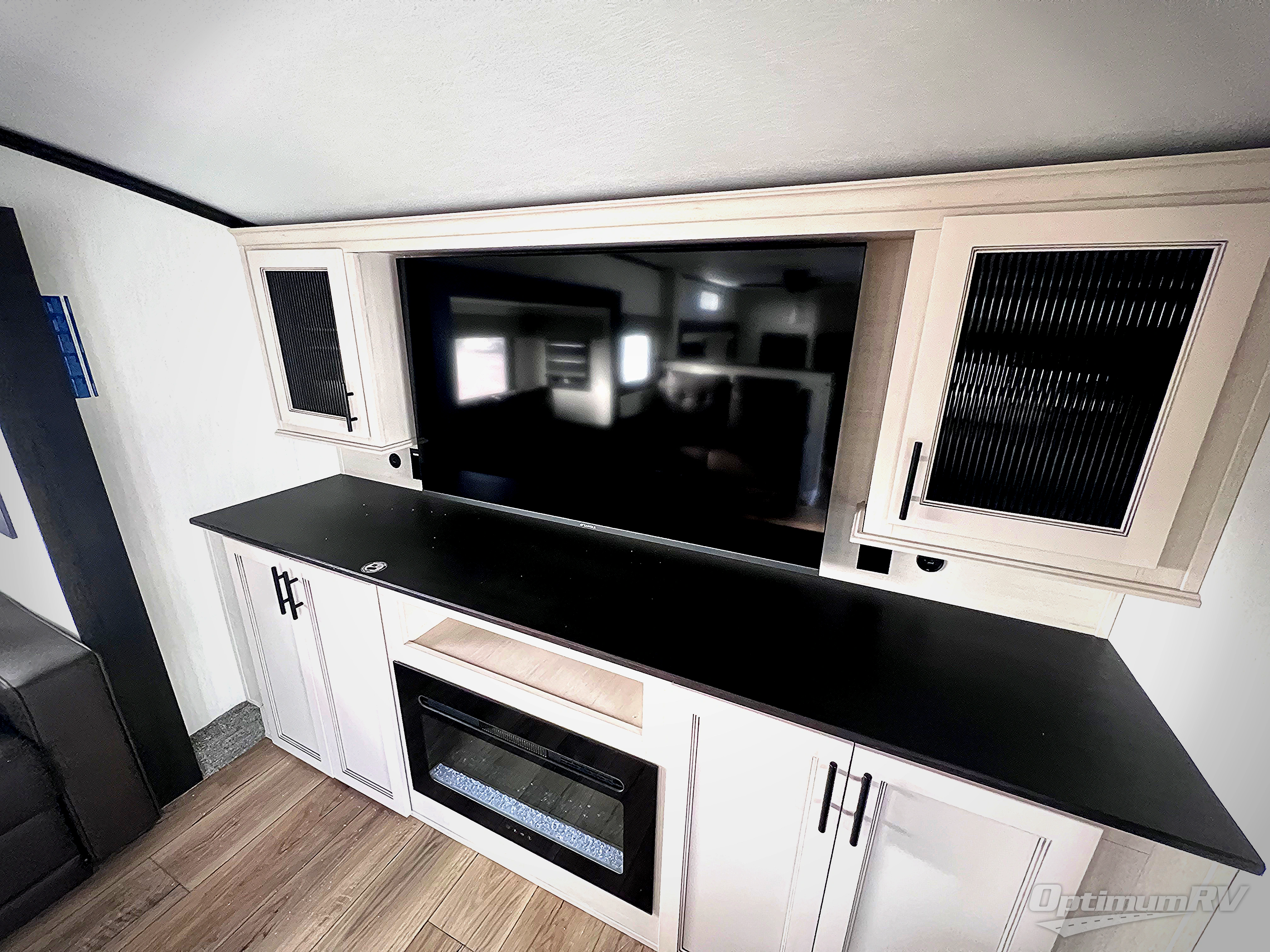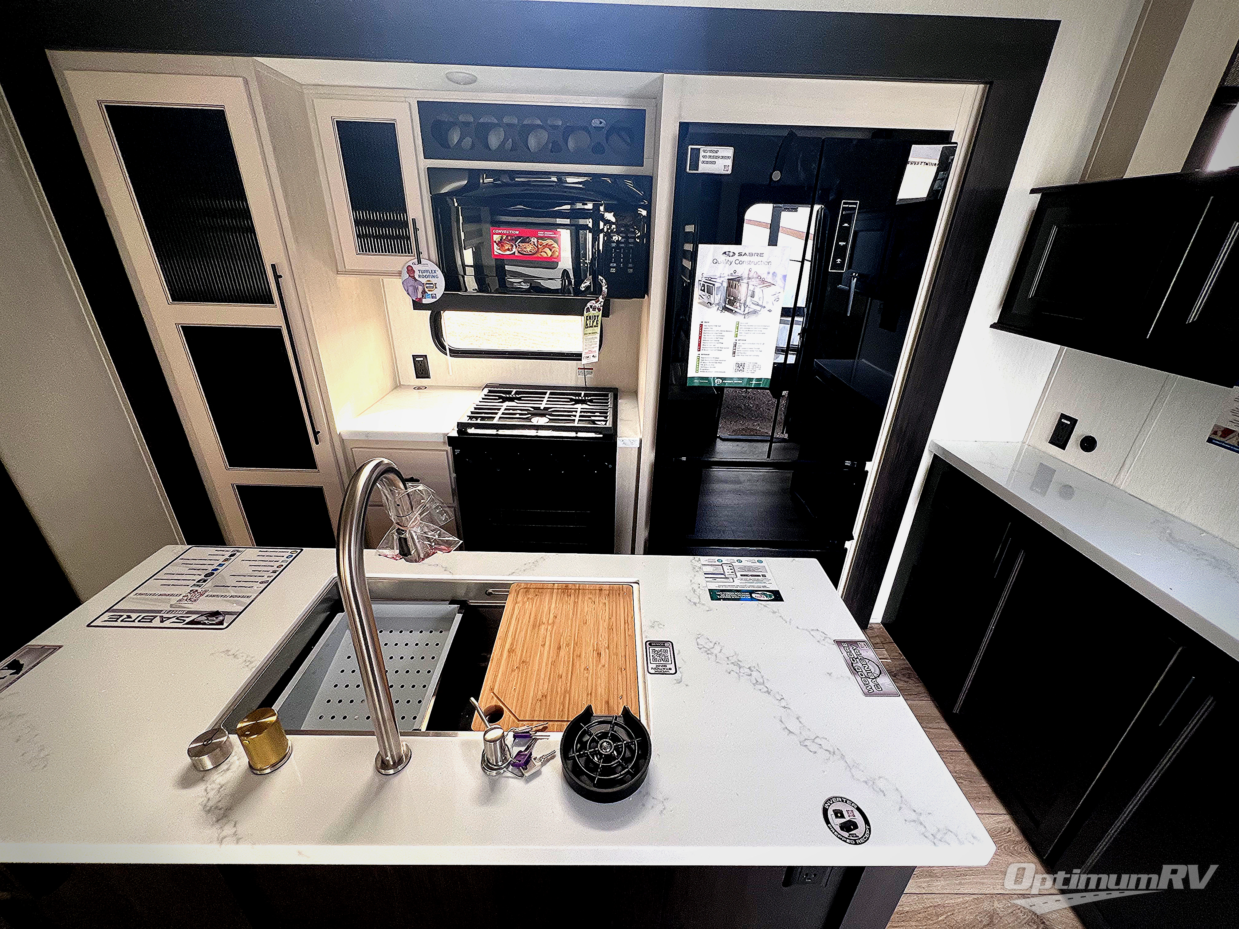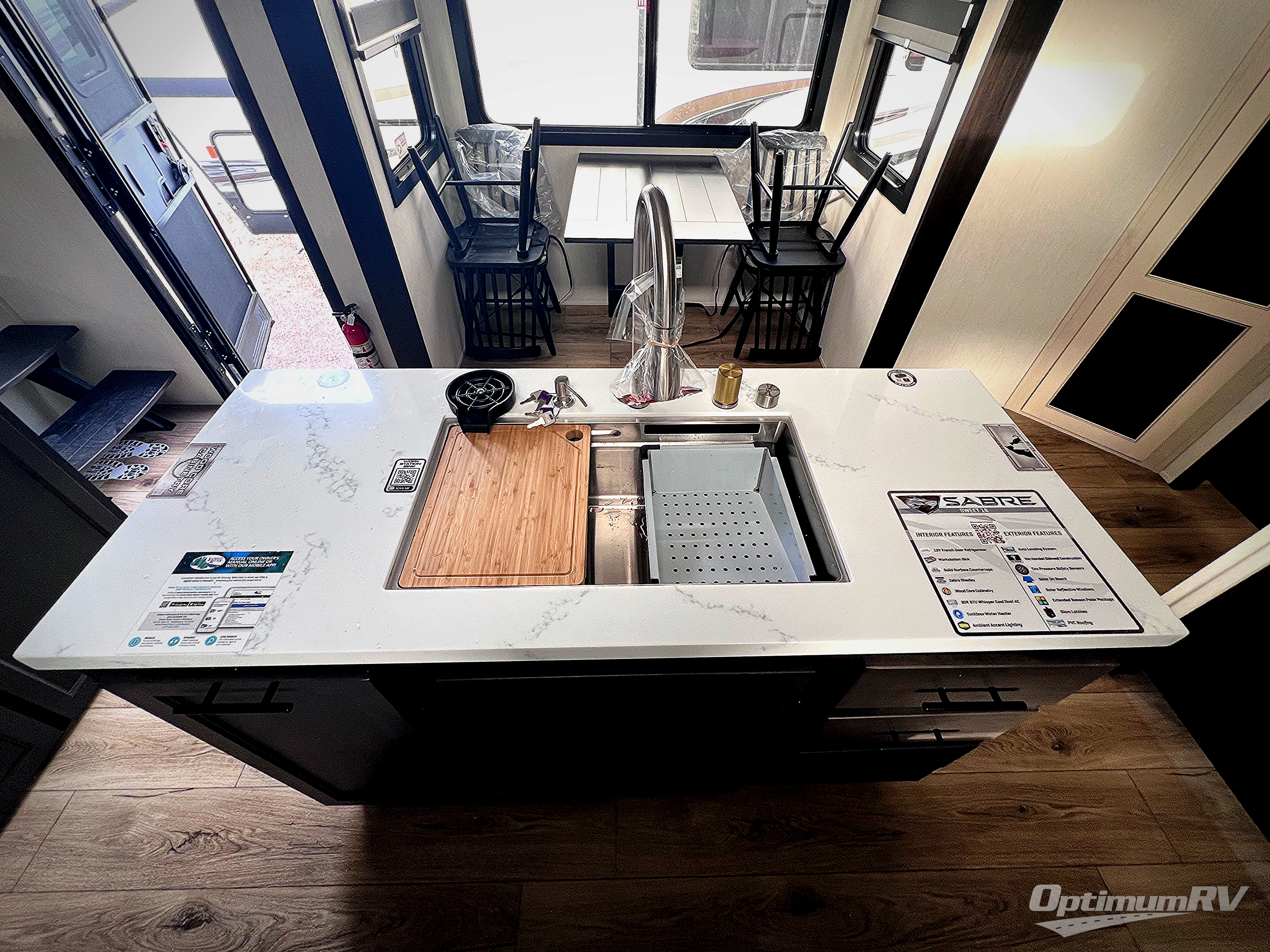 This Sabre fifth wheel with a full and half bath is sure to be a crowd pleaser! The front living area is the perfect place for everyone to visit each other comfortably on the two tri-fold sofas that can be transformed into extra sleeping spaces, or at the theater seating for complete relaxation. You will also find an entertainment center with a fireplace and a TV. This Sabre has a kitchen filled with convenient features, such as a 12V refrigerator with French doors, a kitchen island, and a lighted pantry with motion sensors. The rear master suite has access to its very own full bathroom with a double-sink vanity for two to get ready at once, and a wardrobe with washer and dryer prep for convenience!