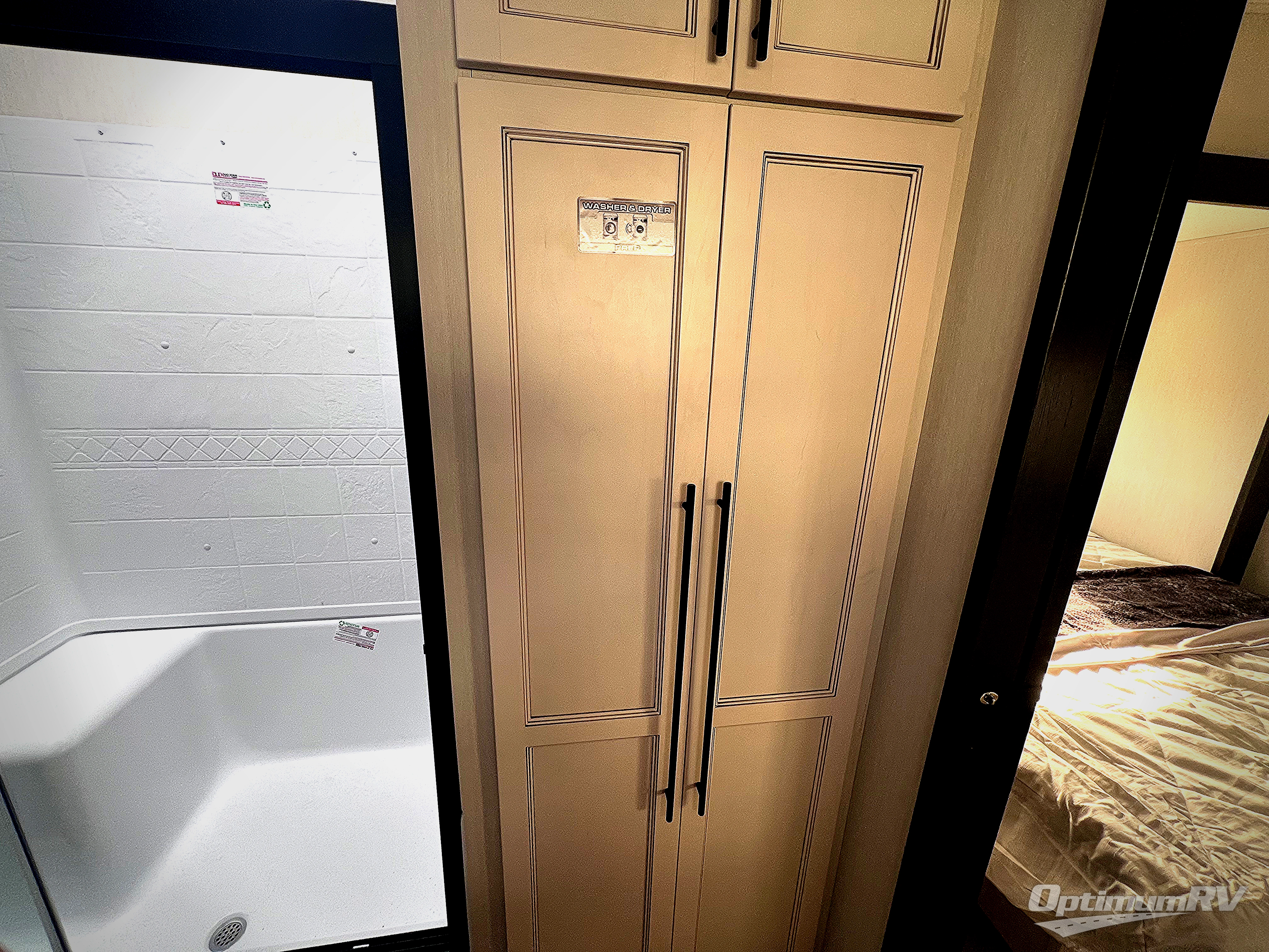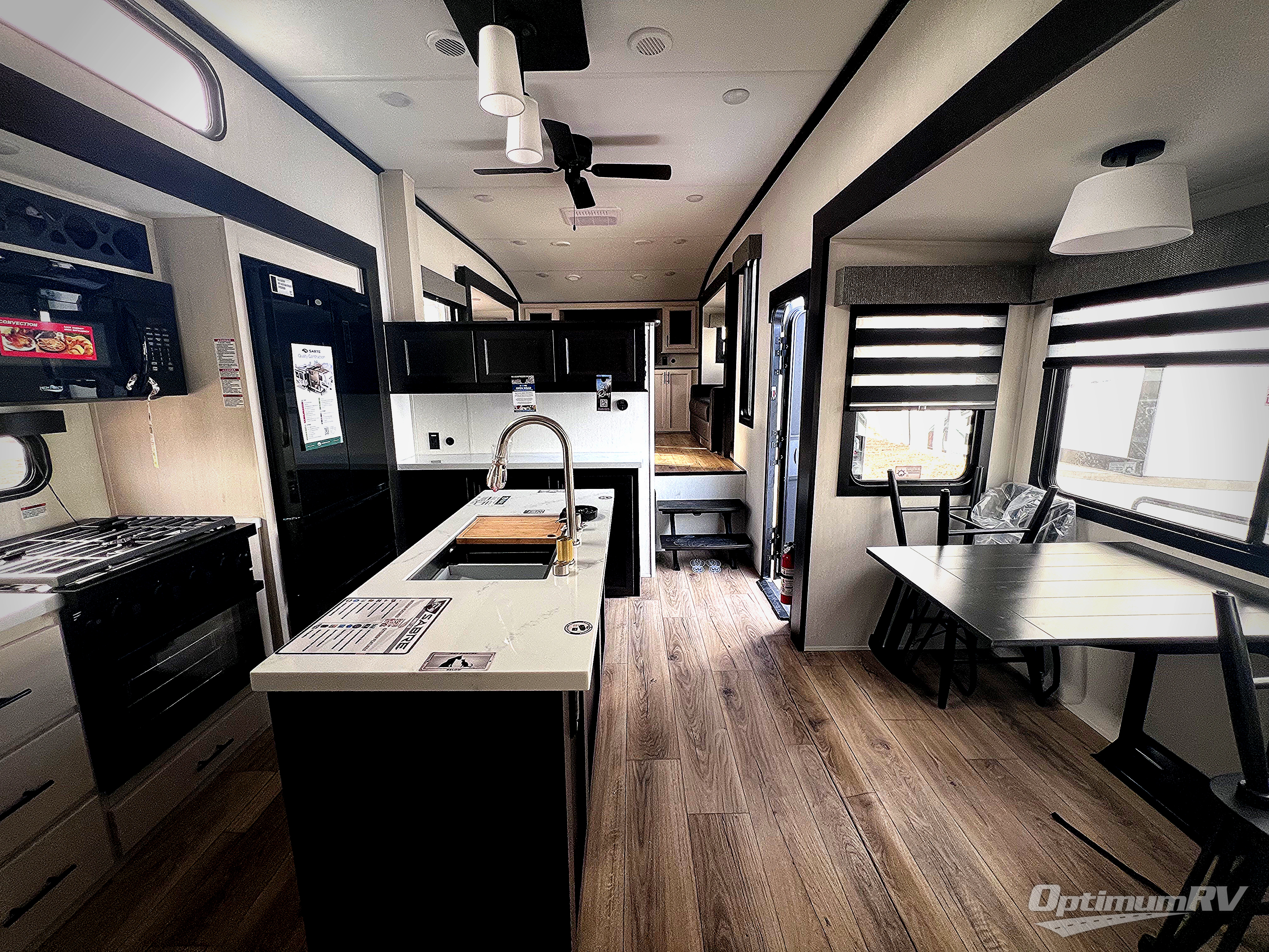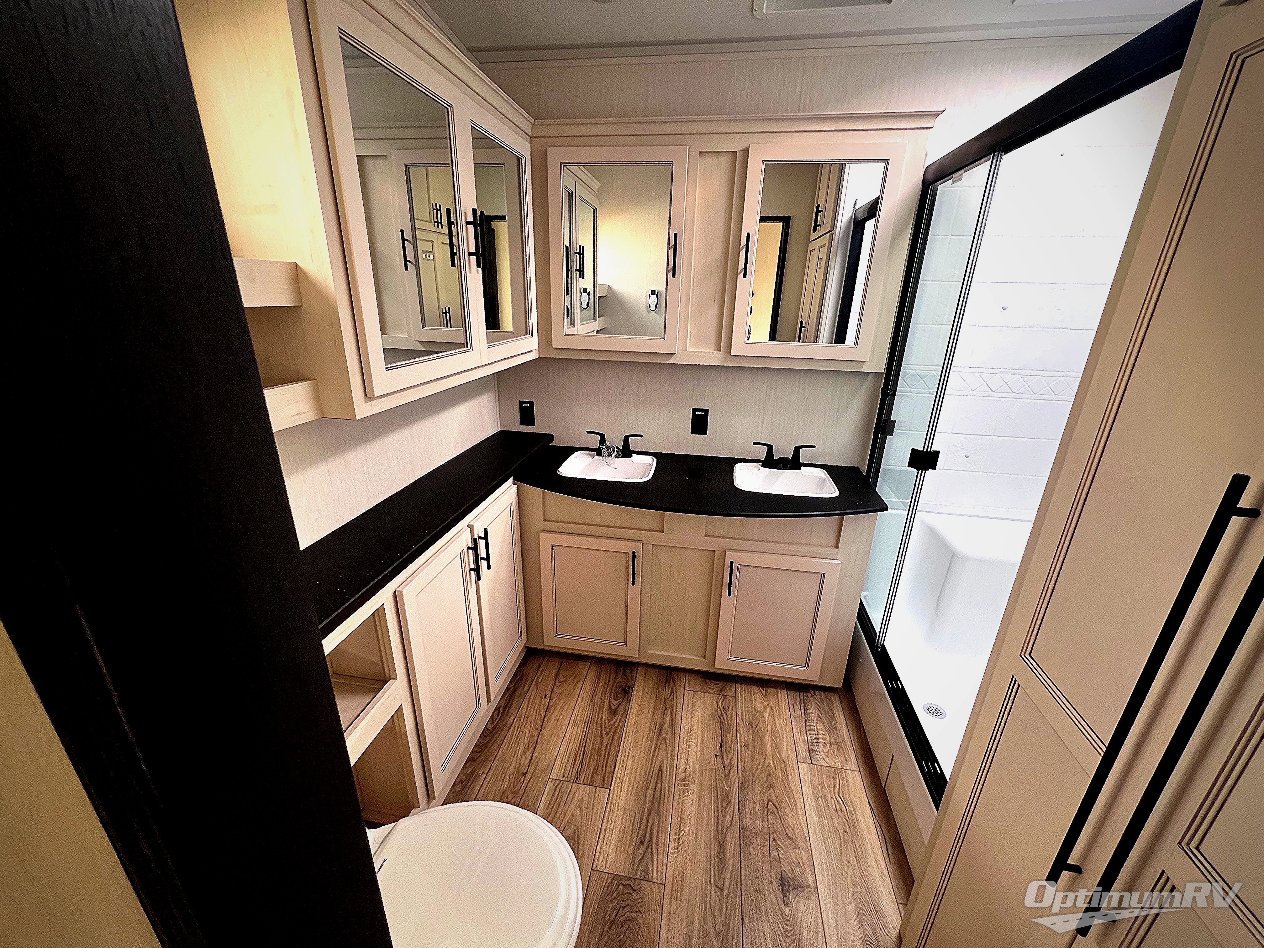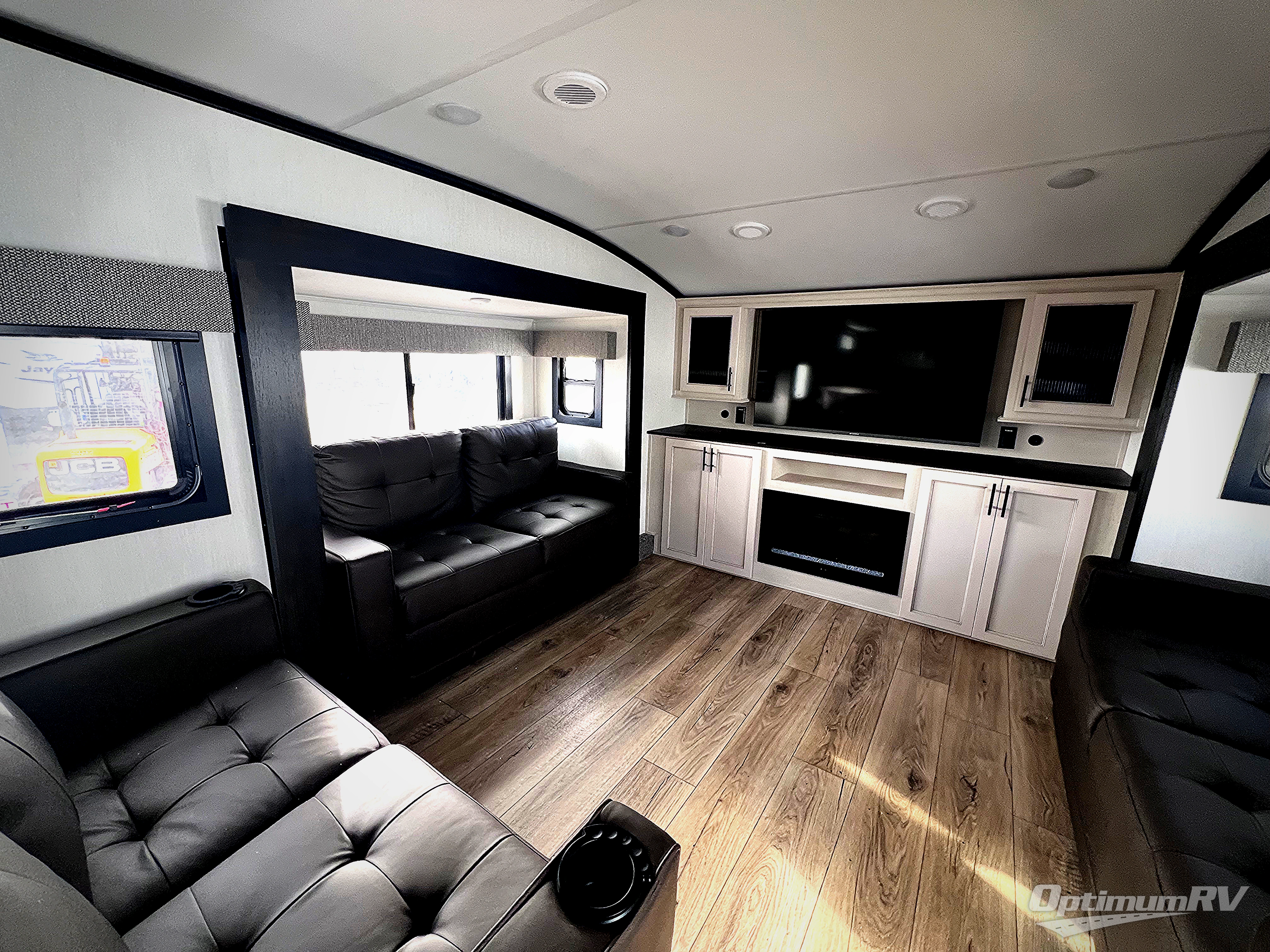 This Sabre fifth wheel with a full and half bath is sure to be a crowd pleaser! The front living area is the perfect place for everyone to visit each other comfortably on the two tri-fold sofas that can be transformed into extra sleeping spaces, or at the theater seating for complete relaxation. You will also find an entertainment center with a fireplace and a TV. This Sabre has a kitchen filled with convenient features, such as a 12V refrigerator with French doors, a kitchen island, and a lighted pantry with motion sensors. The rear master suite has access to its very own full bathroom with a double-sink vanity for two to get ready at once, and a wardrobe with washer and dryer prep for convenience!