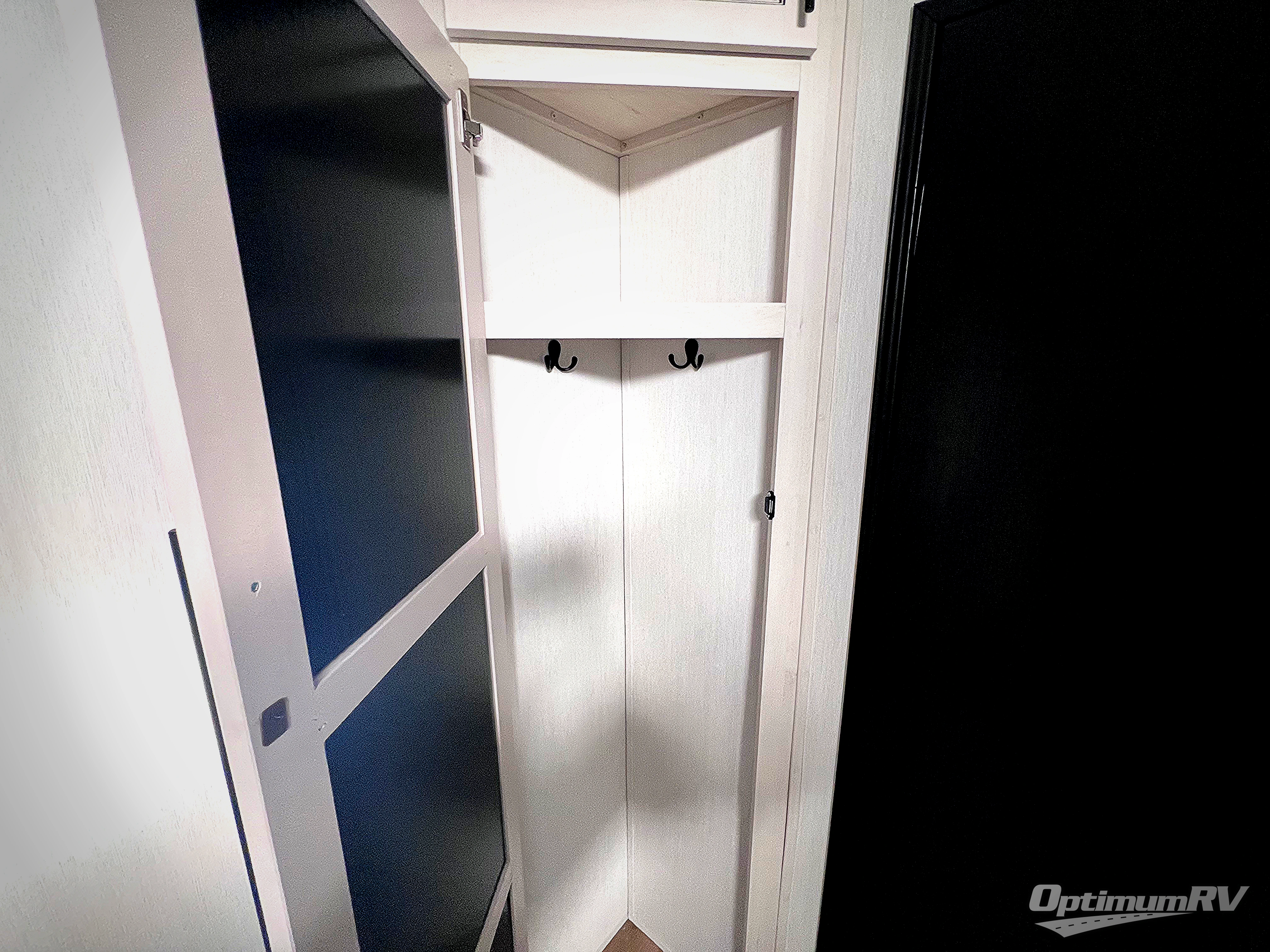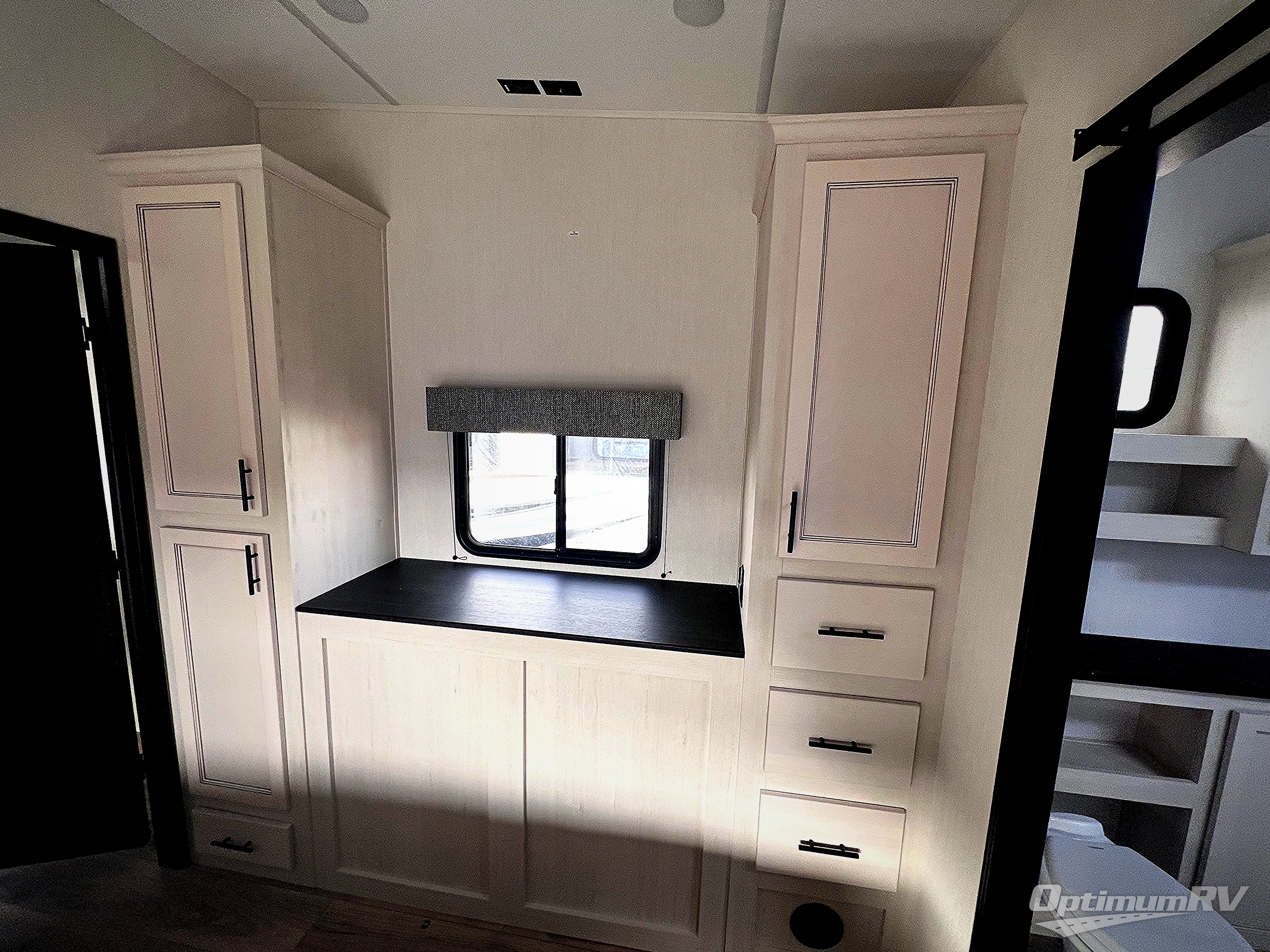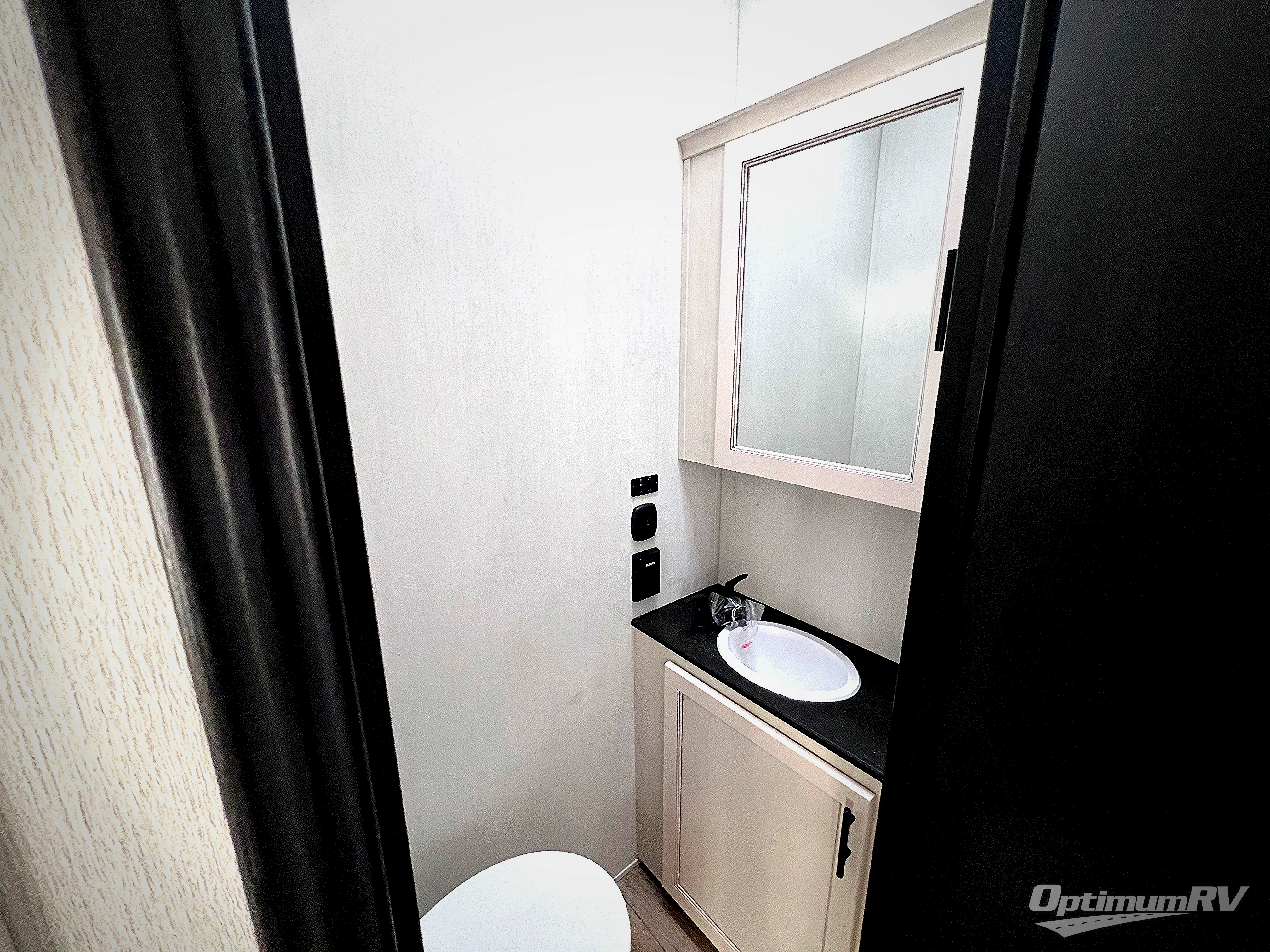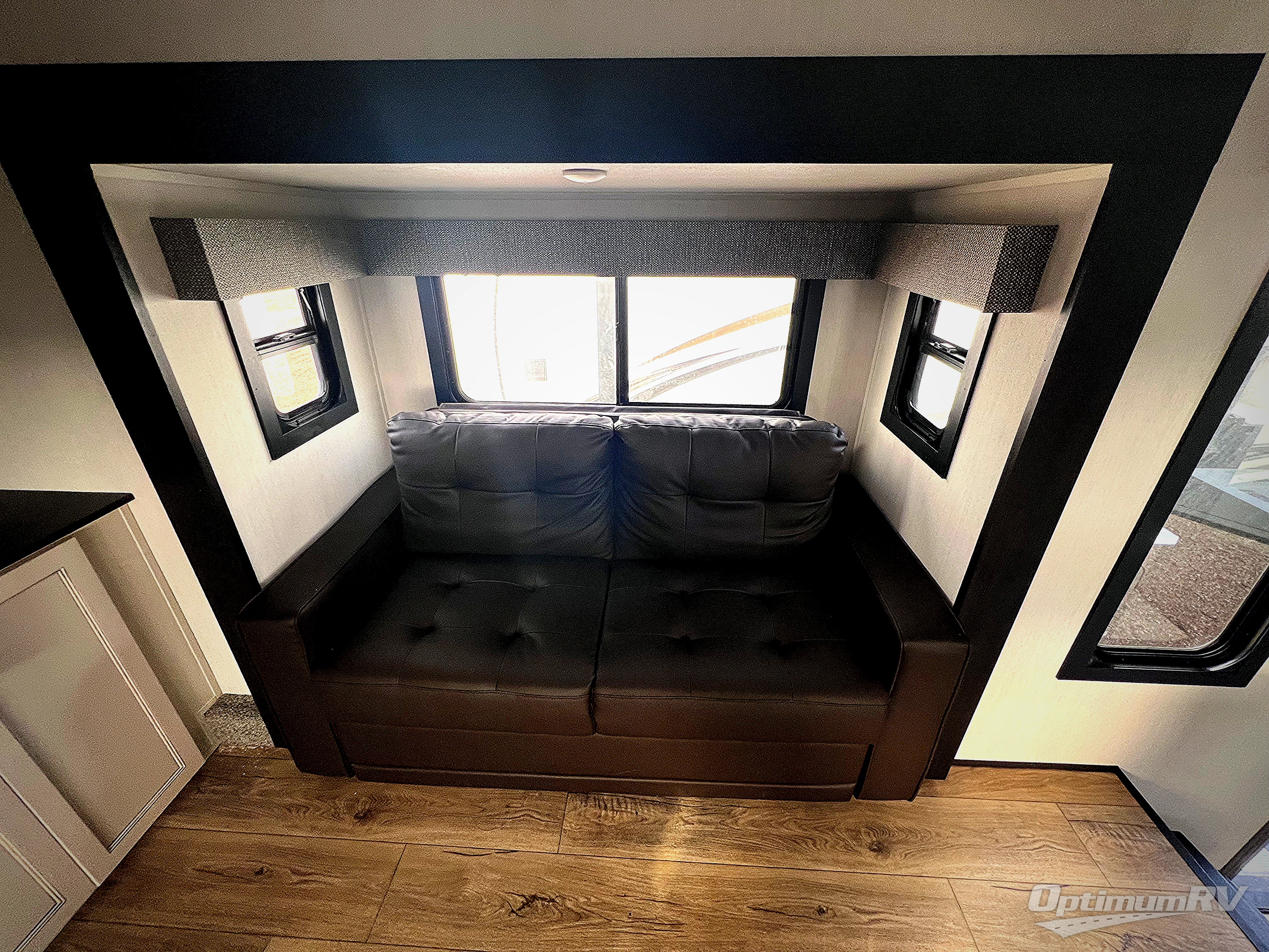 This Sabre fifth wheel with a full and half bath is sure to be a crowd pleaser! The front living area is the perfect place for everyone to visit each other comfortably on the two tri-fold sofas that can be transformed into extra sleeping spaces, or at the theater seating for complete relaxation. You will also find an entertainment center with a fireplace and a TV. This Sabre has a kitchen filled with convenient features, such as a 12V refrigerator with French doors, a kitchen island, and a lighted pantry with motion sensors. The rear master suite has access to its very own full bathroom with a double-sink vanity for two to get ready at once, and a wardrobe with washer and dryer prep for convenience!