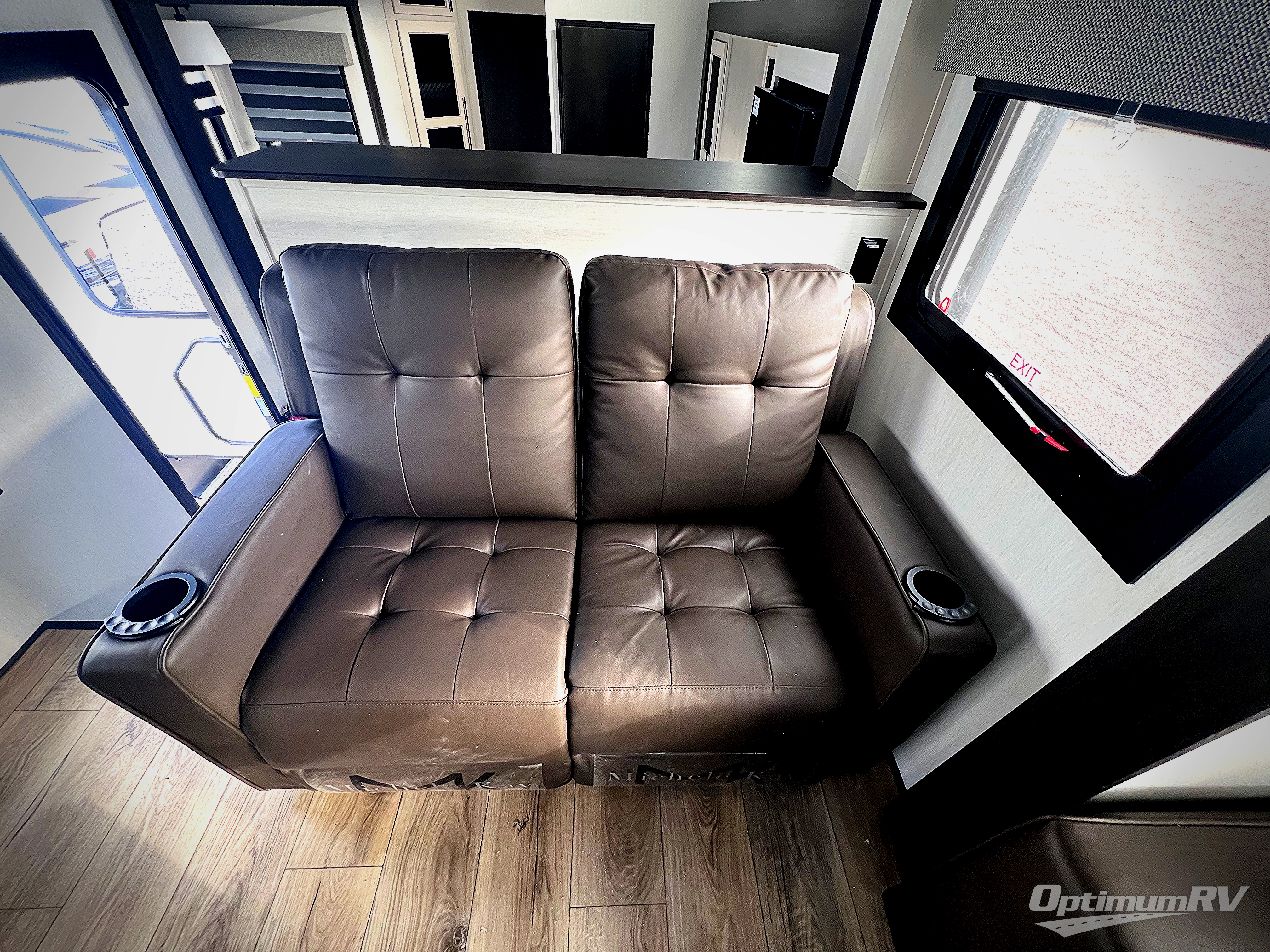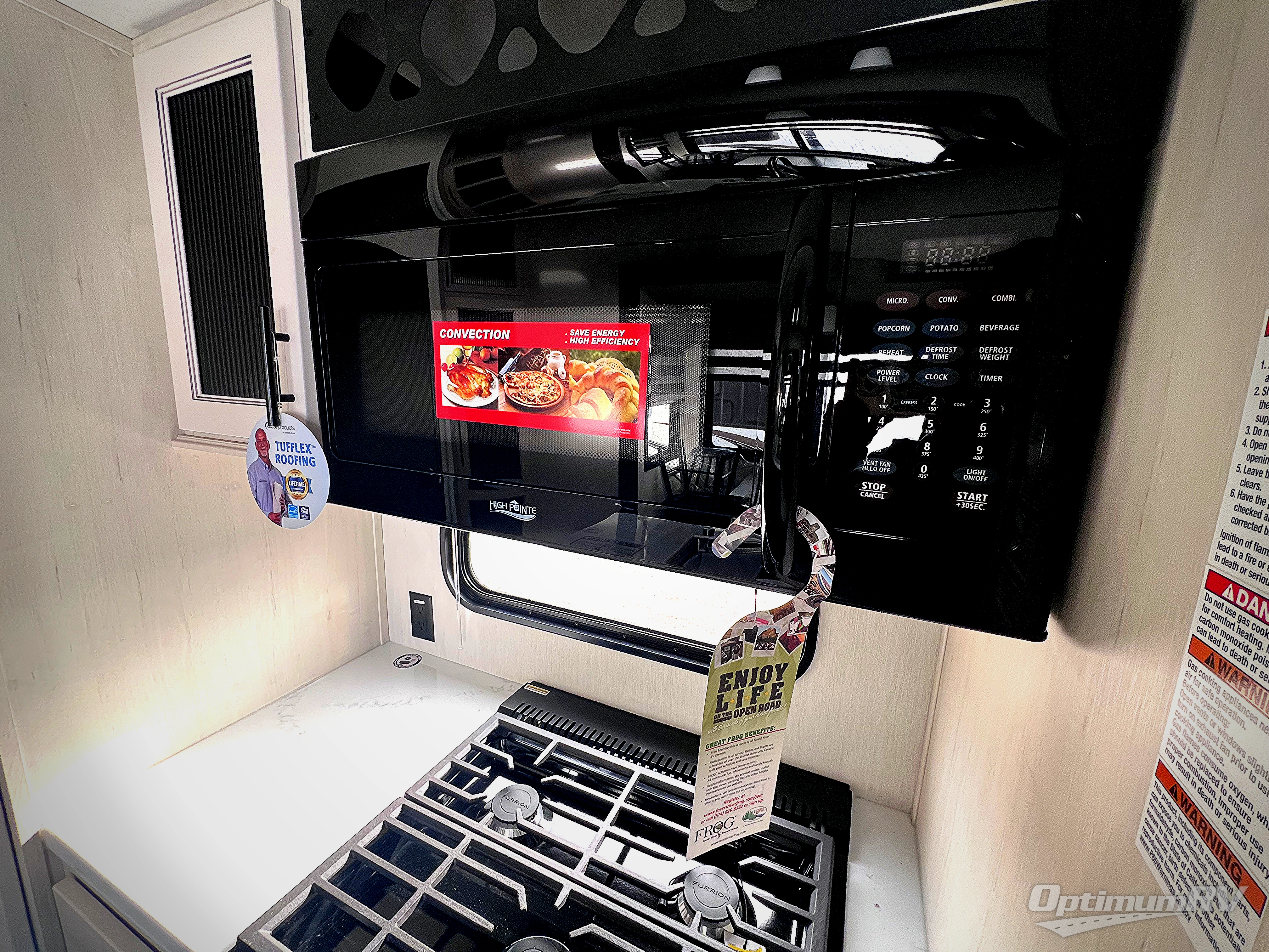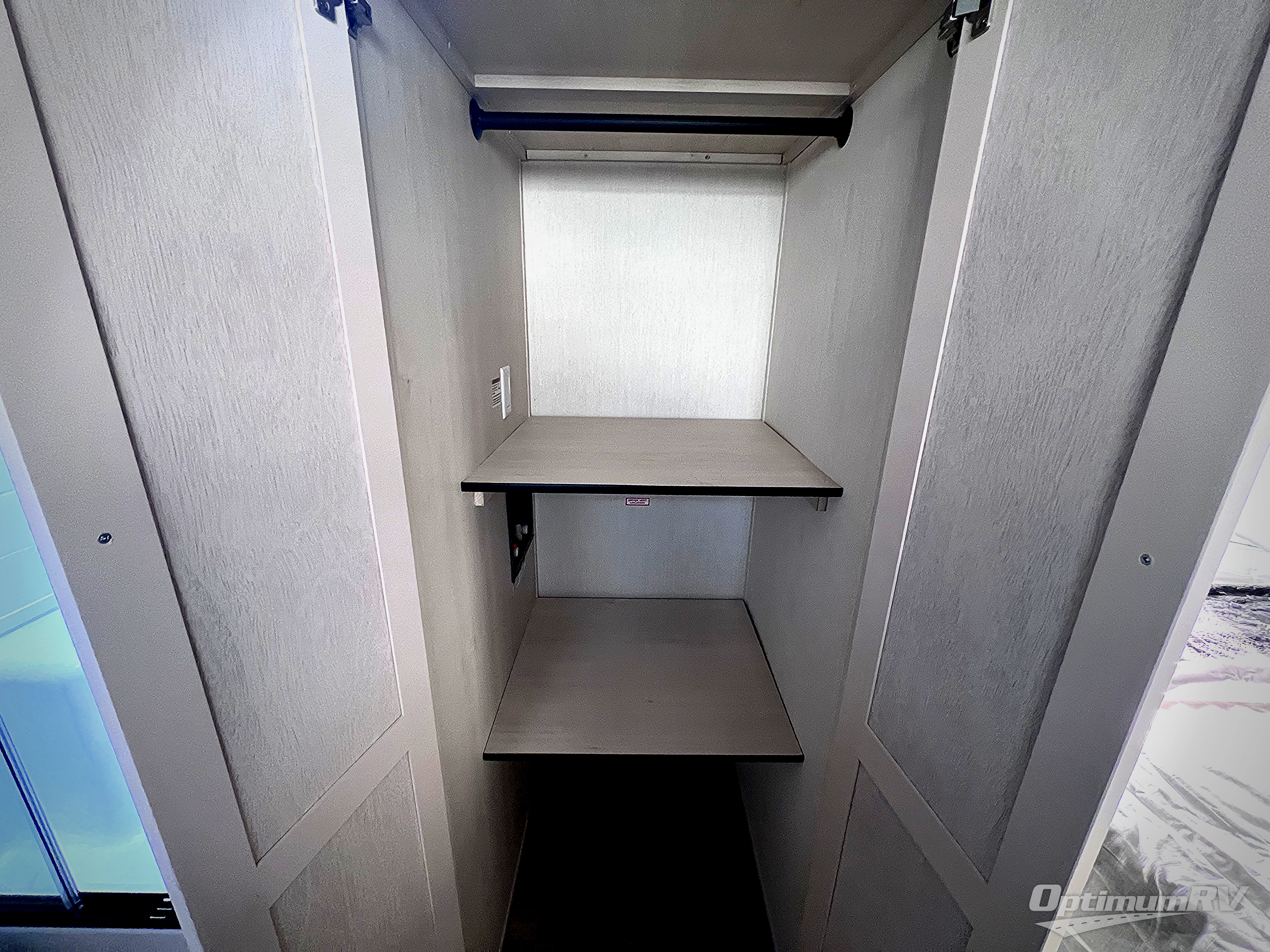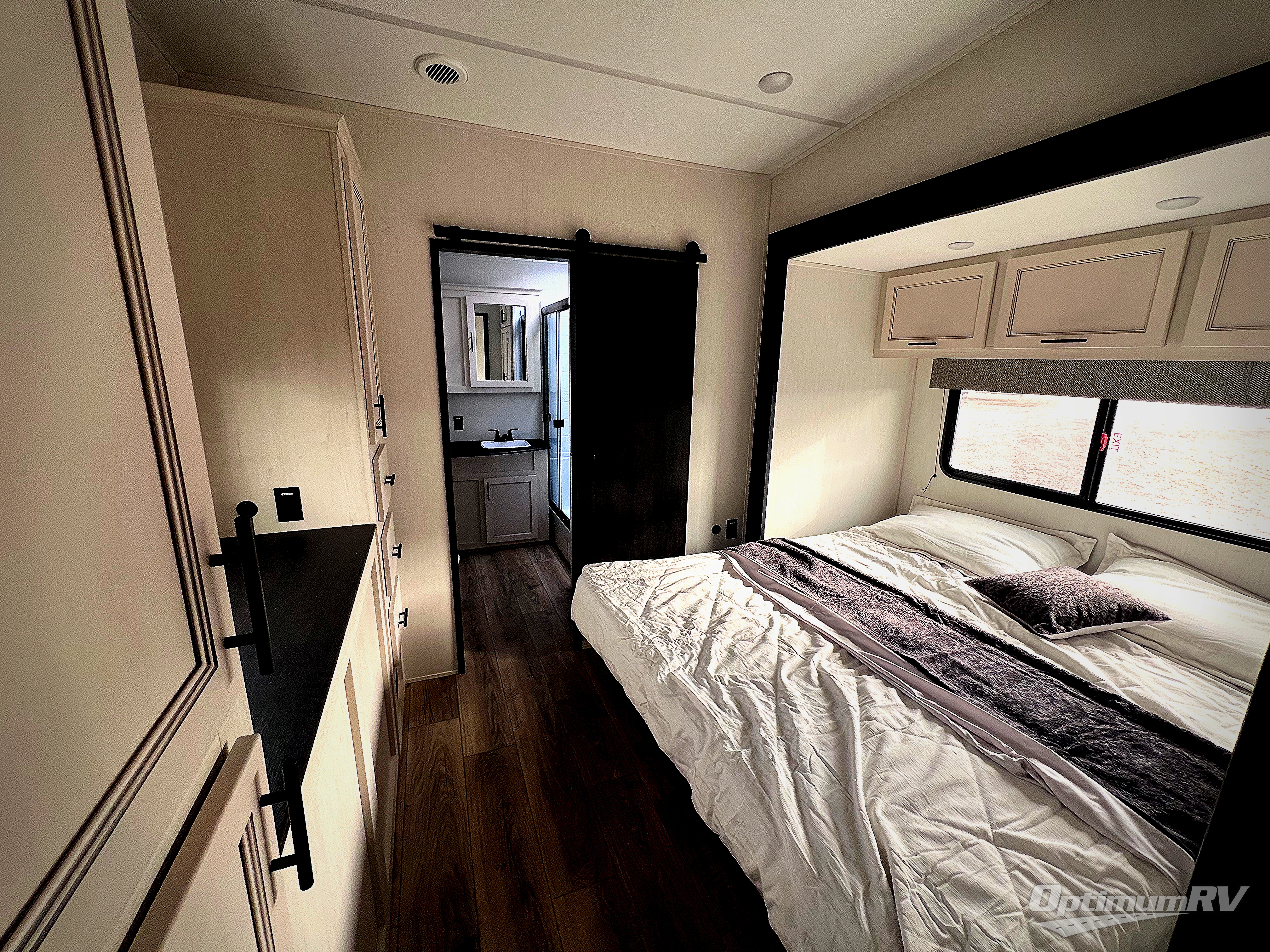 This Sabre fifth wheel with a full and half bath is sure to be a crowd pleaser! The front living area is the perfect place for everyone to visit each other comfortably on the two tri-fold sofas that can be transformed into extra sleeping spaces, or at the theater seating for complete relaxation. You will also find an entertainment center with a fireplace and a TV. This Sabre has a kitchen filled with convenient features, such as a 12V refrigerator with French doors, a kitchen island, and a lighted pantry with motion sensors. The rear master suite has access to its very own full bathroom with a double-sink vanity for two to get ready at once, and a wardrobe with washer and dryer prep for convenience!