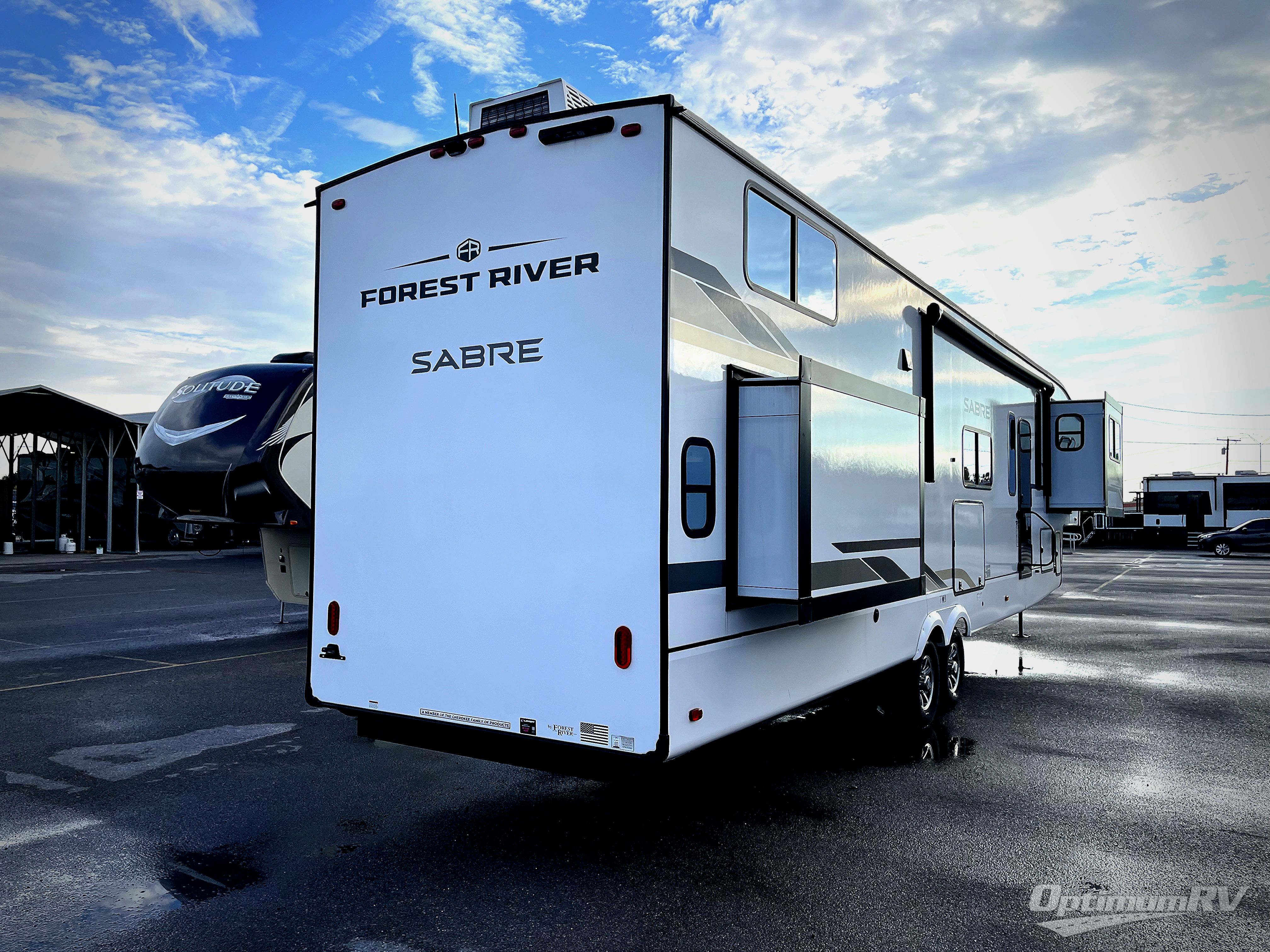 There is only one word that can describe this Sabre fifth wheel; fabulous! You will be amazed by the amount of comfort and convenience that is scattered all throughout this model for you and your family or friends. From the tri-fold sofa slides and theater seating to the rear bedroom with its camper king bed and wardrobe slide out, you will always have a place to relax and unwind. Not only that, but there is also a double loft area up above the bedroom and bath which has sleeping space, storage, a wardrobe, and railing for safety. The cook will enjoy the 12V refrigerator with French doors and pantry for all of your food storage needs, and the table with chairs is the perfect place to sit down and enjoy a delicious meal or play board games.