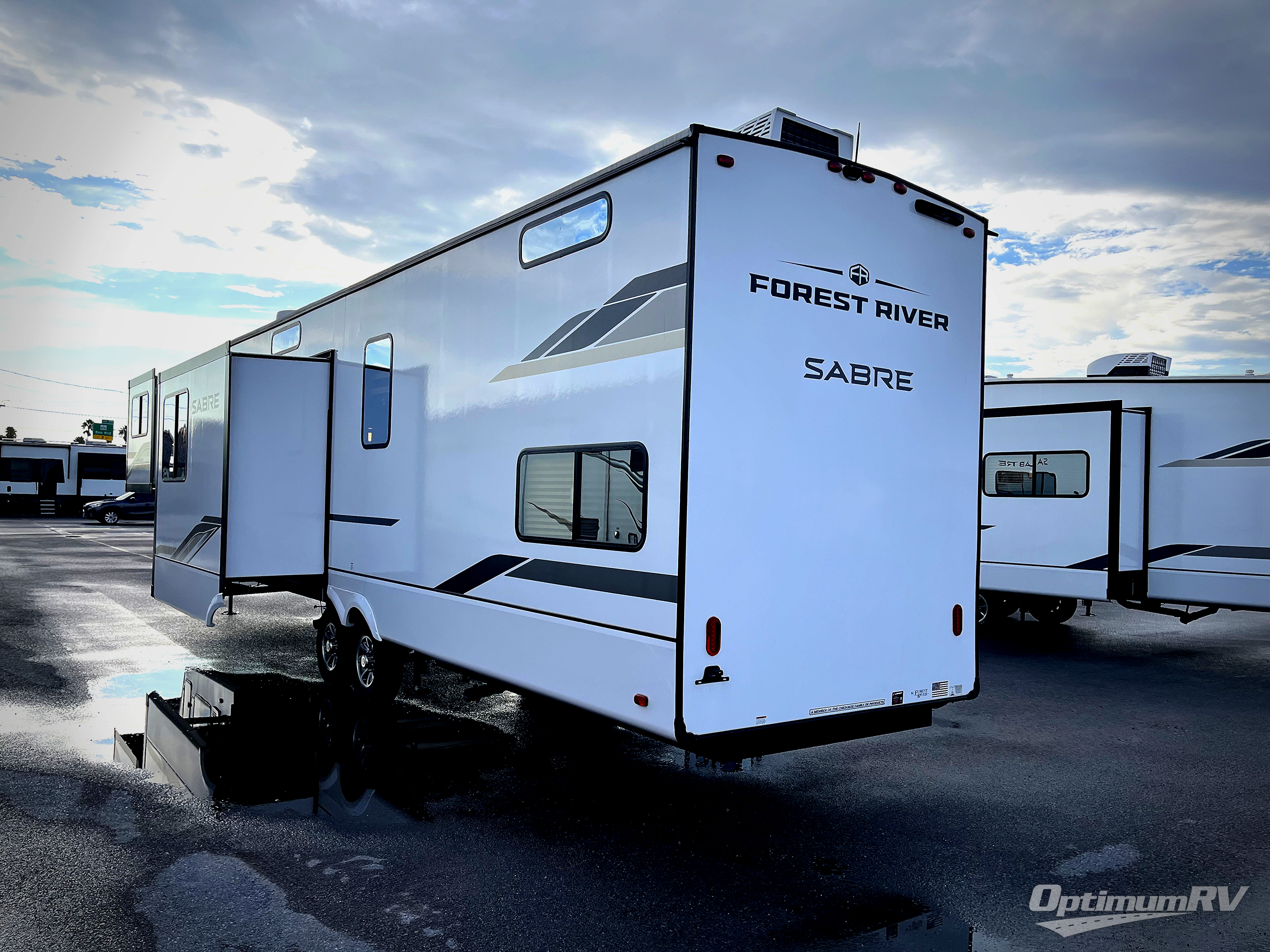 You will experience luxurious camping trips at an affordable price with any one of these Forest River Sabre fifth wheels! These models are durable and ready to travel anytime of the year thanks to features like the high-gloss gel-coat front cap with LED lighting, the PVC roof membrane, and the forced air underbelly with enclosed gate valves. The electric auto-leveling system makes setting up easy and safe, and the adjustable power awning with LED lighting will create an inviting outdoor living space. Each model includes a universal docking station which includes a black tank flush and an outside shower, and detachable and adjustable stable steps for you to enter and exit the unit safely. Inside, you will love the design of the ambient accent lighting in the living area, the real wood lumbercore cabinetry, and the linoleum flooring!