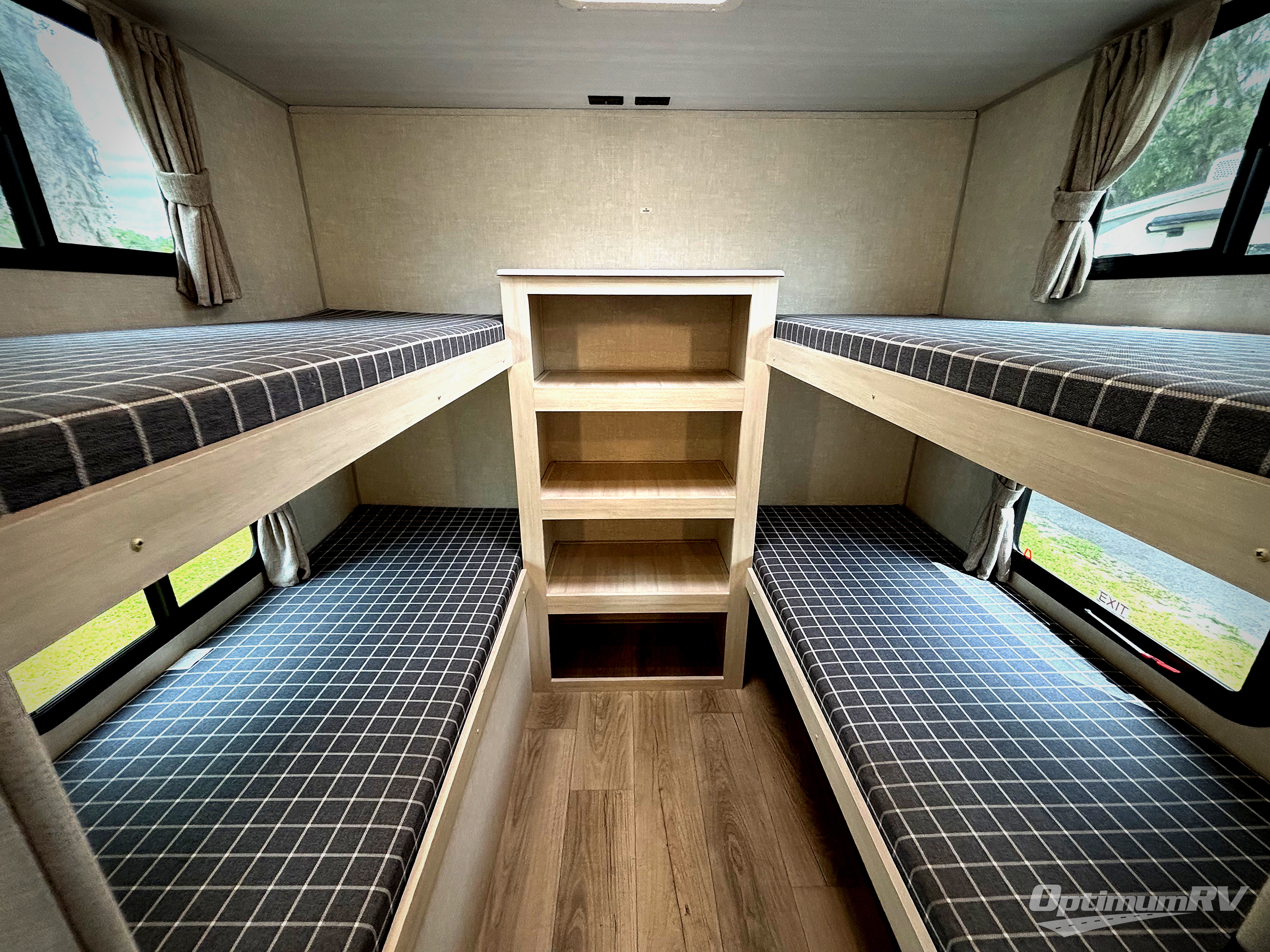 Head to your favorite camping spot with your favorite people in this spacious, dual entry travel trailer! The large slide out houses the booth dinette and sofa where you can relax in the evenings and even let guests sleep over who haven't claimed the quad bunks in the rear bunkhouse. A walk-thru bath is convenient for all, and the full kitchen lets you whip up your best meals in the microwave with an air fryer. And a walk-in pantry with washer and dryer prep makes it easier to go full-time if you choose! When it's time to call it a night, the front master bedroom with a queen bed will provide you with your own space to retreat to, and there are dual bedside wardrobes to keep your clothes organized.