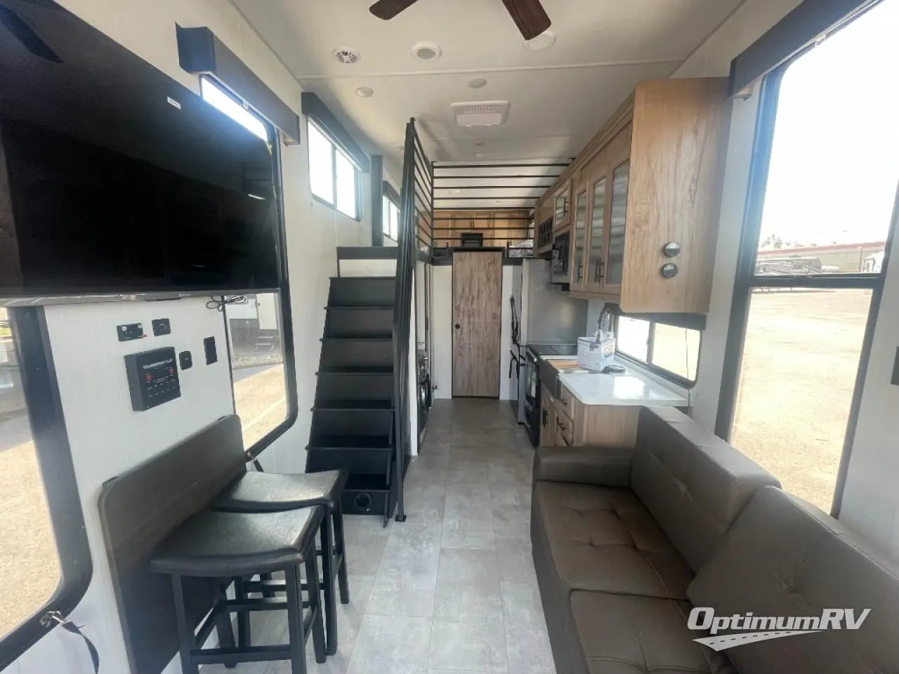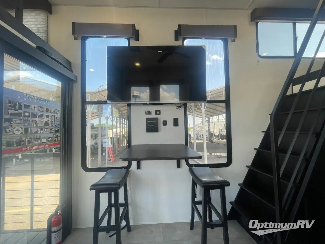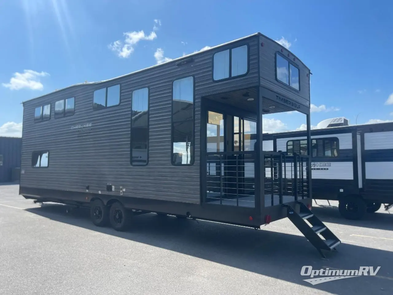 This model is similar to Timberwolf 16ML but larger! A bigger bathroom, king bed in the lower master, and two queen bunk mats in the upper loft. There is an 18 cu. ft. refrigerator so you can stock up for a week long vacation. There is also a sofa that can transform into added sleeping for guests, and there is a high top table that can collapse against the wall with two stools which is perfect for snacks or a game, but can also be out of the way when you don't need it. A ladder allows access into the upper front loft that is over the covered patio. The bathroom below is split with a shower on one side, and a private toilet area and sink opposite. And the view is amazing from just about anywhere inside.