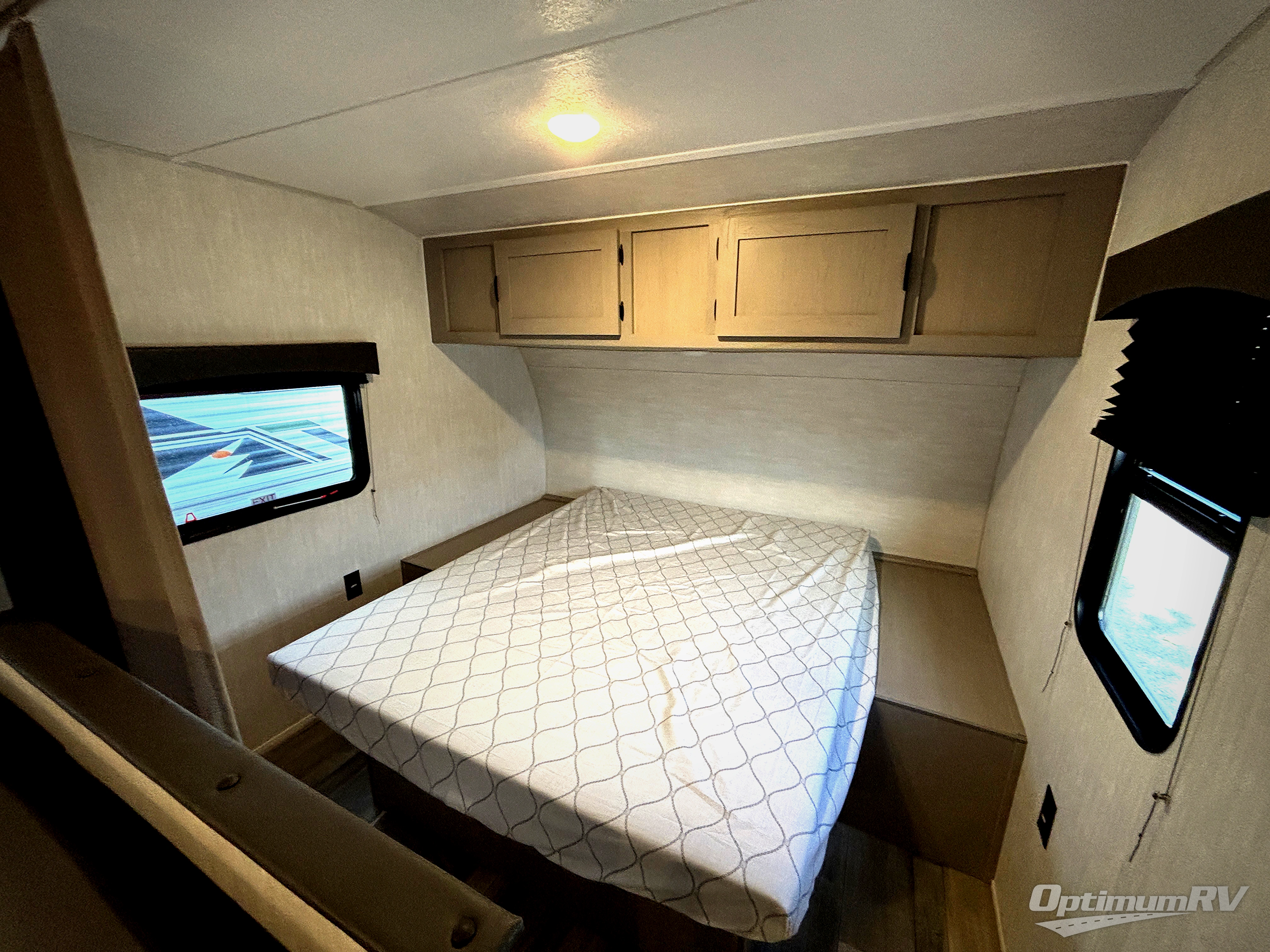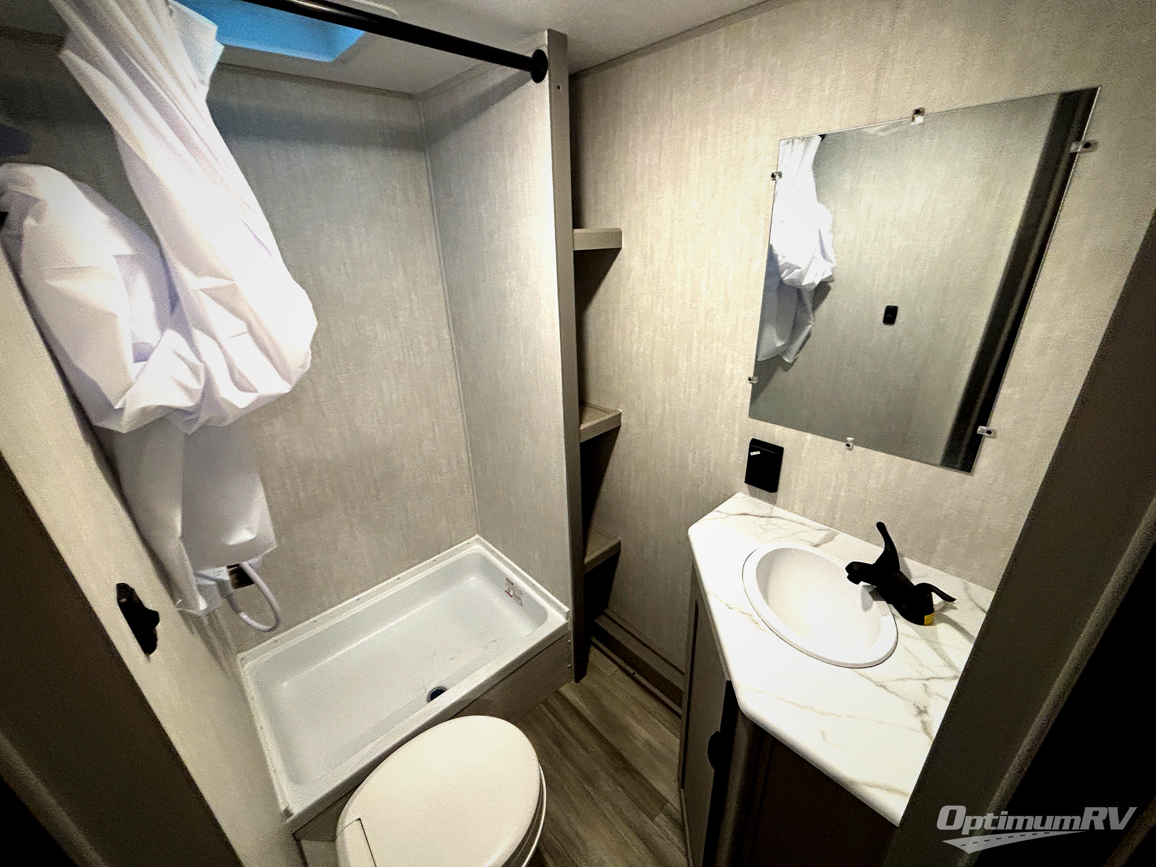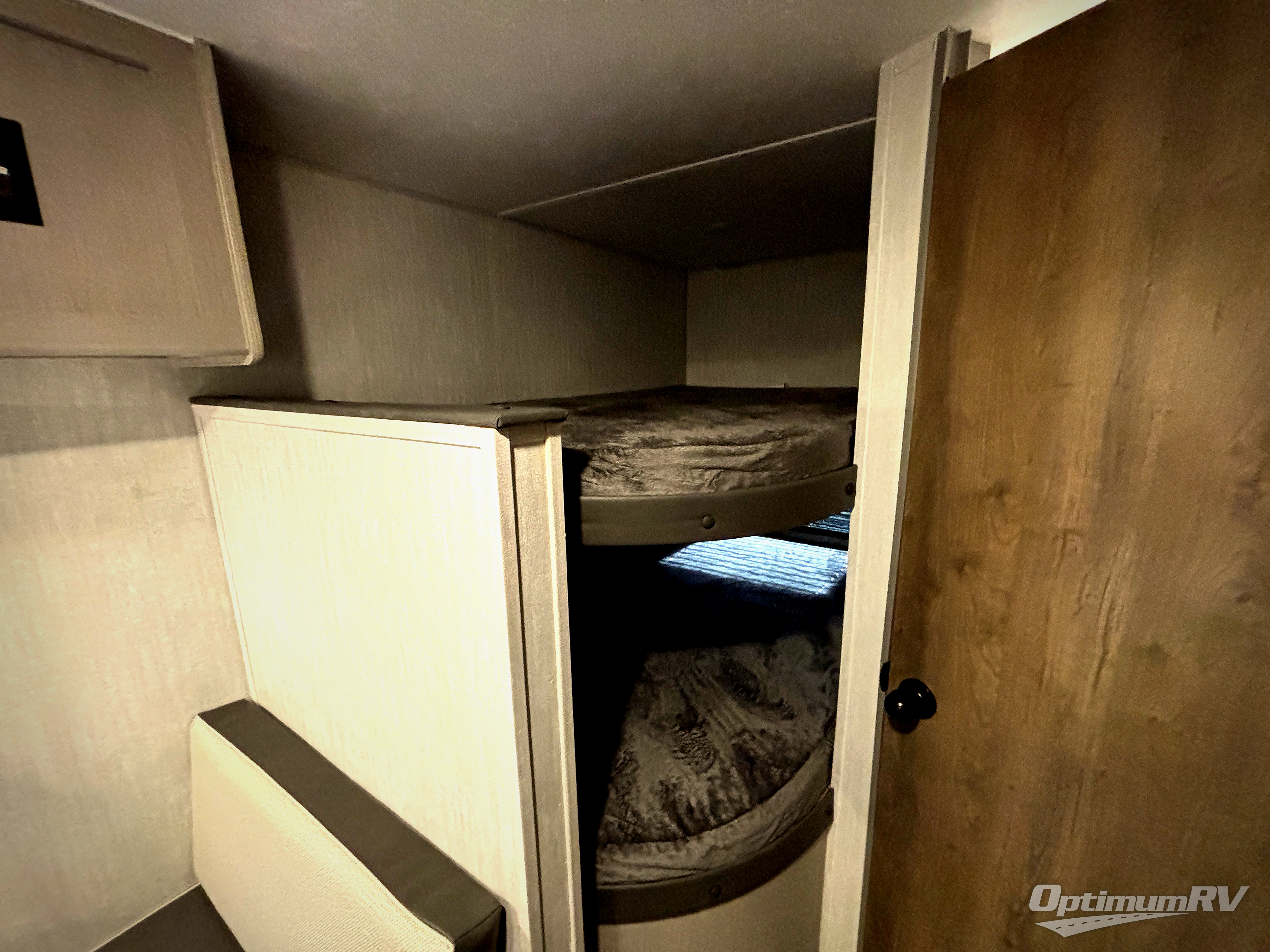 Bring the whole family with you in this travel trailer! The kiddos can sleep on the rear corner set of double-size bunks. The opposite rear corner features a full bath including a 24" x 36" shower, linen cabinet, toilet, and vanity with medicine cabinet overhead. In the main living space, you will find plenty of seating with a booth dinette and jackknife sofa which can also transform into an extra sleeping space if needed. Everyone's bellies will stay full with the induction cooktop, 8 cu. ft. 12-volt refrigerator, and microwave which you can use to pop a bag of popcorn for movie night. You will enjoy the front bedroom for a bit of privacy including a queen bed and large overhead cabinet for your things. On the outside, a large front pass-through for lawn chairs and camp gear. There is more storage beneath the bunks in back and a nice 10' awning to provide protection from the elements when outdoors.