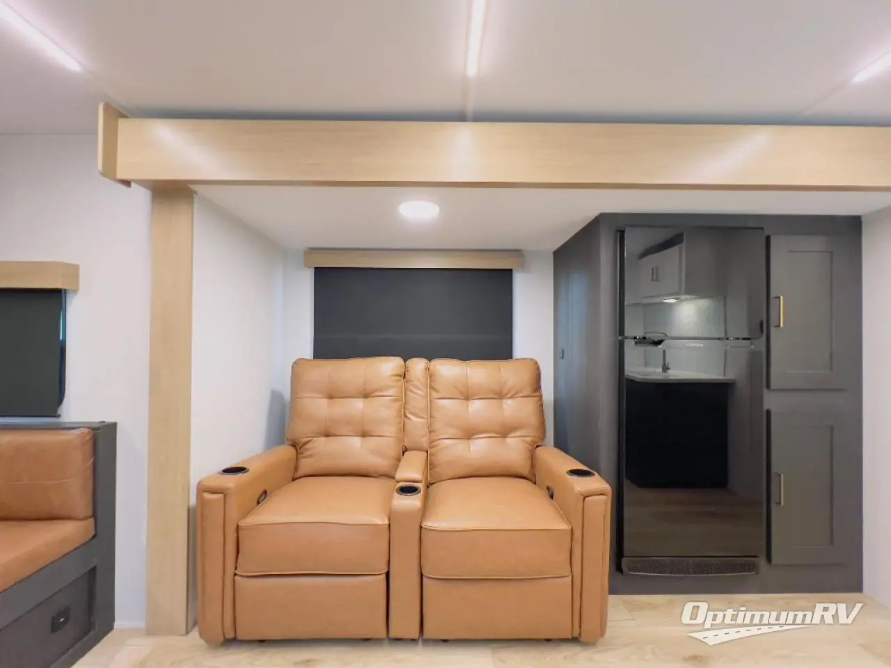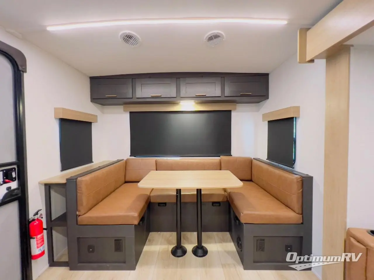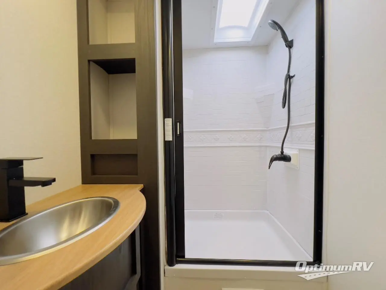 You and your spouse will love camping in this travel trailer! It features a front private bedroom with a king bed to lay your head on at night. Freshen up each morning in the full bathroom with a shower that has a skylight above to bring the outdoors inside. The chef can prepare their best home cooked meals with the three burner cooktop, conventional oven, and 10.7 cu. ft. 12V refrigerator. Enjoy all of your meals and play games at the rear U-shaped dinette, plus it can transform into an extra sleeping space for an extra guest or two depending on their size. With theater seating and an entertainment center with a fireplace, you can have a truly relaxing evening indoors!