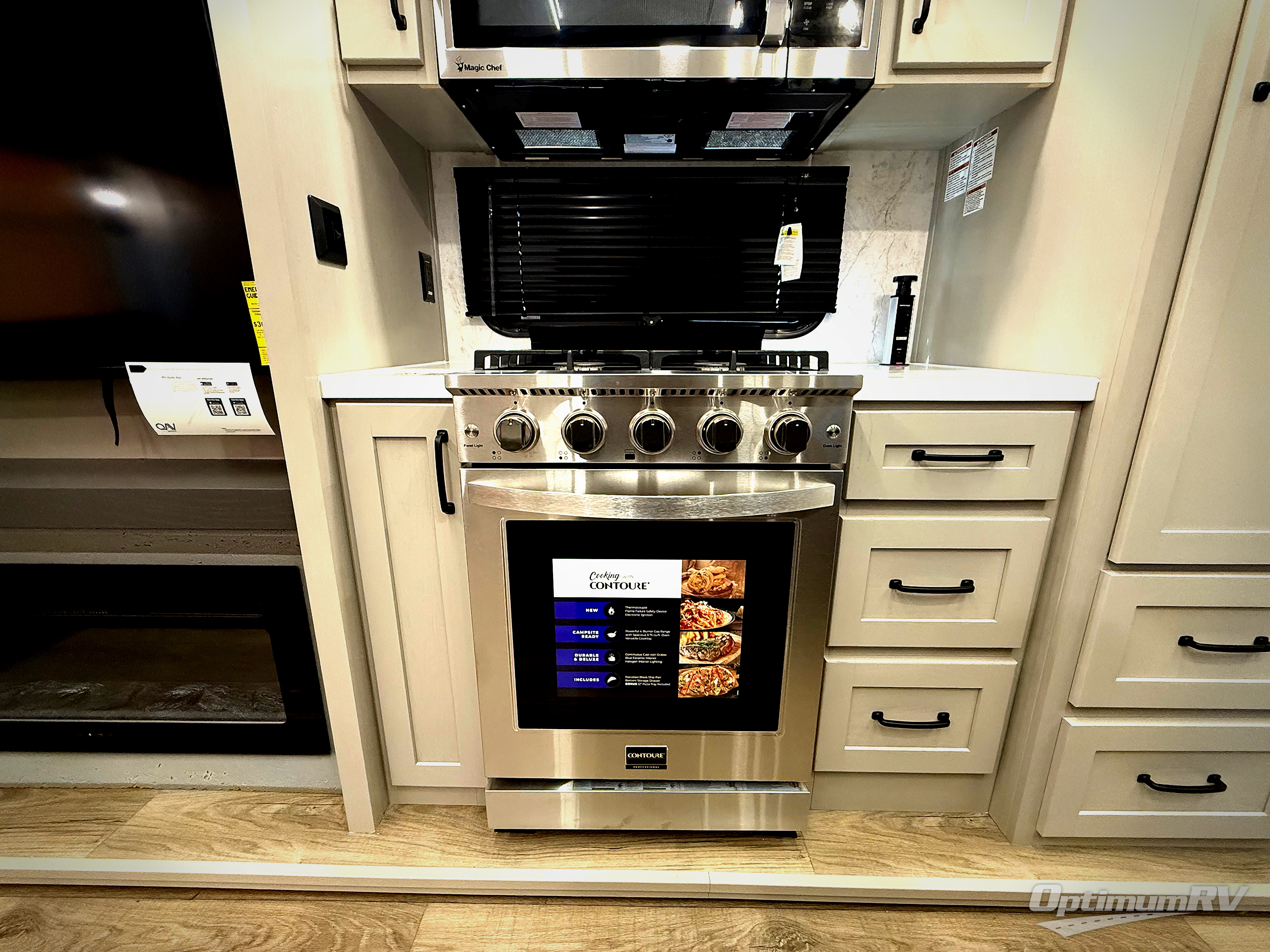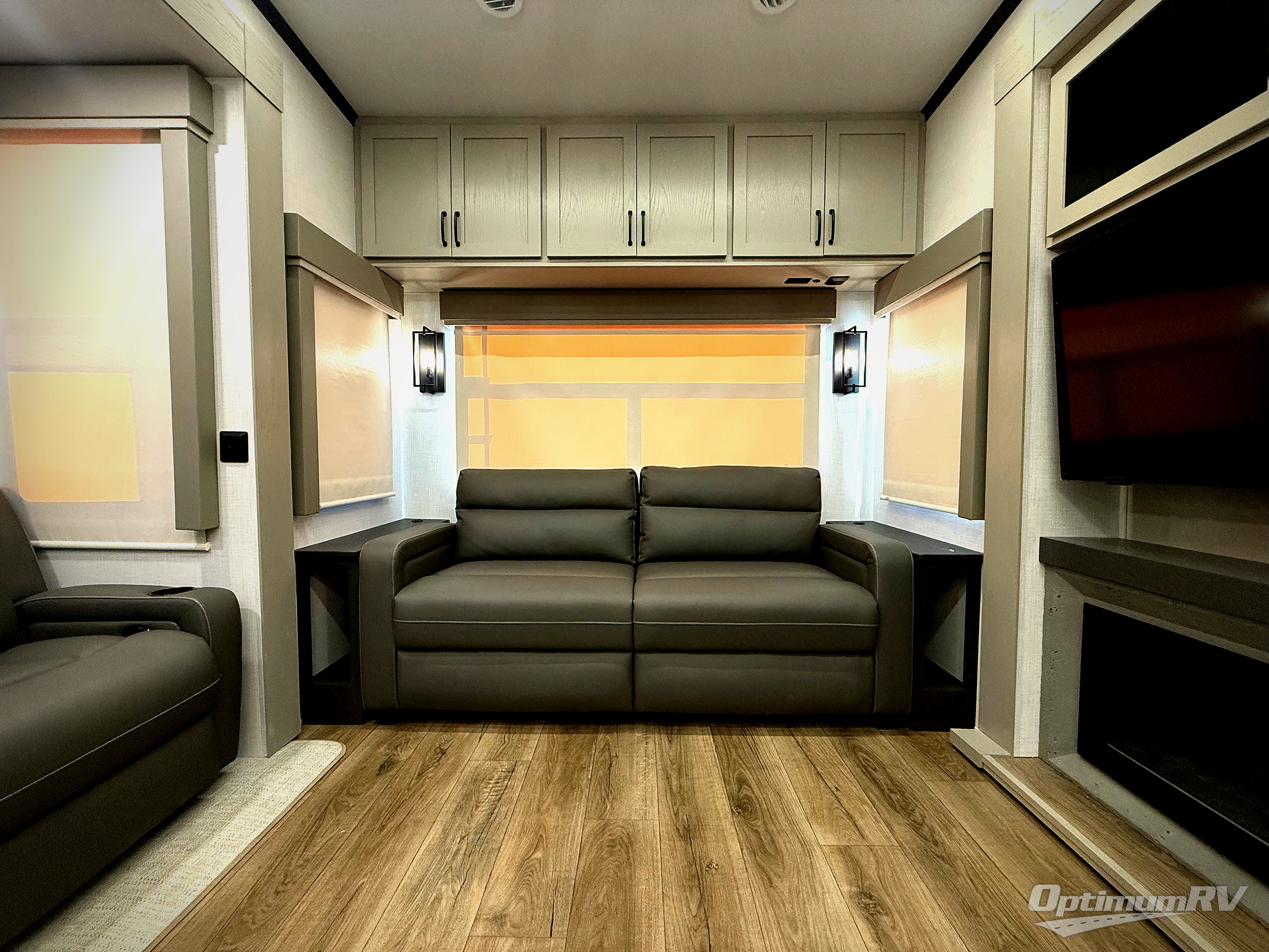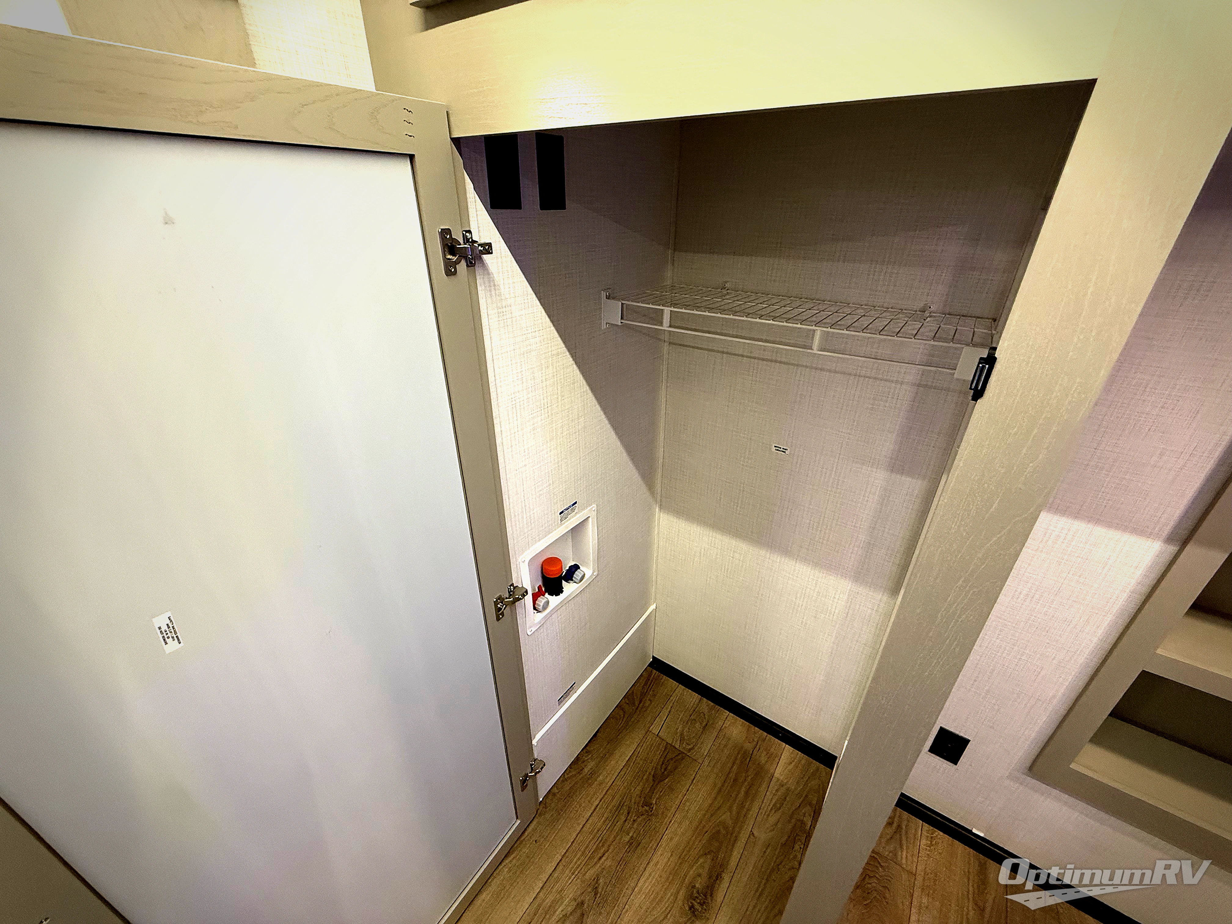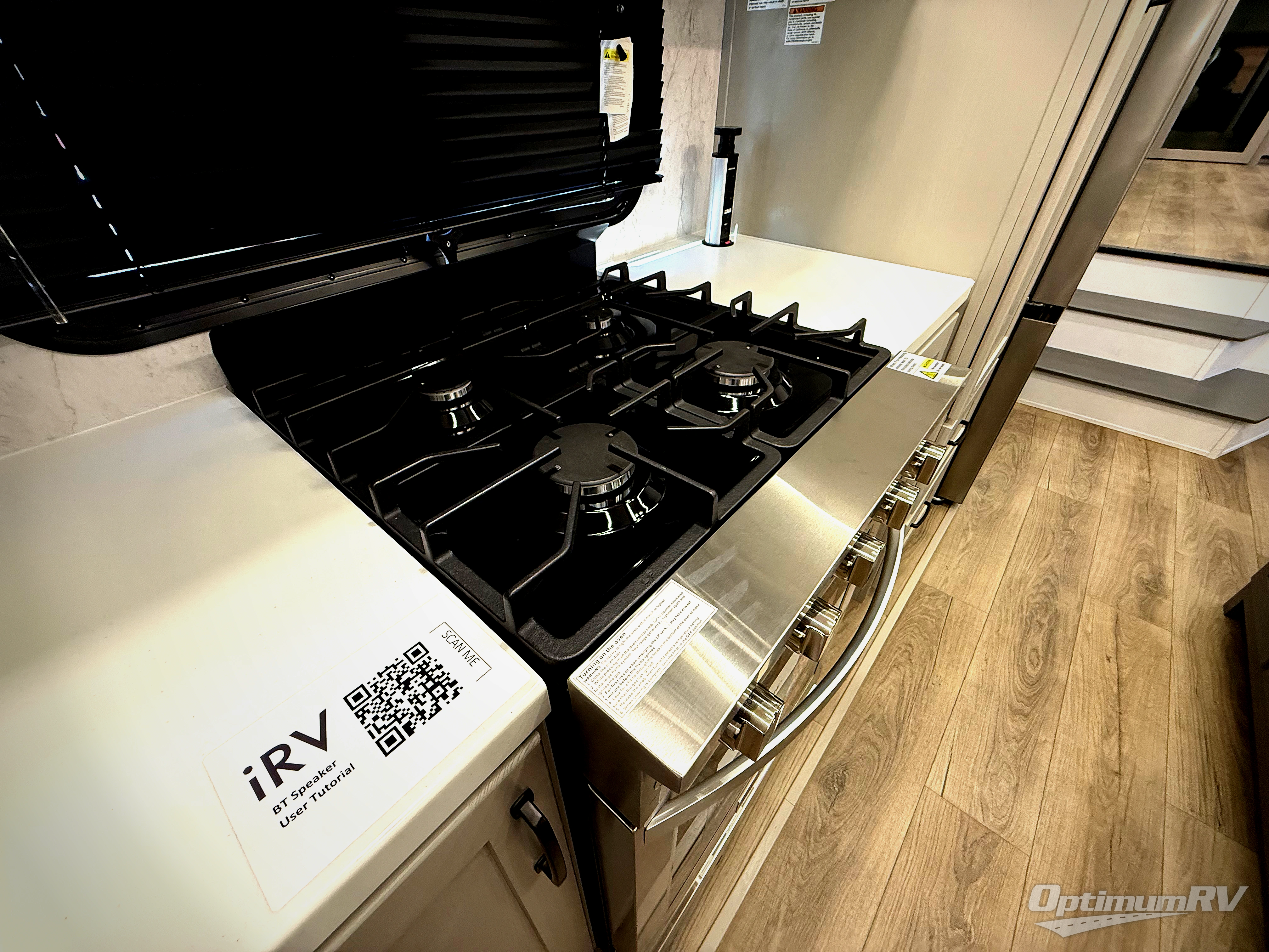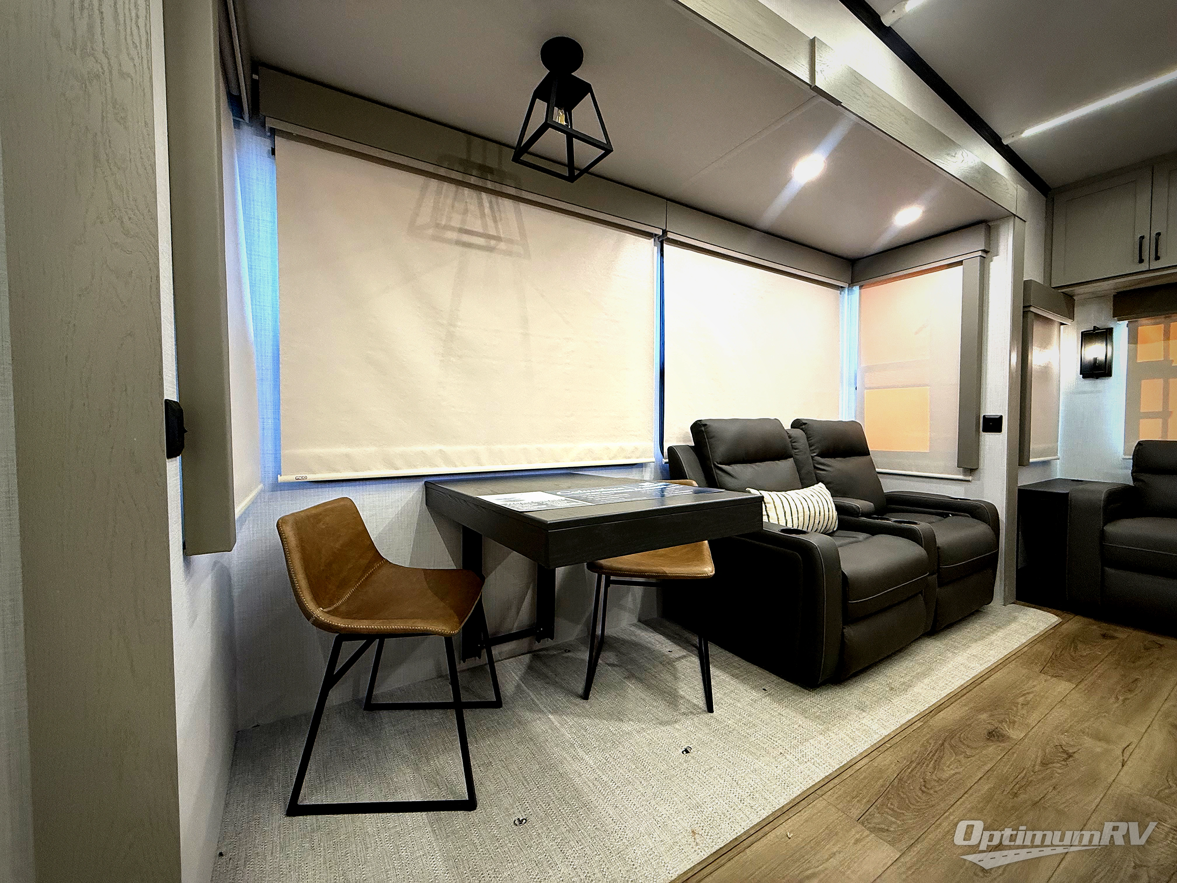 It won't be hard to fall in love with this fifth wheel that can sleep four each night! There are dual opposing slides in the bedroom and in the combined kitchen and living area for maximum space to relax! You will love evenings spent in the rear living area on the theater seat across from the 50" Smart TV, and there is a sofa sleeper to let guests stay over. A four burner gas cooktop and residential style stainless steel microwave will let you cook meals each day, and the table with chairs will be the perfect place to dine together. Head to the full bath that includes a shower with a seat to easily clean up, then head off to bed in the front private bedroom. Here, you'll find a king bed slide out, a bedroom Smart TV, plus a spacious wardrobe with a shelf. There is even washer and dryer prep if you want the option to make full-time RVing easier!