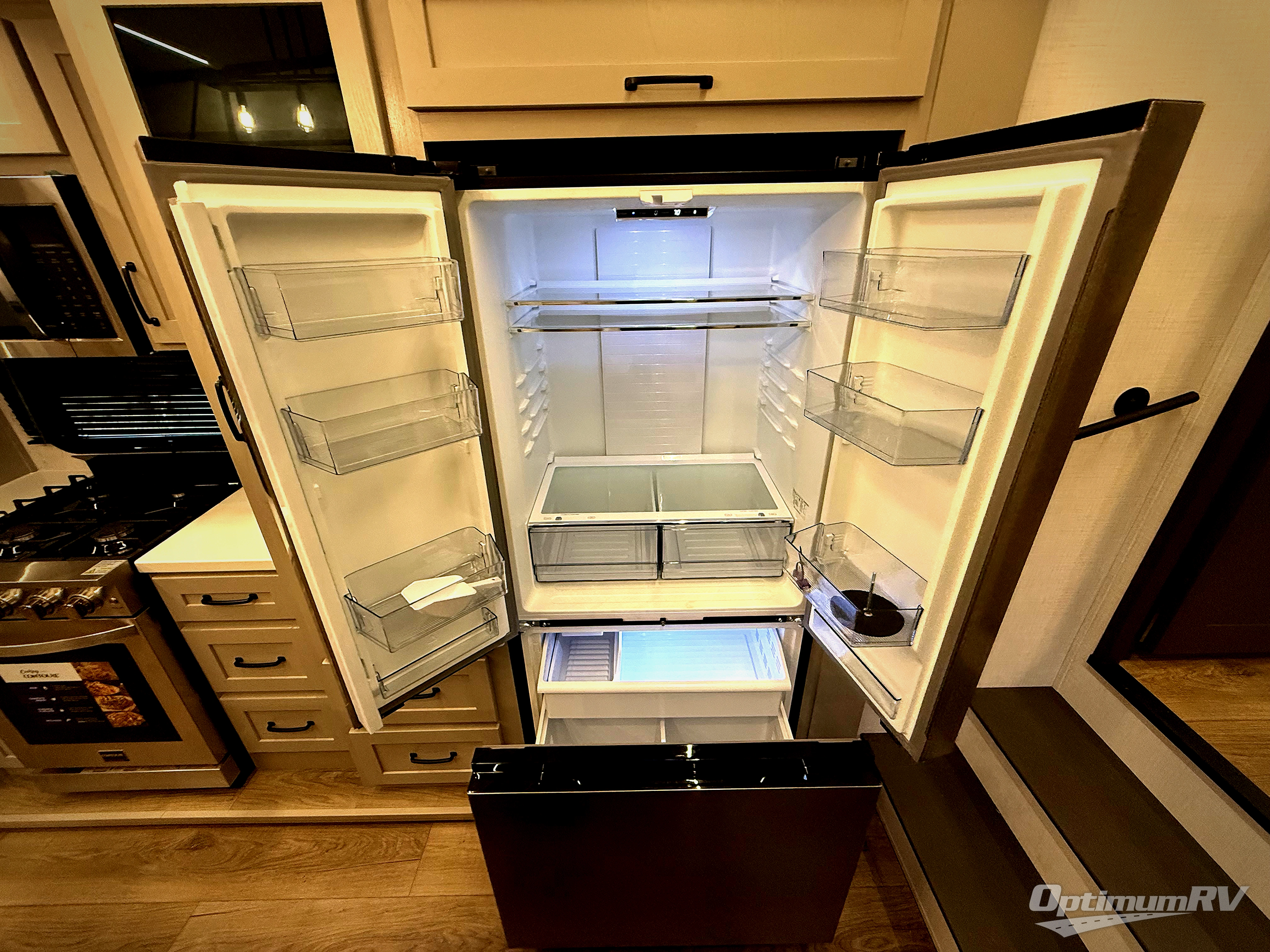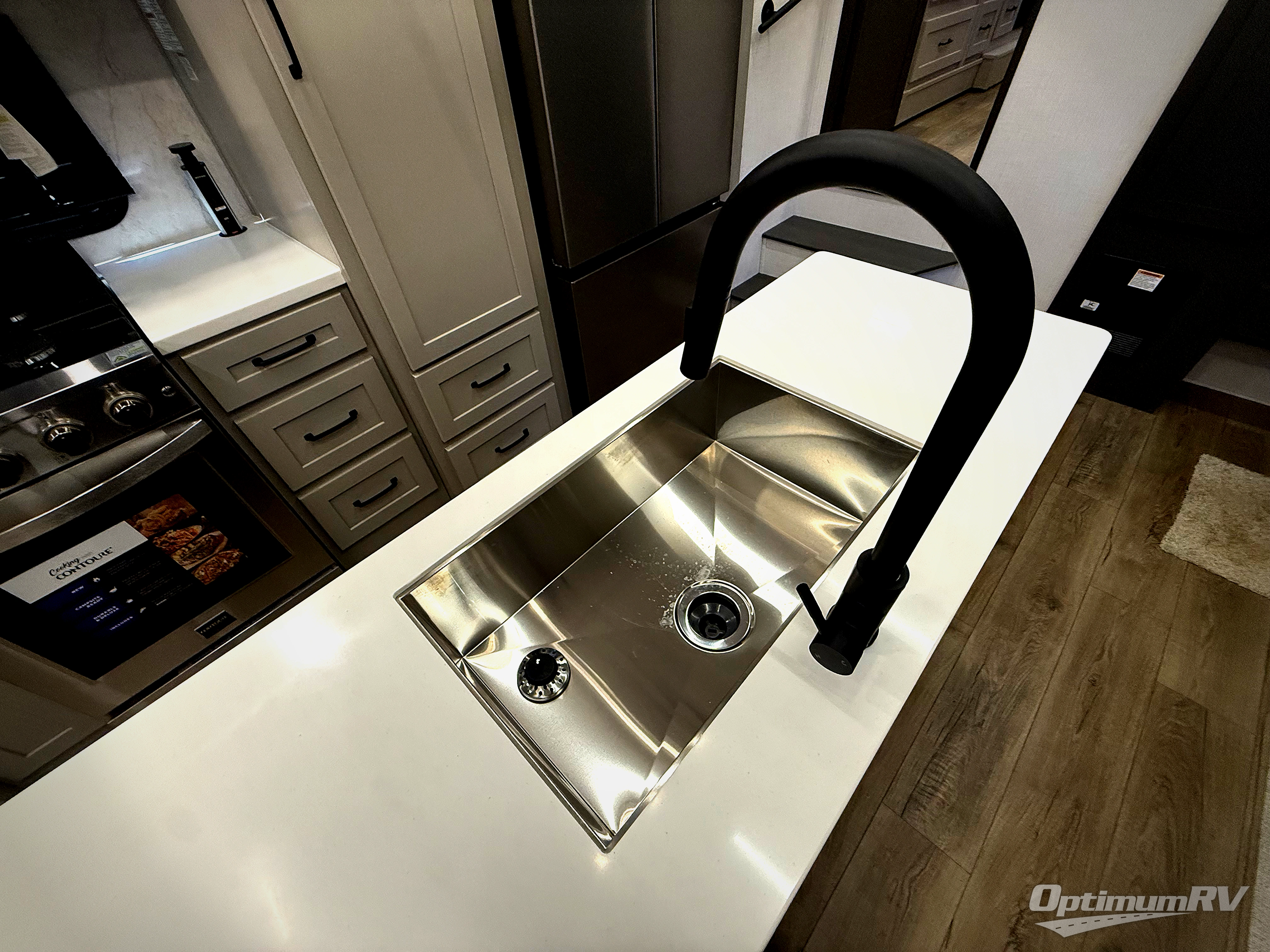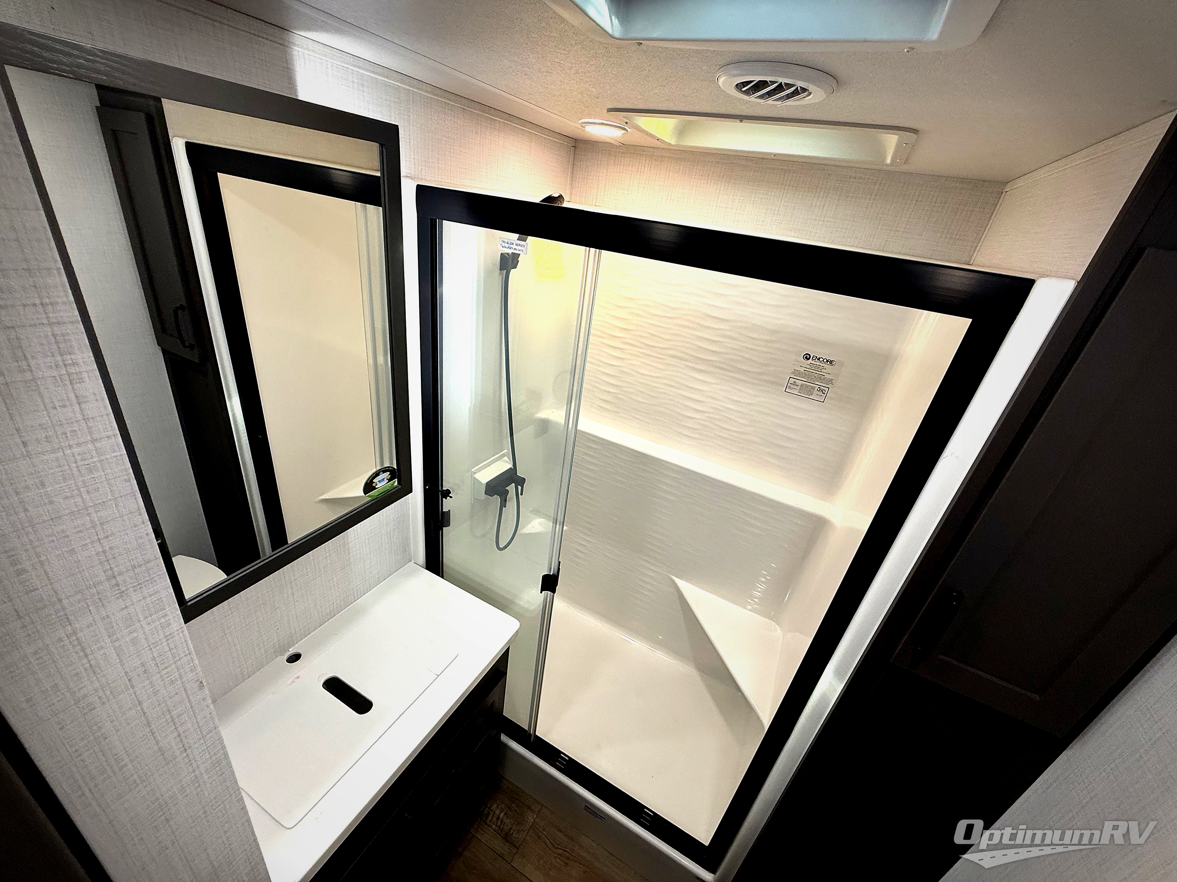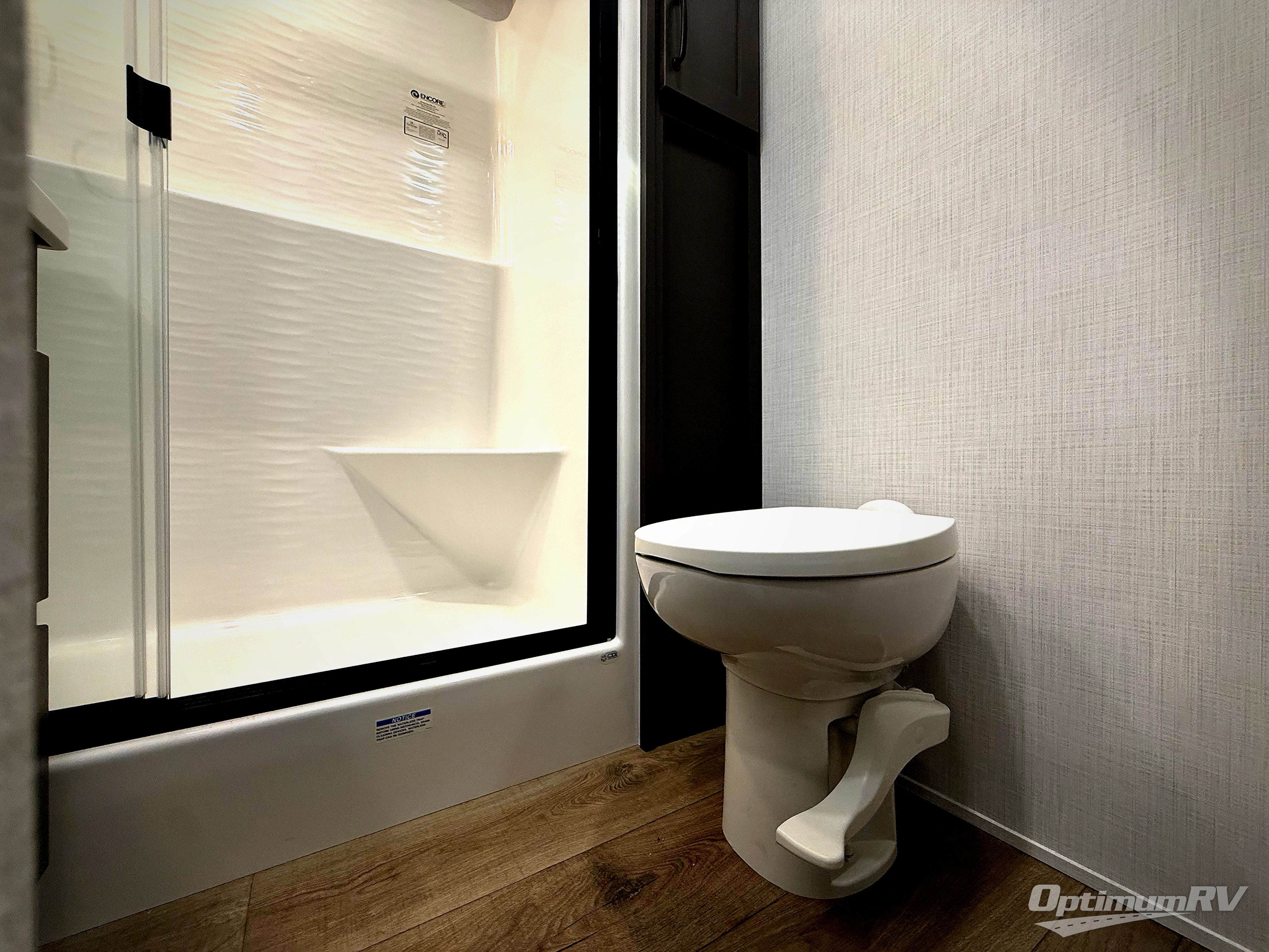 It won't be hard to fall in love with this fifth wheel that can sleep four each night! There are dual opposing slides in the bedroom and in the combined kitchen and living area for maximum space to relax! You will love evenings spent in the rear living area on the theater seat across from the 50" Smart TV, and there is a sofa sleeper to let guests stay over. A four burner gas cooktop and residential style stainless steel microwave will let you cook meals each day, and the table with chairs will be the perfect place to dine together. Head to the full bath that includes a shower with a seat to easily clean up, then head off to bed in the front private bedroom. Here, you'll find a king bed slide out, a bedroom Smart TV, plus a spacious wardrobe with a shelf. There is even washer and dryer prep if you want the option to make full-time RVing easier!