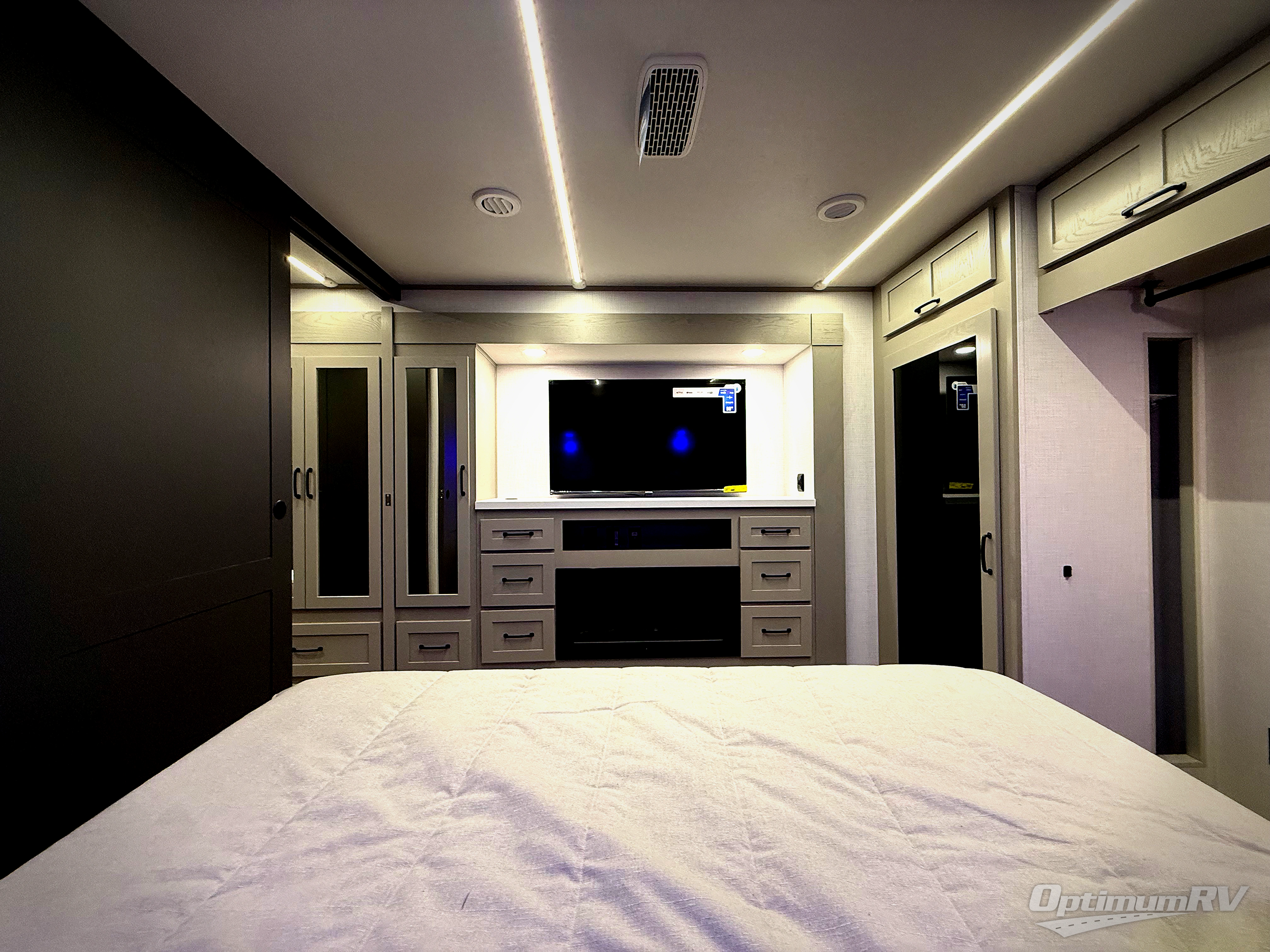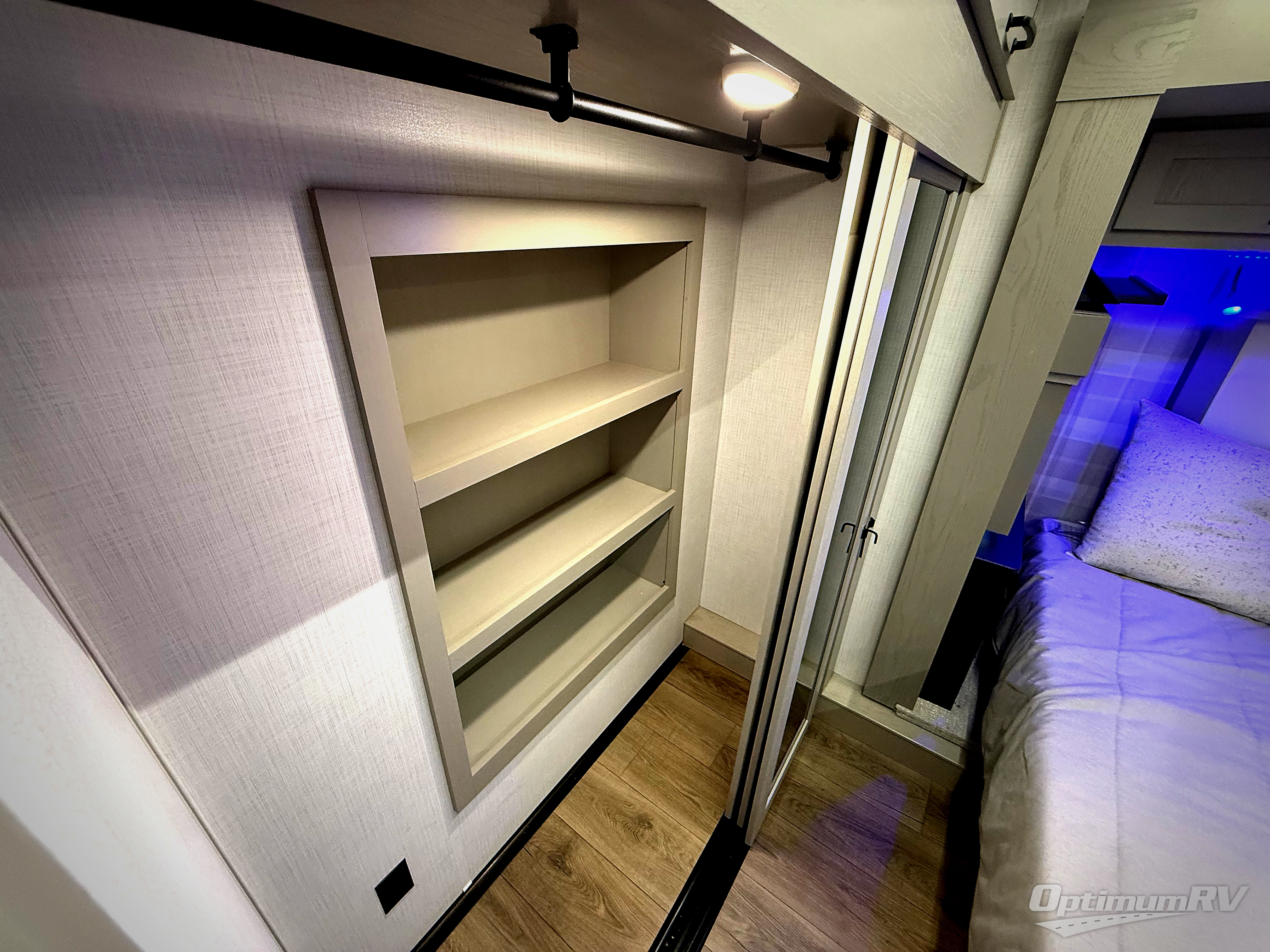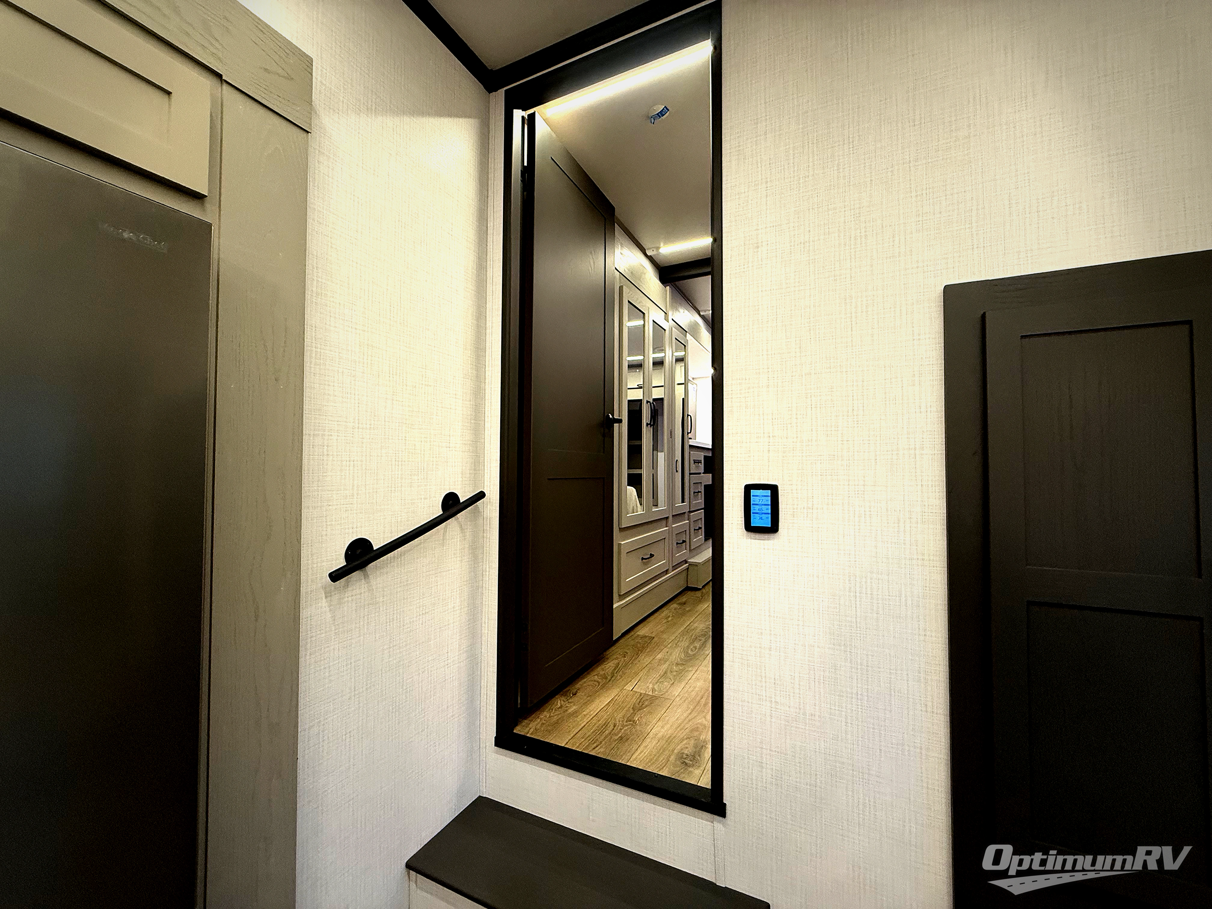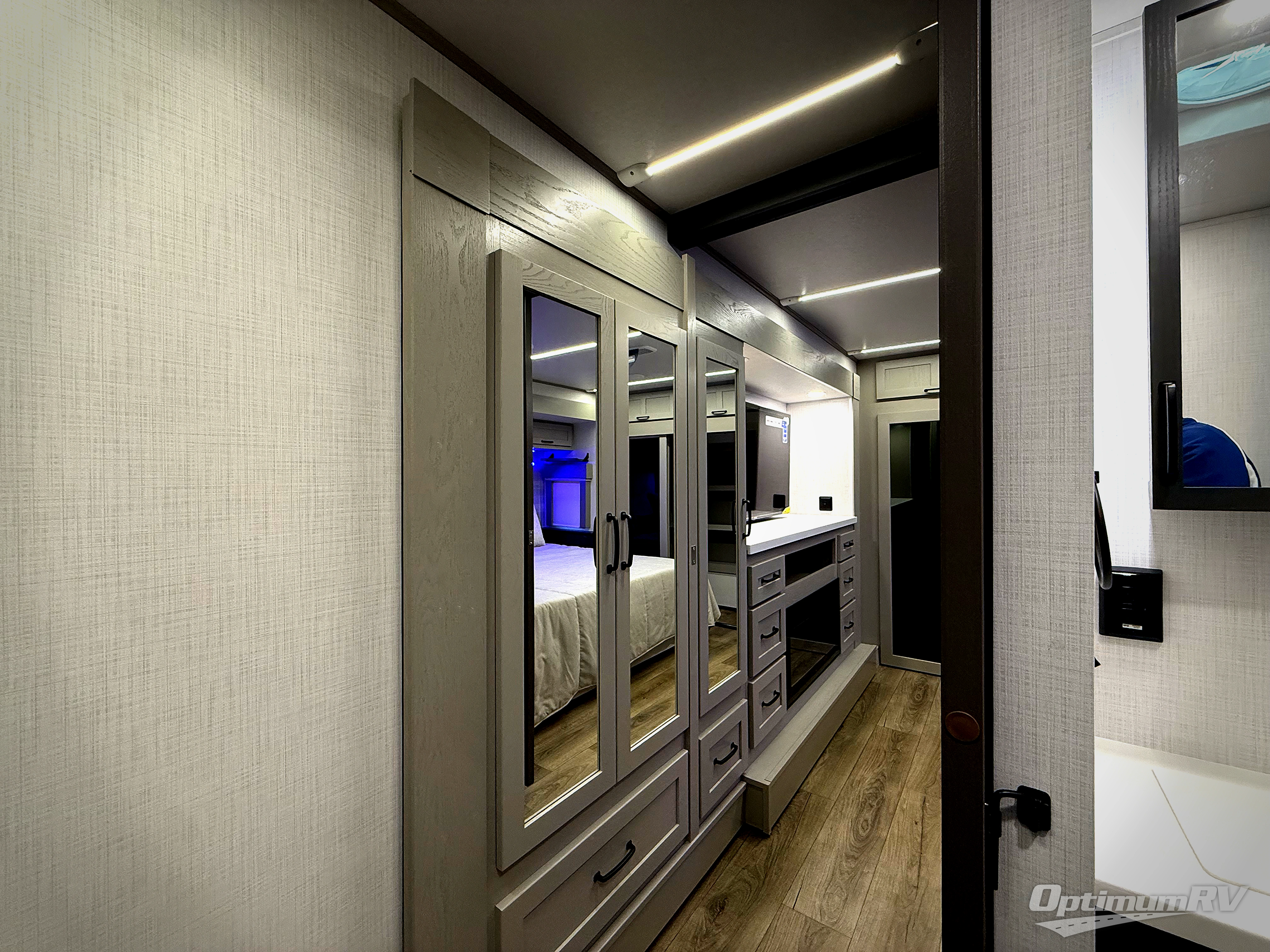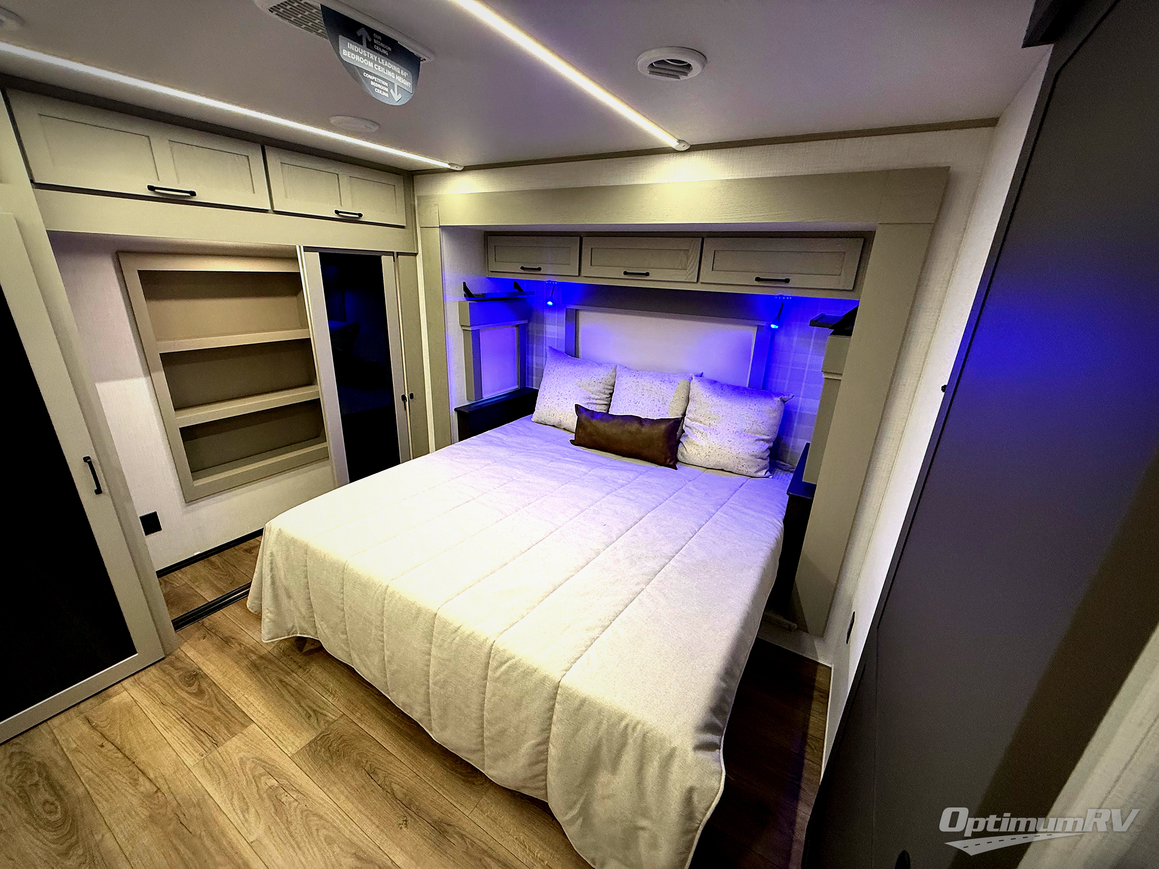It won't be hard to fall in love with this fifth wheel that can sleep four each night! There are dual opposing slides in the bedroom and in the combined kitchen and living area for maximum space to relax! You will love evenings spent in the rear living area on the theater seat across from the 50" Smart TV, and there is a sofa sleeper to let guests stay over. A four burner gas cooktop and residential style stainless steel microwave will let you cook meals each day, and the table with chairs will be the perfect place to dine together. Head to the full bath that includes a shower with a seat to easily clean up, then head off to bed in the front private bedroom. Here, you'll find a king bed slide out, a bedroom Smart TV, plus a spacious wardrobe with a shelf. There is even washer and dryer prep if you want the option to make full-time RVing easier!