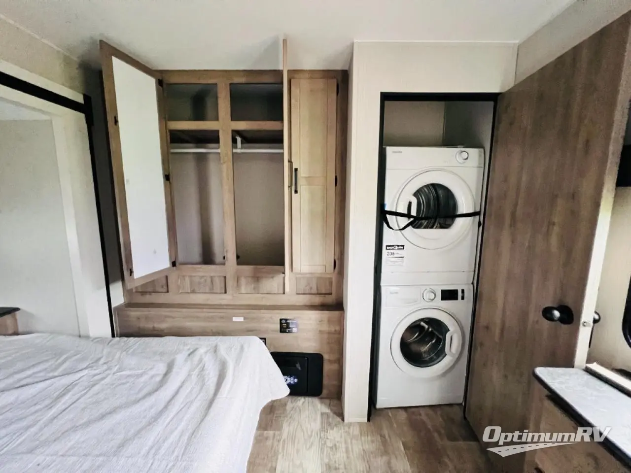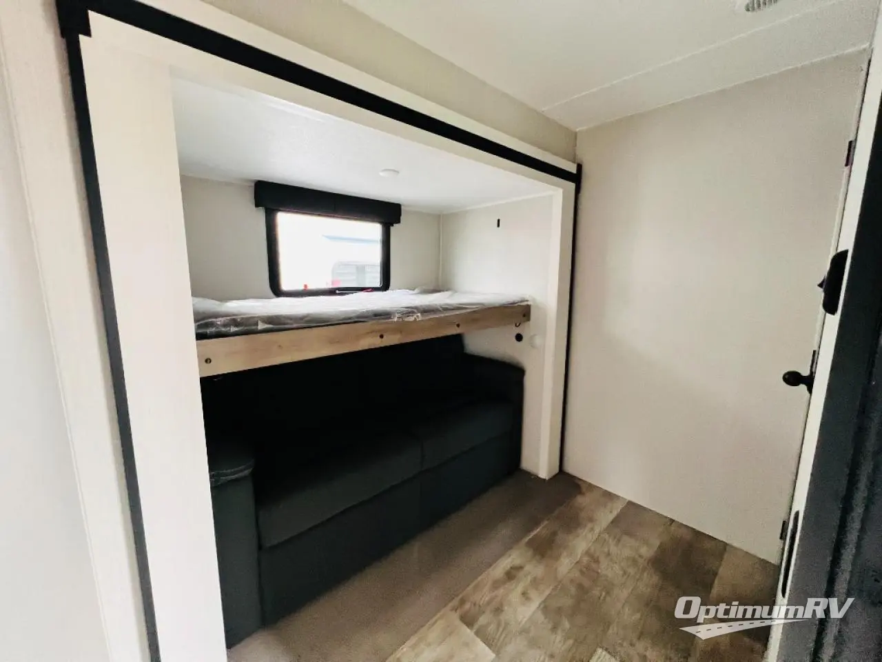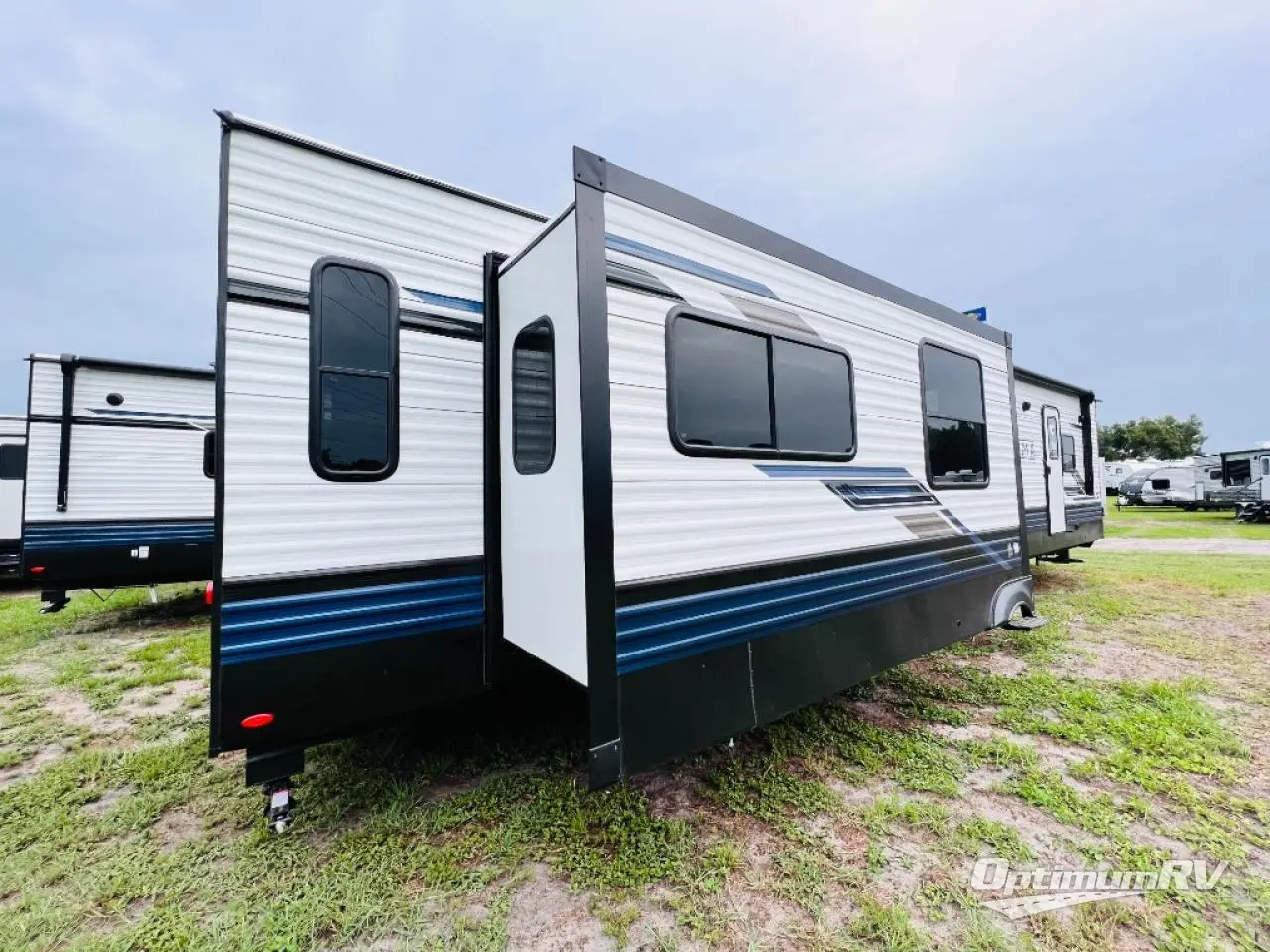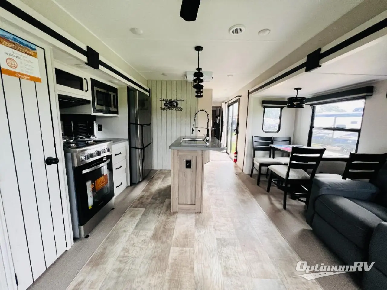 Everyone will want to join you when you head back out to the lake to stay in this trailer! With the middle bunkhouse that includes a bunk above a jiffy sofa and a closet, this can be your kids room or guests headquarters. You will have your own privacy when needed in the front bedroom which includes a queen bed slide and two closets. There is also a dresser and a space within a closet for a washer/dryer option. The full bathroom is conveniently located between the two rooms, and the rear of the destination trailer offers a combined living and kitchen area. The dual slides give you lots of floor space around the kitchen island to relax on the booth dinette or sofa, and the cook will have full kitchen amenities including a residential style refrigerator.