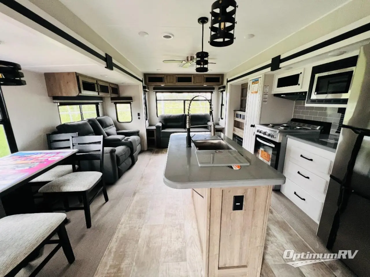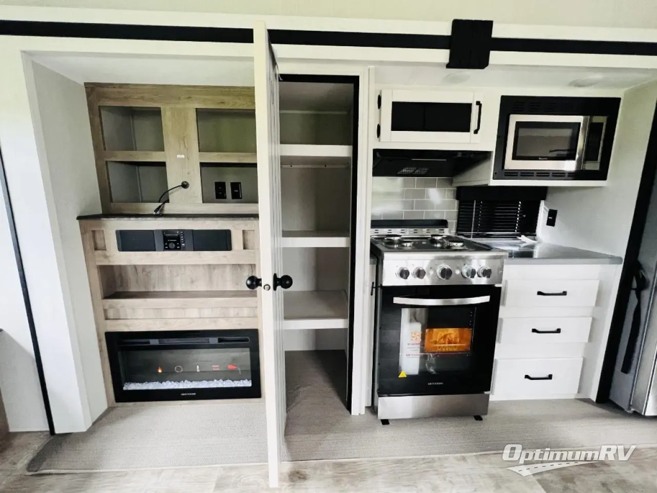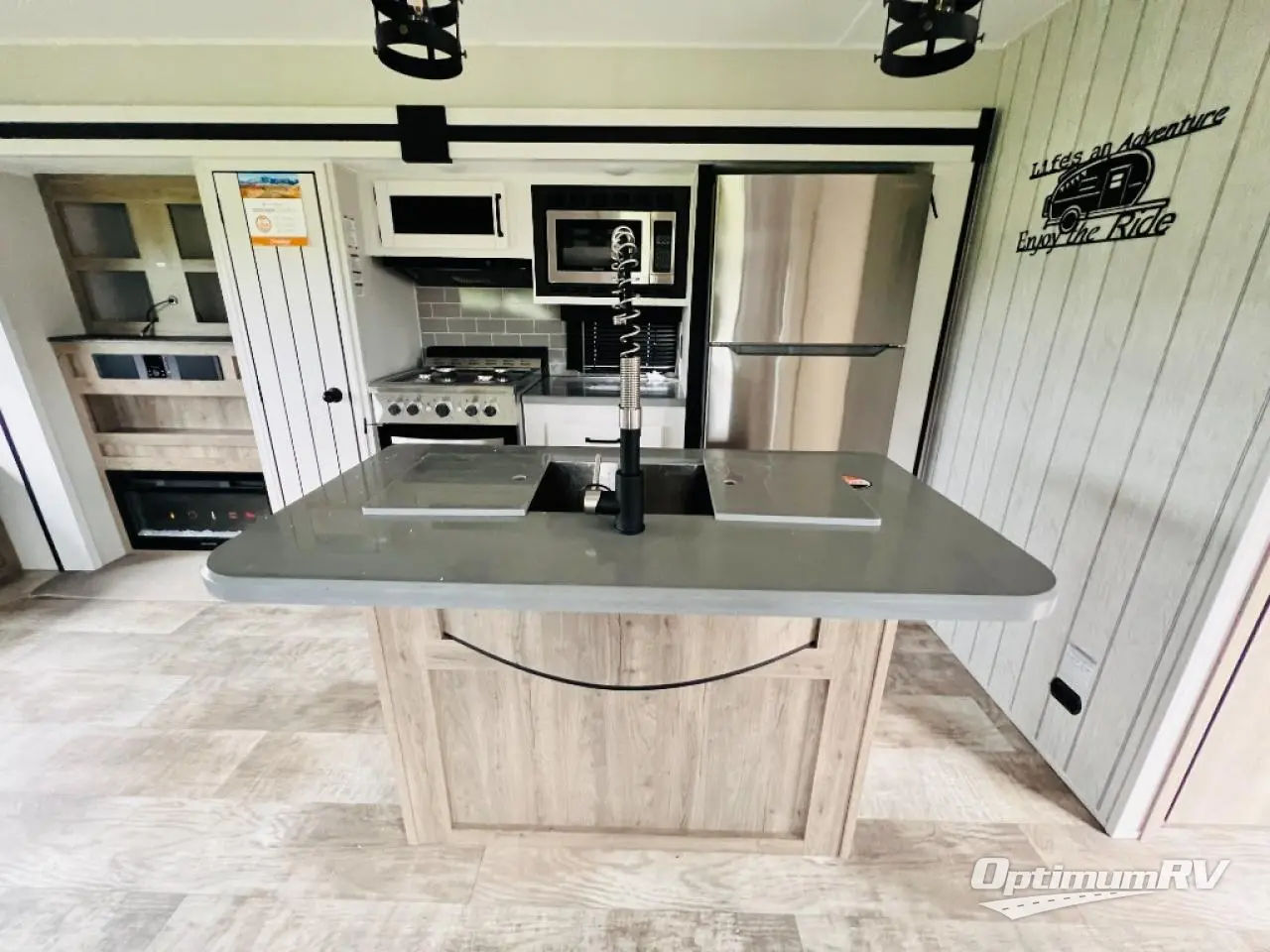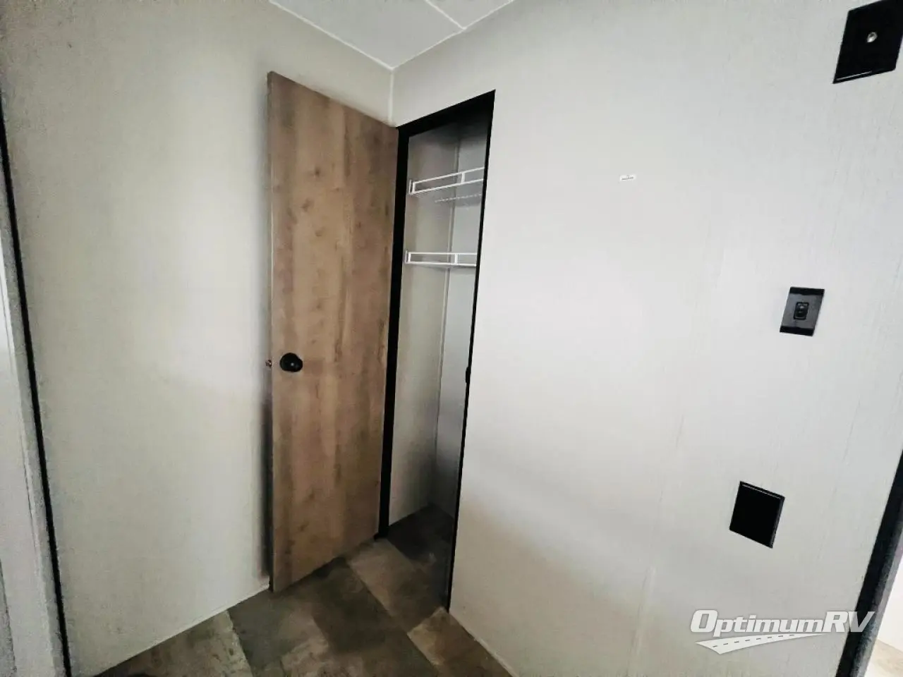 Everyone will want to join you when you head back out to the lake to stay in this trailer! With the middle bunkhouse that includes a bunk above a jiffy sofa and a closet, this can be your kids room or guests headquarters. You will have your own privacy when needed in the front bedroom which includes a queen bed slide and two closets. There is also a dresser and a space within a closet for a washer/dryer option. The full bathroom is conveniently located between the two rooms, and the rear of the destination trailer offers a combined living and kitchen area. The dual slides give you lots of floor space around the kitchen island to relax on the booth dinette or sofa, and the cook will have full kitchen amenities including a residential style refrigerator.