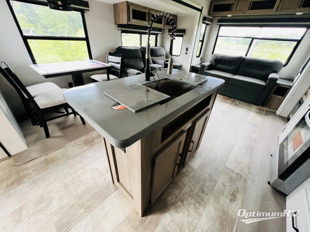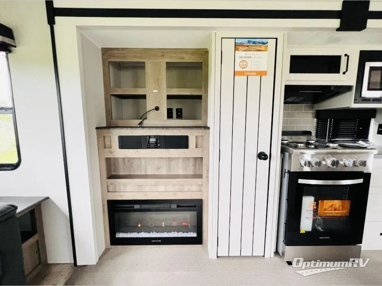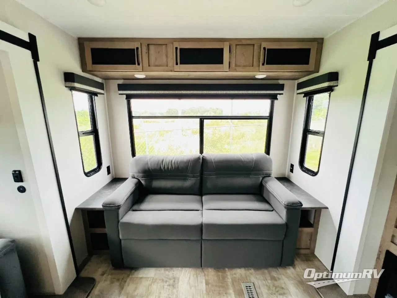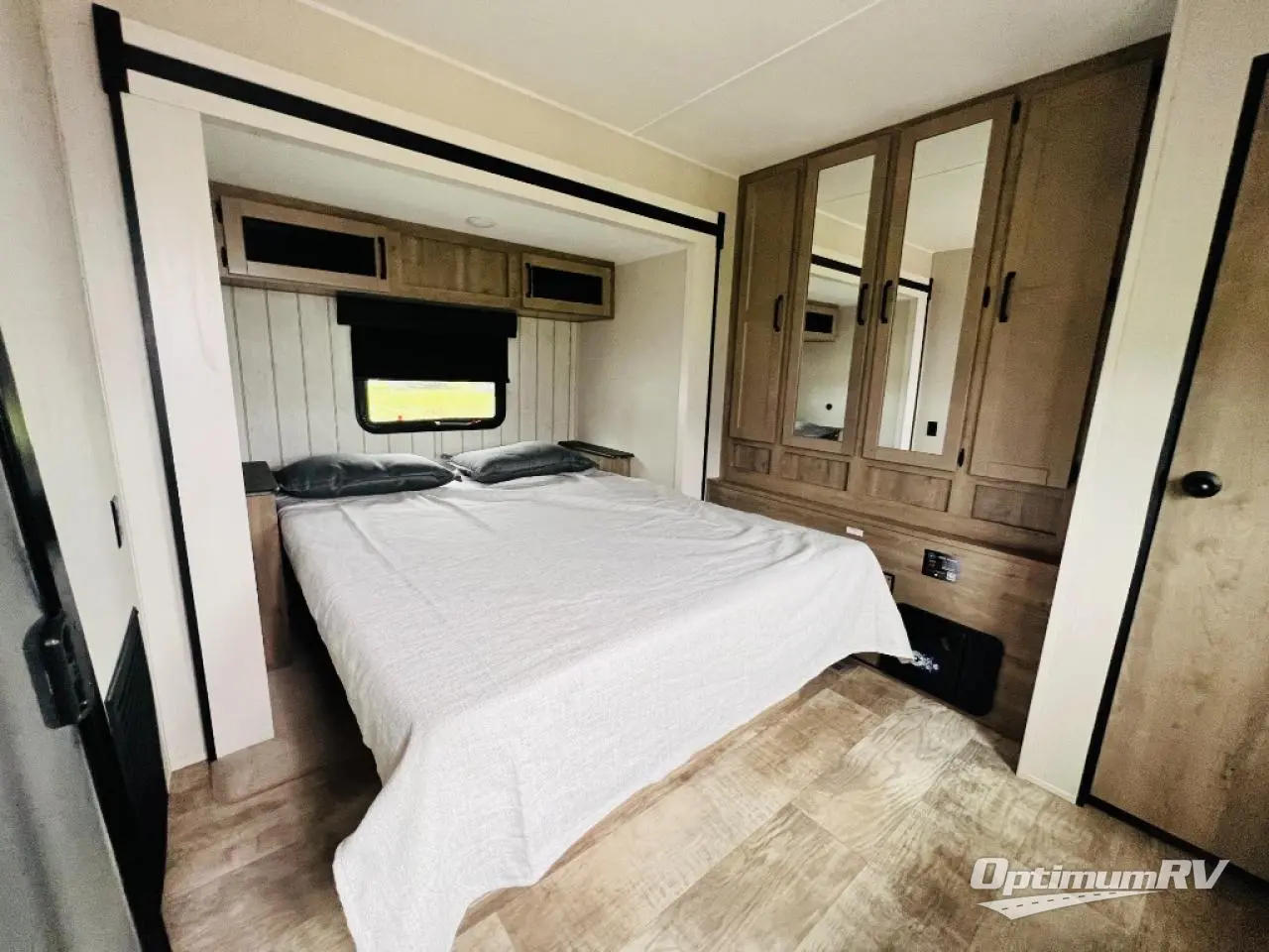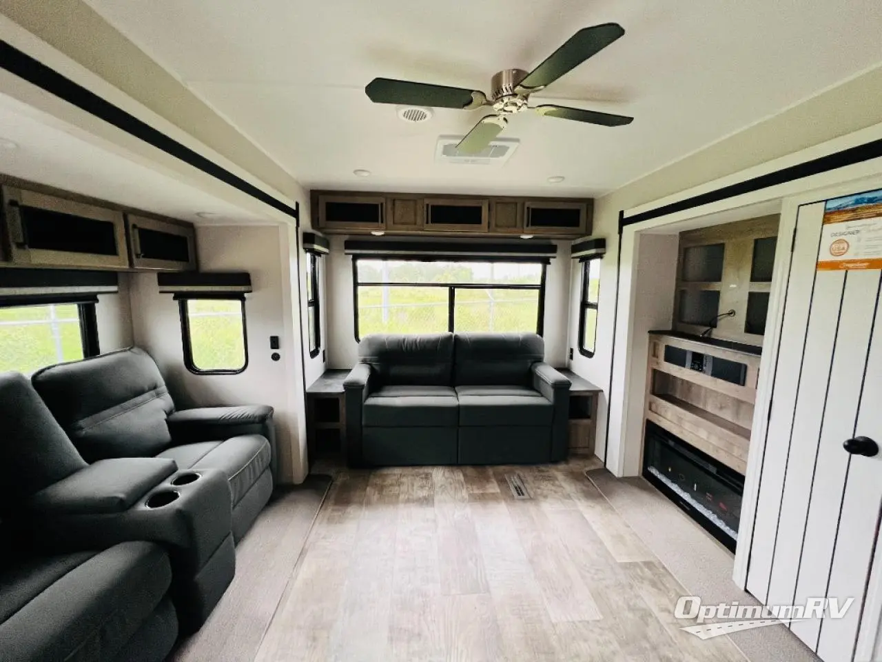Everyone will want to join you when you head back out to the lake to stay in this trailer! With the middle bunkhouse that includes a bunk above a jiffy sofa and a closet, this can be your kids room or guests headquarters. You will have your own privacy when needed in the front bedroom which includes a queen bed slide and two closets. There is also a dresser and a space within a closet for a washer/dryer option. The full bathroom is conveniently located between the two rooms, and the rear of the destination trailer offers a combined living and kitchen area. The dual slides give you lots of floor space around the kitchen island to relax on the booth dinette or sofa, and the cook will have full kitchen amenities including a residential style refrigerator.