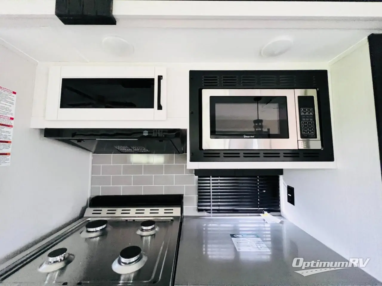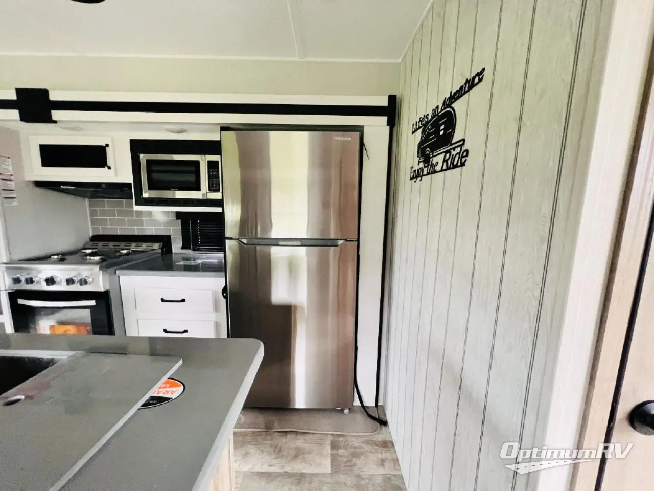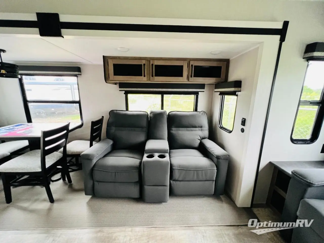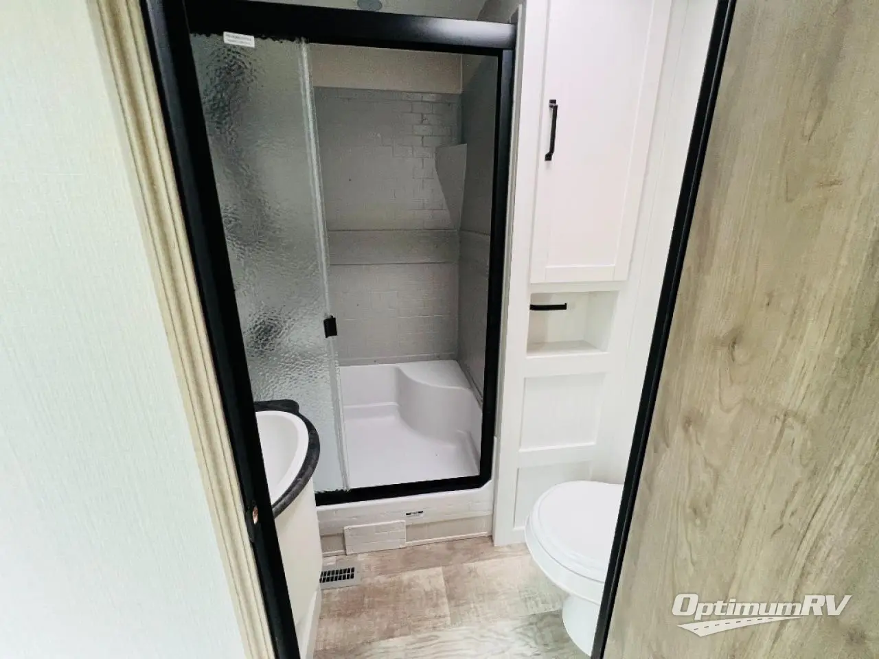 Everyone will want to join you when you head back out to the lake to stay in this trailer! With the middle bunkhouse that includes a bunk above a jiffy sofa and a closet, this can be your kids room or guests headquarters. You will have your own privacy when needed in the front bedroom which includes a queen bed slide and two closets. There is also a dresser and a space within a closet for a washer/dryer option. The full bathroom is conveniently located between the two rooms, and the rear of the destination trailer offers a combined living and kitchen area. The dual slides give you lots of floor space around the kitchen island to relax on the booth dinette or sofa, and the cook will have full kitchen amenities including a residential style refrigerator.
