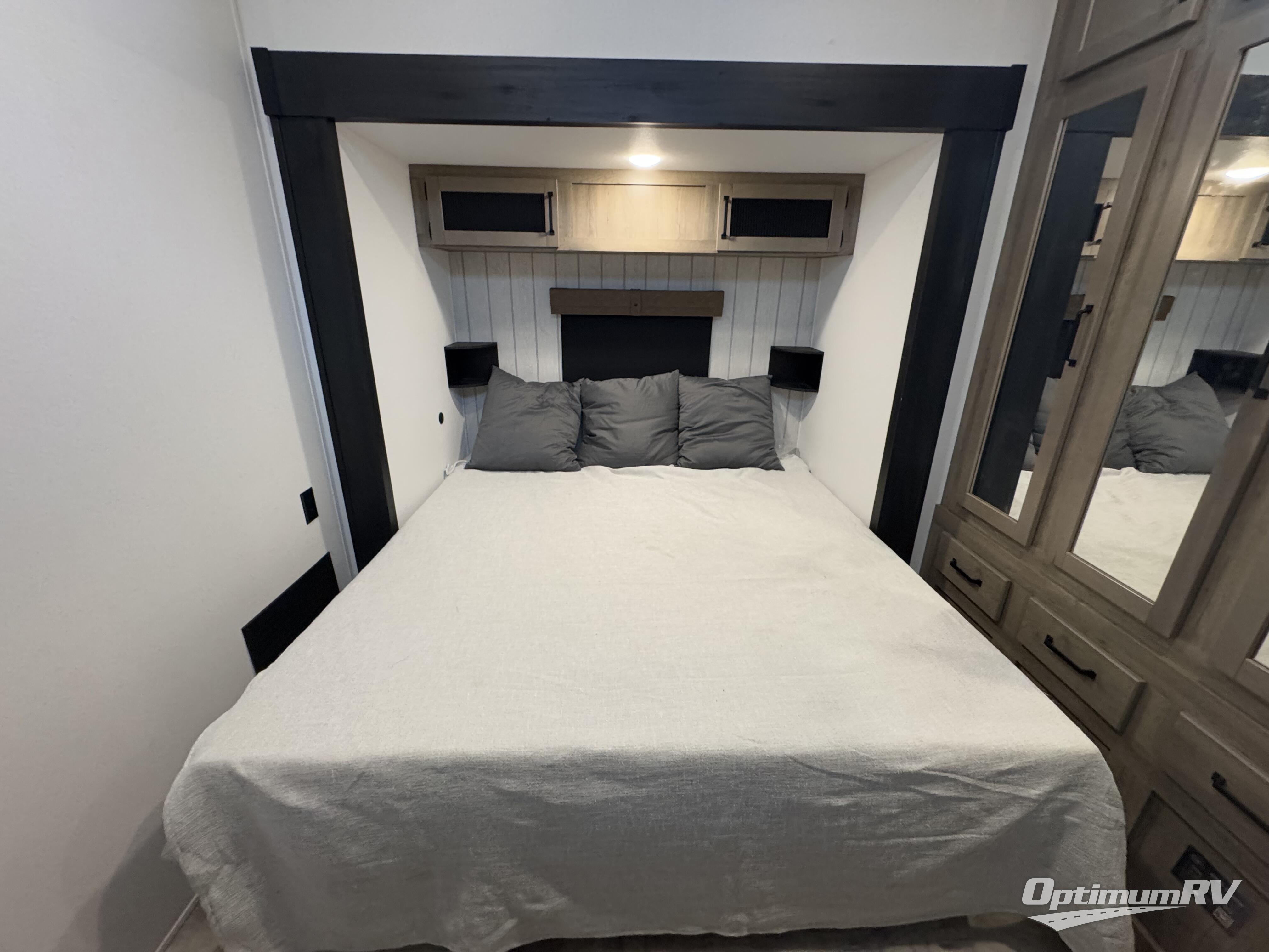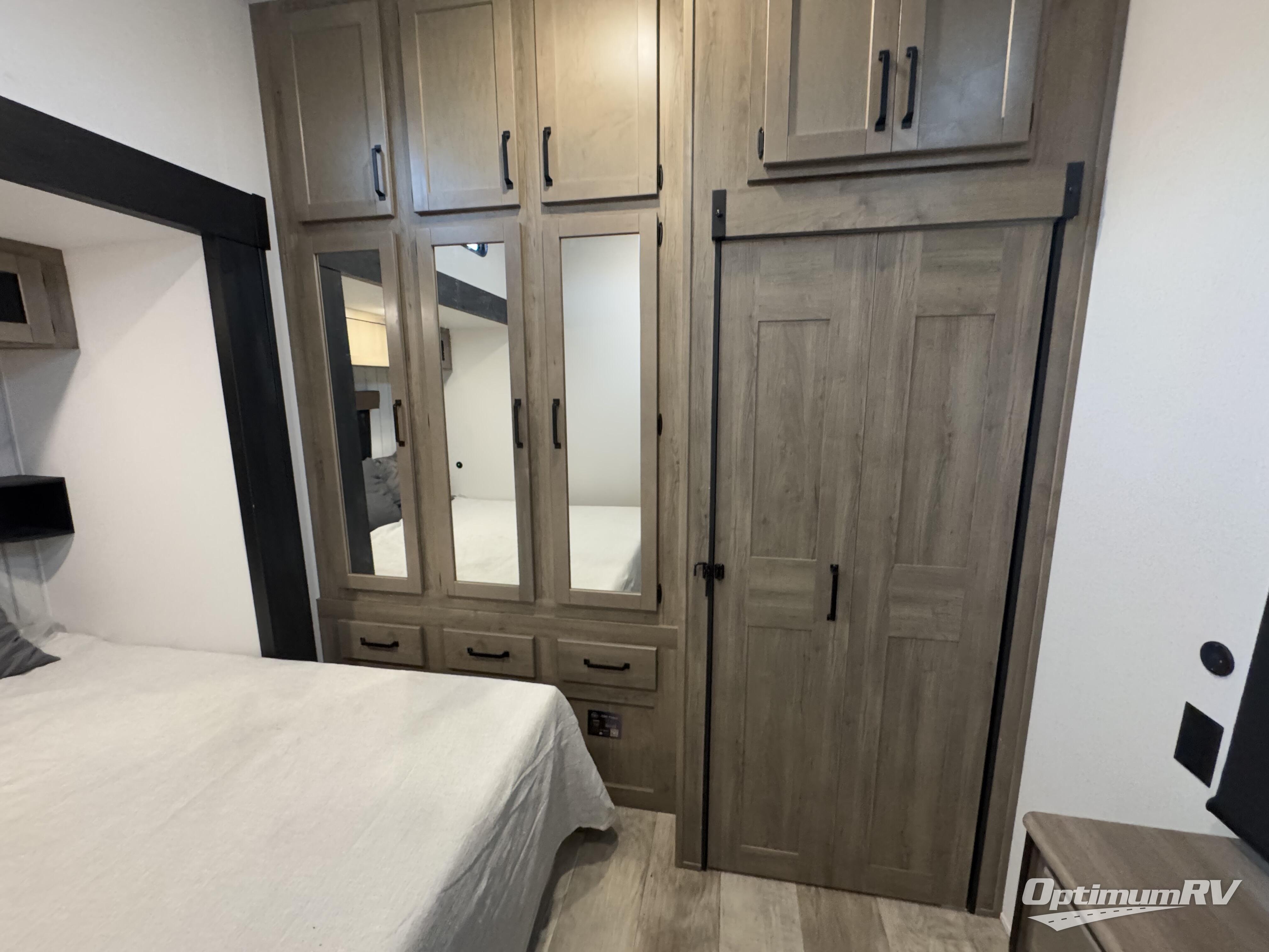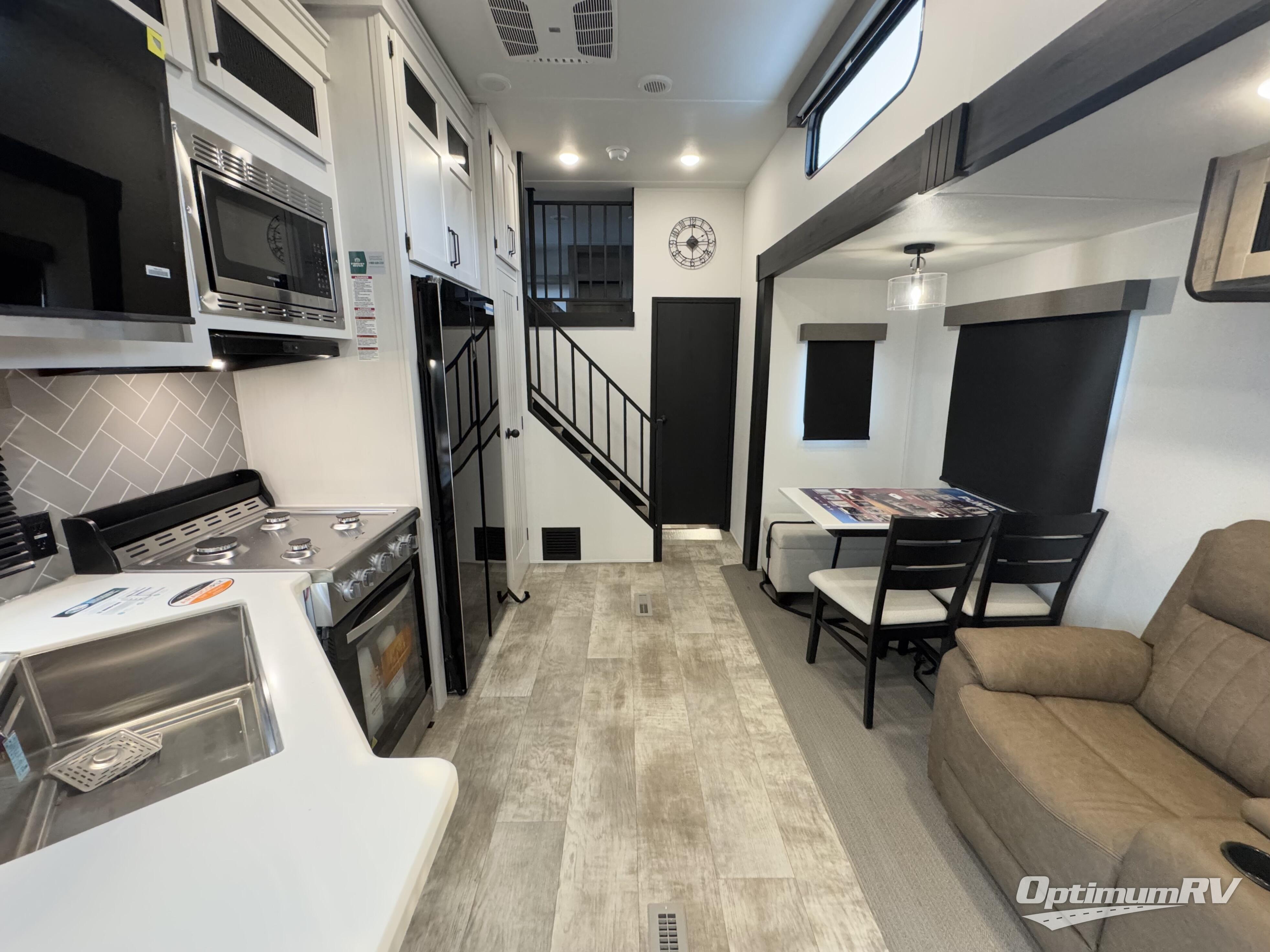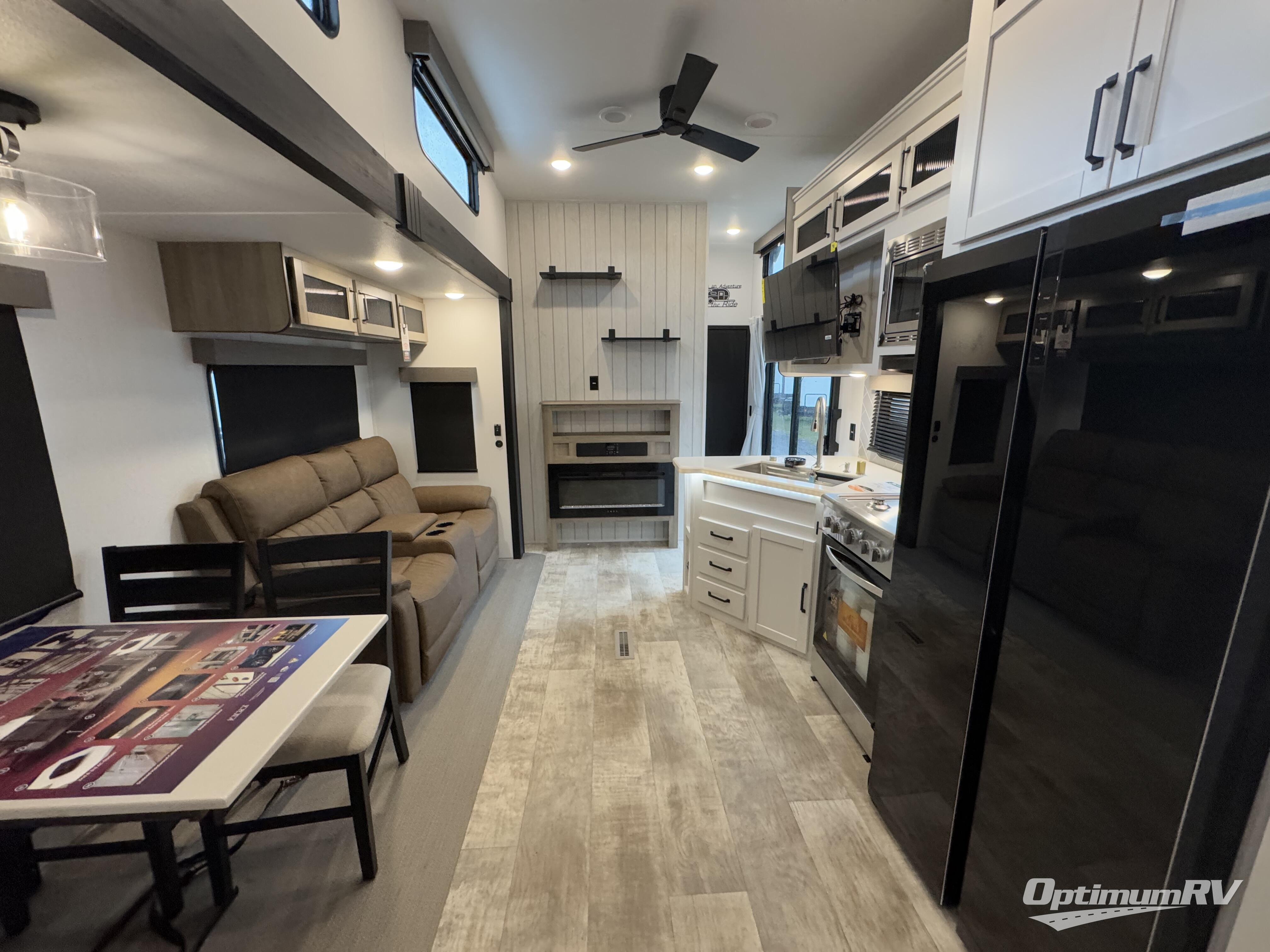 If you're planning to camp with a larger group or your family, this destination trailer will provide everything you're looking for! Your guests can take the rear bunkhouse suite that includes a slide out with a jiffy sofa and bunk bed, an entertainment center, and a full bath. You'll also find one of the dual entry doors here for added convenience. There are steps just outside the bunkhouse that lead to the loft with two bunk mats and storage space to keep this space tidy! The front private bedroom will be perfect for you with its king bed slide out, wardrobe/closet, and bedroom desk if you're needing to work from home. There is even a closet with the option to add washer and dryer prep. In the morning, everyone can meet in the combined middle living area and kitchen. A large slide out here houses the free-standing table and sofa, and the fireplace is close by to make it feel a little more like home!