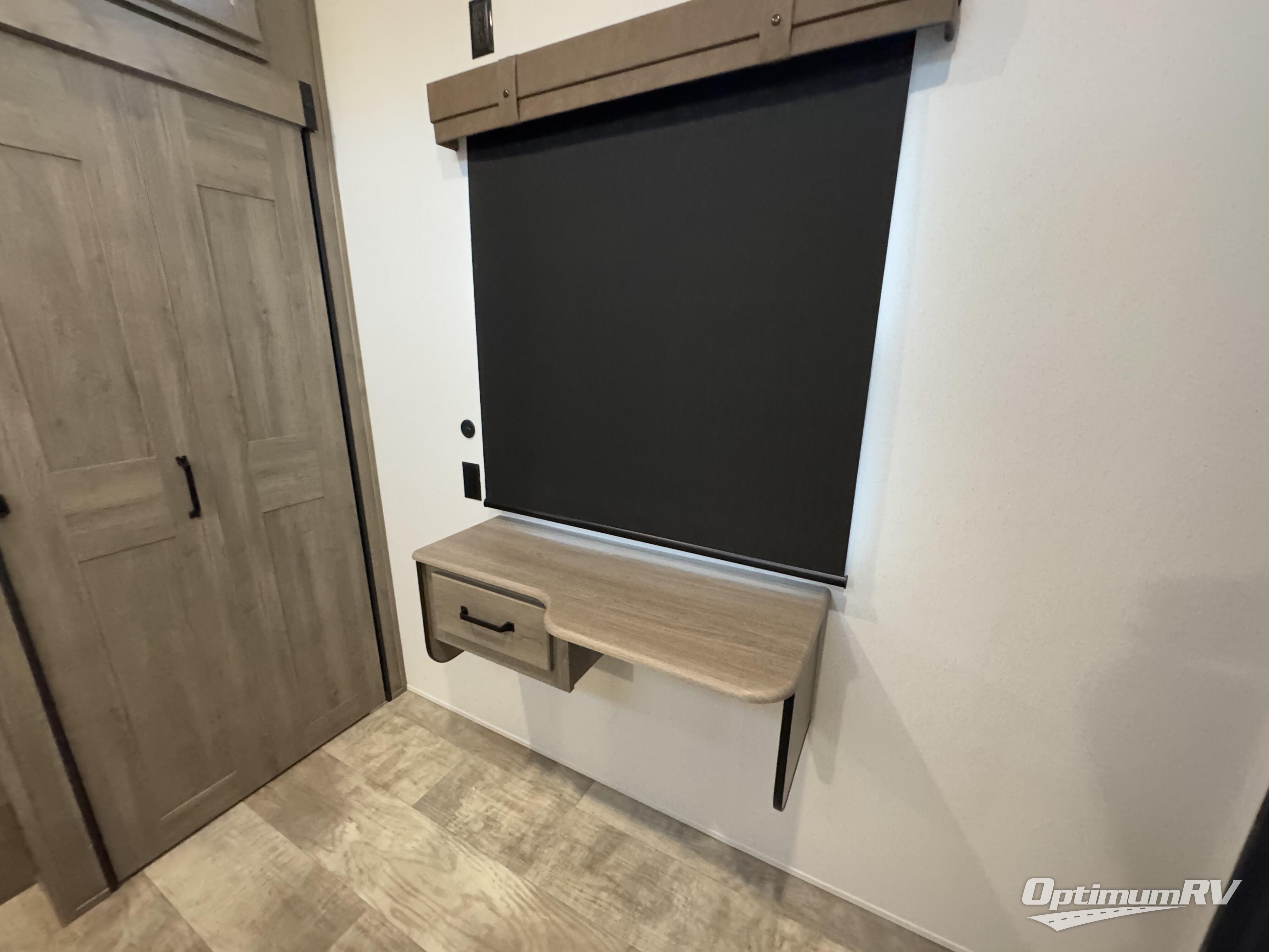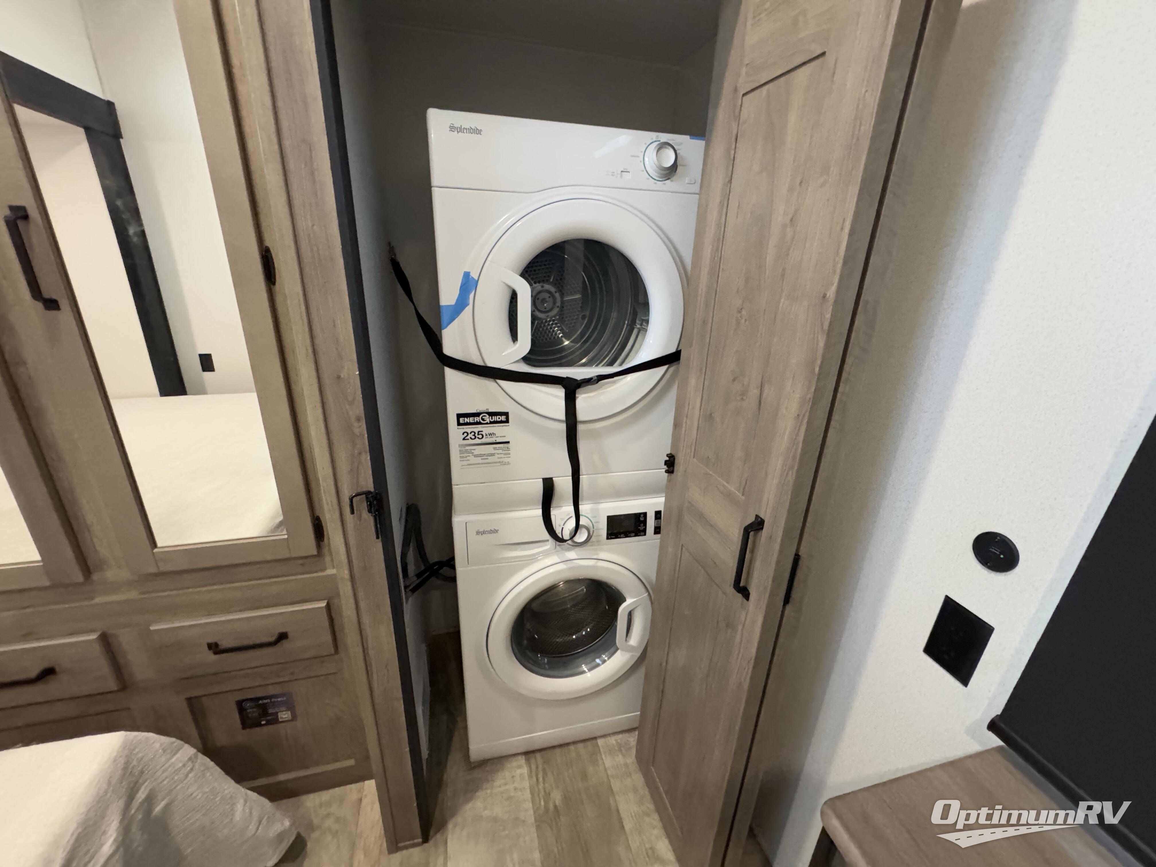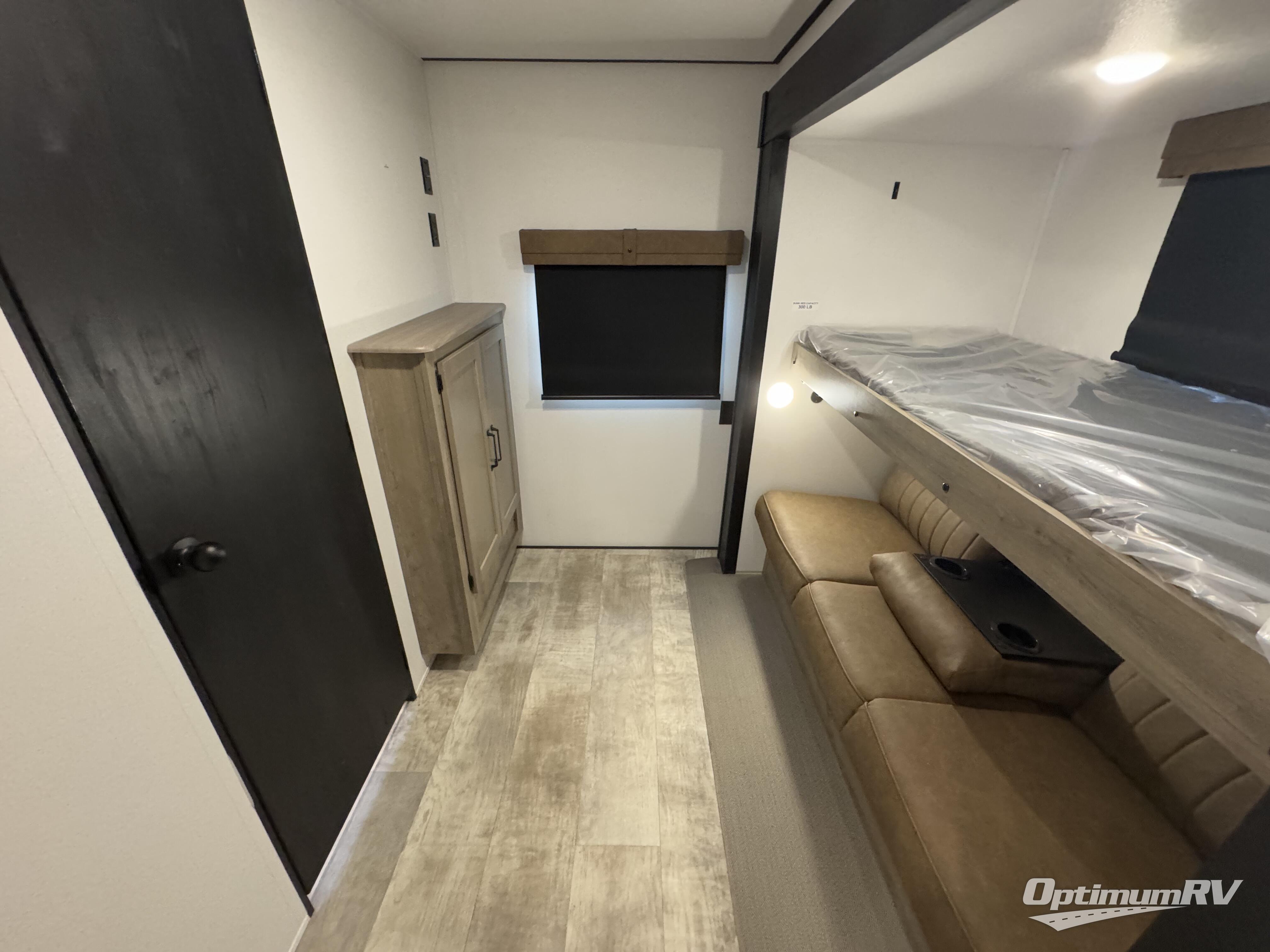 If you're planning to camp with a larger group or your family, this destination trailer will provide everything you're looking for! Your guests can take the rear bunkhouse suite that includes a slide out with a jiffy sofa and bunk bed, an entertainment center, and a full bath. You'll also find one of the dual entry doors here for added convenience. There are steps just outside the bunkhouse that lead to the loft with two bunk mats and storage space to keep this space tidy! The front private bedroom will be perfect for you with its king bed slide out, wardrobe/closet, and bedroom desk if you're needing to work from home. There is even a closet with the option to add washer and dryer prep. In the morning, everyone can meet in the combined middle living area and kitchen. A large slide out here houses the free-standing table and sofa, and the fireplace is close by to make it feel a little more like home!