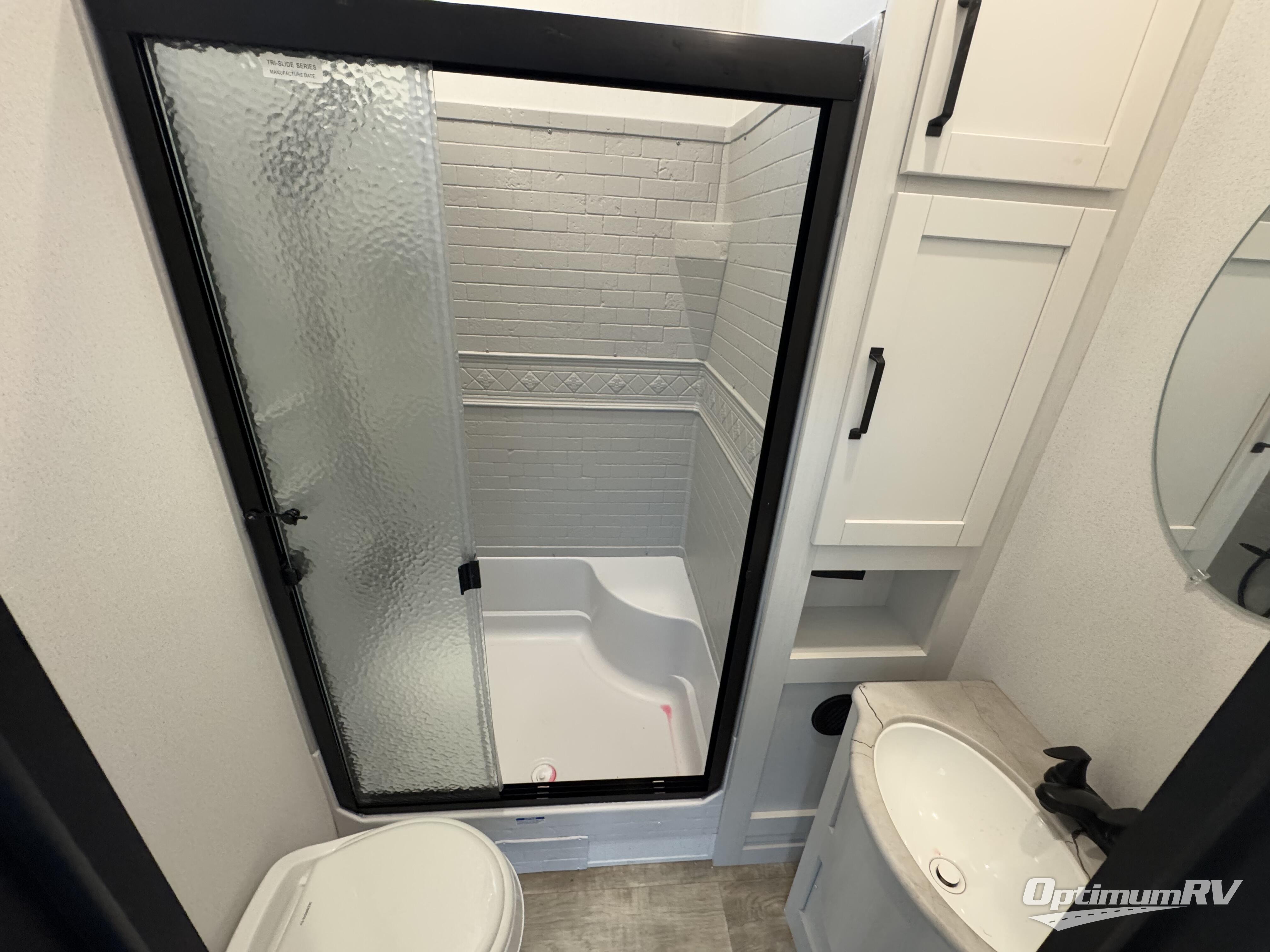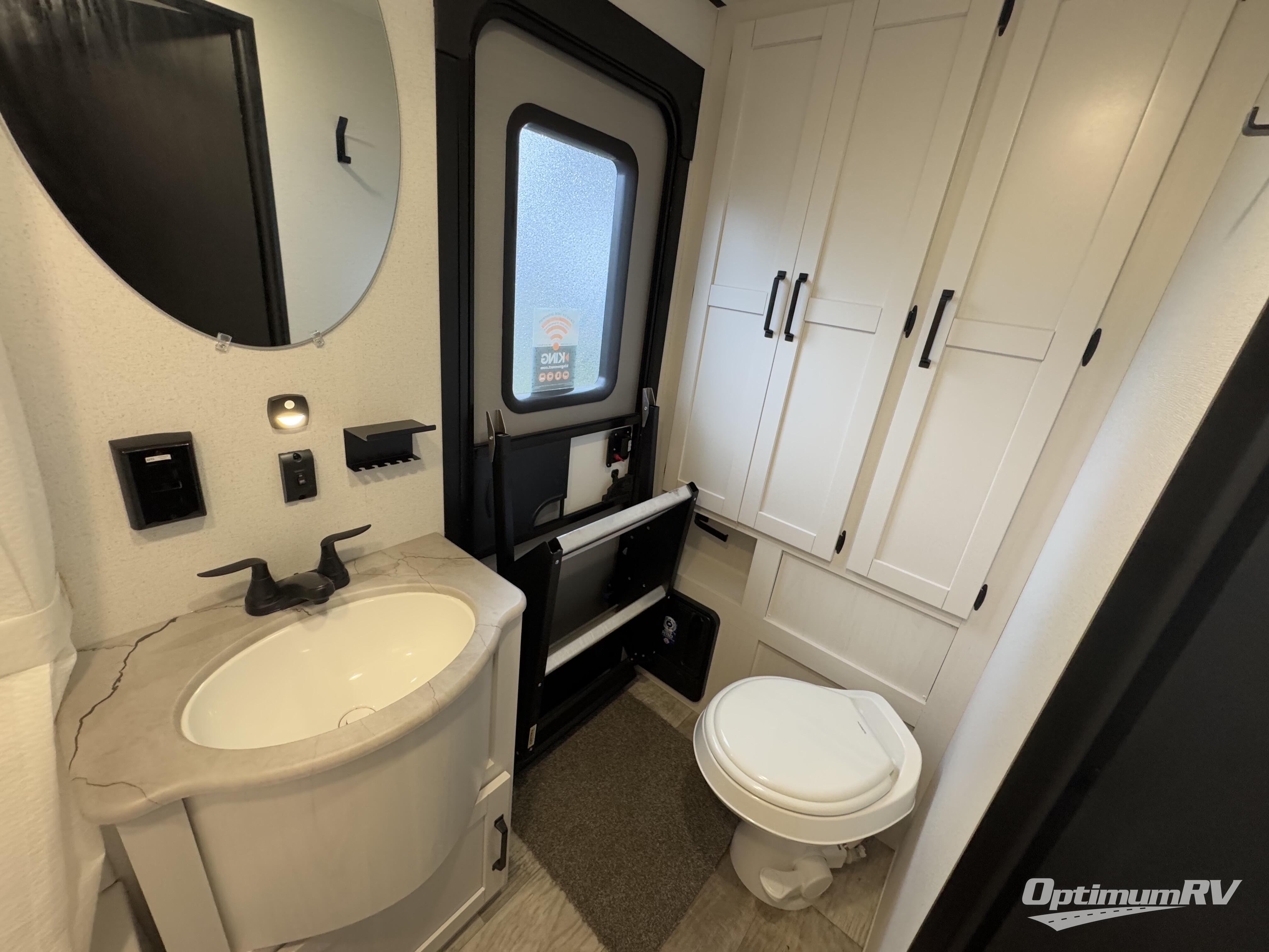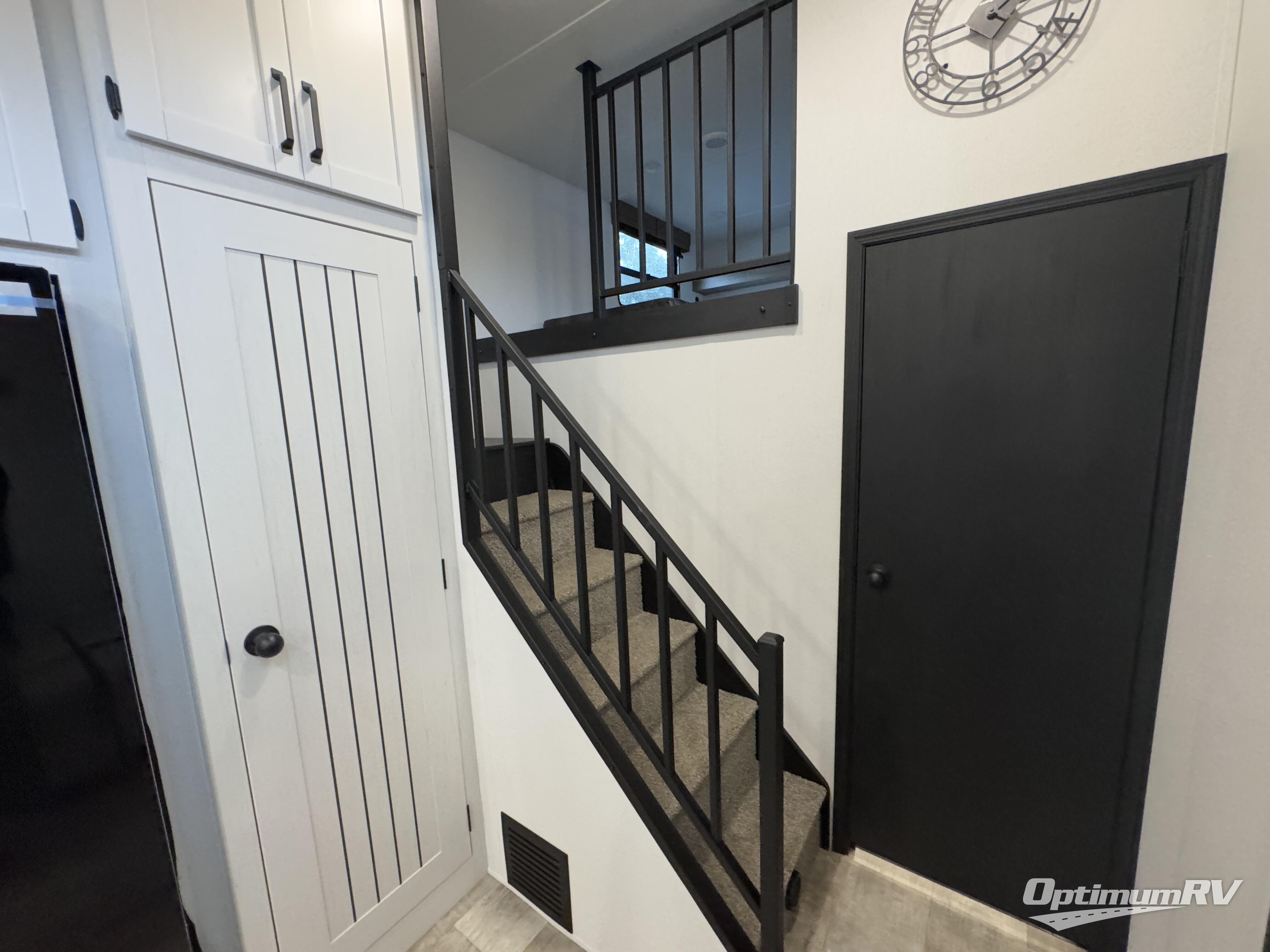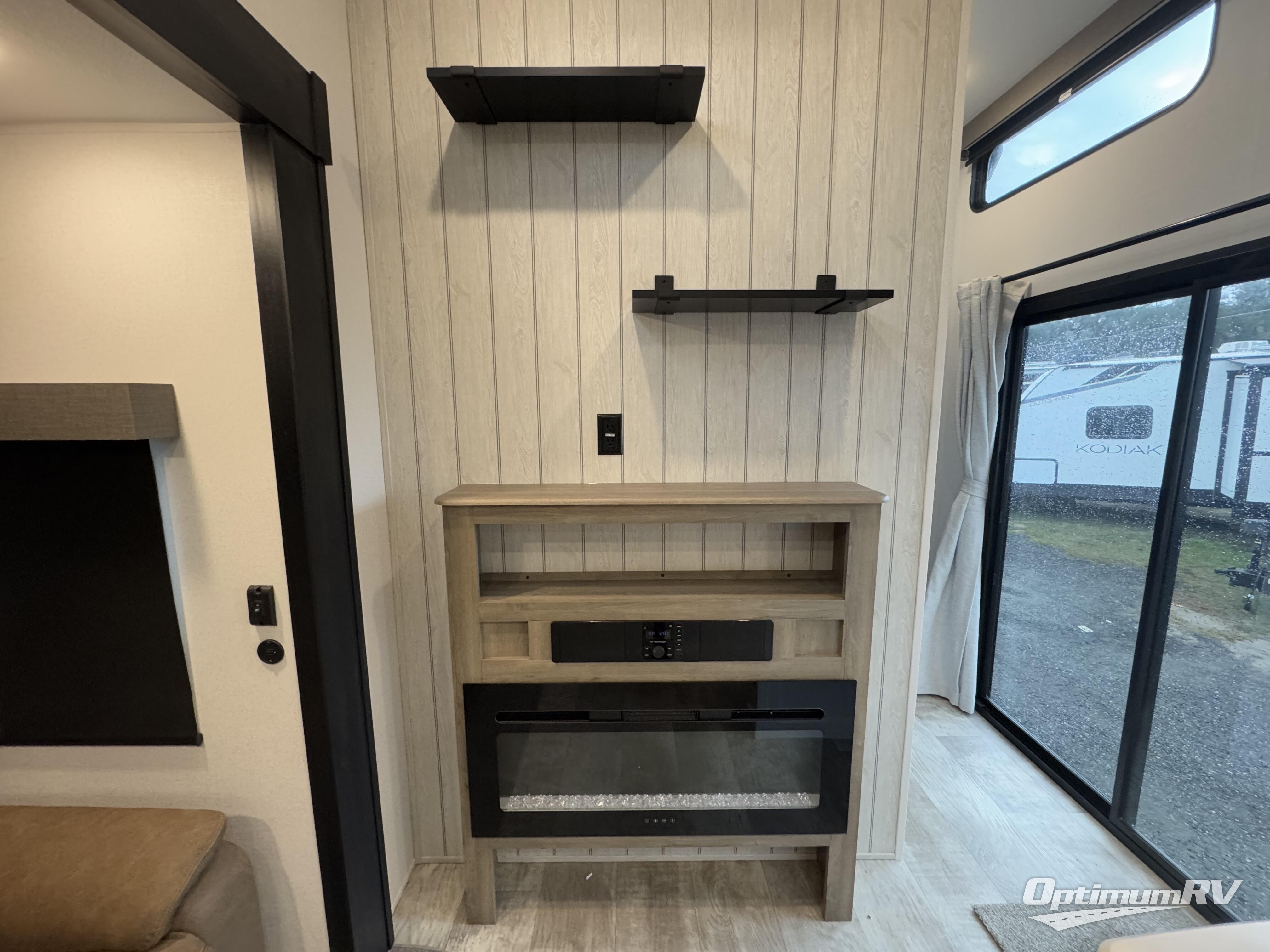 If you're planning to camp with a larger group or your family, this destination trailer will provide everything you're looking for! Your guests can take the rear bunkhouse suite that includes a slide out with a jiffy sofa and bunk bed, an entertainment center, and a full bath. You'll also find one of the dual entry doors here for added convenience. There are steps just outside the bunkhouse that lead to the loft with two bunk mats and storage space to keep this space tidy! The front private bedroom will be perfect for you with its king bed slide out, wardrobe/closet, and bedroom desk if you're needing to work from home. There is even a closet with the option to add washer and dryer prep. In the morning, everyone can meet in the combined middle living area and kitchen. A large slide out here houses the free-standing table and sofa, and the fireplace is close by to make it feel a little more like home!