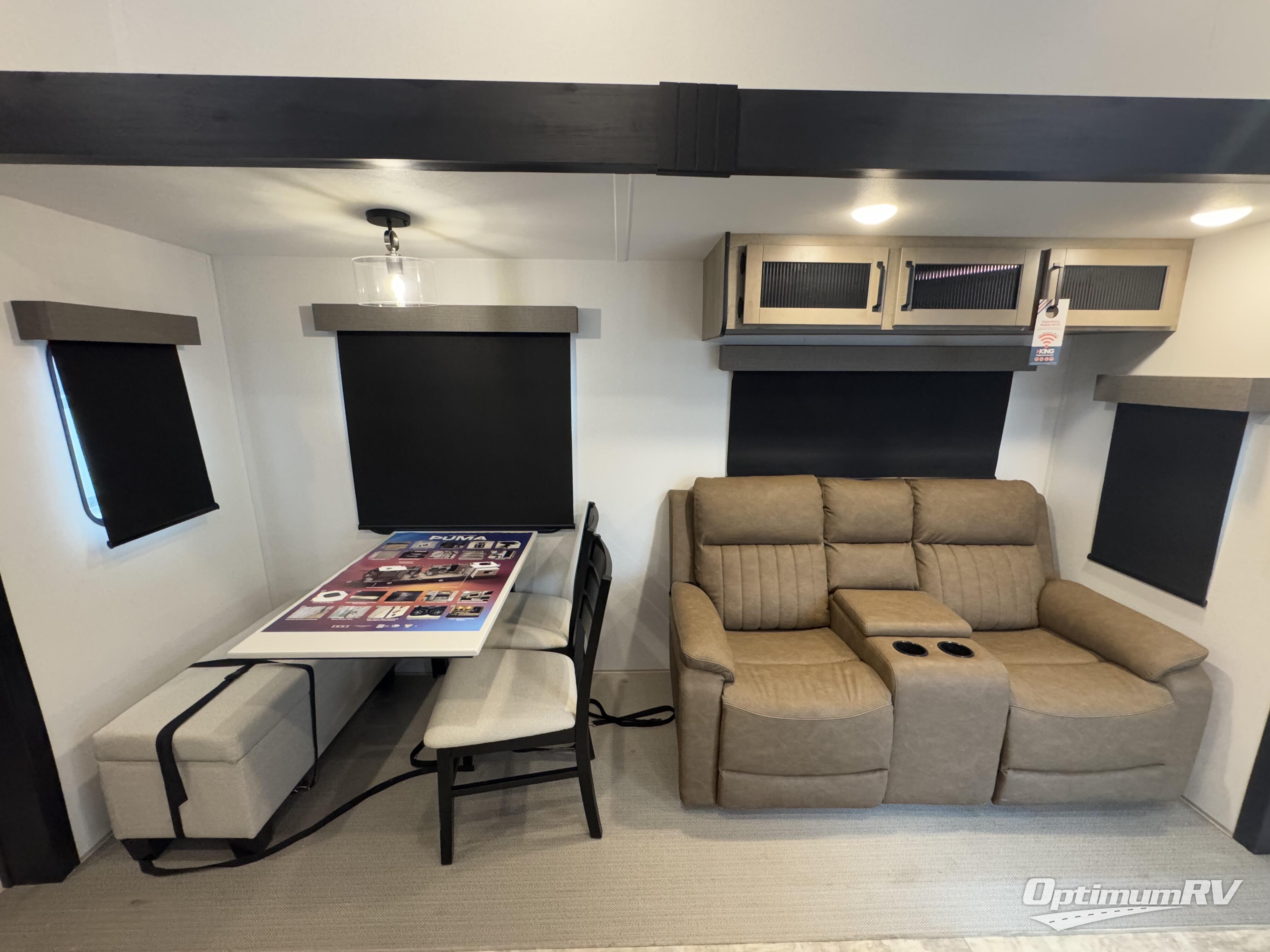 Each Puma Destination trailer by Palomino is designed to give you unforgettable getaways to the destination of your choice! The required Value Shopper Loft Package includes Congoleum designer linoleum, night roller shades, LED lighting, and a 24" stainless steel oven with a four burner stove so you can make meals just like you would at home. The tankless water heater is another feature you won't want to camp without, and there is WiFi prep, solar prep, plus optional washer and dryer prep for the option to further customize your trailer. An outside shower is included with the required Loft Package, along with two exterior speakers, solid surface countertops, four stabilizer jacks, and more!