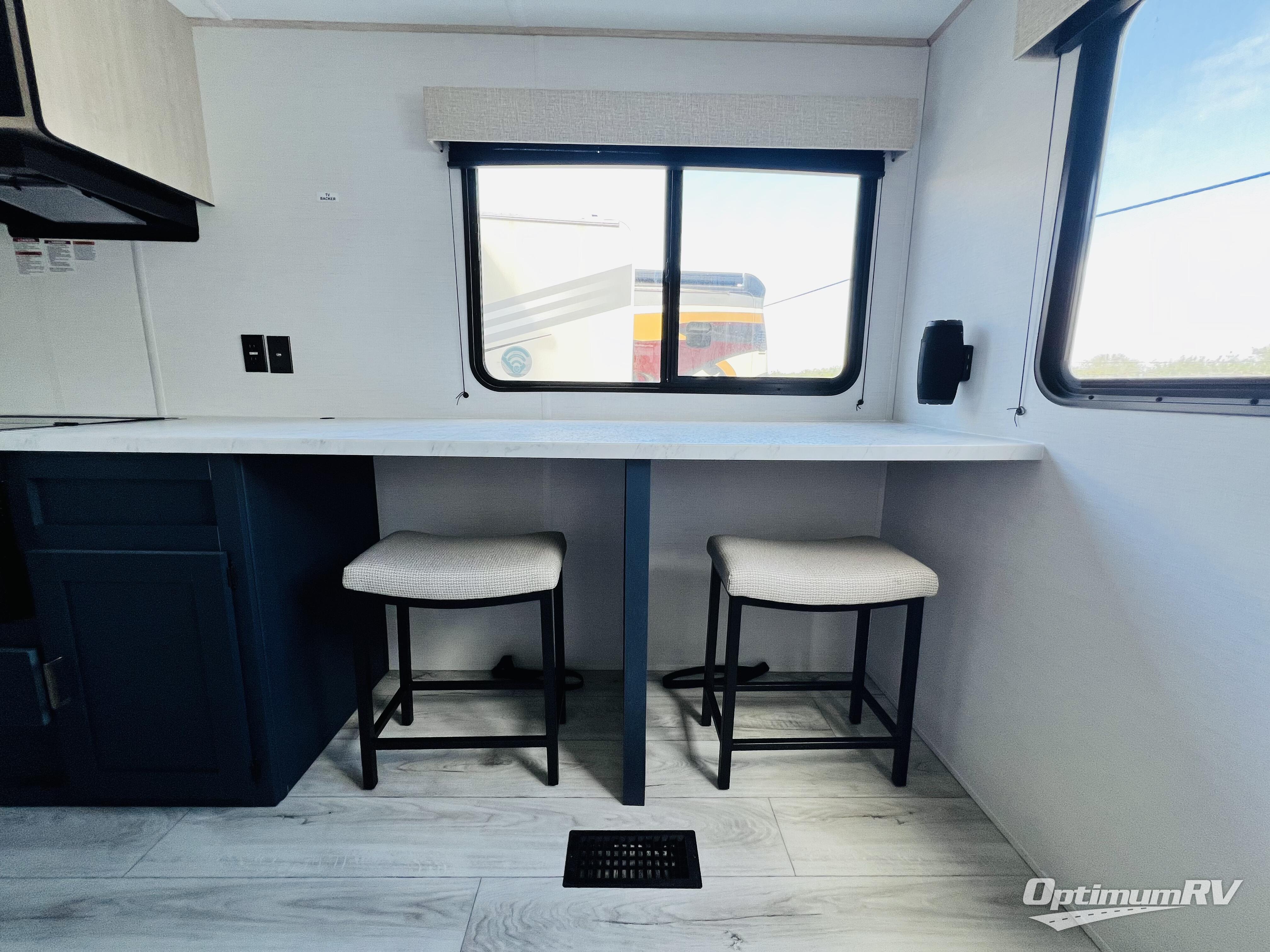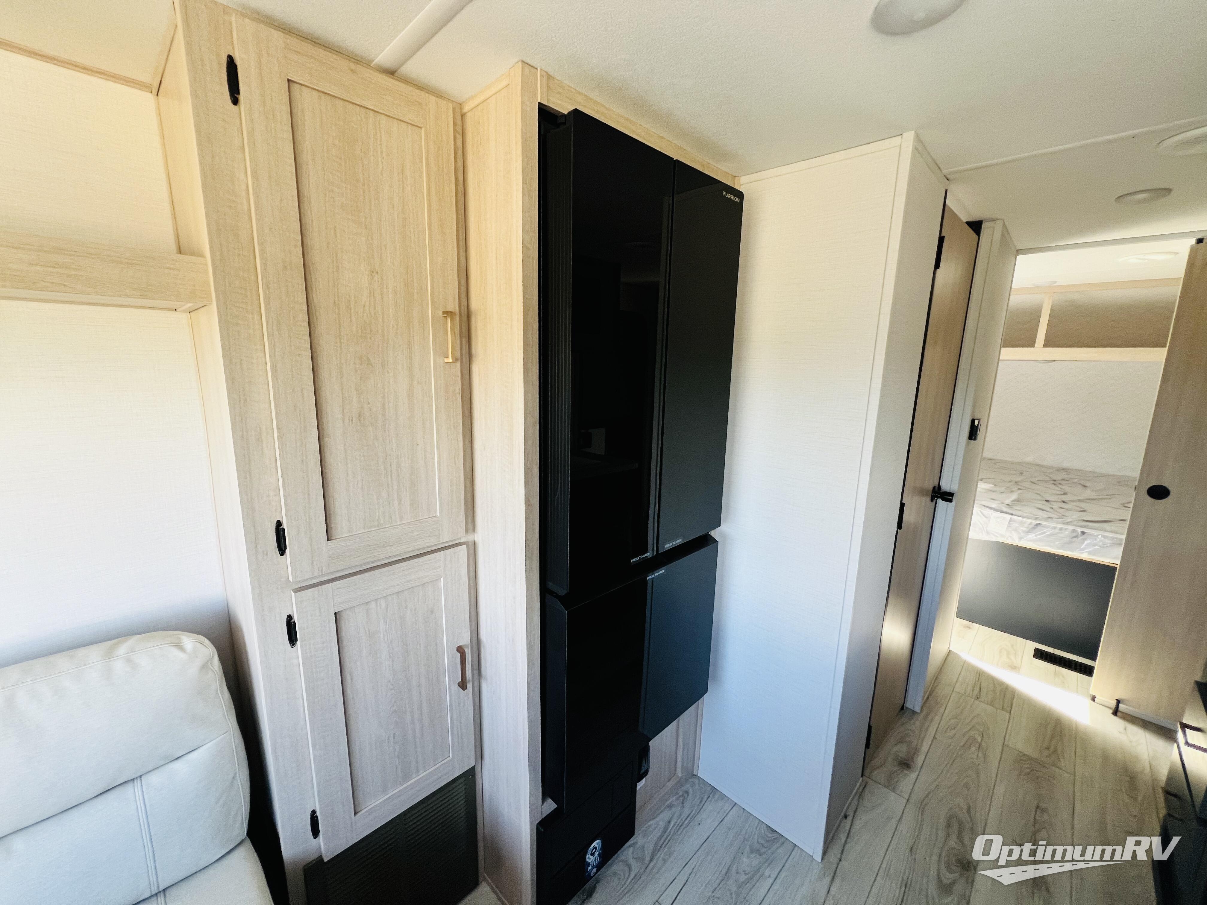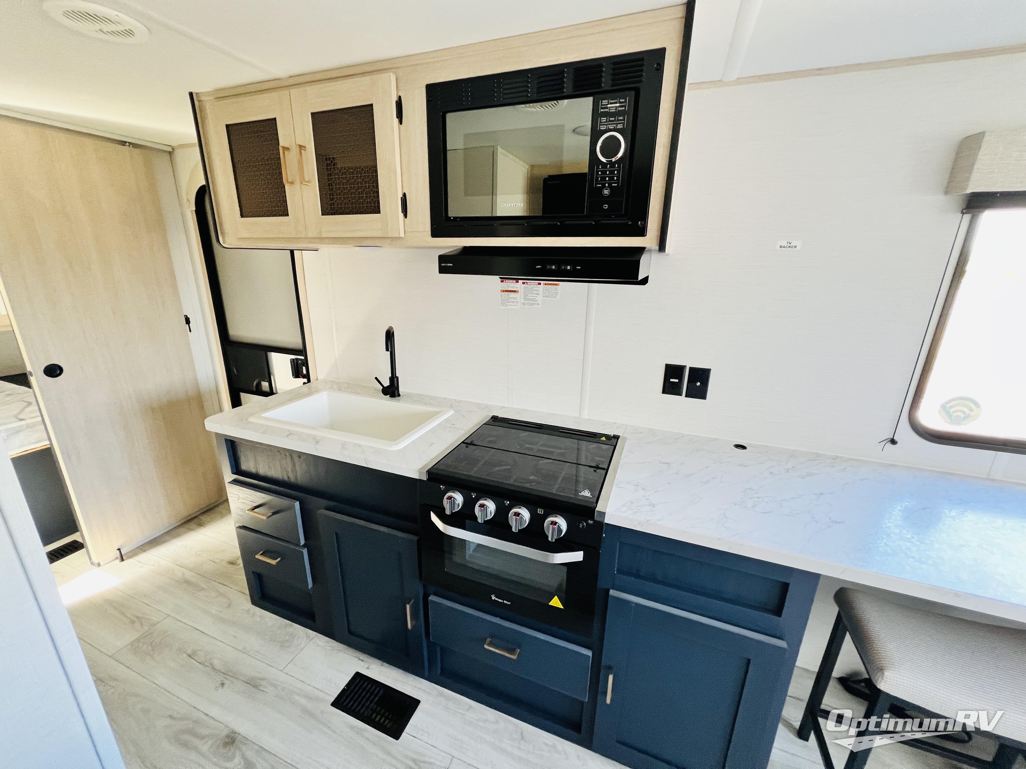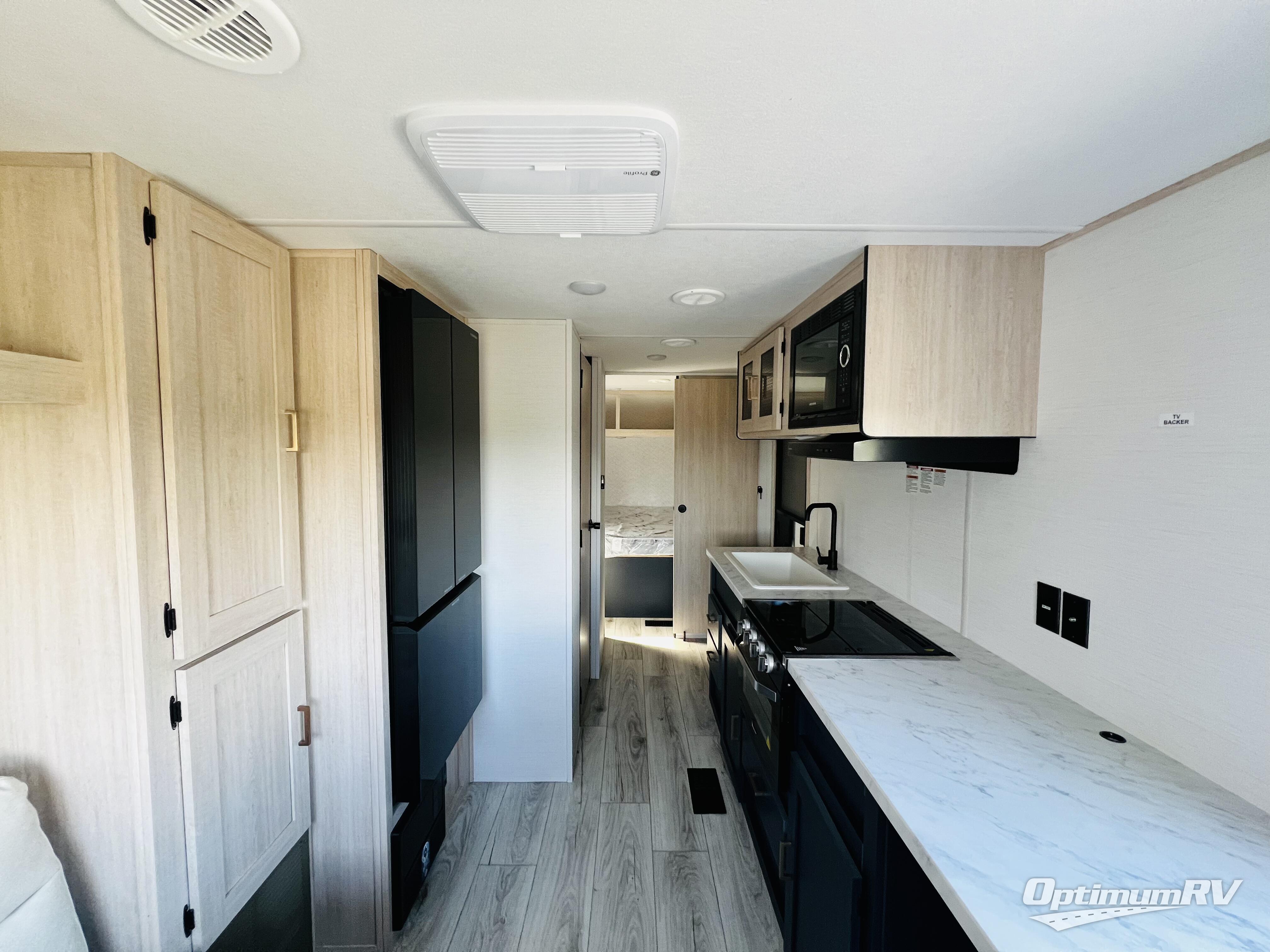 This no-slide travel trailer measures 26' 10" in length for easy towing! You will love having a front private bedroom to come back to after a day of exploring. There is a queen bed with dual wardrobes on either side of the bed, an overhead shelf, plus a sliding door to save on space. Once you've made breakfast on the three burner cooktop or in the microwave oven, you can dine at the countertop with two stools, or relax on the jiffy sofa. The sofa is also across from the entertainment center and if you have an overnight guest, they can comfortably sleep here. This model also includes a 13' LED lit power awning outdoors so if you decide to say up late, you won't be left in the dark!