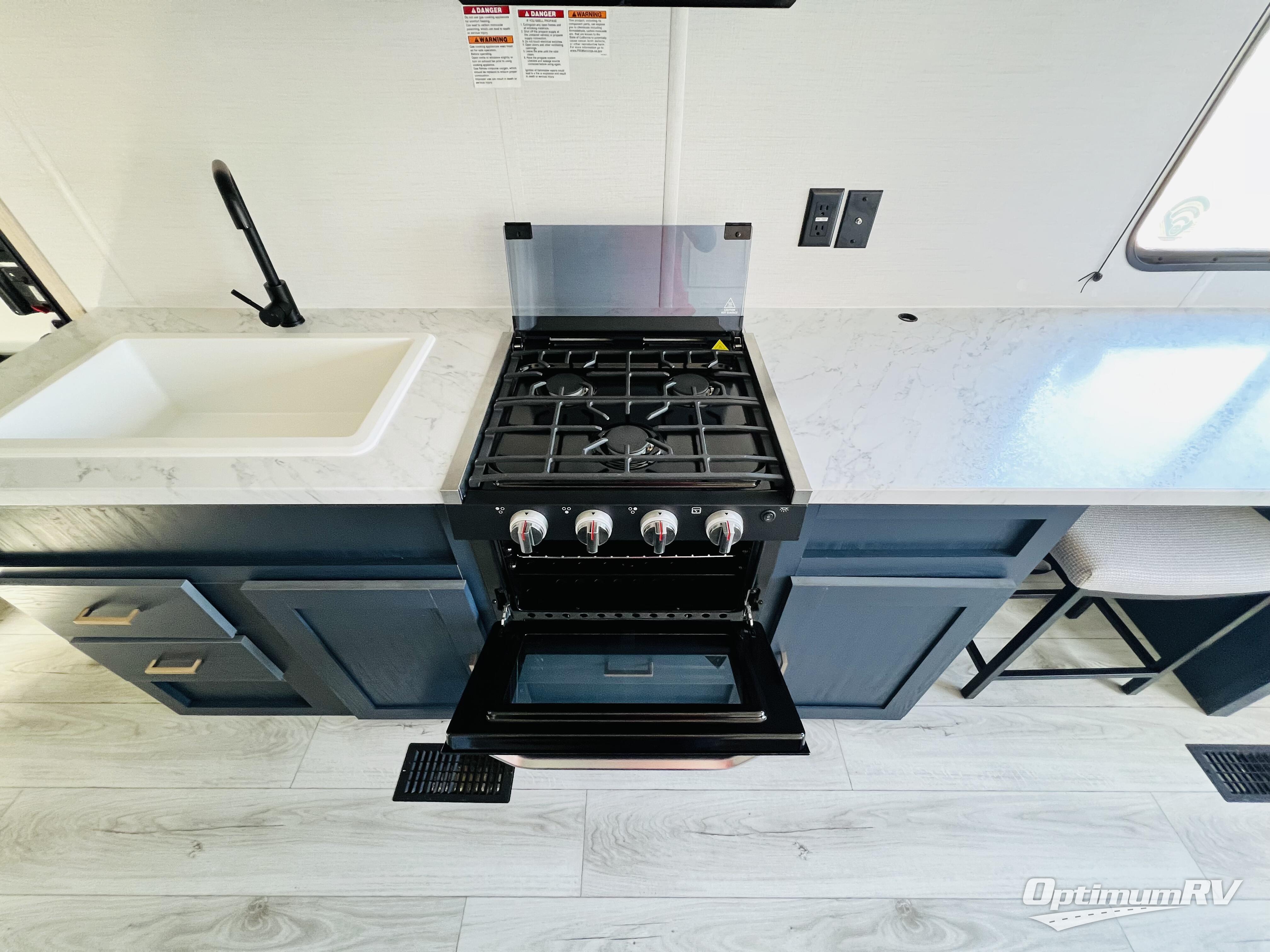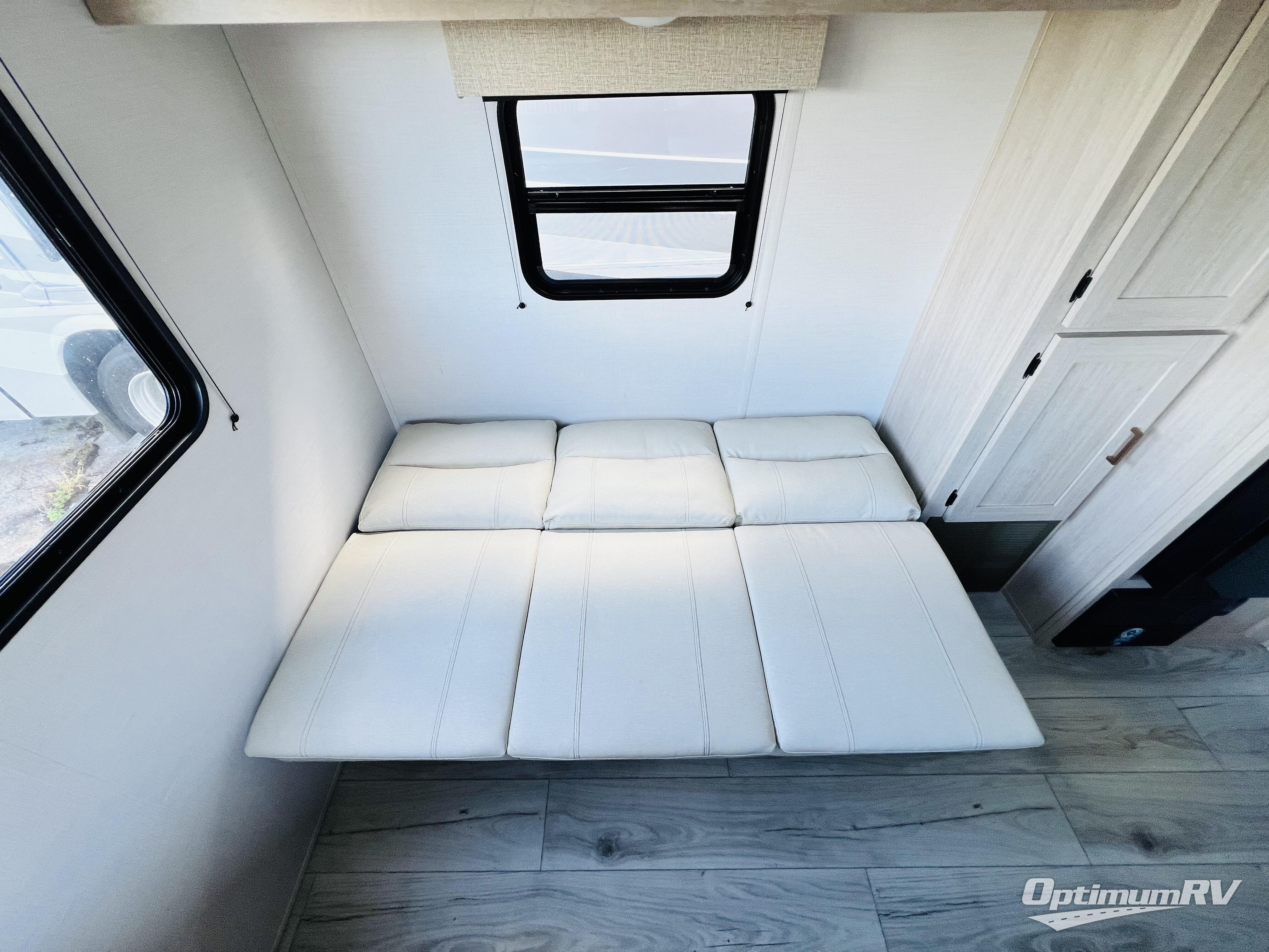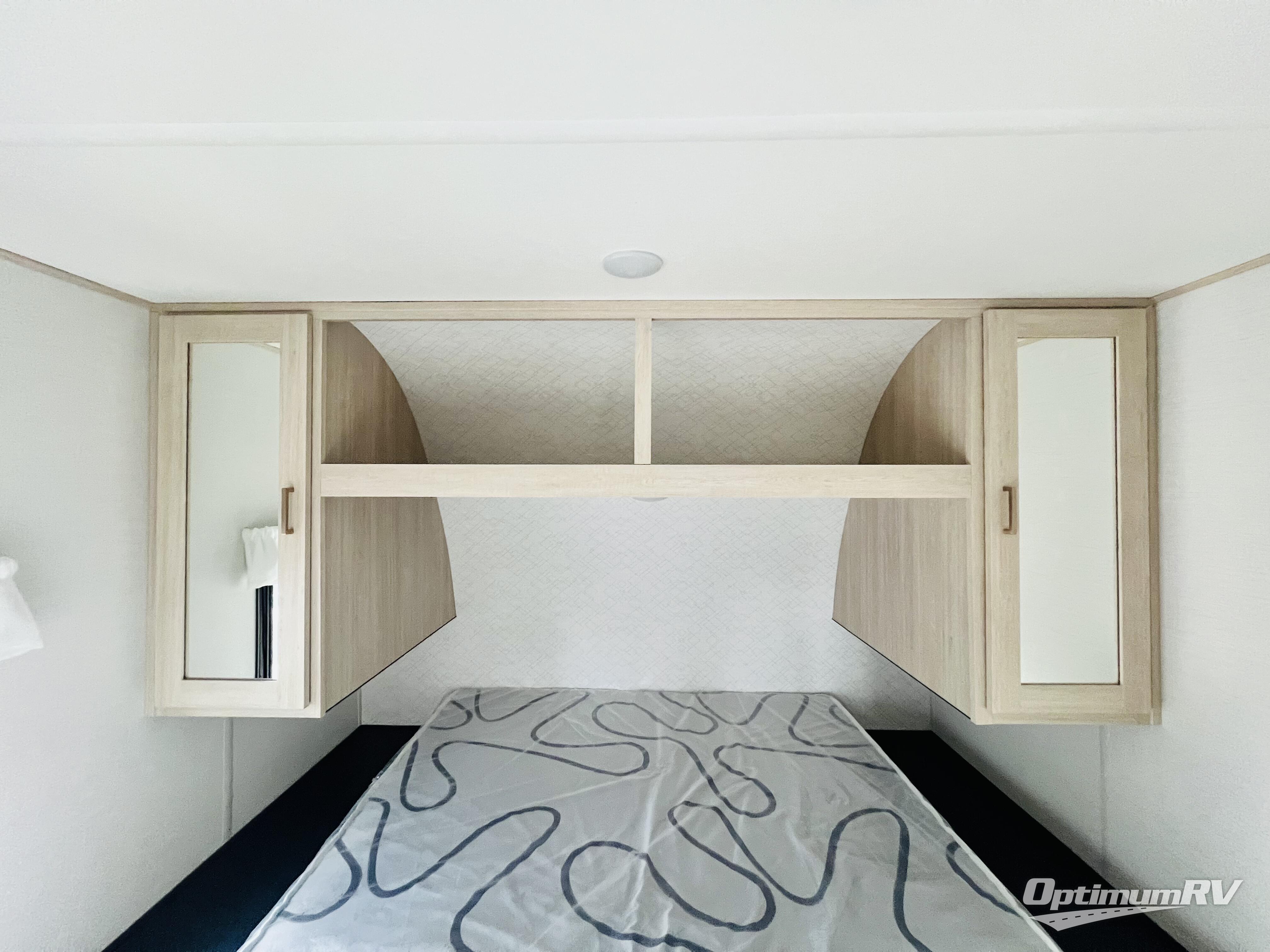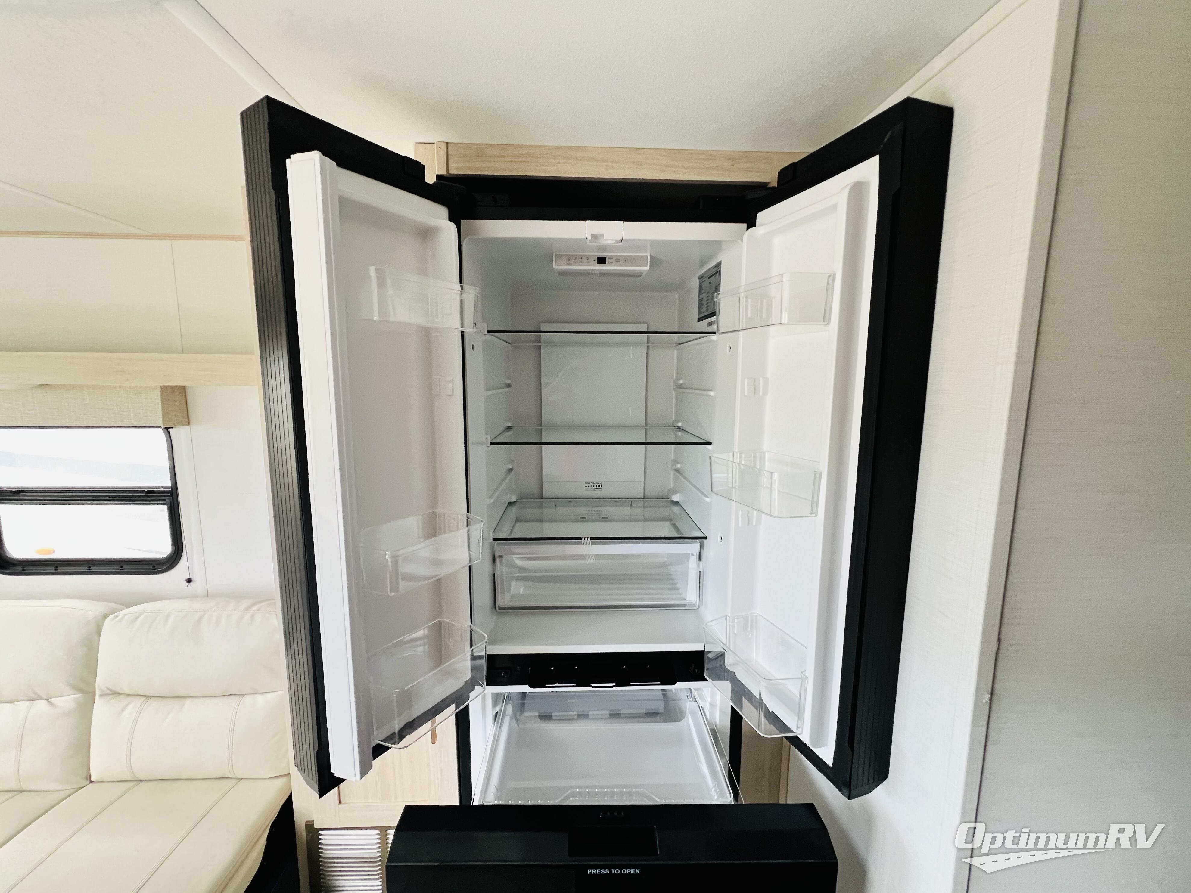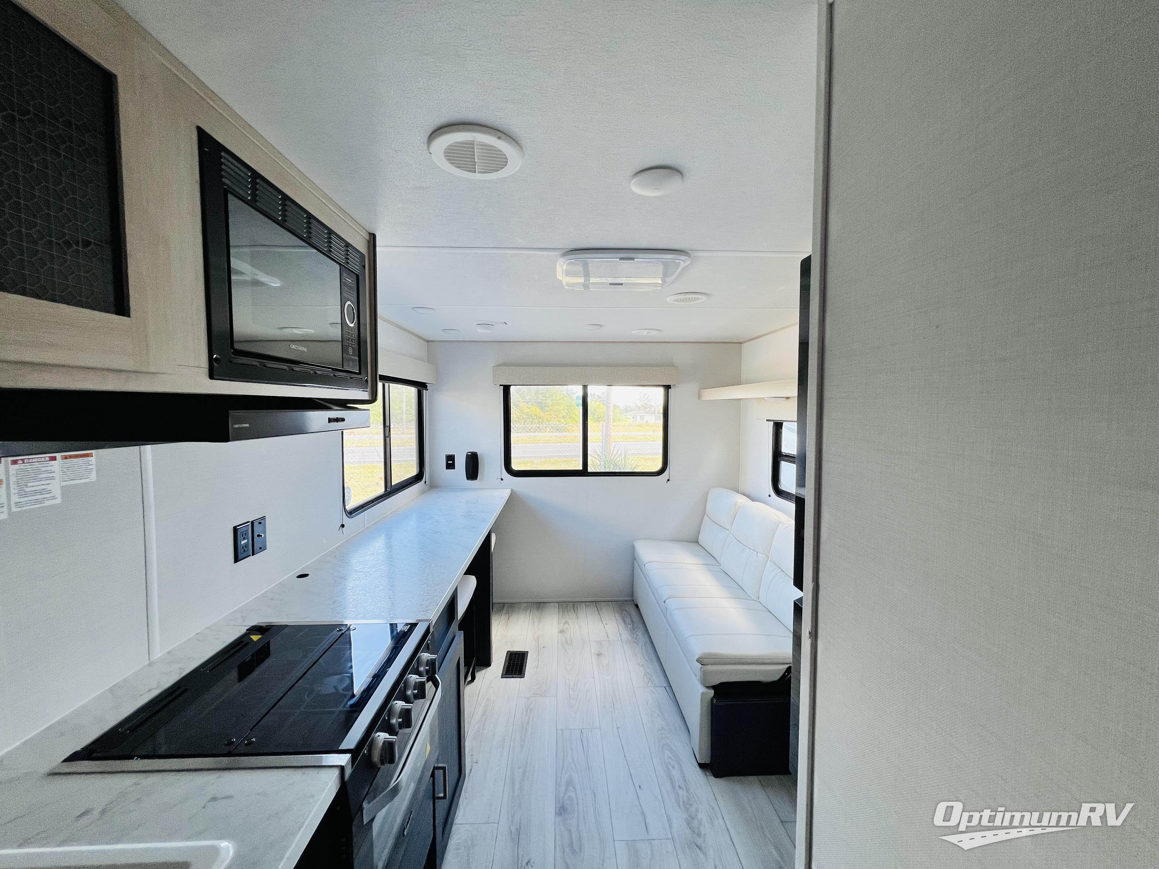This no-slide travel trailer measures 26' 10" in length for easy towing! You will love having a front private bedroom to come back to after a day of exploring. There is a queen bed with dual wardrobes on either side of the bed, an overhead shelf, plus a sliding door to save on space. Once you've made breakfast on the three burner cooktop or in the microwave oven, you can dine at the countertop with two stools, or relax on the jiffy sofa. The sofa is also across from the entertainment center and if you have an overnight guest, they can comfortably sleep here. This model also includes a 13' LED lit power awning outdoors so if you decide to say up late, you won't be left in the dark!